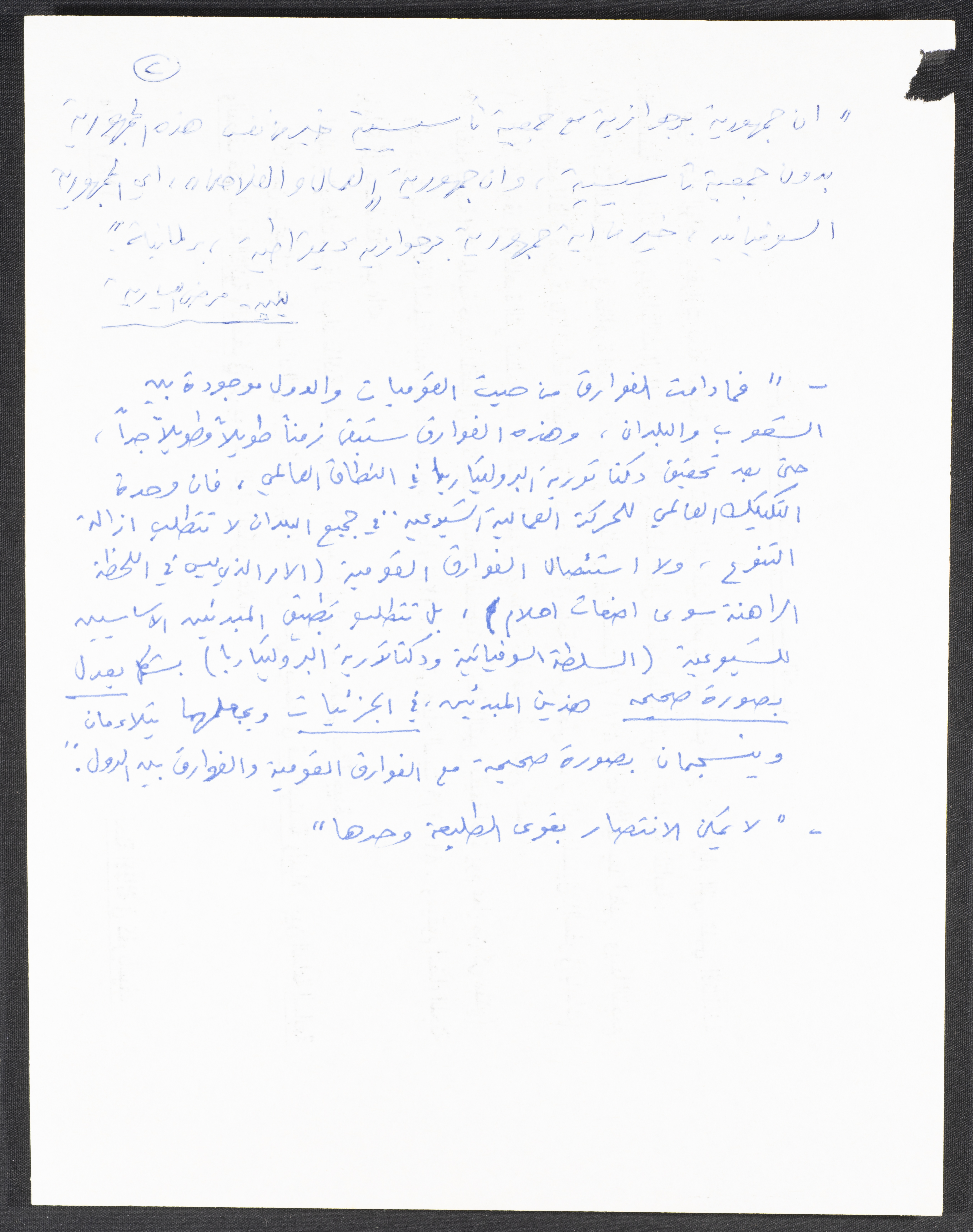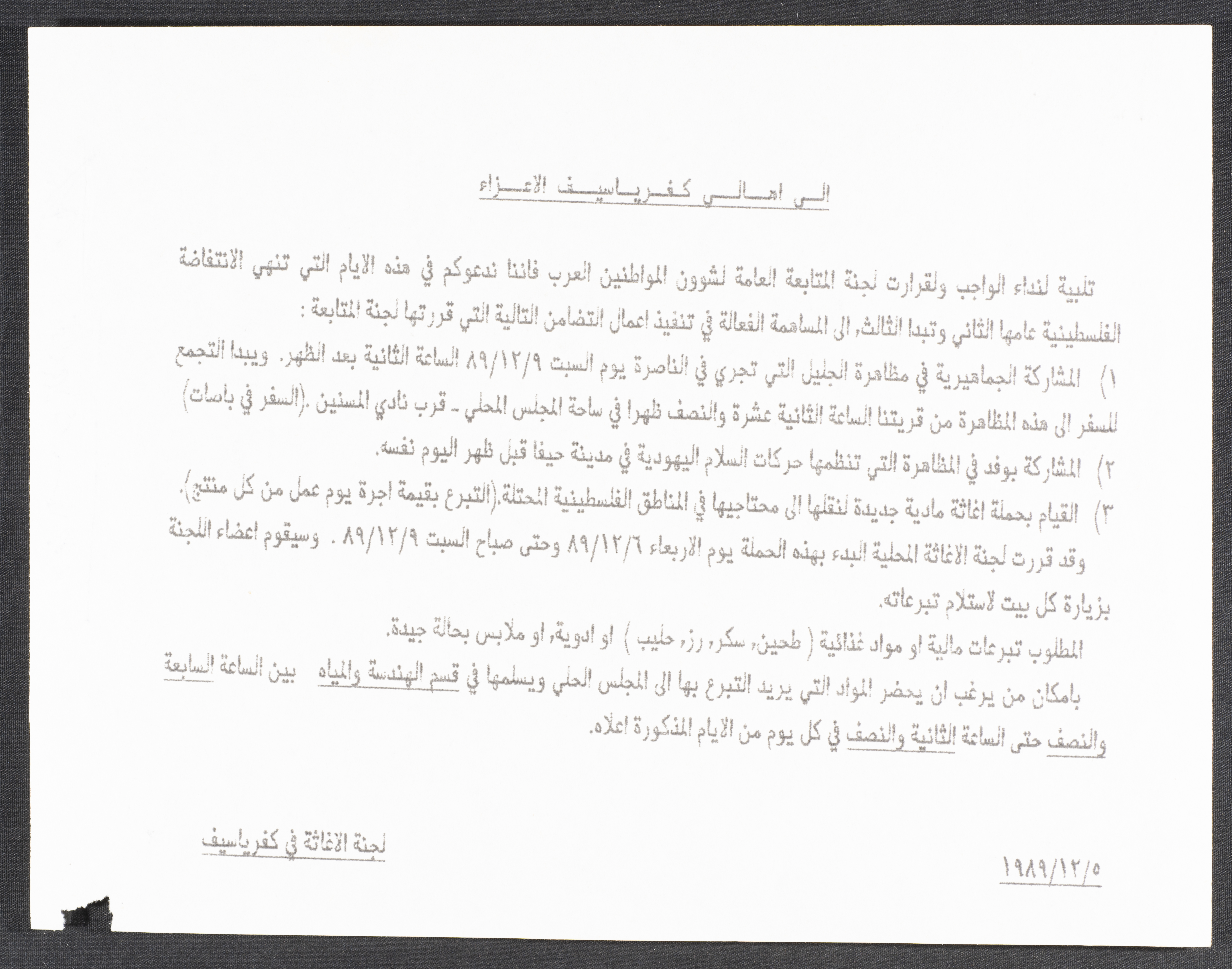 This document shows an article on the composition of the party and its basic work, touching on the reasons and factors for the victory over the bourgeoisie. It is noteworthy that on the back of one of the papers, there is a printed announcement issued by the Relief Committee in Kafr Yasif to the people, in response to the call of duty and the decisions of the Follow-up Committee for Arab Citizens Affairs, calling for participation in the Galilee demonstration that will take place in Nazareth on 9 December 1989, in addition to material relief campaigns for the impoverished in Palestinian areas.