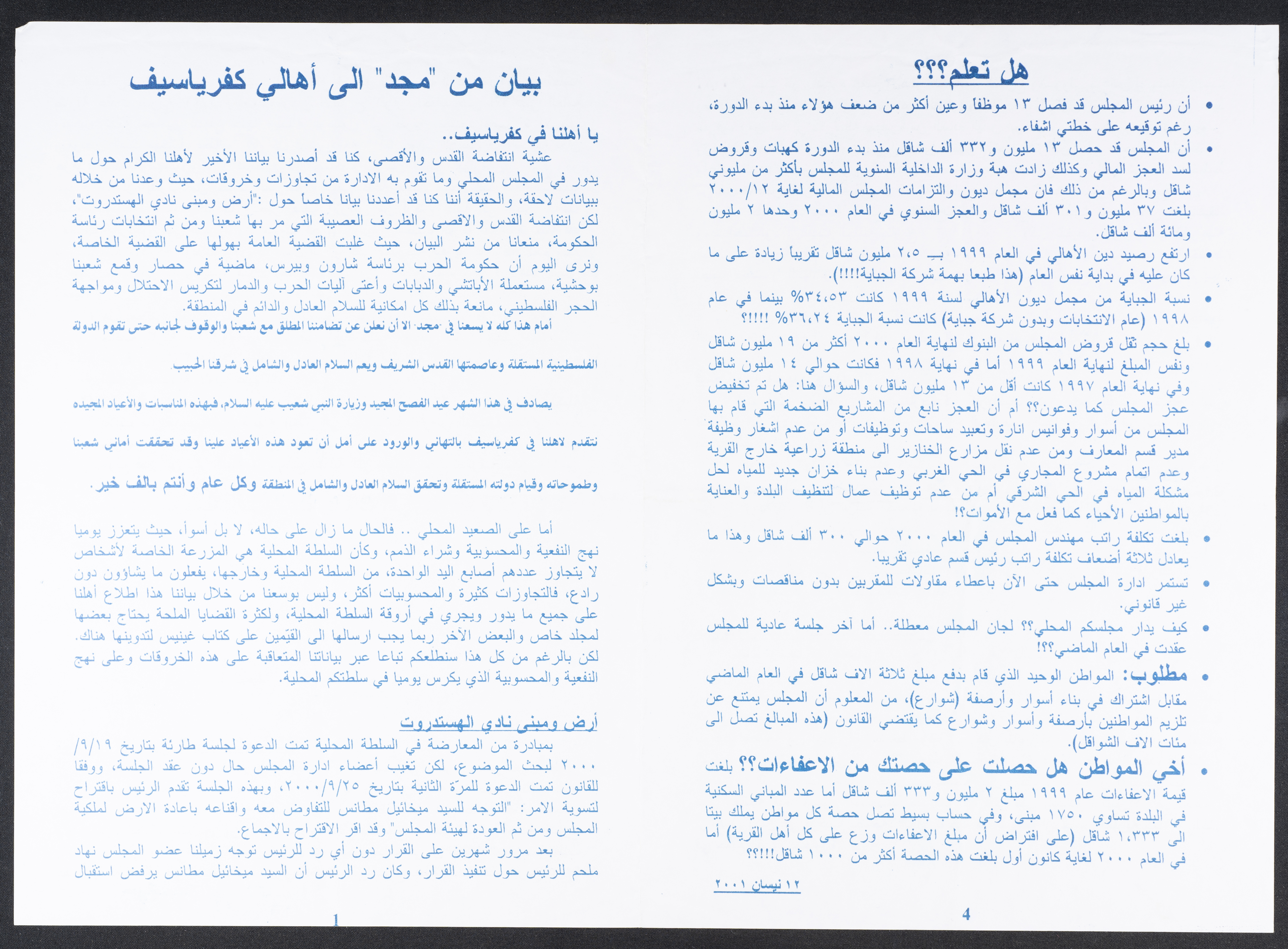 بيان صدر عن "مجد" بتاريخ 12 نيسان 2001 لأهالي كفر ياسيف، جاء فيه عدّة قضايا منها أرض ومبنى نادي الهستدروت، وتهنئة بمناسبة عيد الفصح المجيد، وتفاصيل تتعلق بنهج النفعية والمحسوبية وشراء الذمم، وما آل إليه المجلس المحلي في البلدة، إذ فصل رئيس المجلس 13 موظف، بالإضافة لمشاكل الديون والجباية والفساد في قيمة الرواتب الشهرية وغيرها.