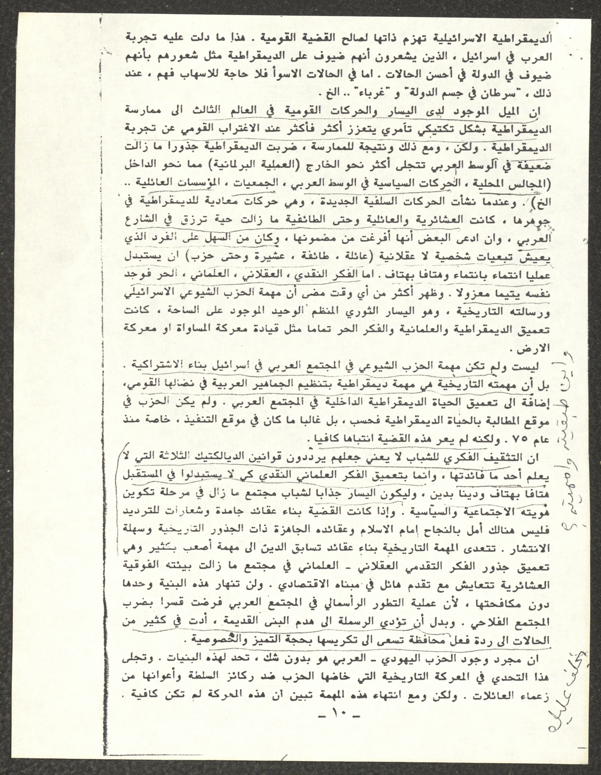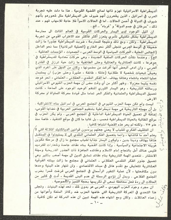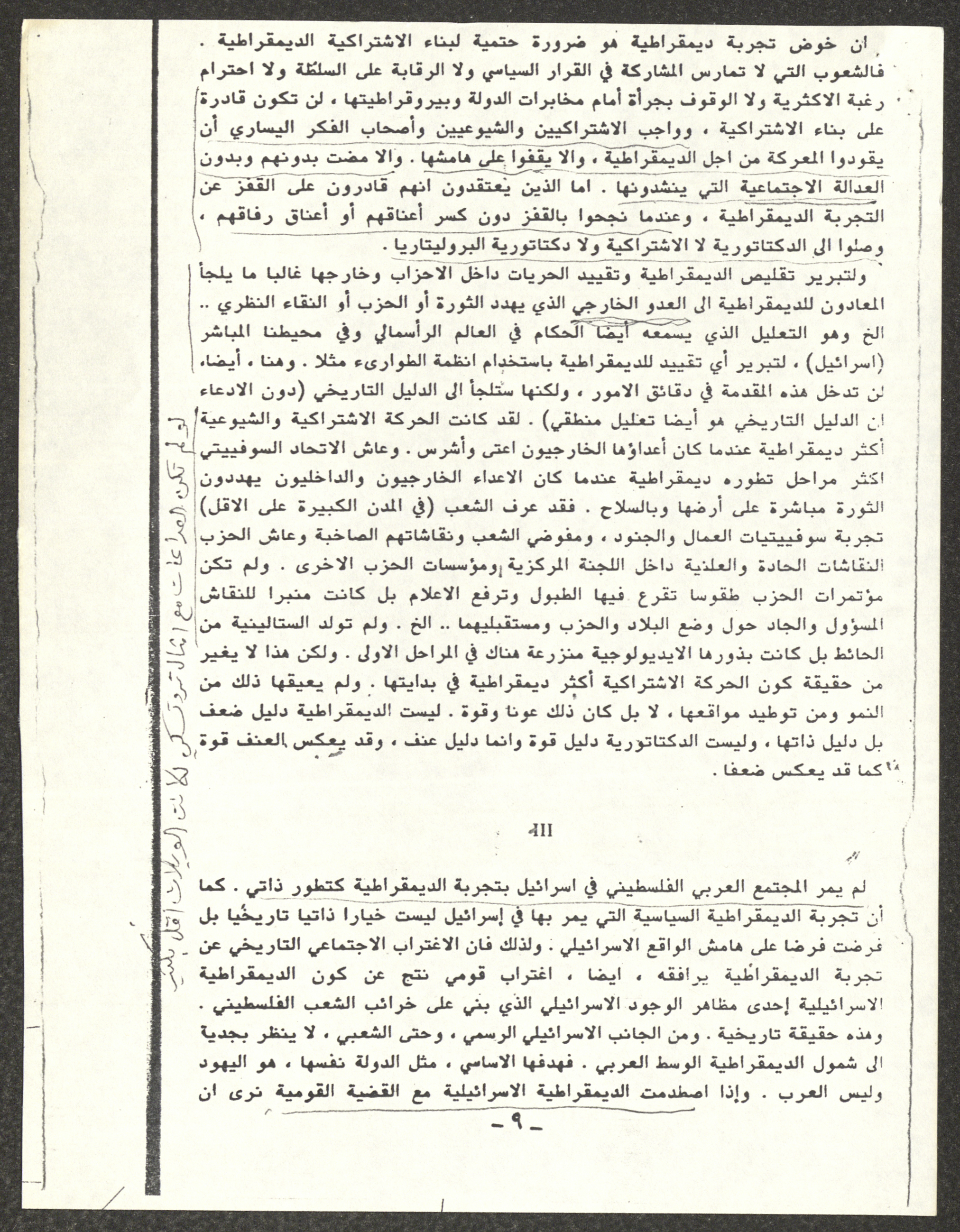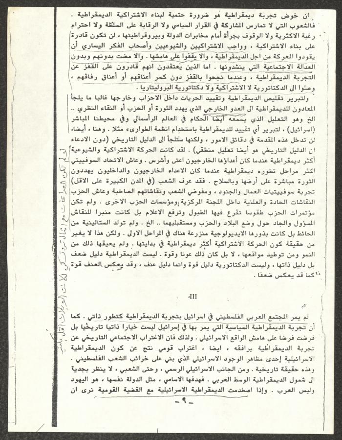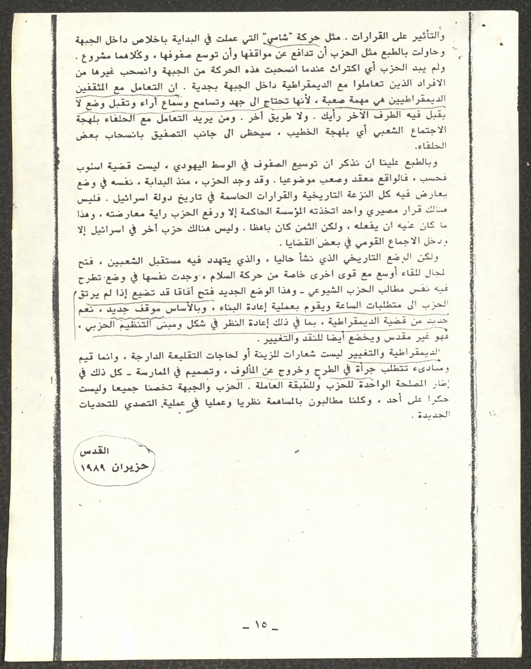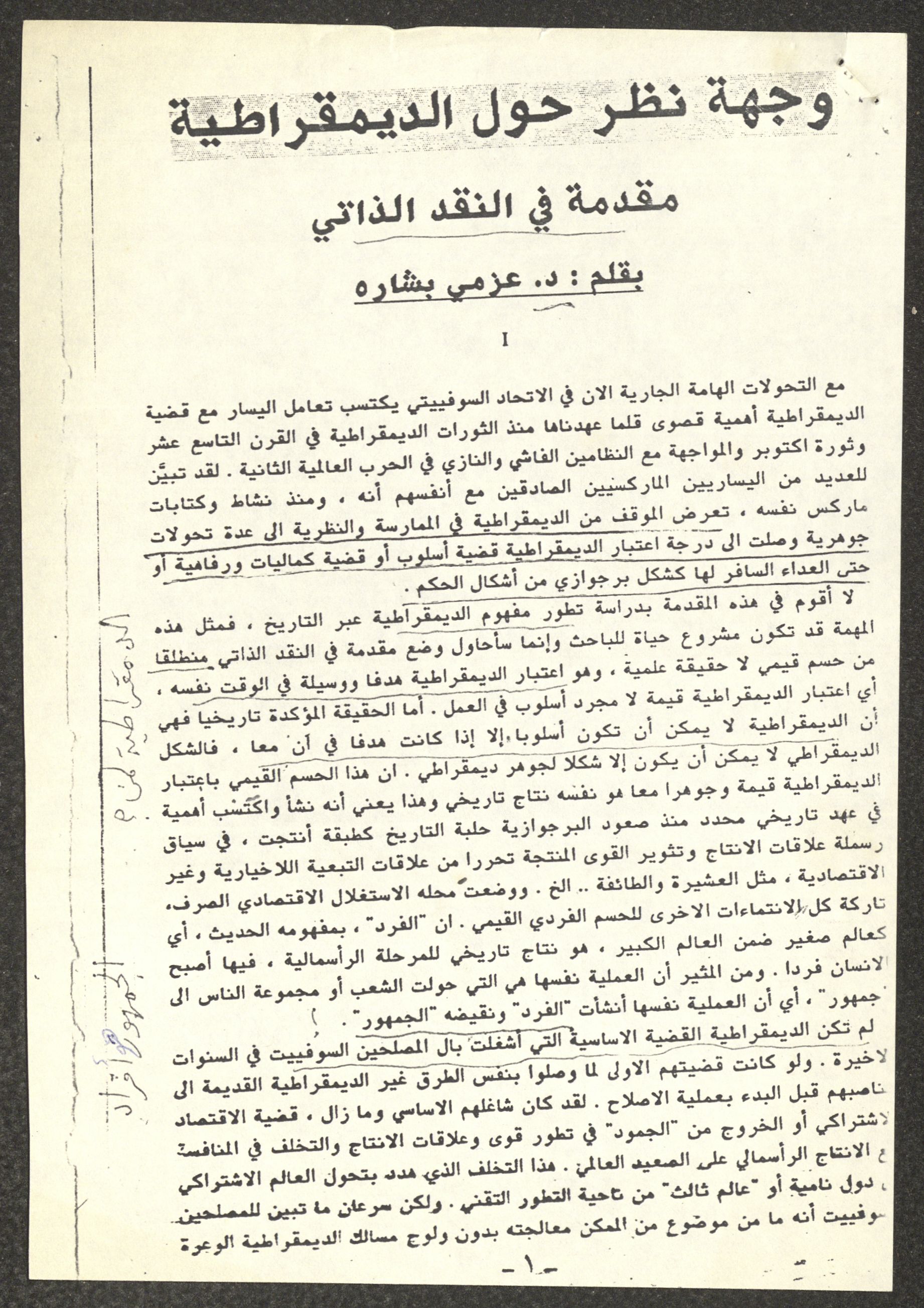 Found in the Nimr Murqus Collection, this document shows an introduction to Azmi Bishara's self-criticism titled "A Viewpoint on Democracy", published in Jerusalem in June 1989.