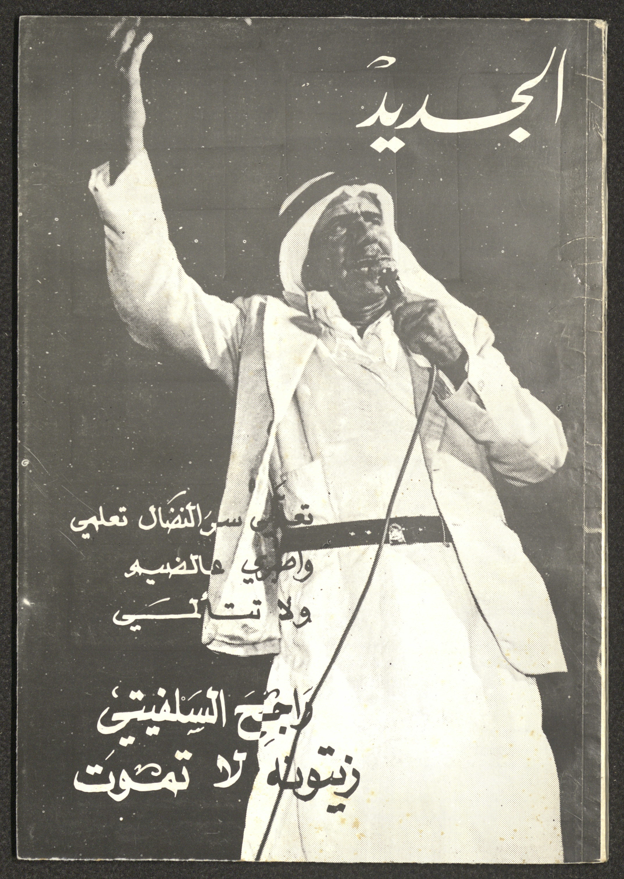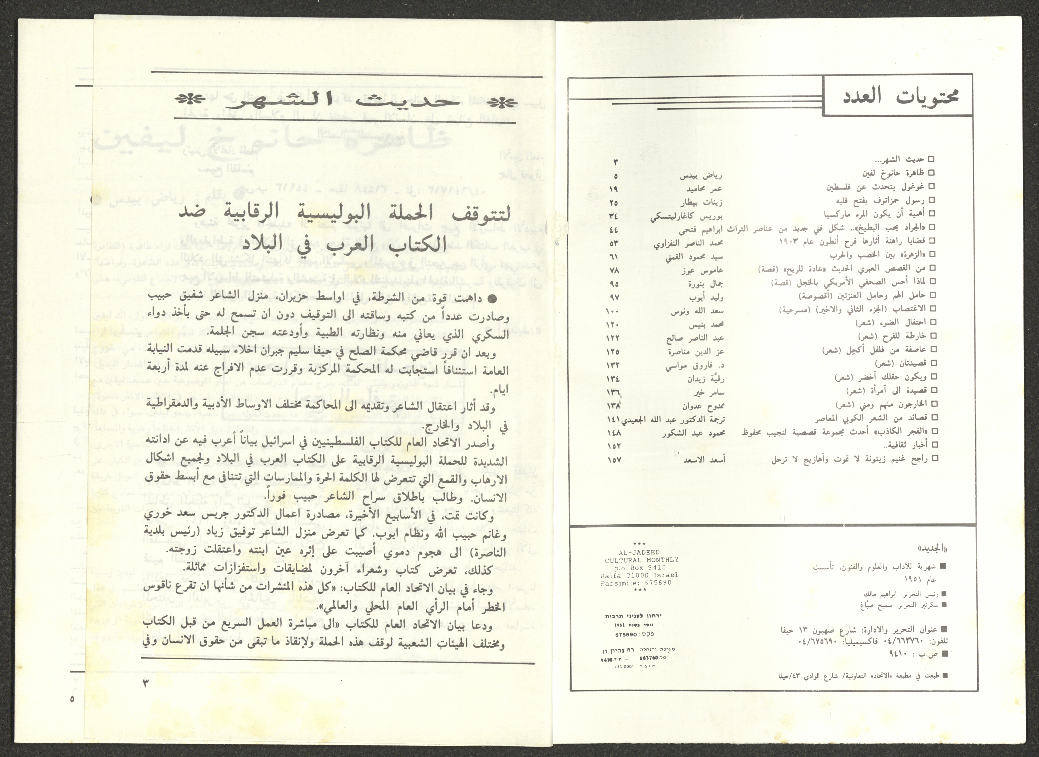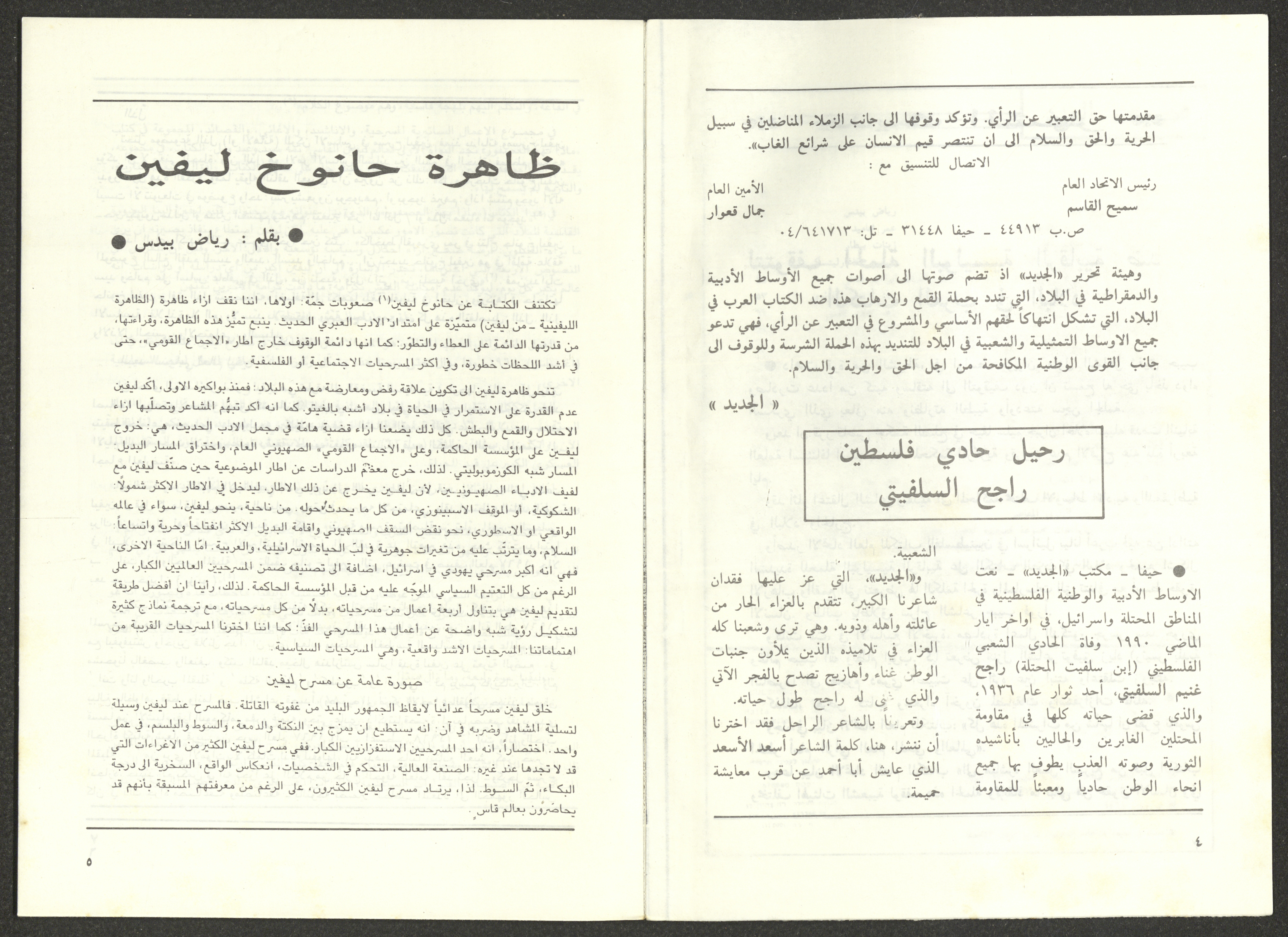 عدد من مجلة الجديد صدر عام 1990، وهي مجلة شهرية للفكر والثقافة الوطنية التقدمية تأسست عام 1951 وكان محررها الأول حنا نقارة ورئيس تحريرها أنطوان شلحث، وطبع في مطابع الاتحاد التعاونية في مدينة حيفا. يتضمن العدد: حديث الشهر لهيئة تحرير مجلة الجديد. مقال بعنوان "ظاهرة حانوخ ليفين" لرياض بيدس. مقال بعنوان "نيقولا غوغول يتحدث عن فلسطين" لعمر محاميد. لقاء بعنوان "رسول حمزاتوف يفتح قلبه" أجرته زينات بيطار. مقال بعنوان "أهمية أن يكون المرء ماركسيًا" لبوريس كاغارليتسكي. مقال بعنوان "الجراد يحب البطيخ، شكل فني جديد من عناصر التراث" لابراهيم فتحي. مقال بعنوان "قضايا راهنة أثارها فرح أنطون في عام 1903" لمحمد الناصر النقراوي. دراسة بعنوان "الزُهرة بين الخصب والحرب" لسيد محمود القمني. قصة "دعاة للريح" من الأدب العبري الحديث لعاموس عوز. قصة بعنوان "لماذا أحس الصحفي الأمريكي بالخجل" لجمال بنورة. قصاصة بعنوان "حامل الهم وحامل العنزتين" لوليد أبو الرب. الجزء الثاني والأخير من مسرحية "الإغتصاب" لسعد الله ونوس. شعر بعنوان "احتفال الضوء" لمحمد بنيس. شعر بعنوان "خارطة للفرح" لعبد الناصر صالح. شعر بعنوان "عاصفة من فلفل أكحل" لعز الدين مناصرة. قصيدتان لفاروق مواسي. شعر بعنوان "ويكون حقلك أخضرًا" لرقية زيدان. شعر بعنوان "قصيدة إلى إمرأة" لسامر خير. شعر بعنوان "الخارجون منهم ومني" لممدوح عدوان. مقال عن مجموعة نجيب محفوظ القصصية بعنوان "الفجر الكاذب" لمحمود عبد الشكزور. أخبار ثقافية منوعة كتبتها هيئة التحرير. مقال كتبه أسعد الأسعد بعنوان "راجح غنيم زيتونة لا تموت وأهازيج لا ترحل".