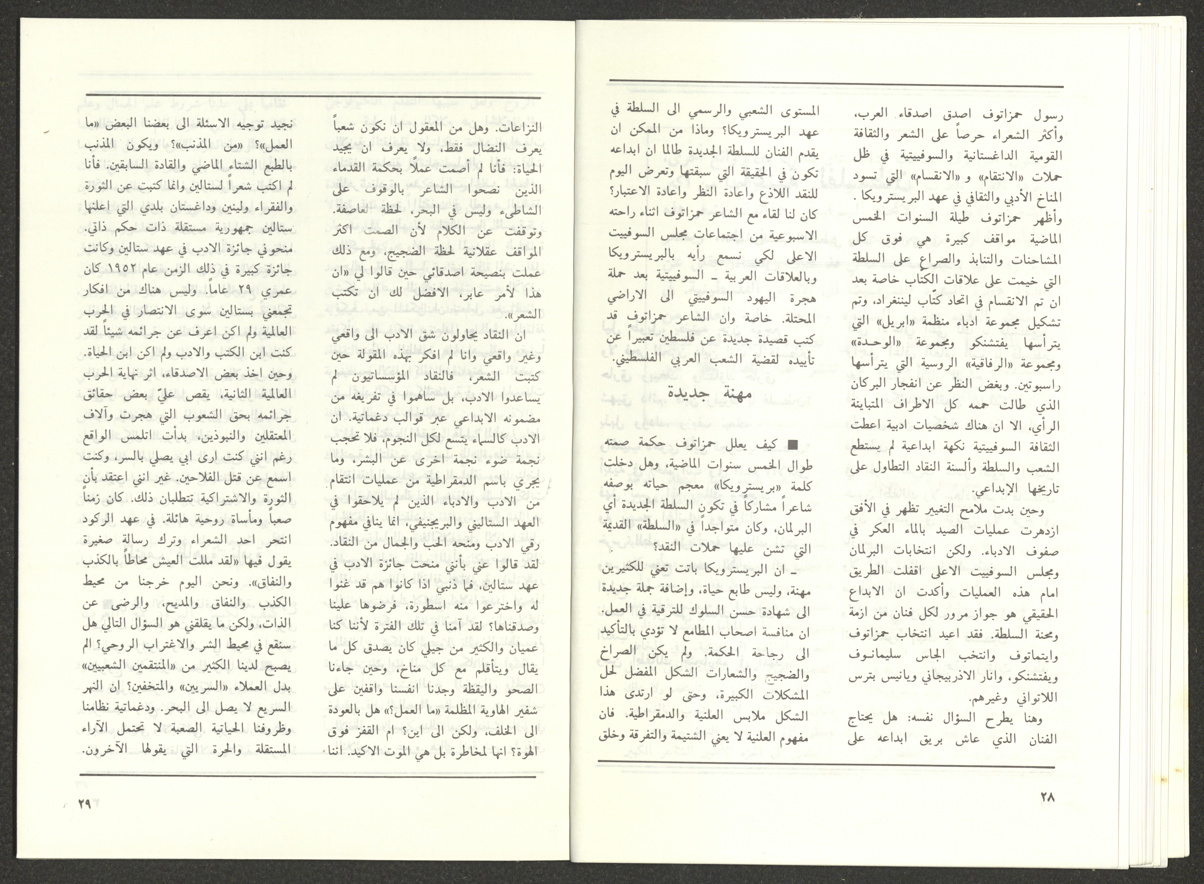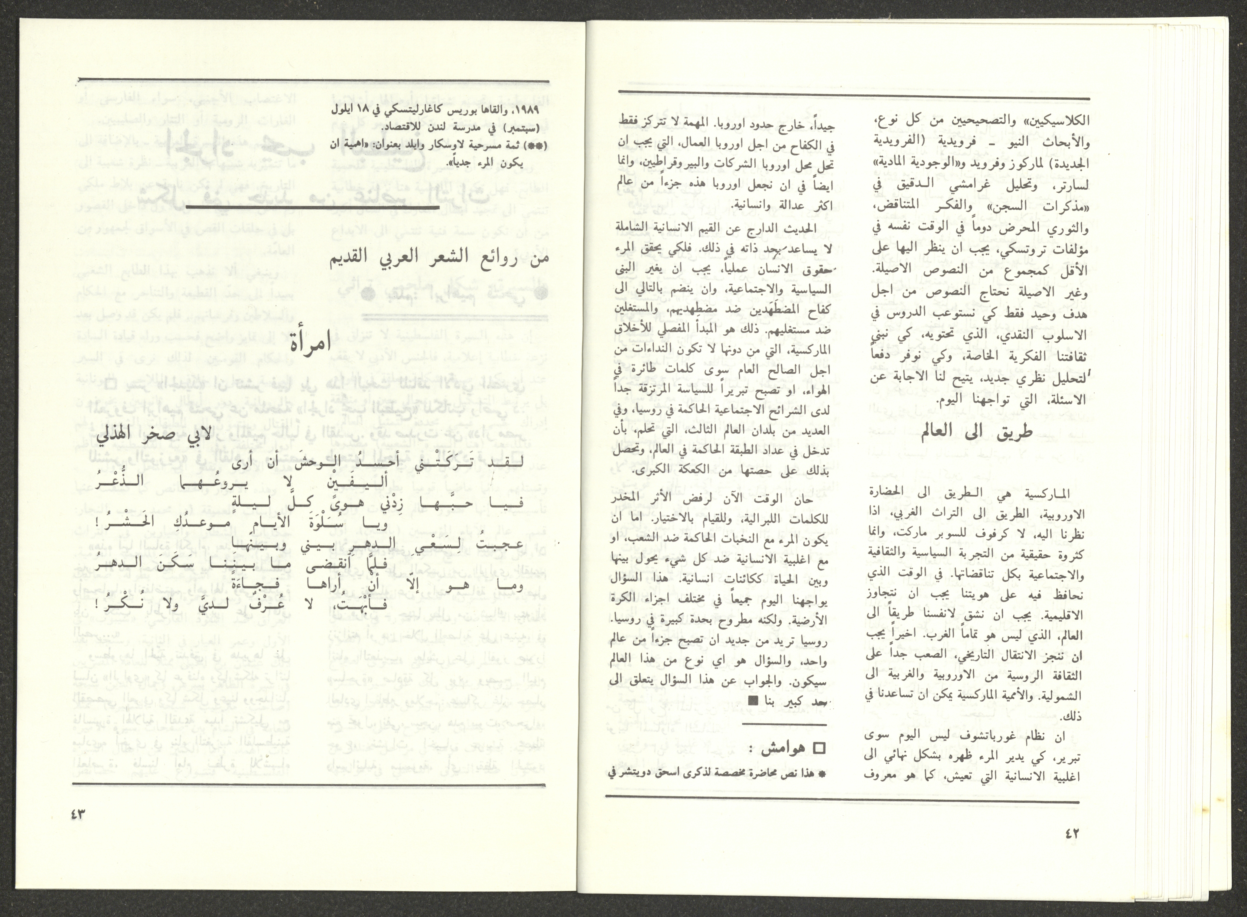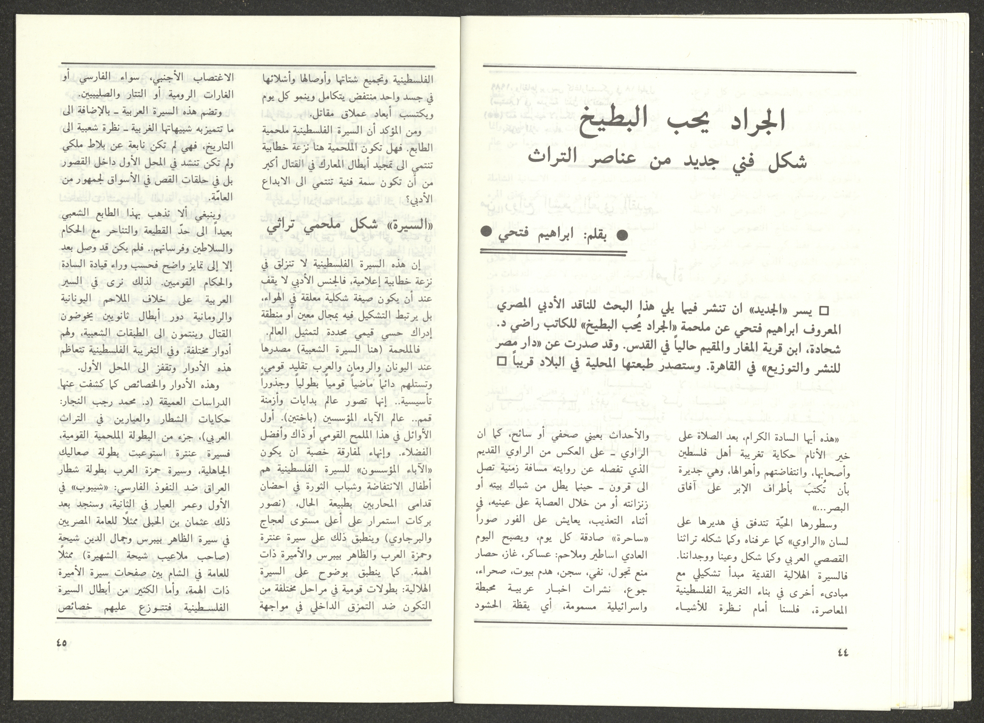 عدد من مجلة الجديد صدر عام 1990، وهي مجلة شهرية للفكر والثقافة الوطنية التقدمية تأسست عام 1951 وكان محررها الأول حنا نقارة ورئيس تحريرها أنطوان شلحث، وطبع في مطابع الاتحاد التعاونية في مدينة حيفا. يتضمن العدد: حديث الشهر لهيئة تحرير مجلة الجديد. مقال بعنوان "ظاهرة حانوخ ليفين" لرياض بيدس. مقال بعنوان "نيقولا غوغول يتحدث عن فلسطين" لعمر محاميد. لقاء بعنوان "رسول حمزاتوف يفتح قلبه" أجرته زينات بيطار. مقال بعنوان "أهمية أن يكون المرء ماركسيًا" لبوريس كاغارليتسكي. مقال بعنوان "الجراد يحب البطيخ، شكل فني جديد من عناصر التراث" لابراهيم فتحي. مقال بعنوان "قضايا راهنة أثارها فرح أنطون في عام 1903" لمحمد الناصر النقراوي. دراسة بعنوان "الزُهرة بين الخصب والحرب" لسيد محمود القمني. قصة "دعاة للريح" من الأدب العبري الحديث لعاموس عوز. قصة بعنوان "لماذا أحس الصحفي الأمريكي بالخجل" لجمال بنورة. قصاصة بعنوان "حامل الهم وحامل العنزتين" لوليد أبو الرب. الجزء الثاني والأخير من مسرحية "الإغتصاب" لسعد الله ونوس. شعر بعنوان "احتفال الضوء" لمحمد بنيس. شعر بعنوان "خارطة للفرح" لعبد الناصر صالح. شعر بعنوان "عاصفة من فلفل أكحل" لعز الدين مناصرة. قصيدتان لفاروق مواسي. شعر بعنوان "ويكون حقلك أخضرًا" لرقية زيدان. شعر بعنوان "قصيدة إلى إمرأة" لسامر خير. شعر بعنوان "الخارجون منهم ومني" لممدوح عدوان. مقال عن مجموعة نجيب محفوظ القصصية بعنوان "الفجر الكاذب" لمحمود عبد الشكزور. أخبار ثقافية منوعة كتبتها هيئة التحرير. مقال كتبه أسعد الأسعد بعنوان "راجح غنيم زيتونة لا تموت وأهازيج لا ترحل".