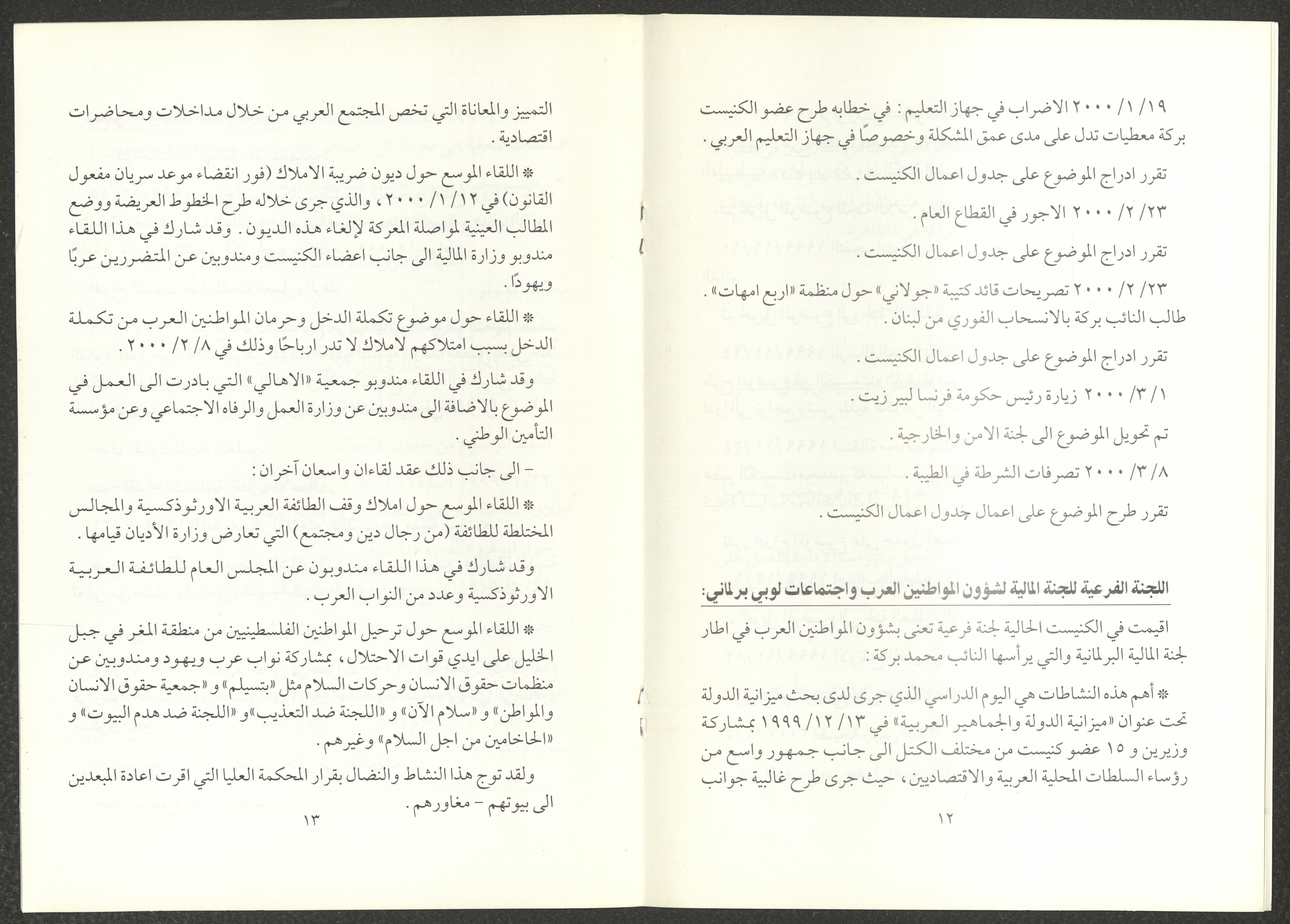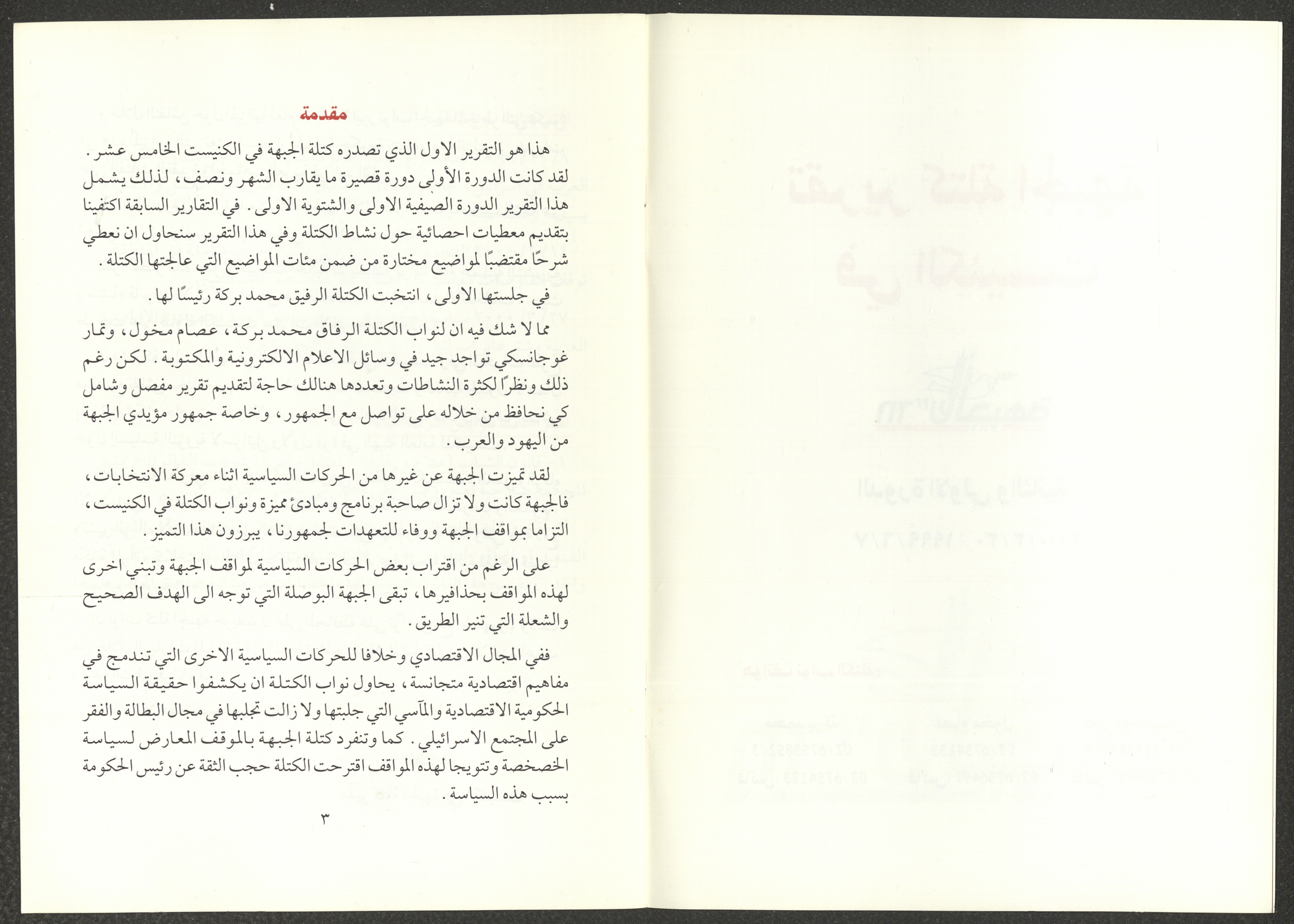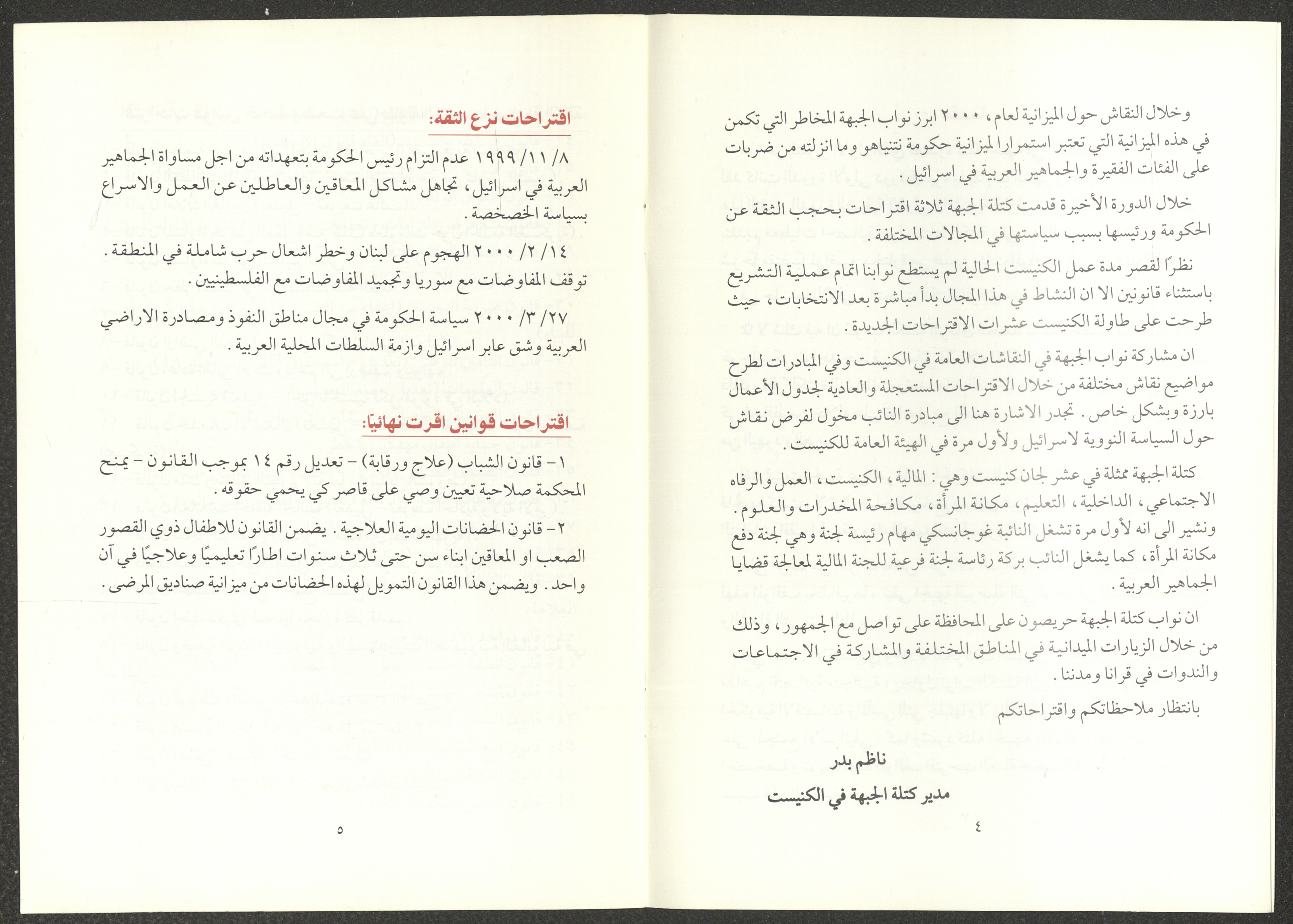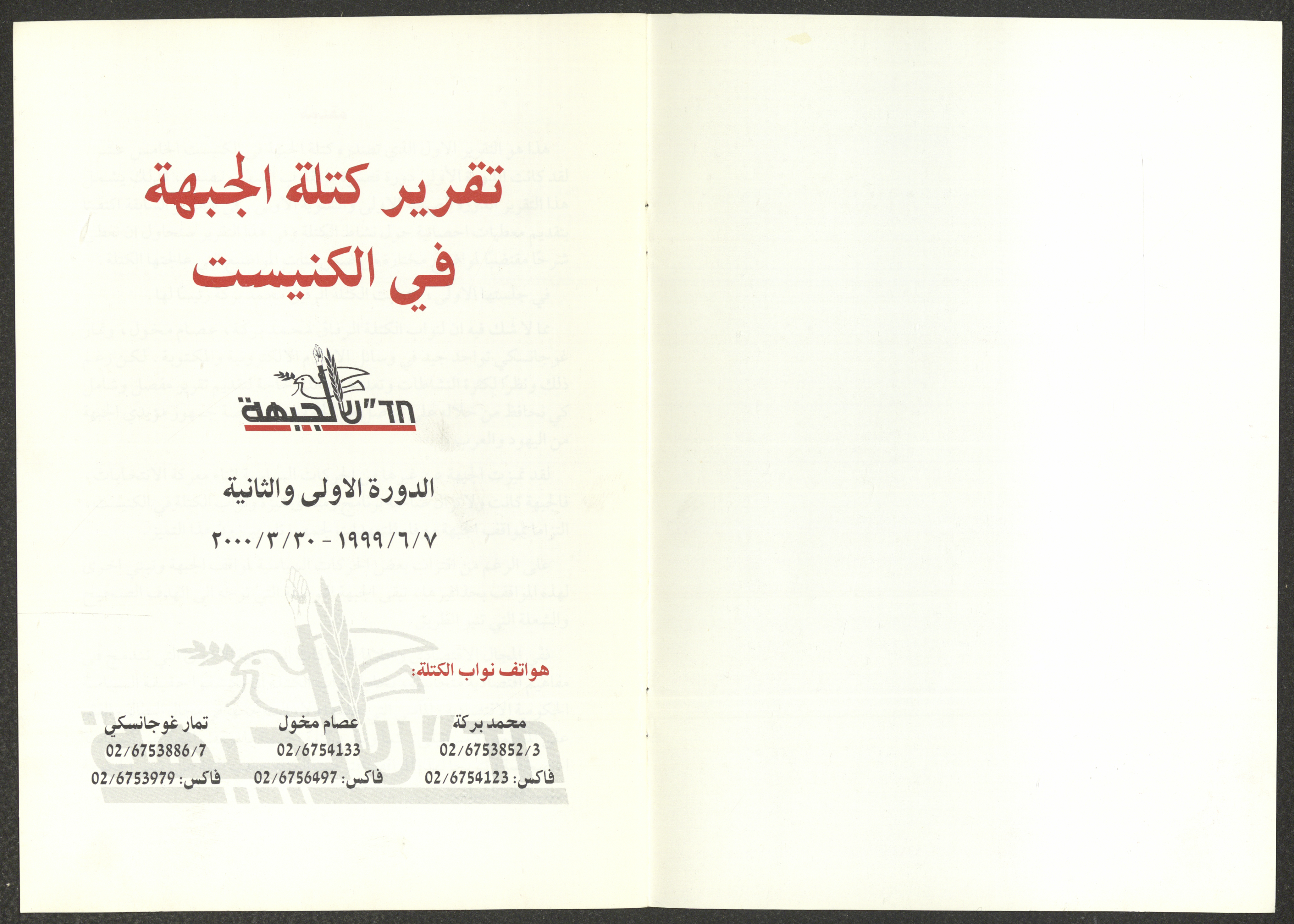 The report of the Democratic Front for Peace and Equality bloc in the Knesset on the first and second sessions from 7 June 1999 to 20 March 2000, includes the front’s most important achievements. The report’s introduction was written by Nazim Badr, the head of the bloc in the Knesset. It also included the names of the bloc's deputies, namely Issam Makhoul, Tamar Gujansky and Muhammad Baraka.