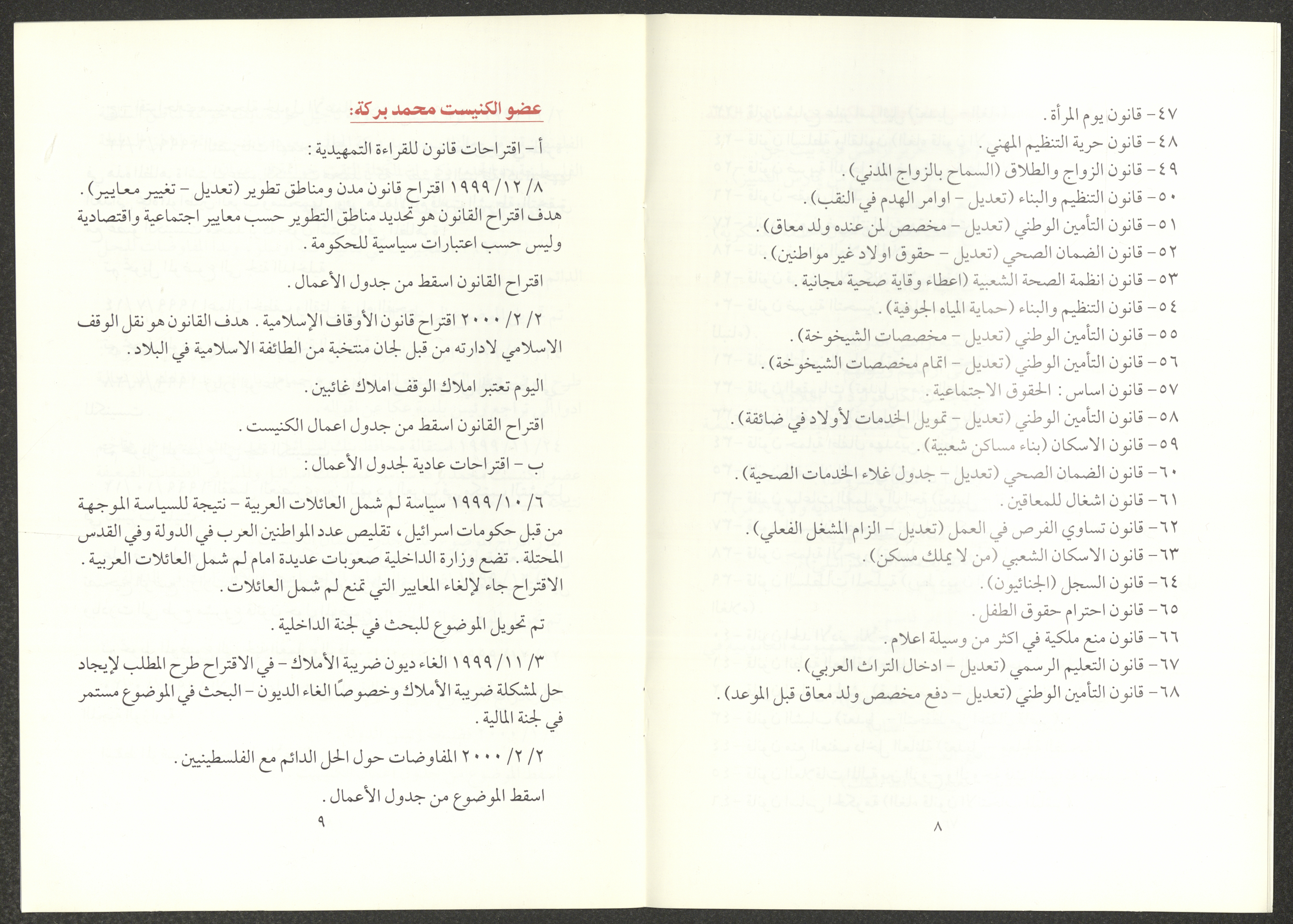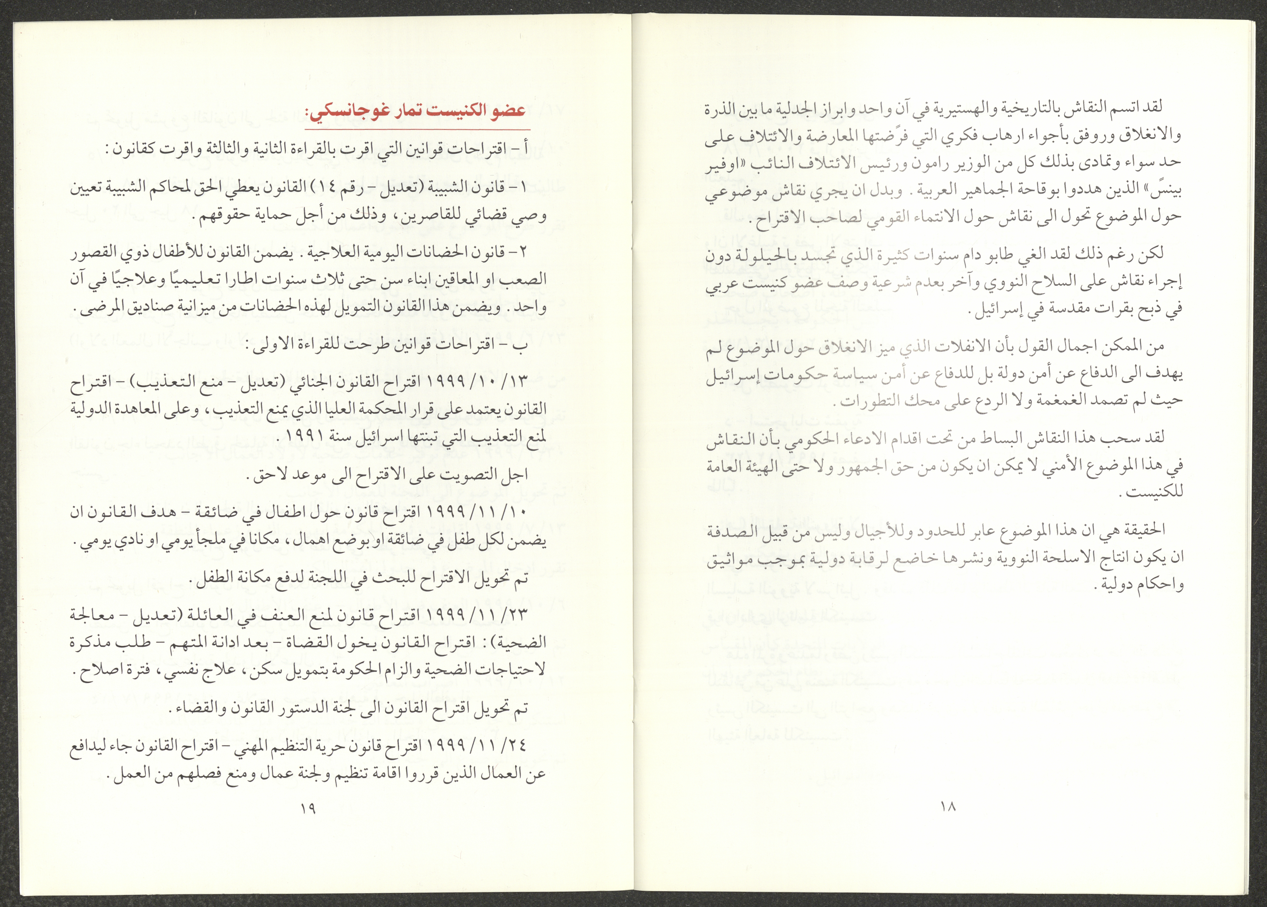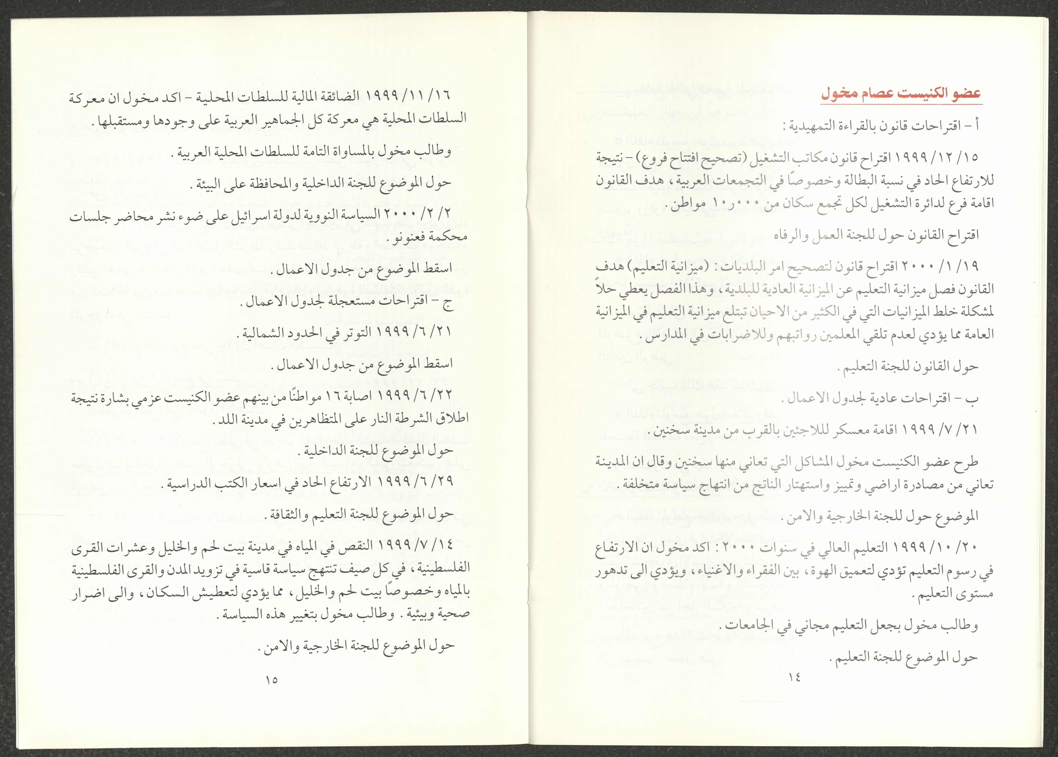 The report of the Democratic Front for Peace and Equality bloc in the Knesset on the first and second sessions from 7 June 1999 to 20 March 2000, includes the front’s most important achievements. The report’s introduction was written by Nazim Badr, the head of the bloc in the Knesset. It also included the names of the bloc's deputies, namely Issam Makhoul, Tamar Gujansky and Muhammad Baraka.