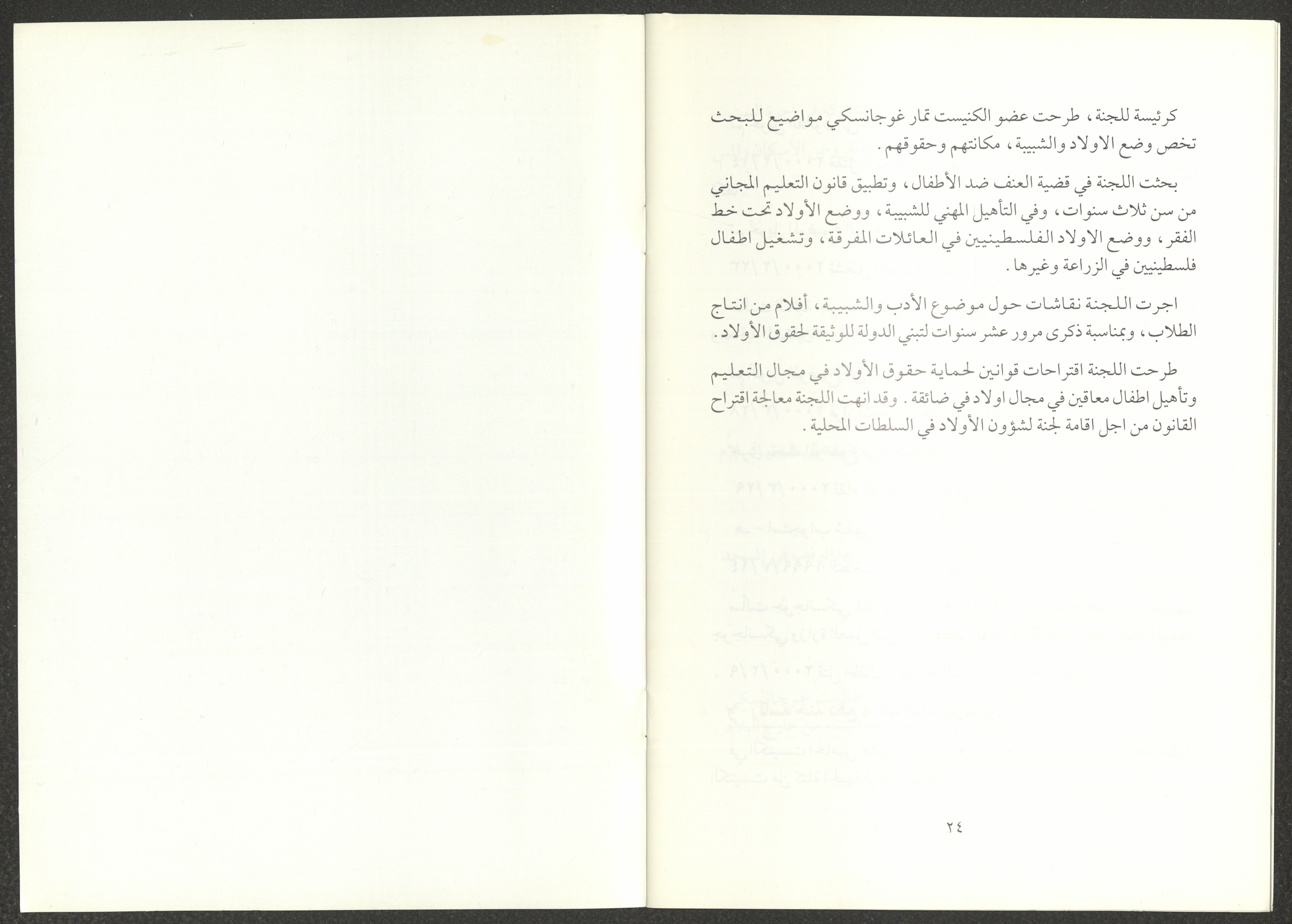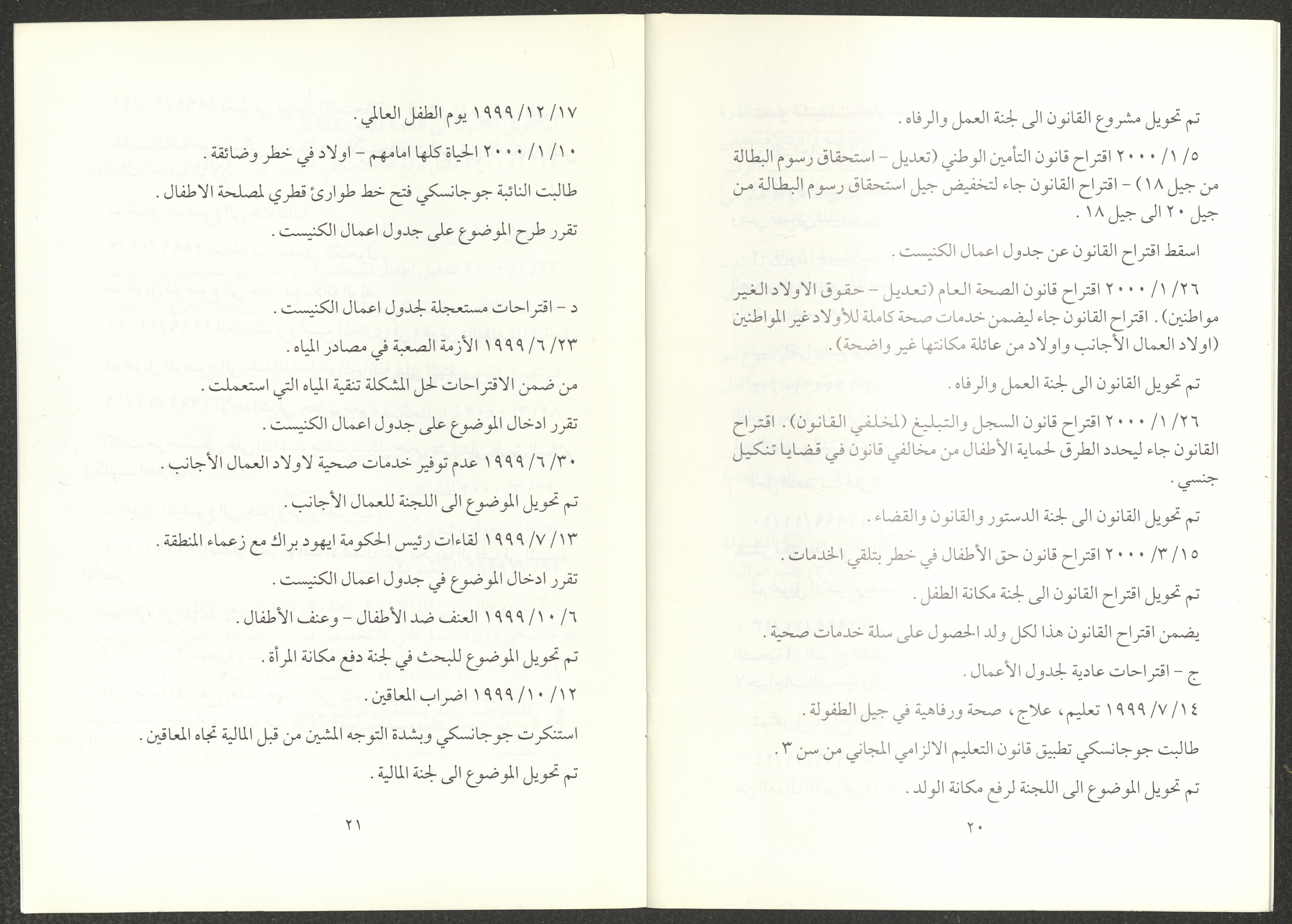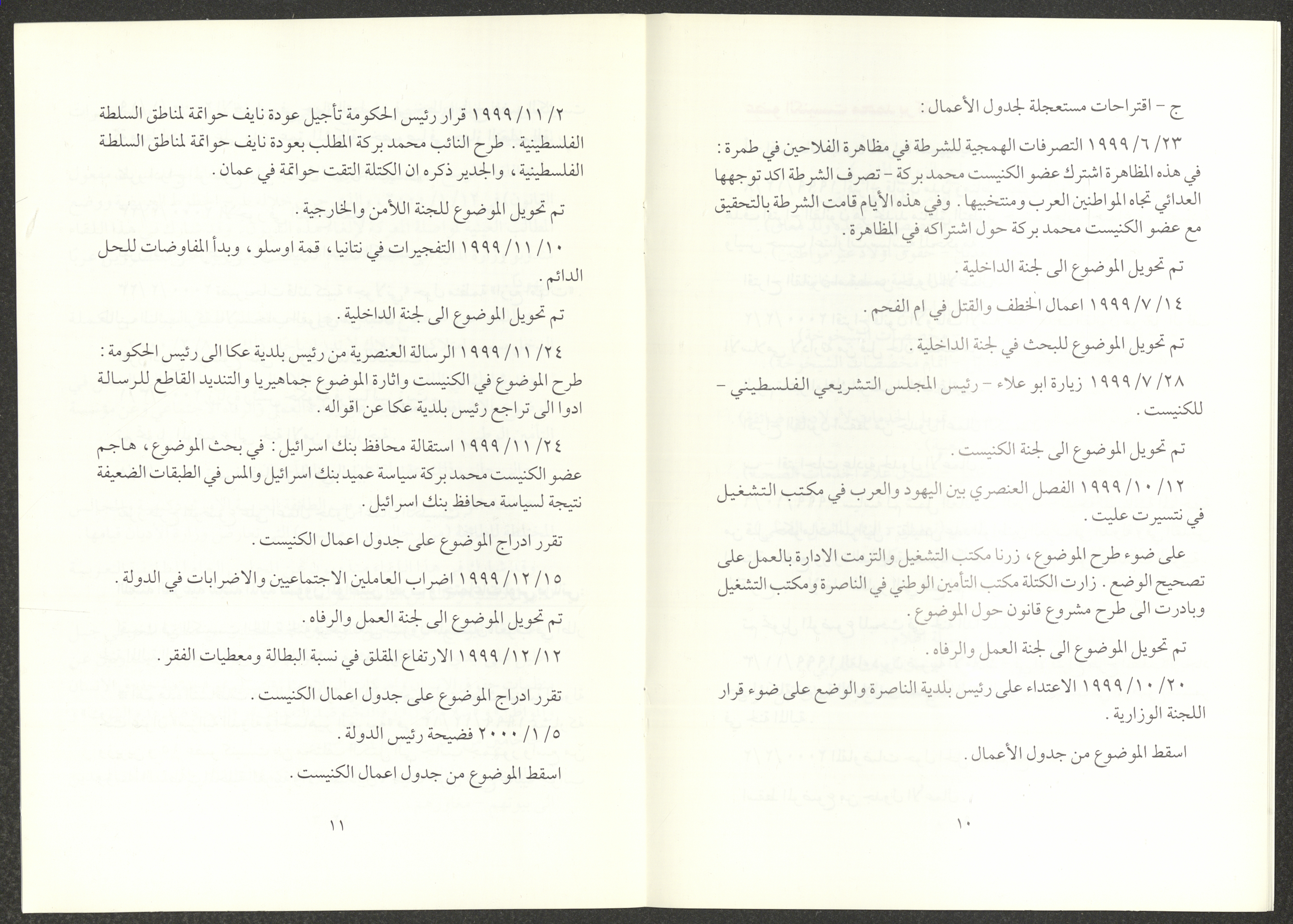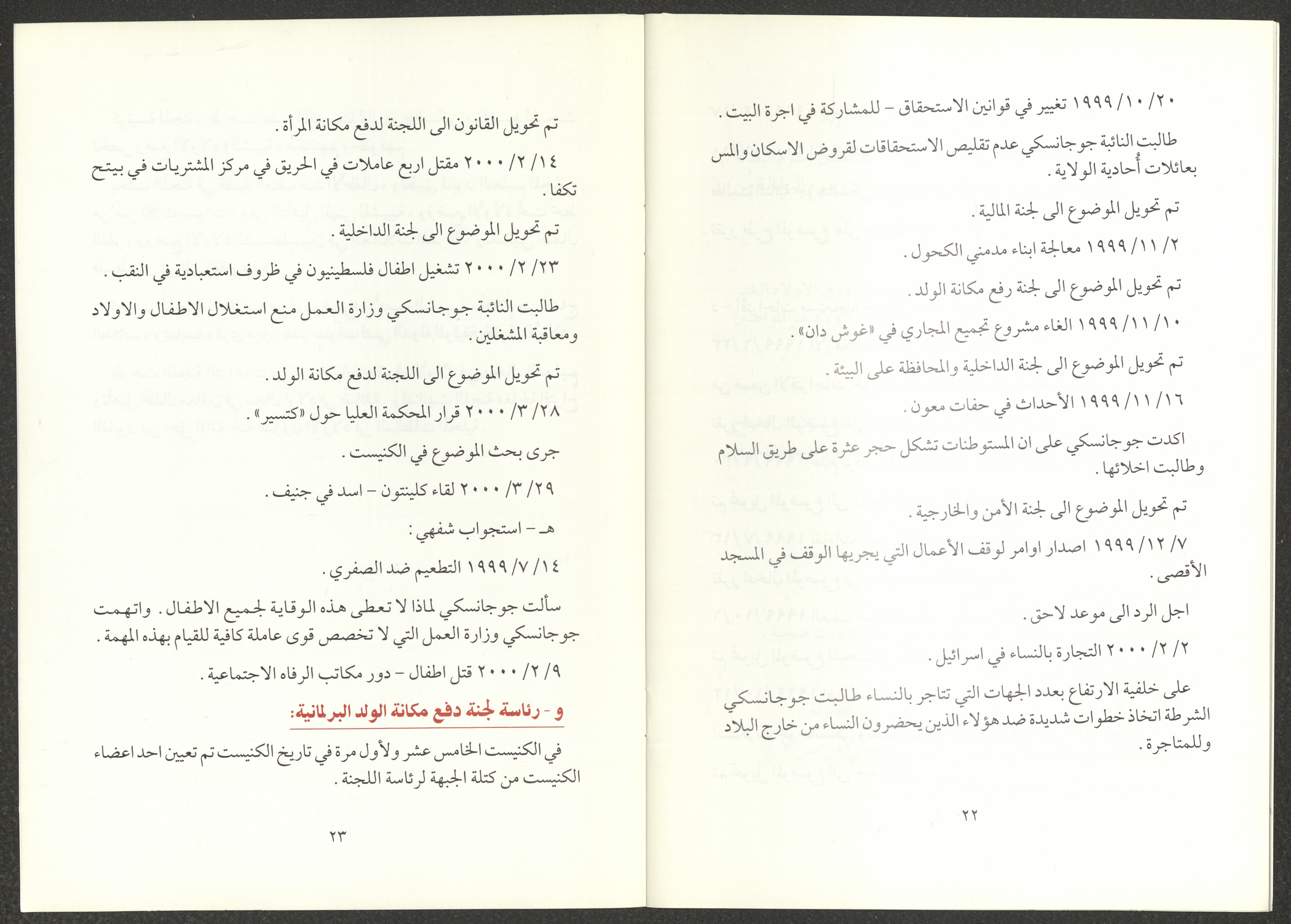The report of the Democratic Front for Peace and Equality bloc in the Knesset on the first and second sessions from 7 June 1999 to 20 March 2000, includes the front’s most important achievements. The report’s introduction was written by Nazim Badr, the head of the bloc in the Knesset. It also included the names of the bloc's deputies, namely Issam Makhoul, Tamar Gujansky and Muhammad Baraka.
