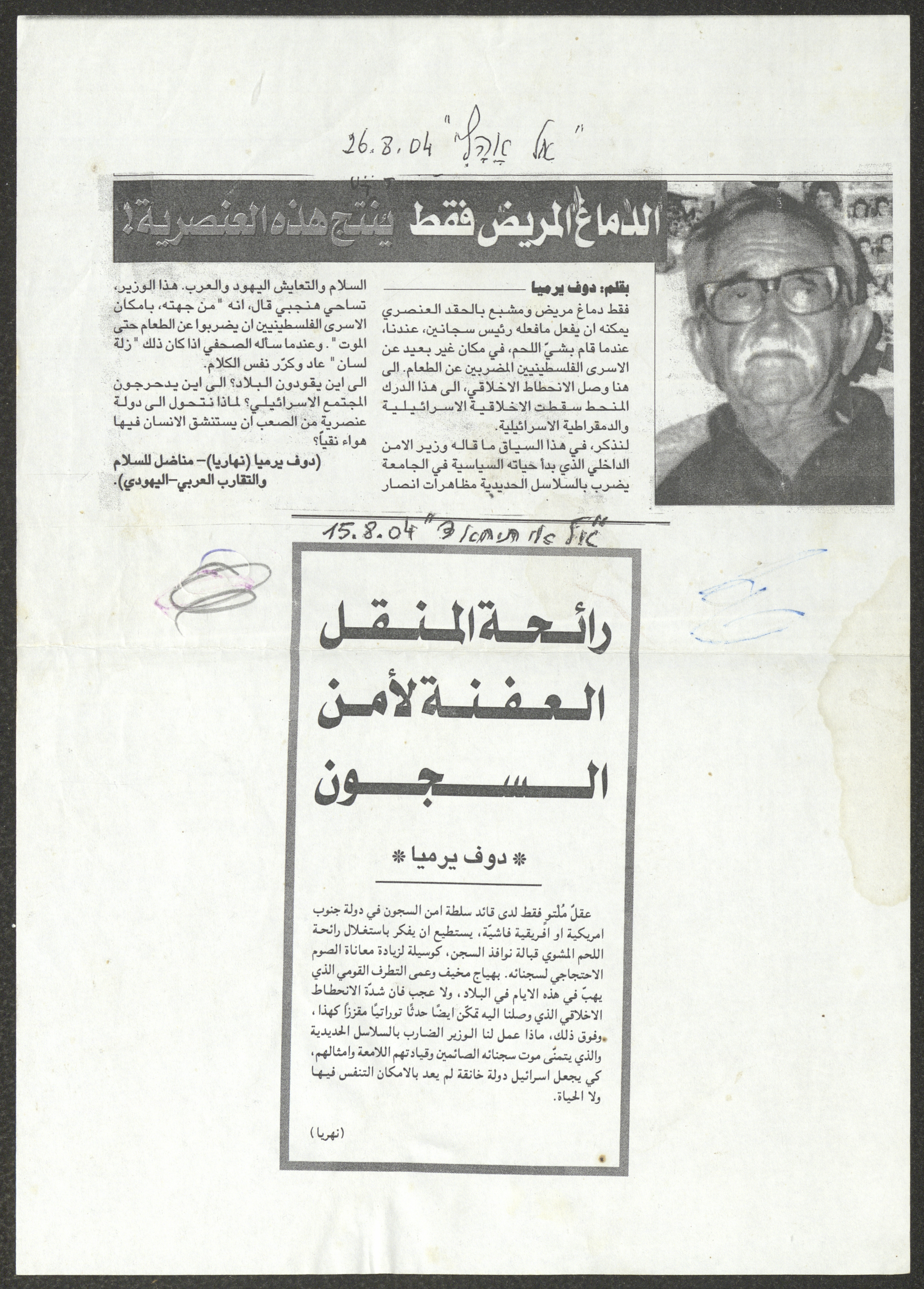 Two newspaper clippings containing articles by Dov Yermiya titled "Only a Sick Brain Produces this Racism", published on 26 August 2004, and "The Rotten Smell of the Grill for Prison Security", published on 15 August 2004.