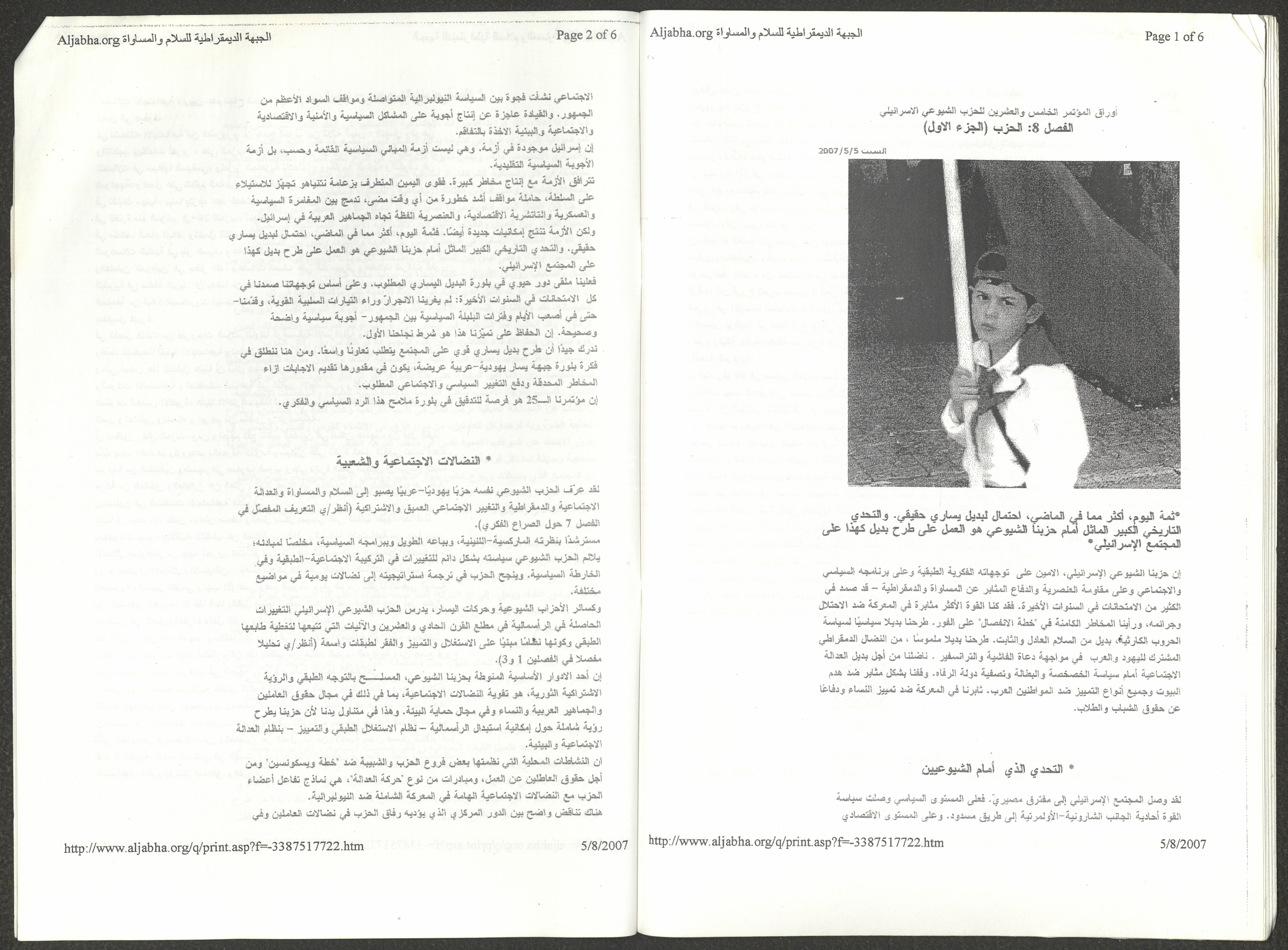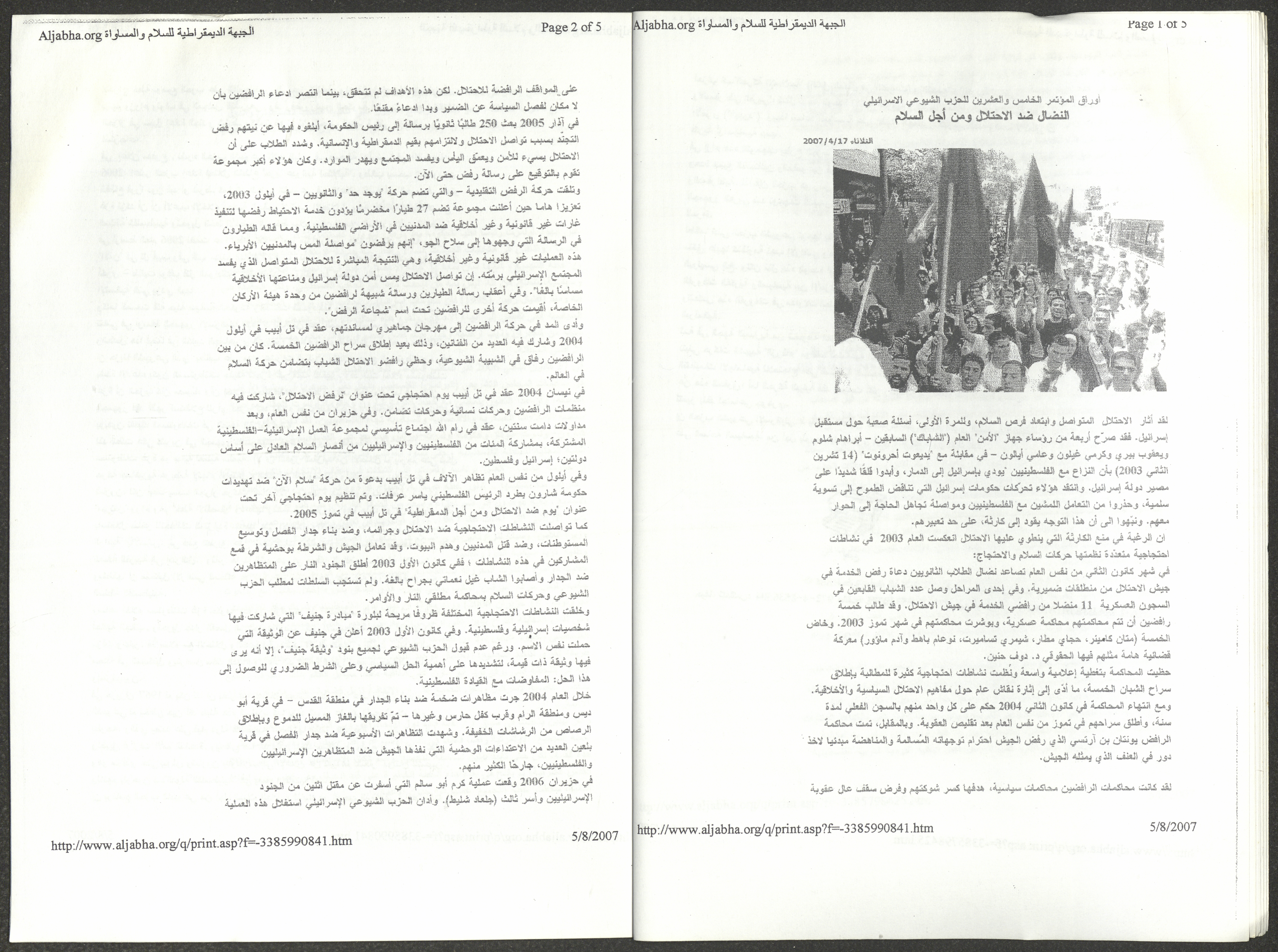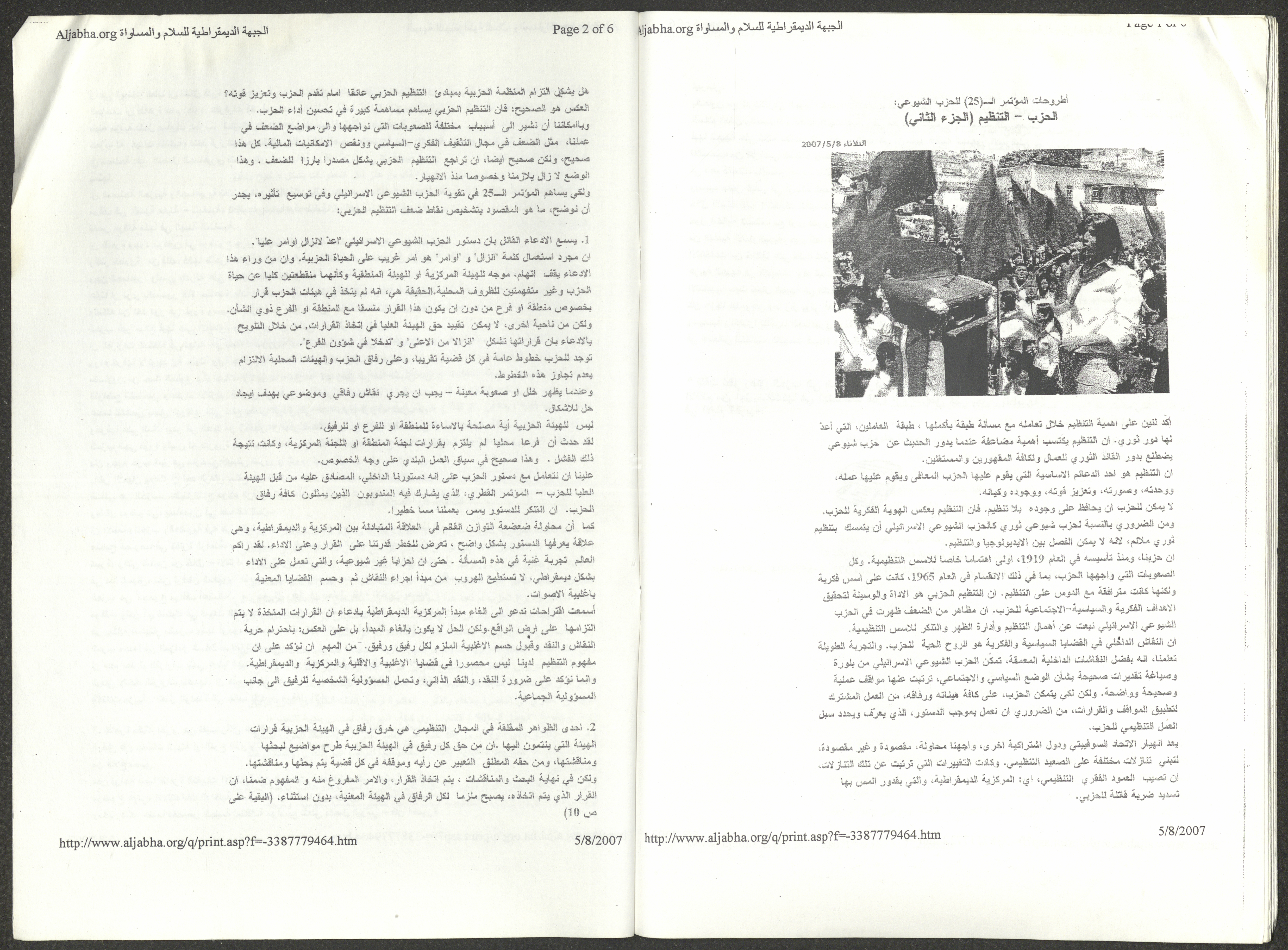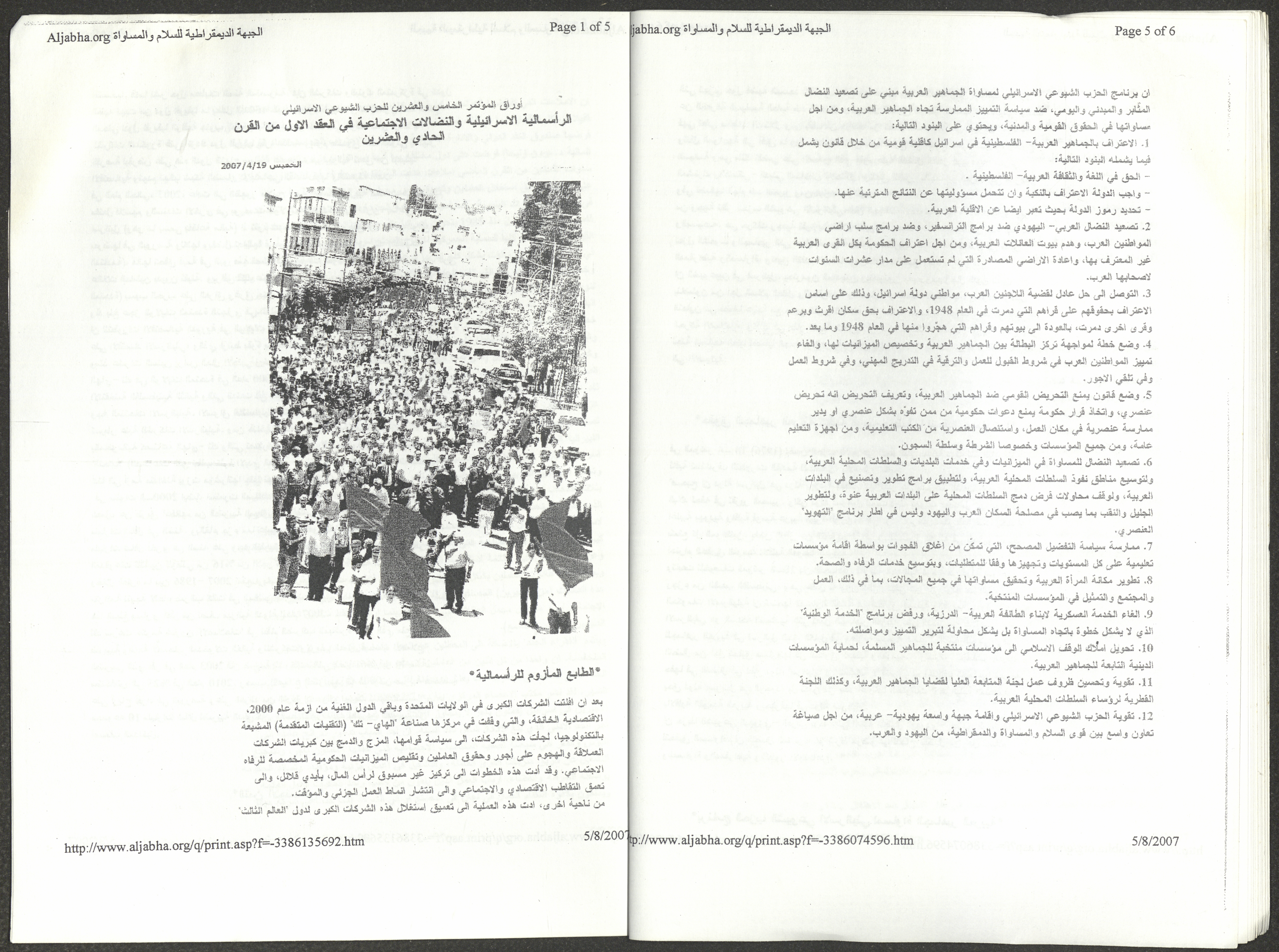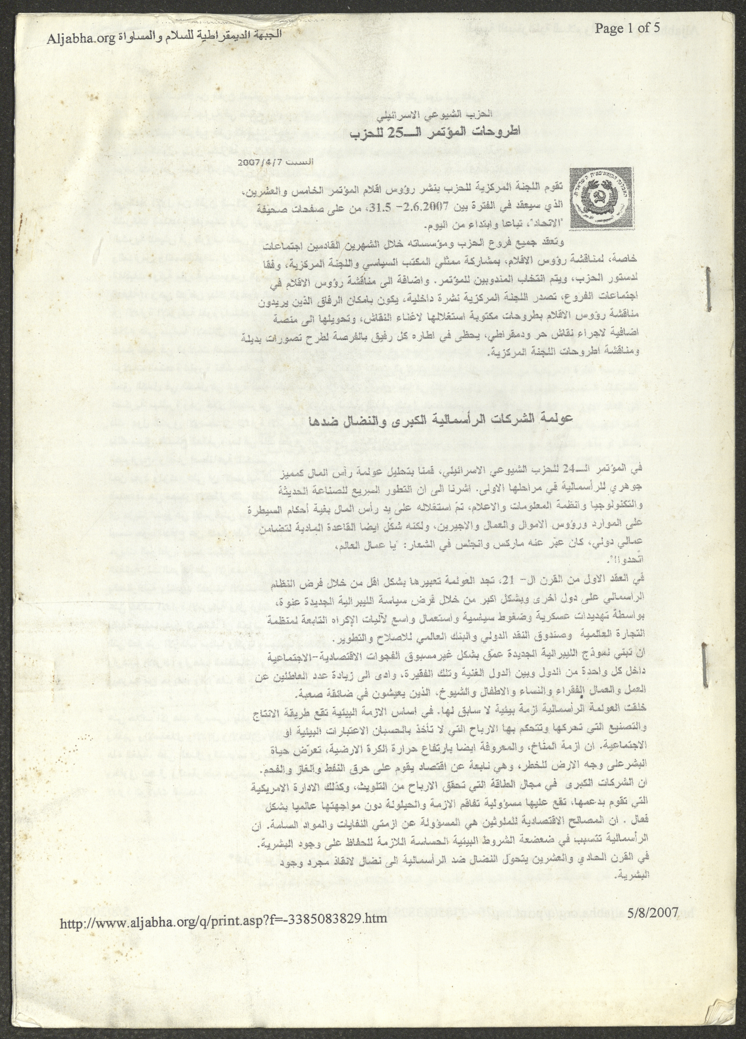 A five-page document that includes a report containing the most important theses of the twenty-fifth conference of the Israeli Communist Party, which will be held from 31 May to 2 June 2007, which was published by the Democratic Front for Peace and Equality in the al-Ittihad newspaper. The most important of which are the following: The globalization of big companies and fighting against it. Democratic changes in the world. The opposition of globalizing big companies in the world. Political developments since the 24th conference. Fighting against occupation and for peace.