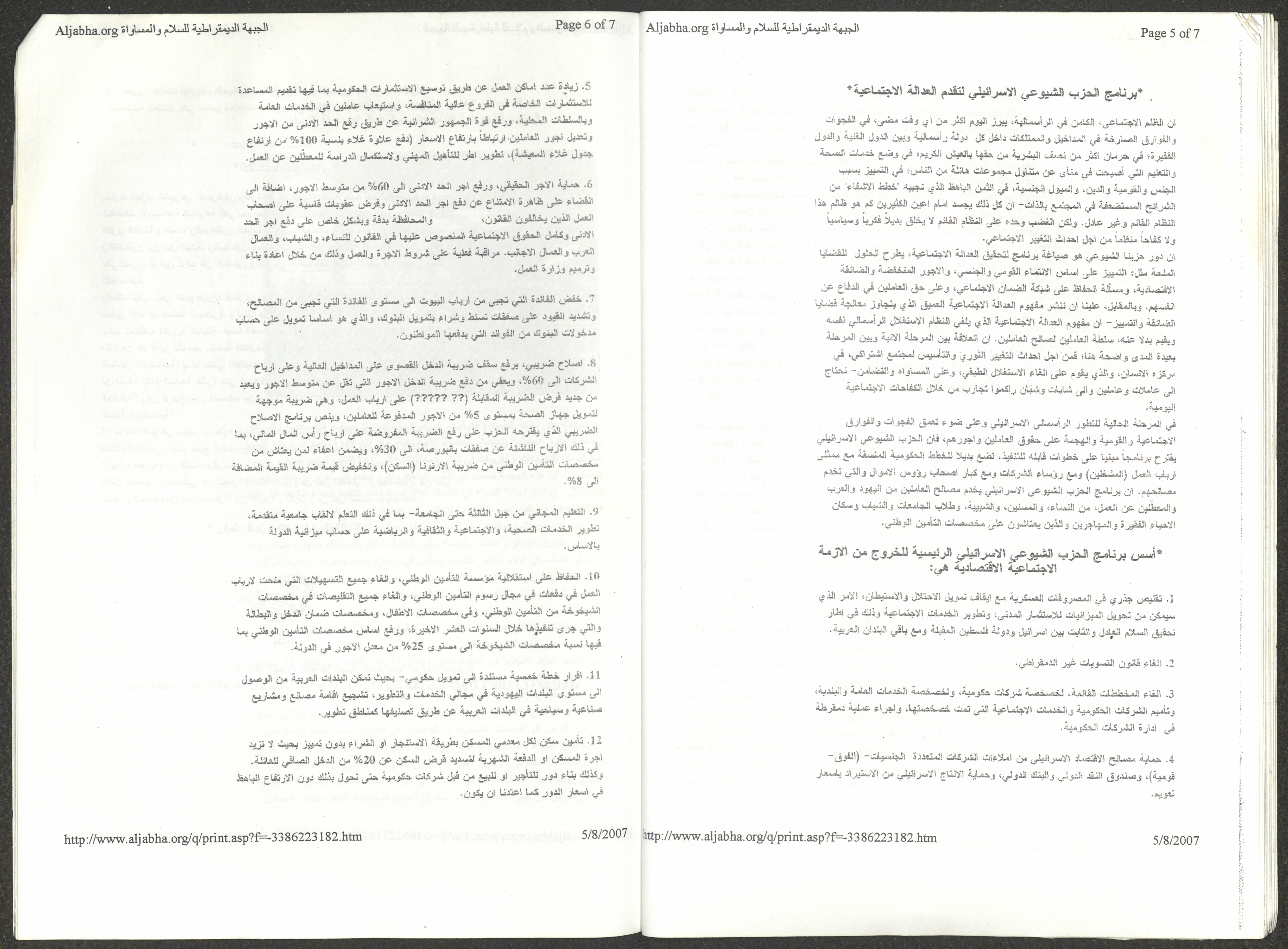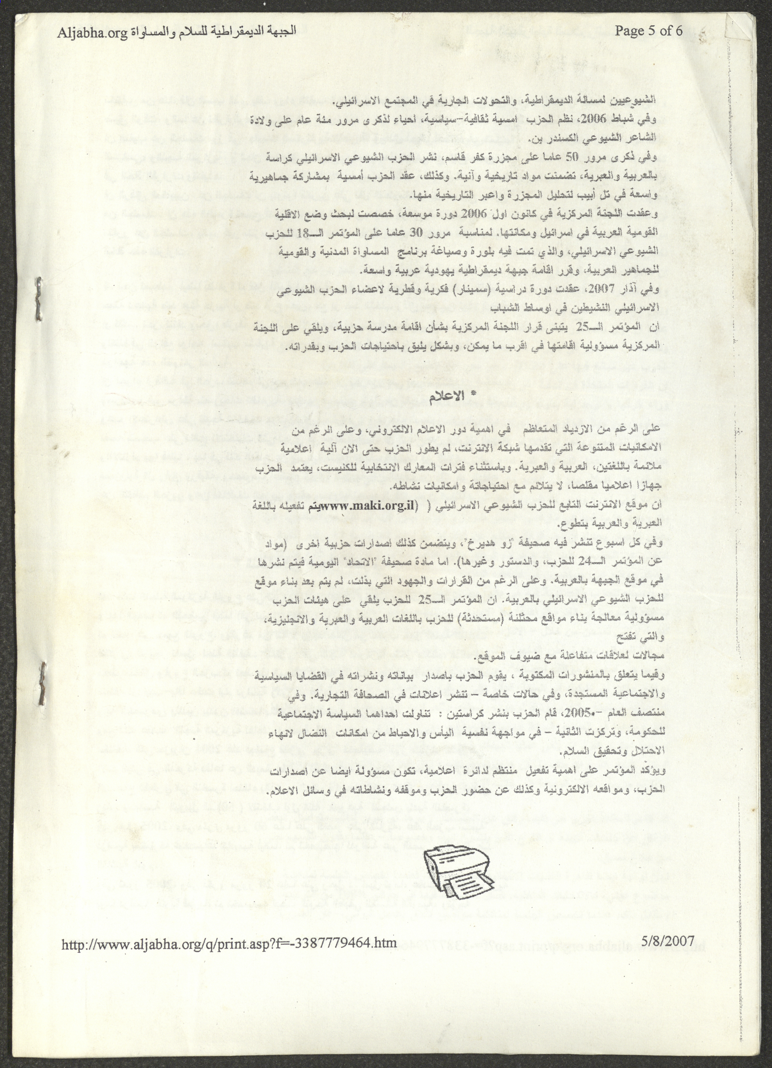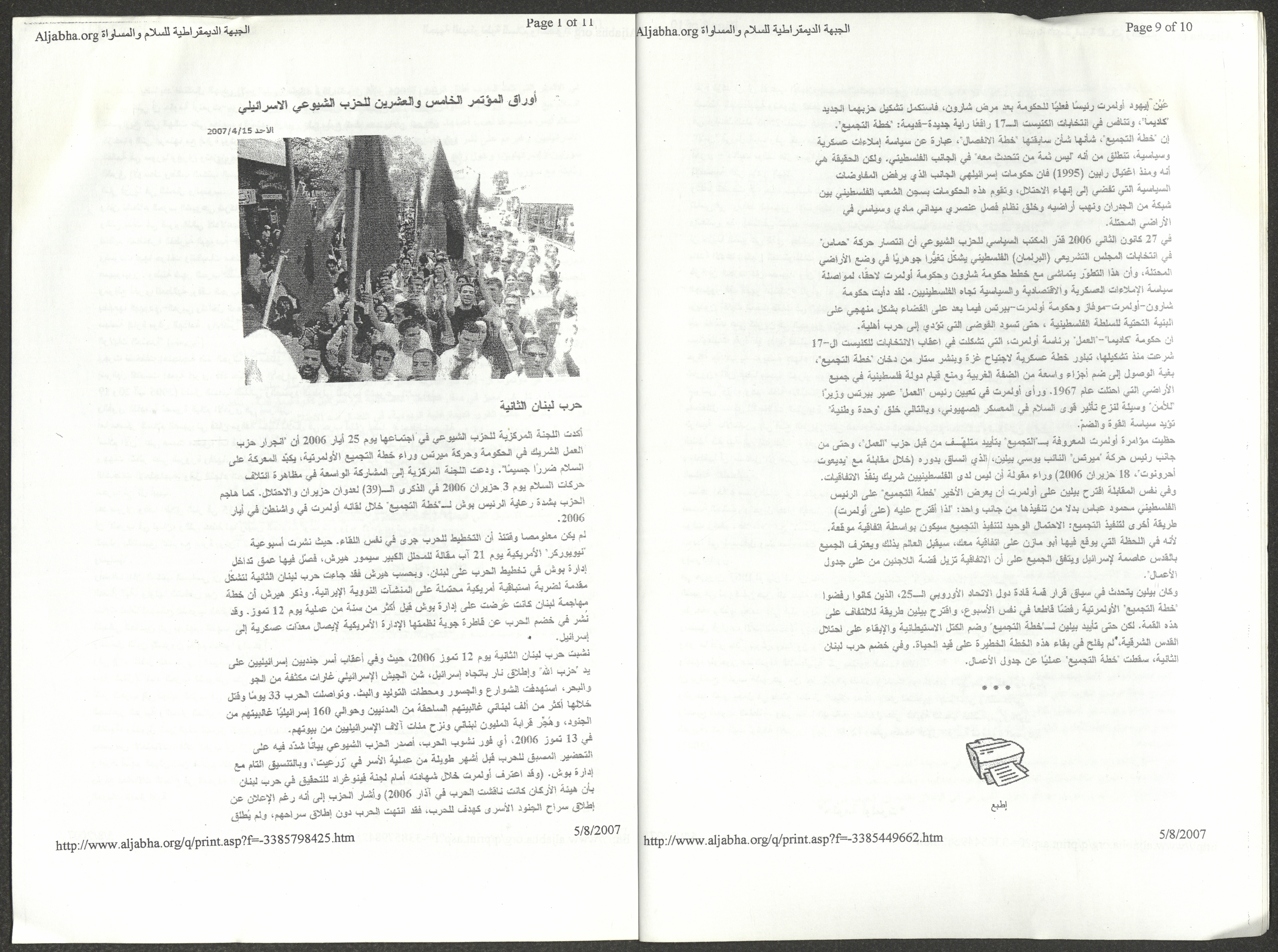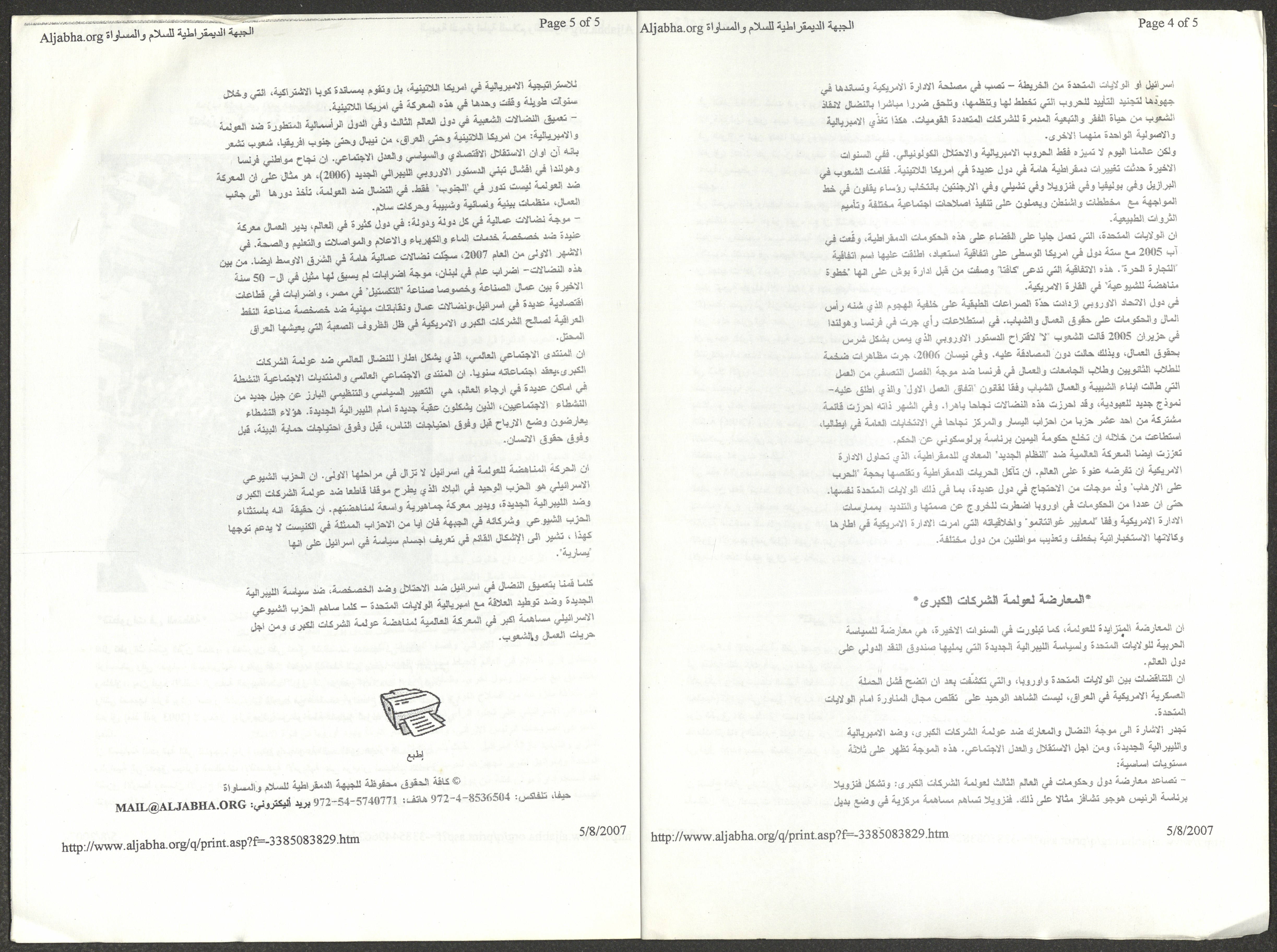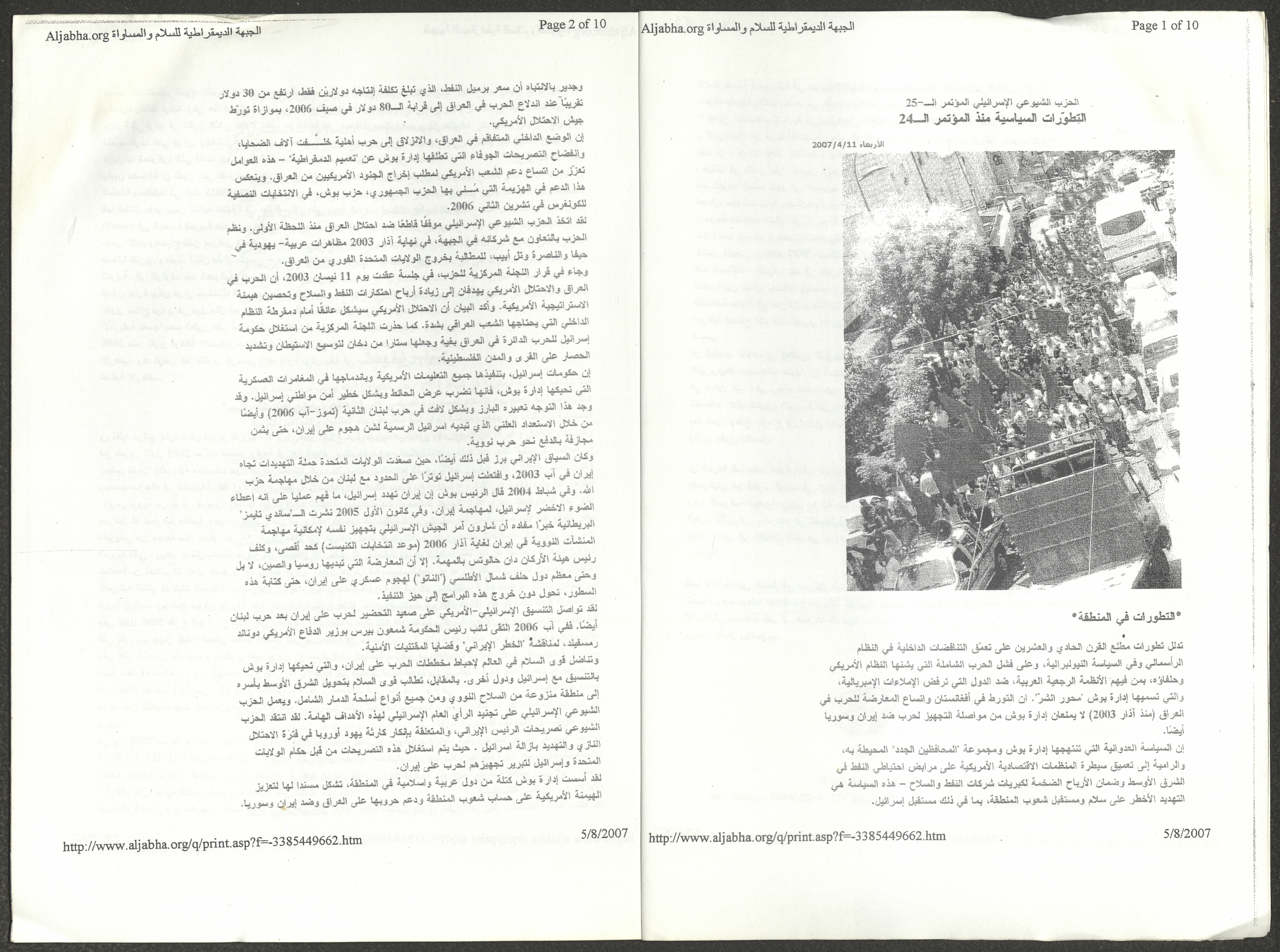 A five-page document that includes a report containing the most important theses of the twenty-fifth conference of the Israeli Communist Party, which will be held from 31 May to 2 June 2007, which was published by the Democratic Front for Peace and Equality in the al-Ittihad newspaper. The most important of which are the following: The globalization of big companies and fighting against it. Democratic changes in the world. The opposition of globalizing big companies in the world. Political developments since the 24th conference. Fighting against occupation and for peace.