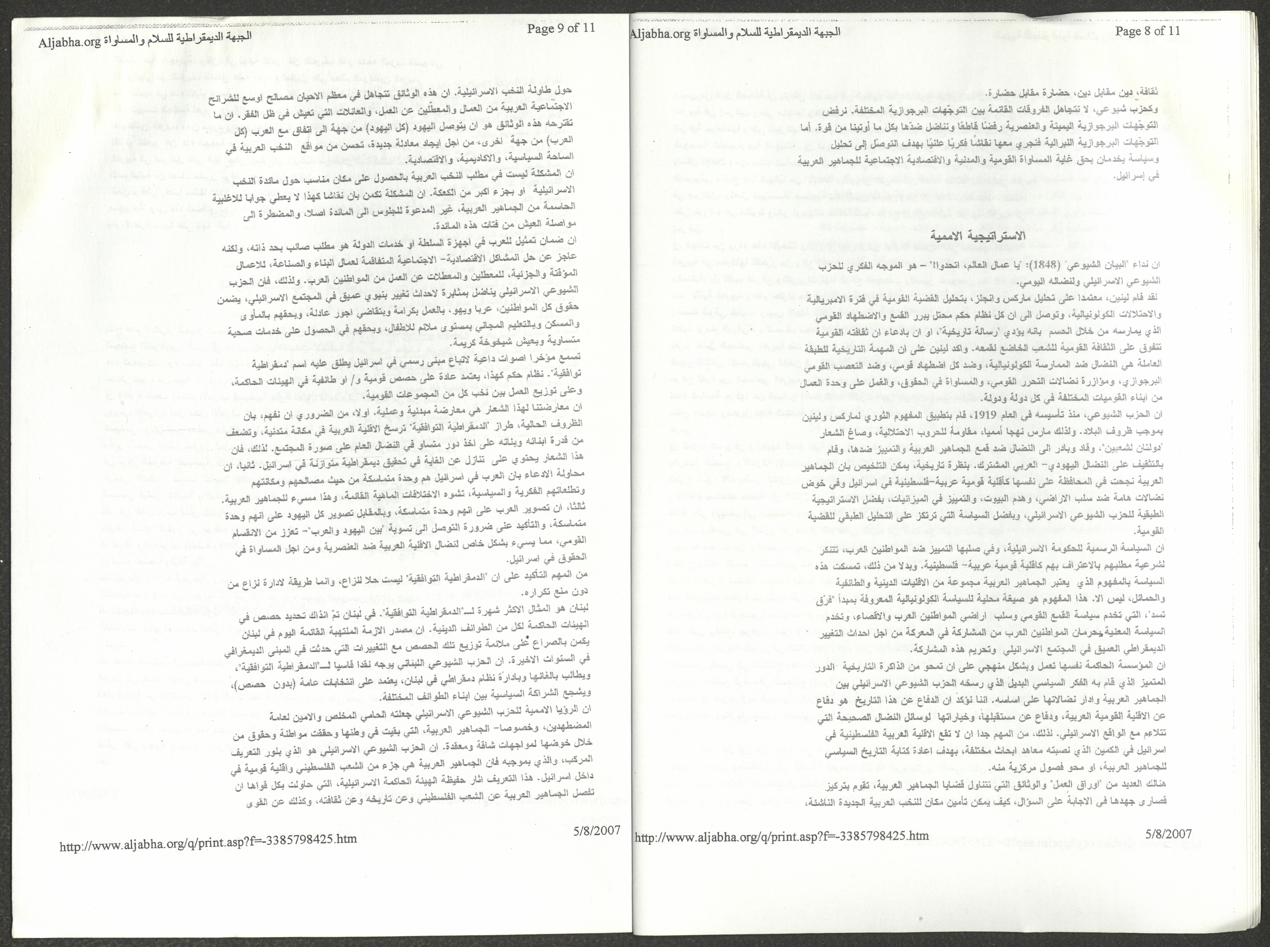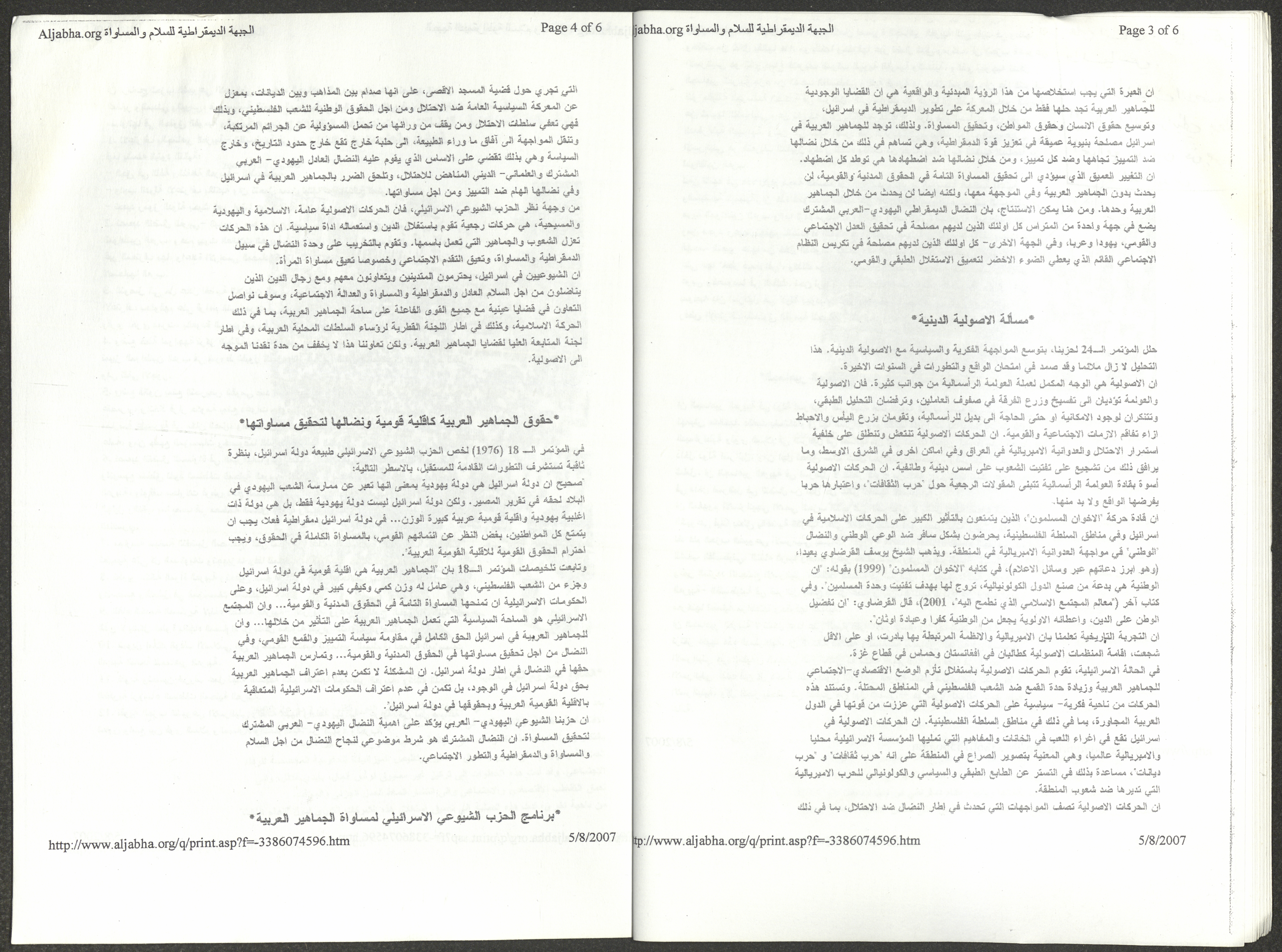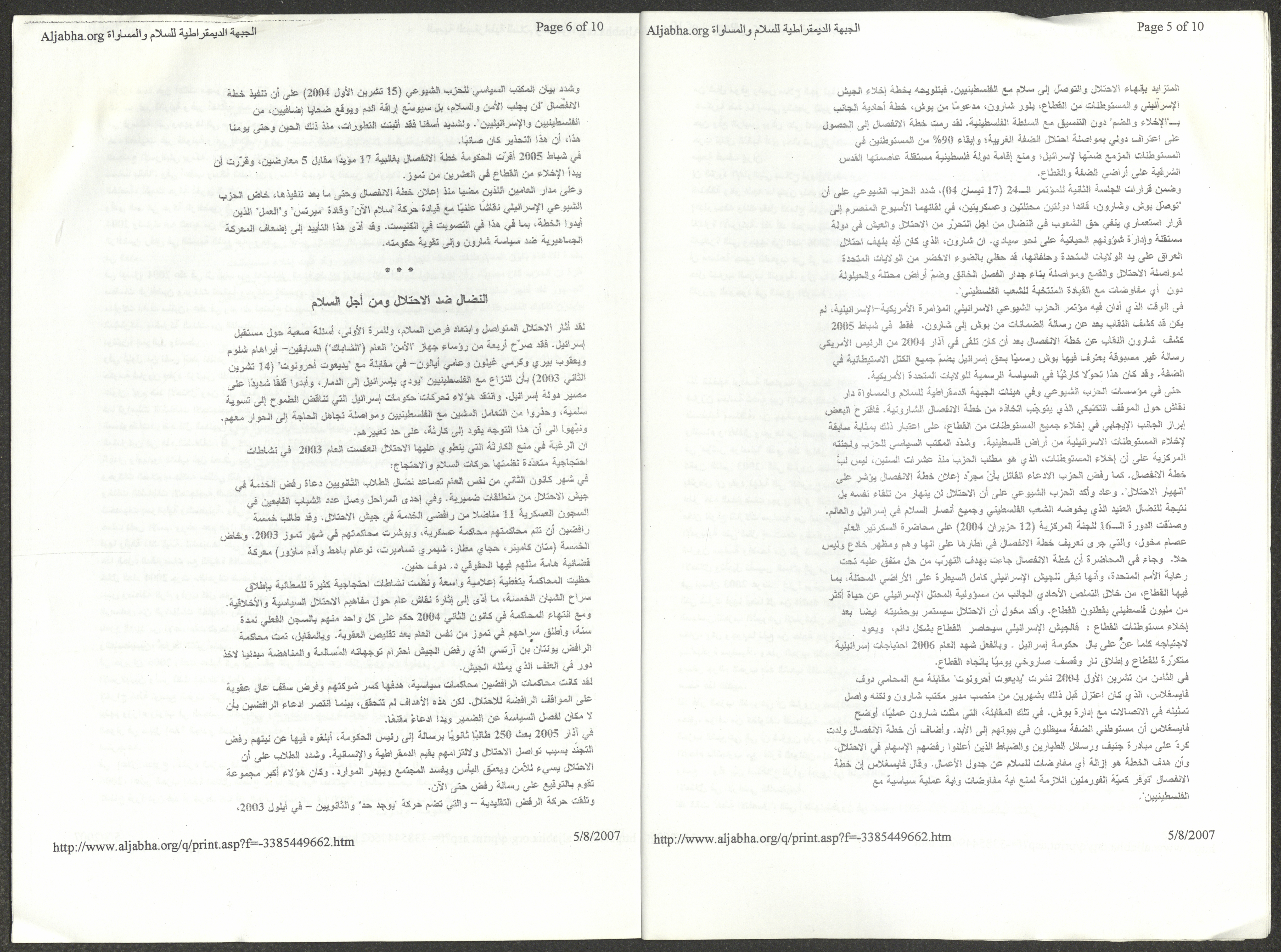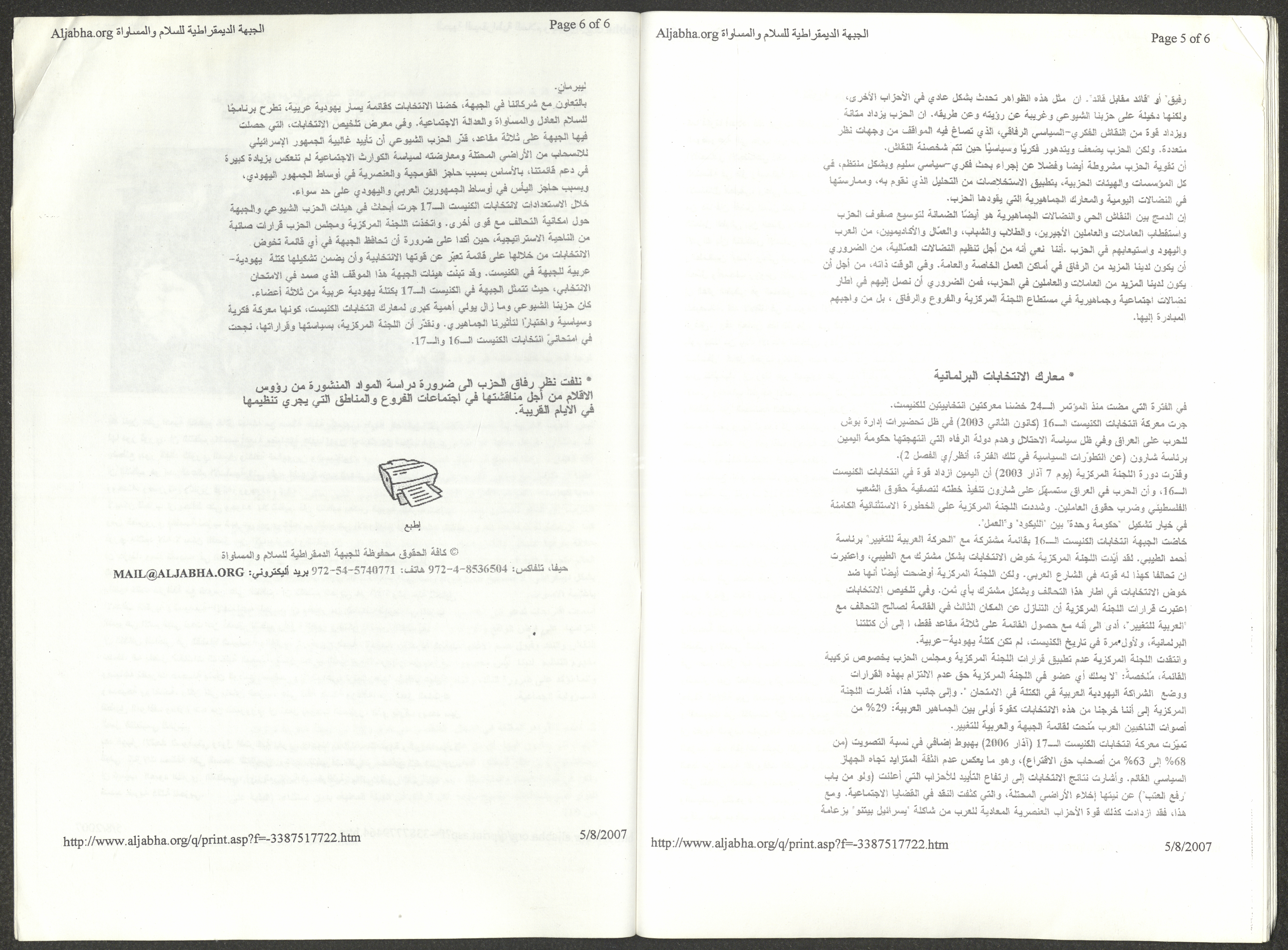 A five-page document that includes a report containing the most important theses of the twenty-fifth conference of the Israeli Communist Party, which will be held from 31 May to 2 June 2007, which was published by the Democratic Front for Peace and Equality in the al-Ittihad newspaper. The most important of which are the following: The globalization of big companies and fighting against it. Democratic changes in the world. The opposition of globalizing big companies in the world. Political developments since the 24th conference. Fighting against occupation and for peace.