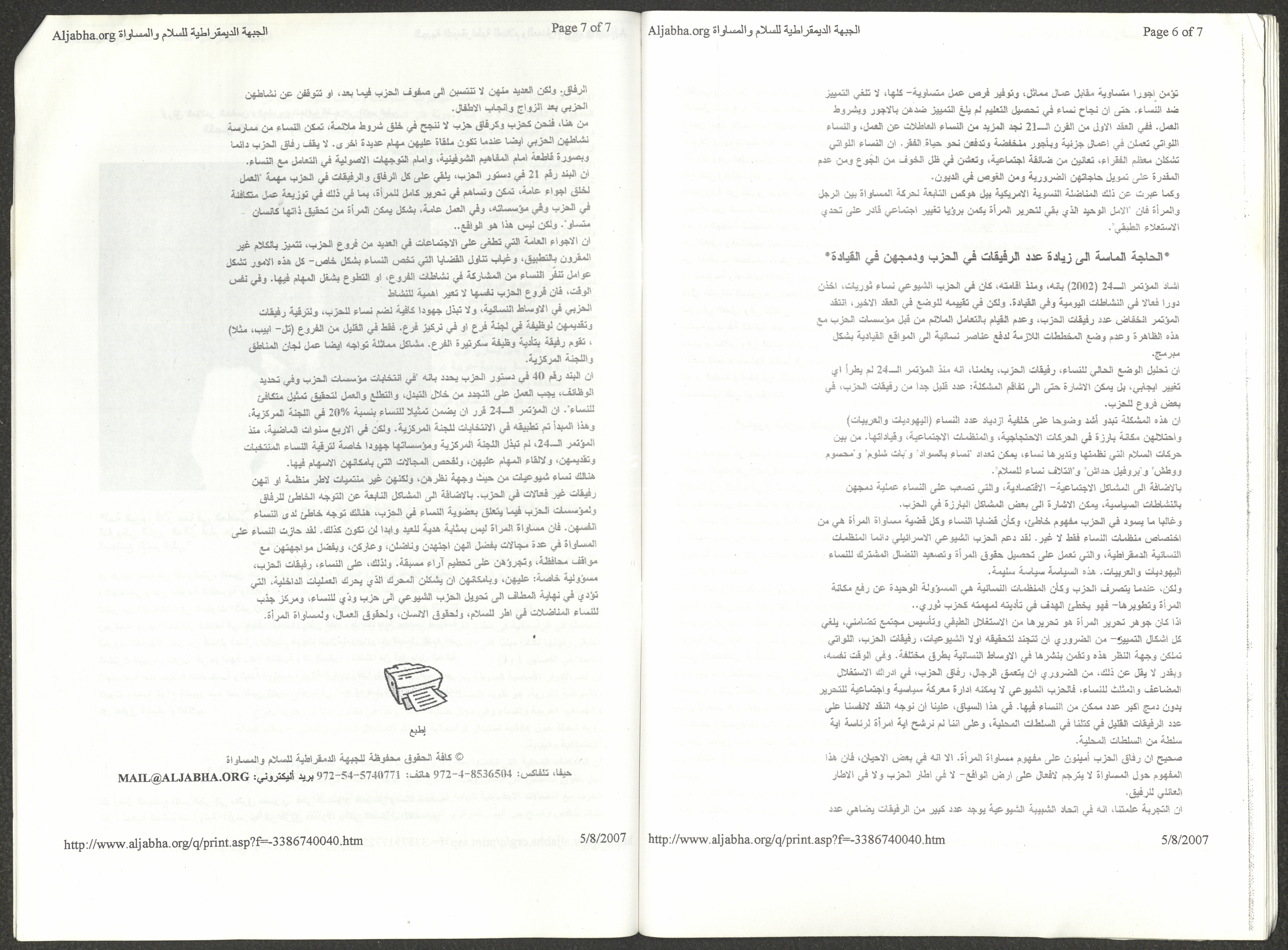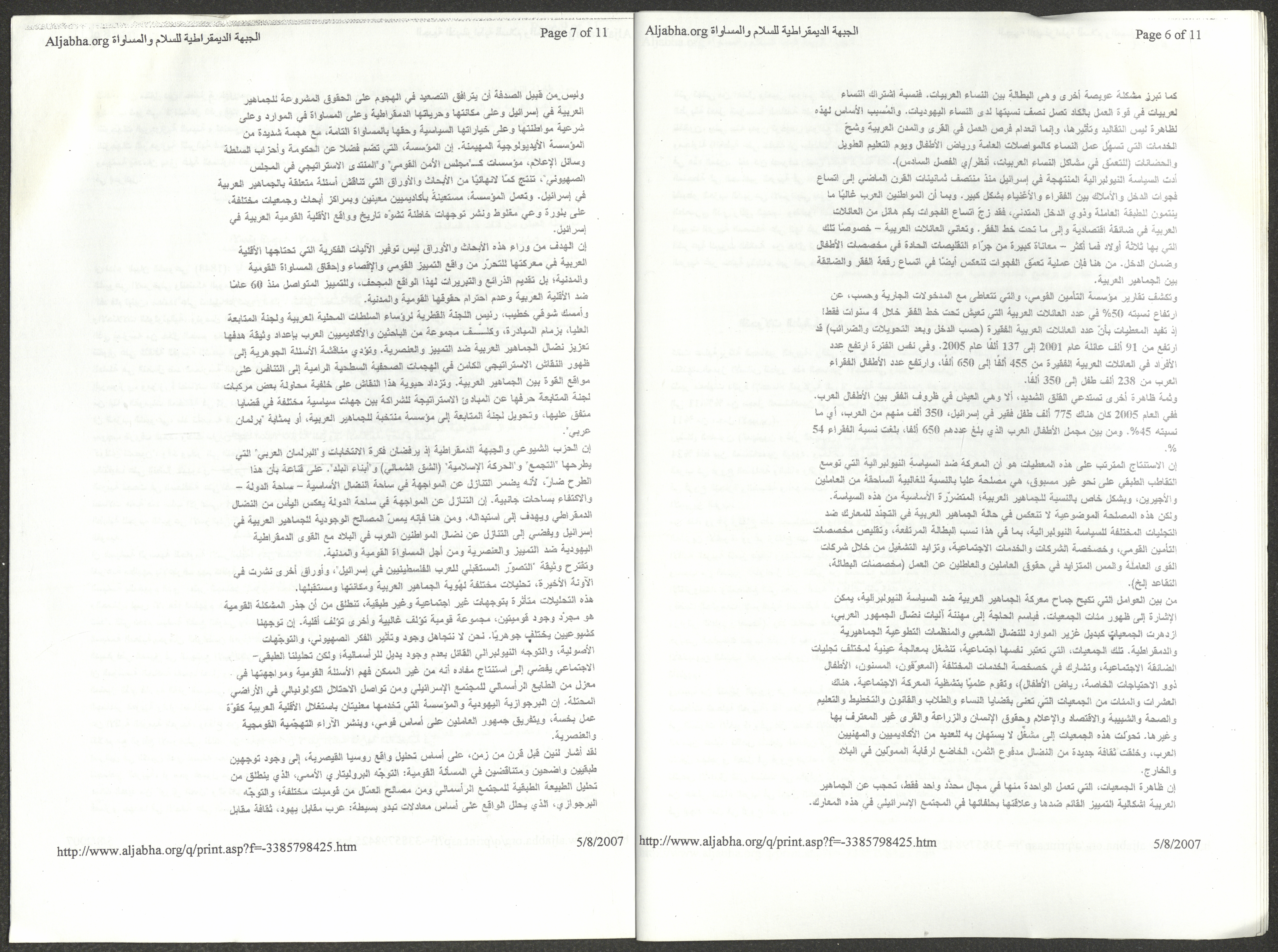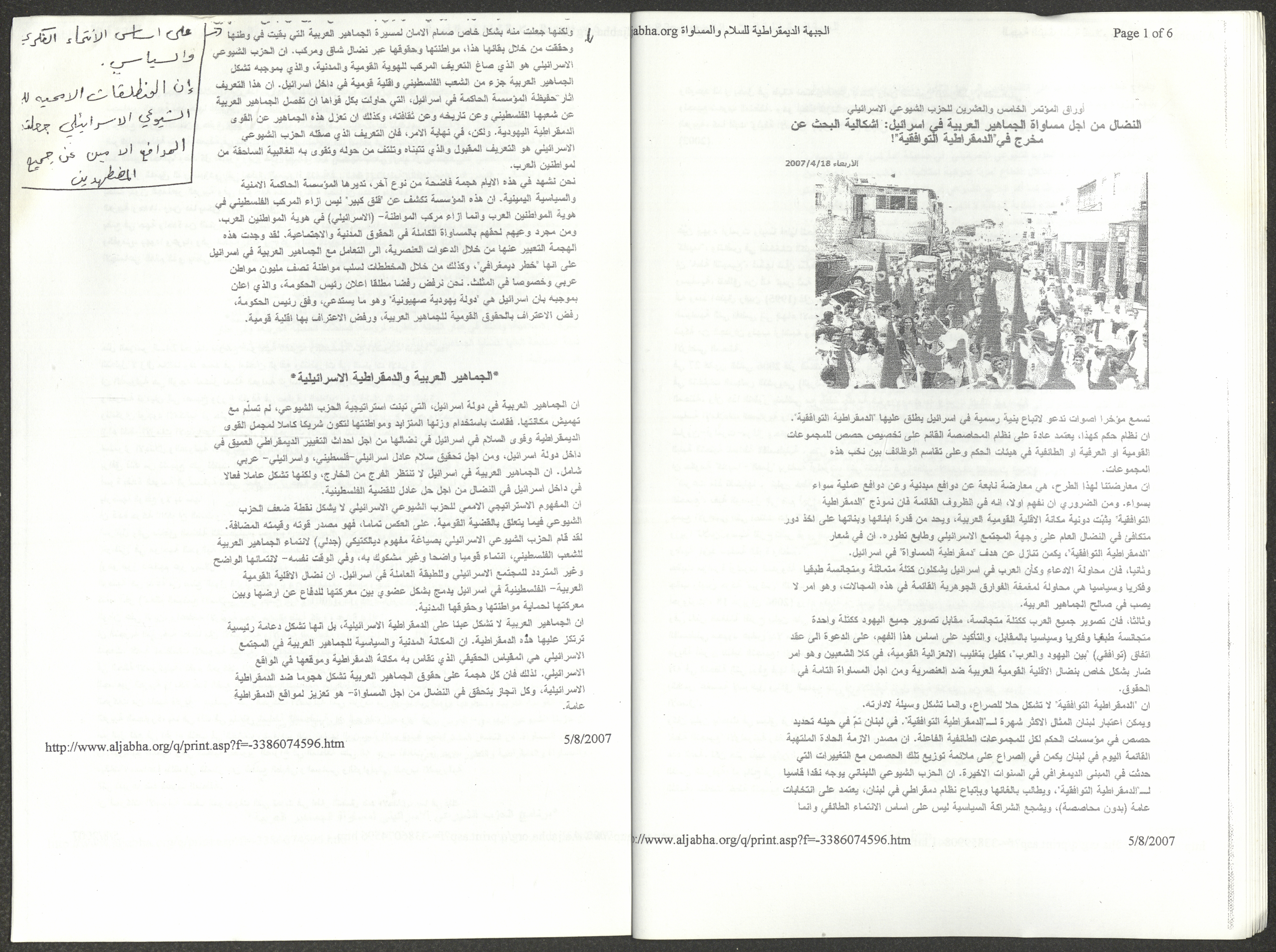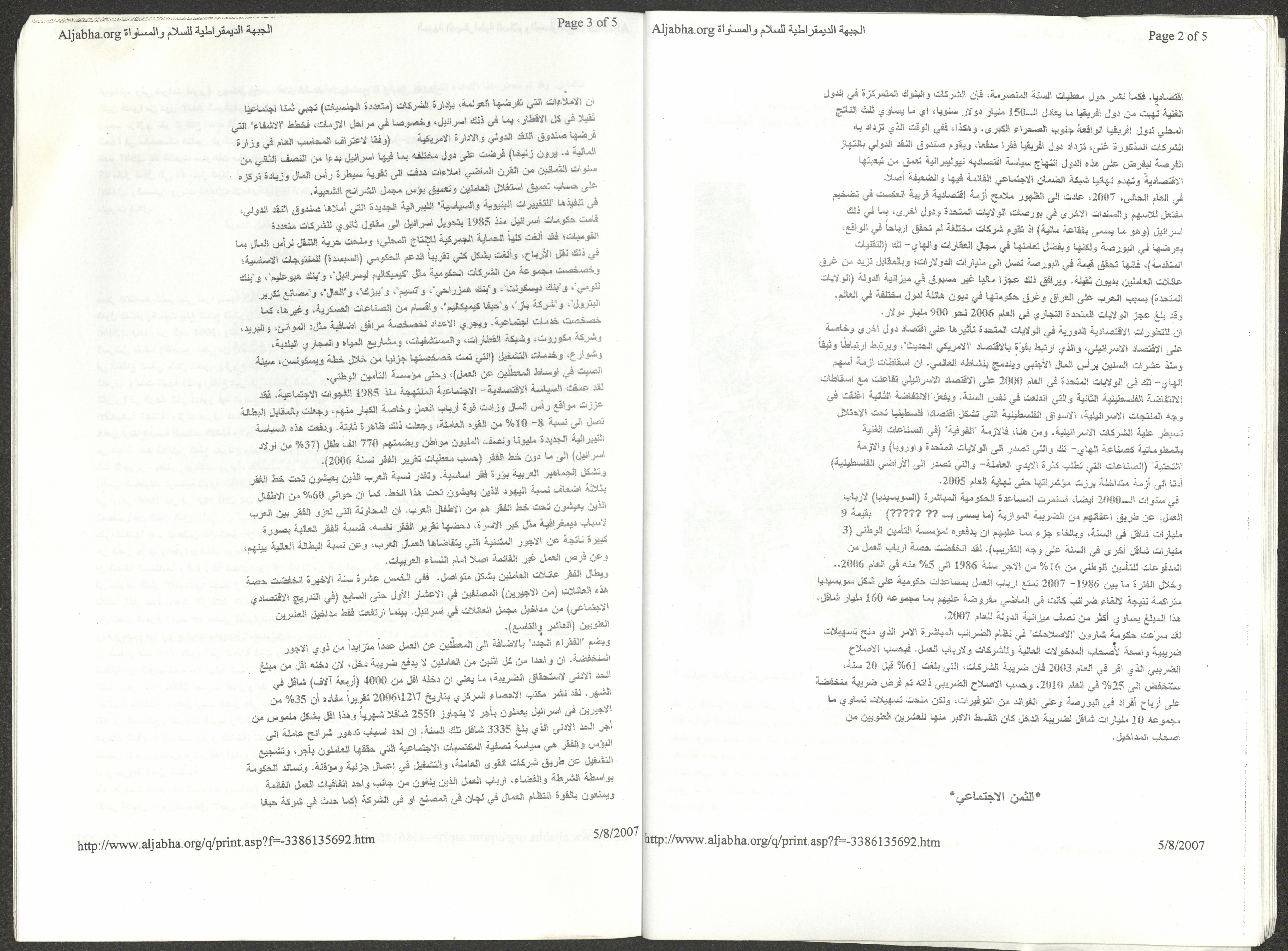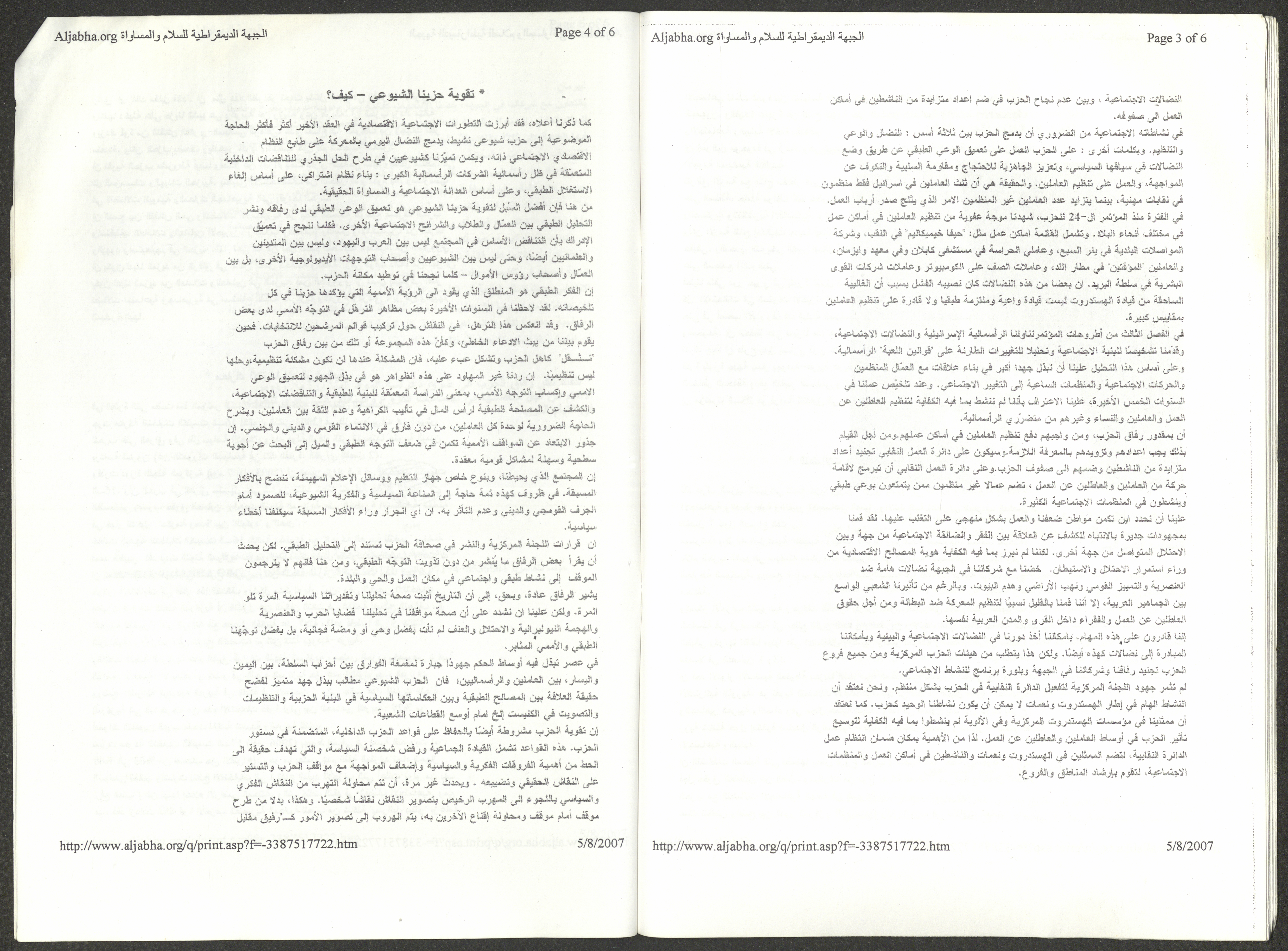 A five-page document that includes a report containing the most important theses of the twenty-fifth conference of the Israeli Communist Party, which will be held from 31 May to 2 June 2007, which was published by the Democratic Front for Peace and Equality in the al-Ittihad newspaper. The most important of which are the following: The globalization of big companies and fighting against it. Democratic changes in the world. The opposition of globalizing big companies in the world. Political developments since the 24th conference. Fighting against occupation and for peace.