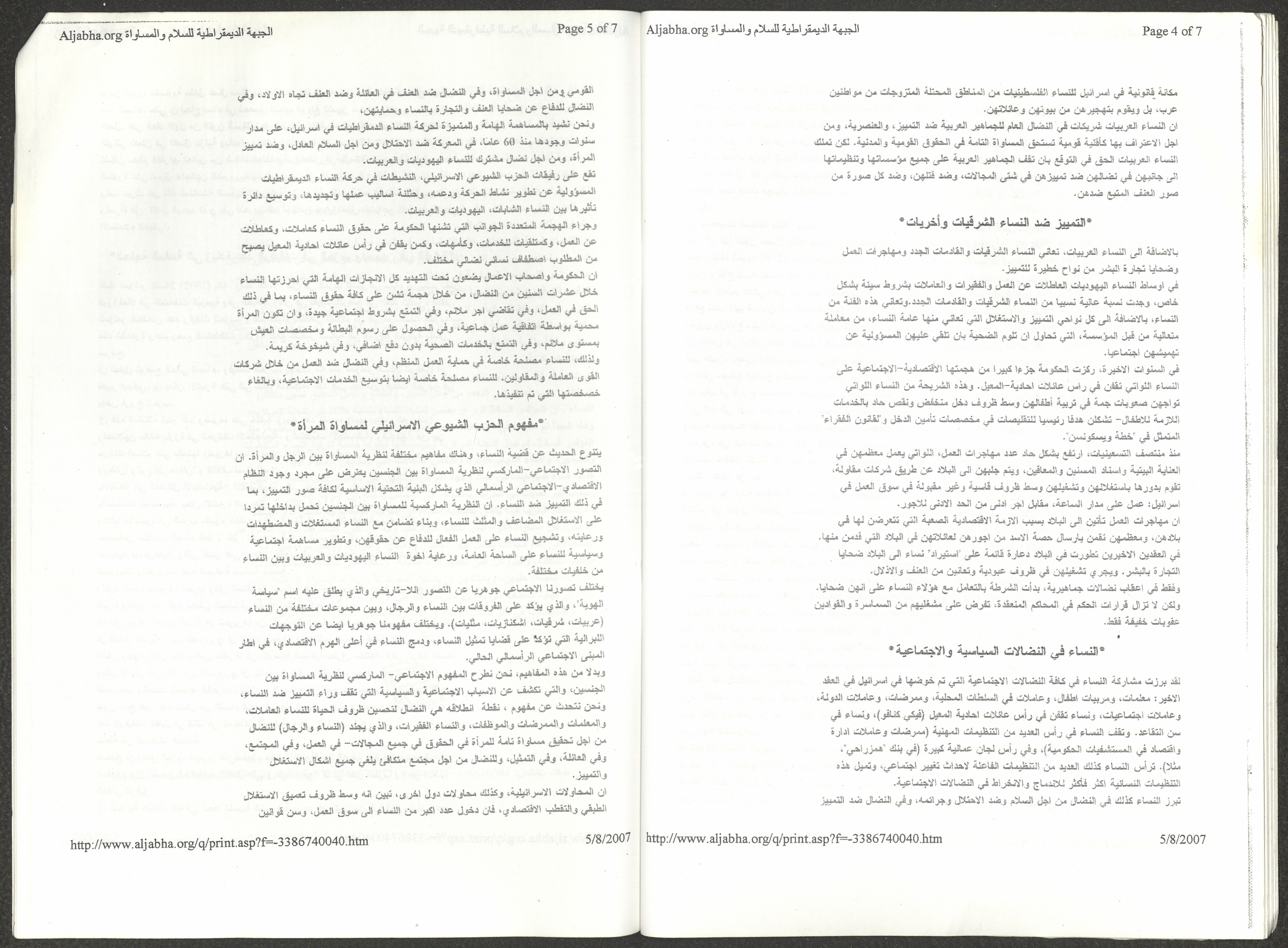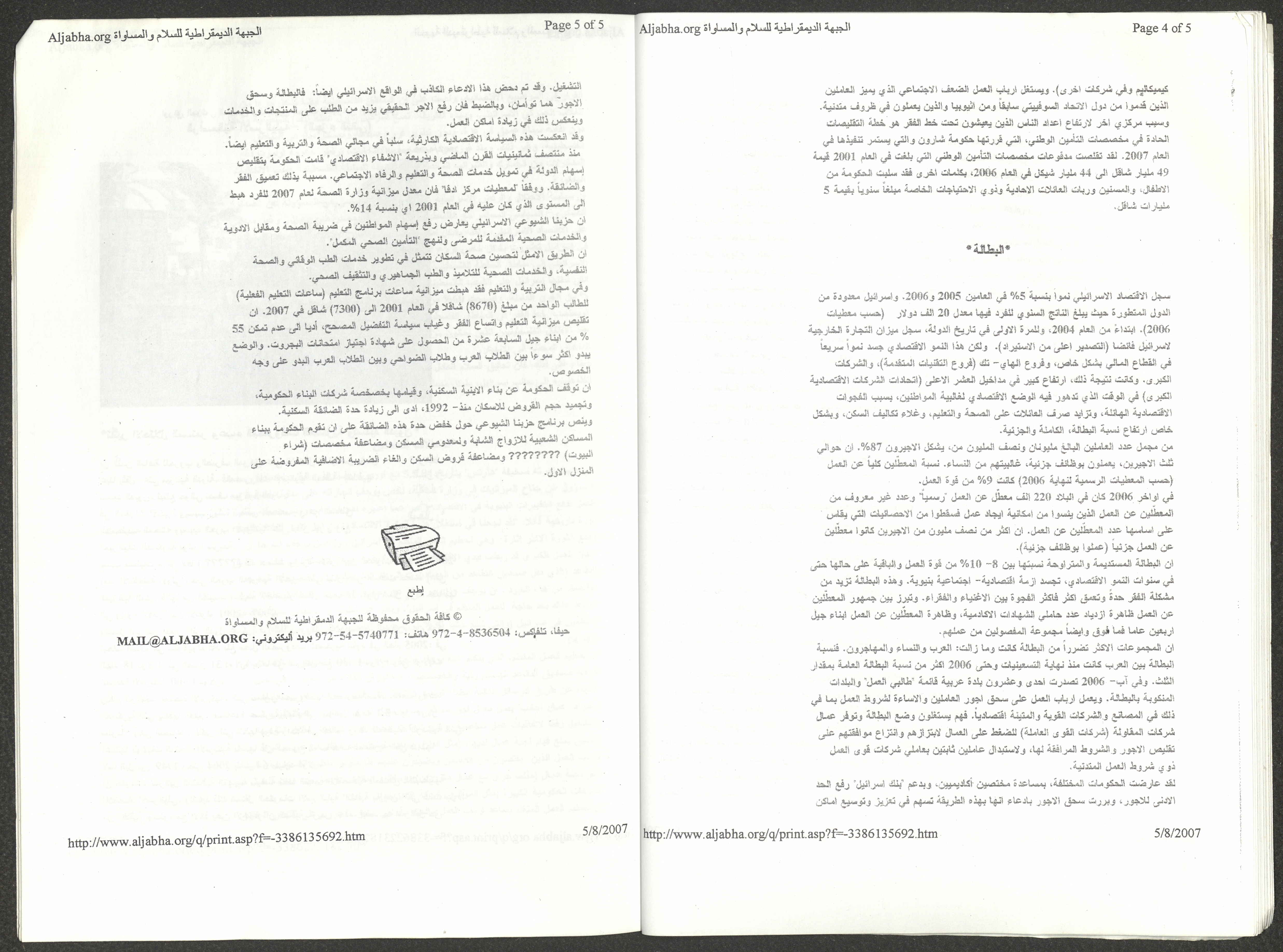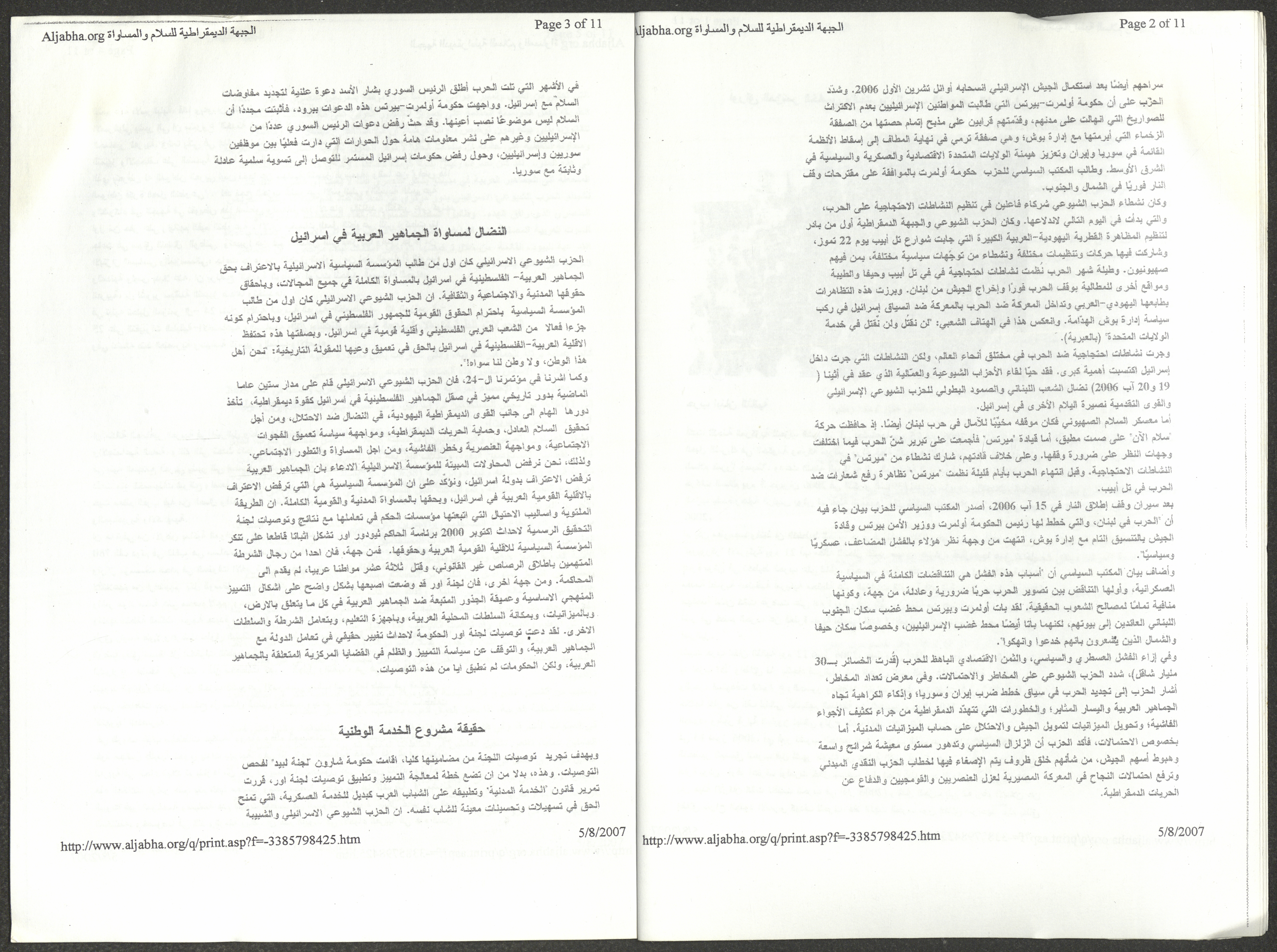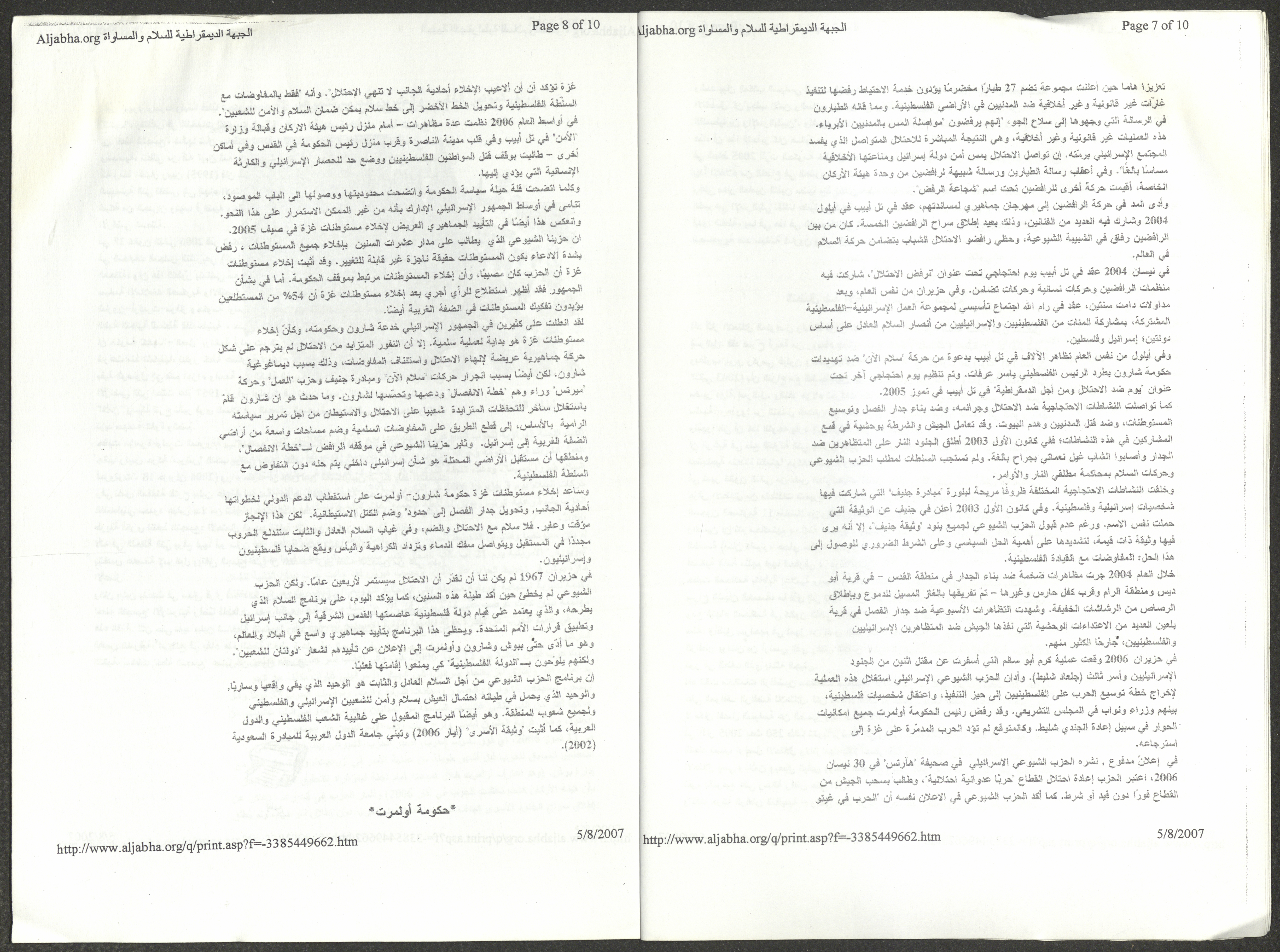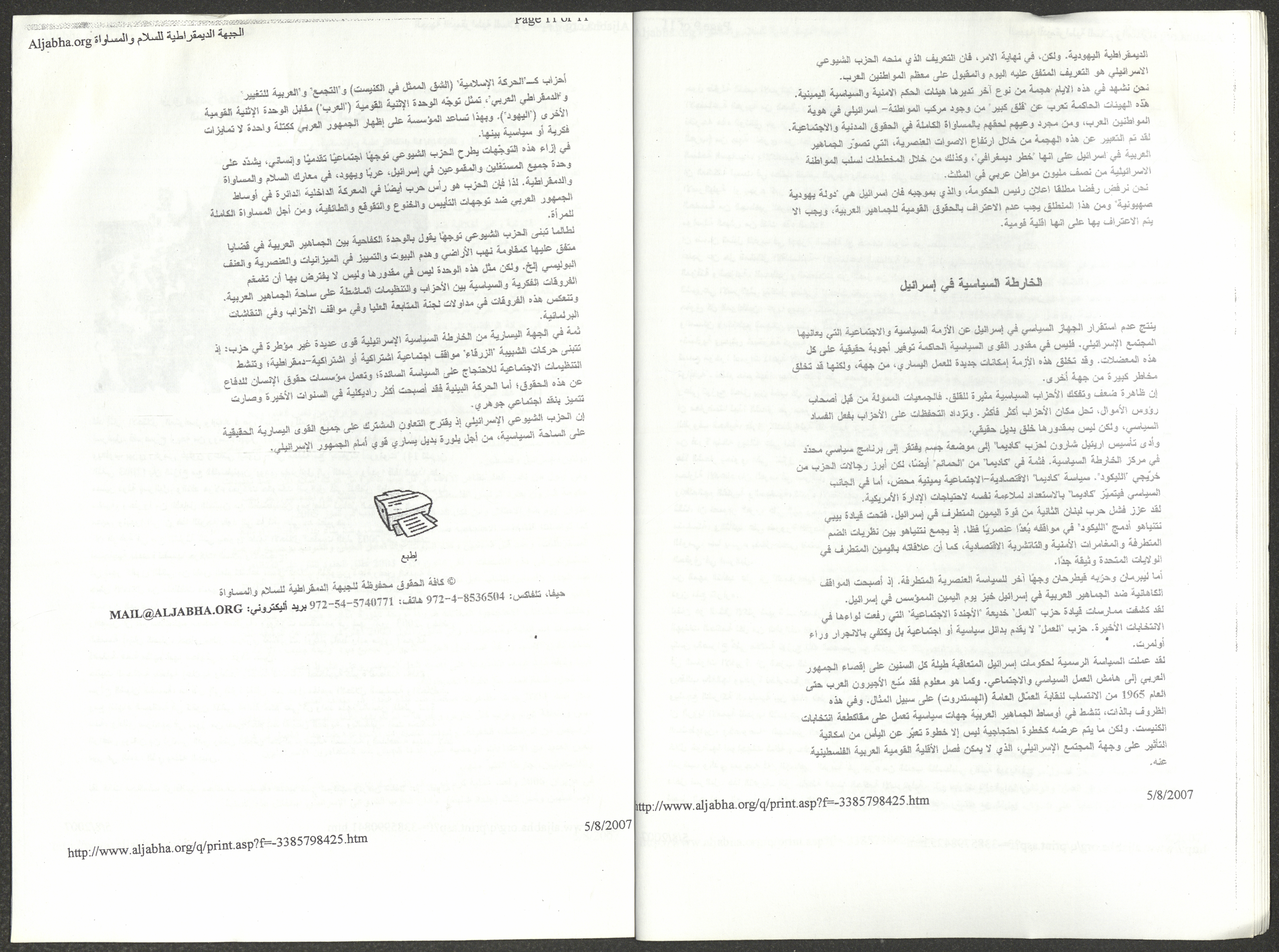 A five-page document that includes a report containing the most important theses of the twenty-fifth conference of the Israeli Communist Party, which will be held from 31 May to 2 June 2007, which was published by the Democratic Front for Peace and Equality in the al-Ittihad newspaper. The most important of which are the following: The globalization of big companies and fighting against it. Democratic changes in the world. The opposition of globalizing big companies in the world. Political developments since the 24th conference. Fighting against occupation and for peace.