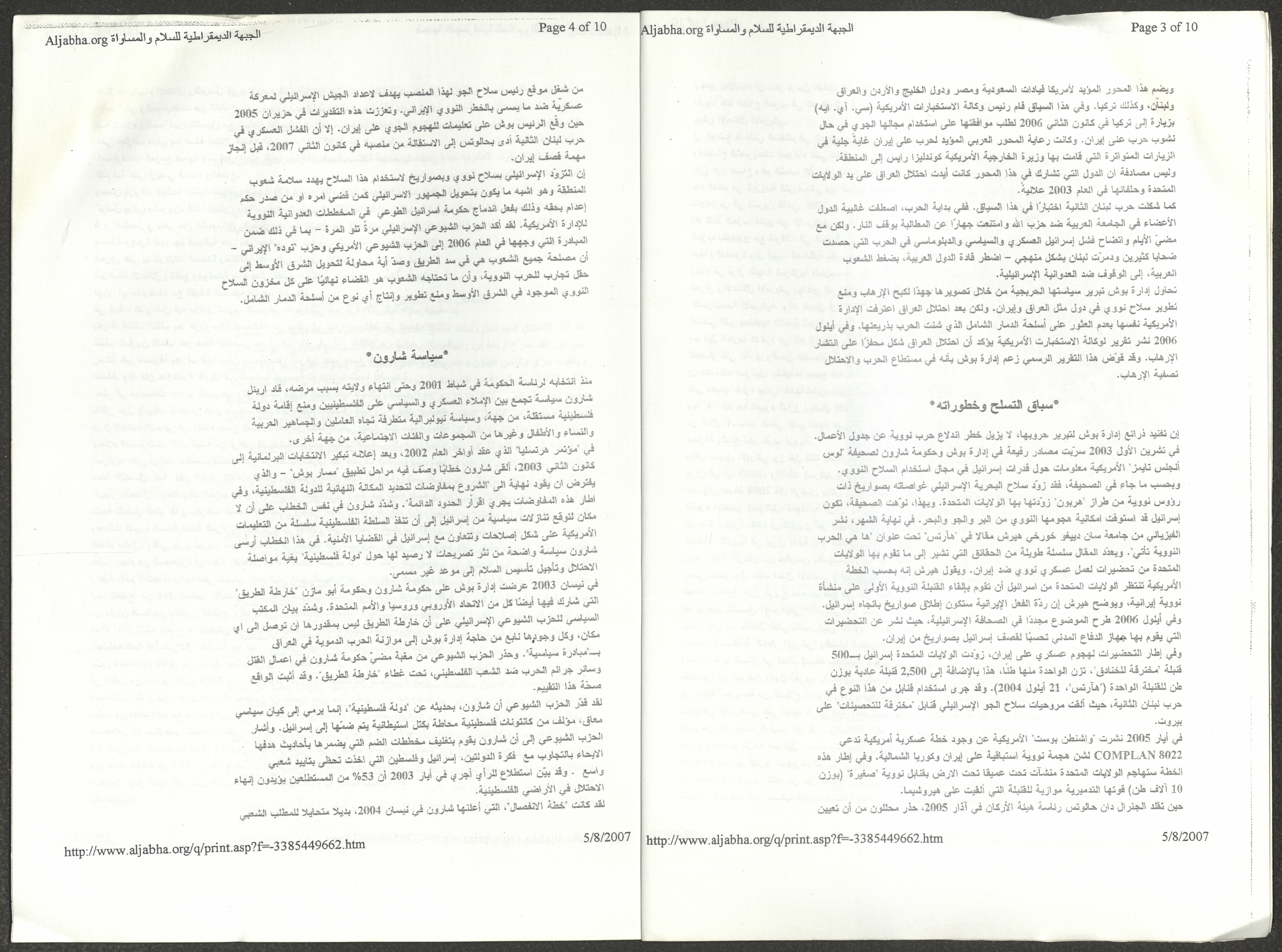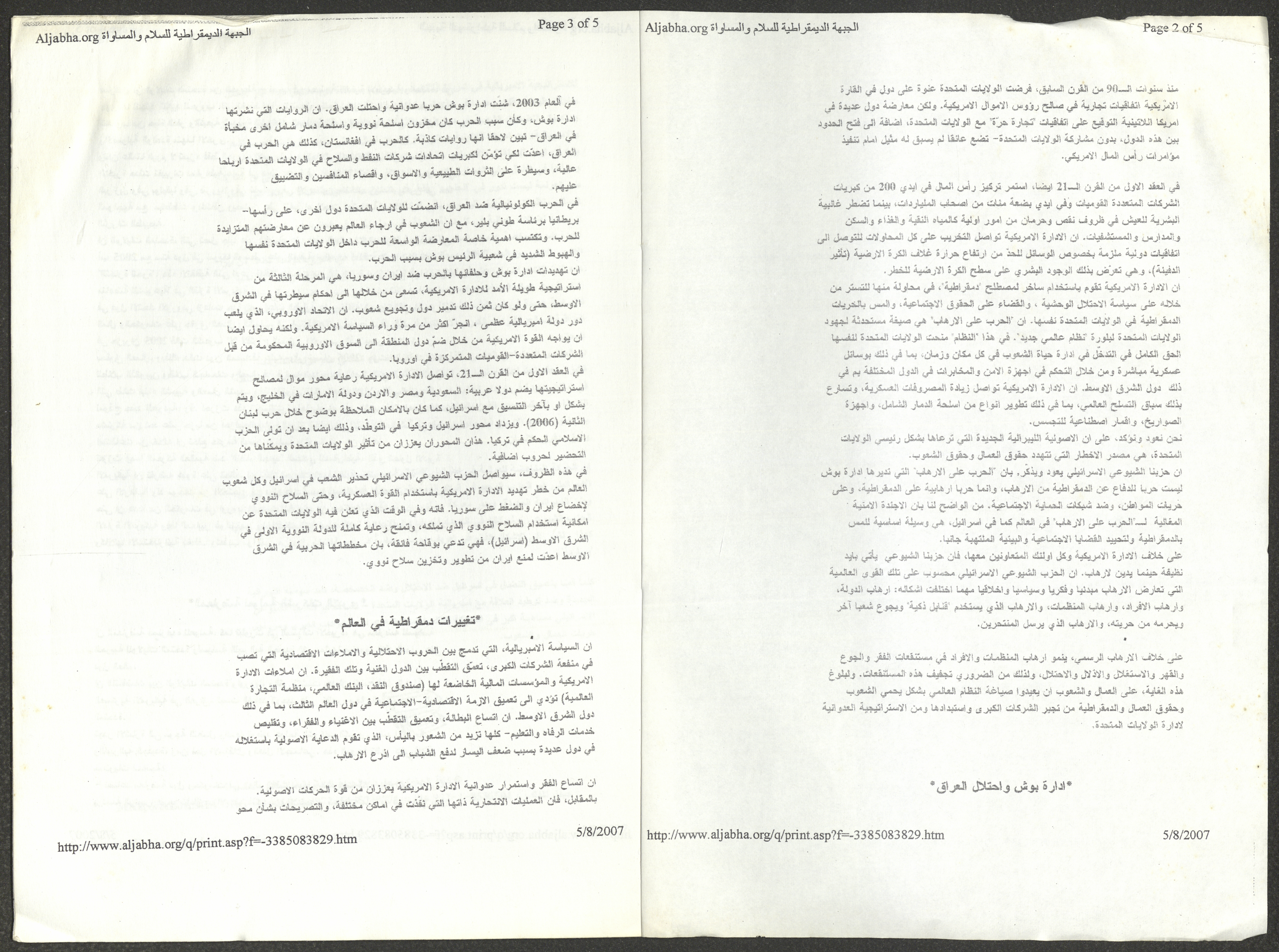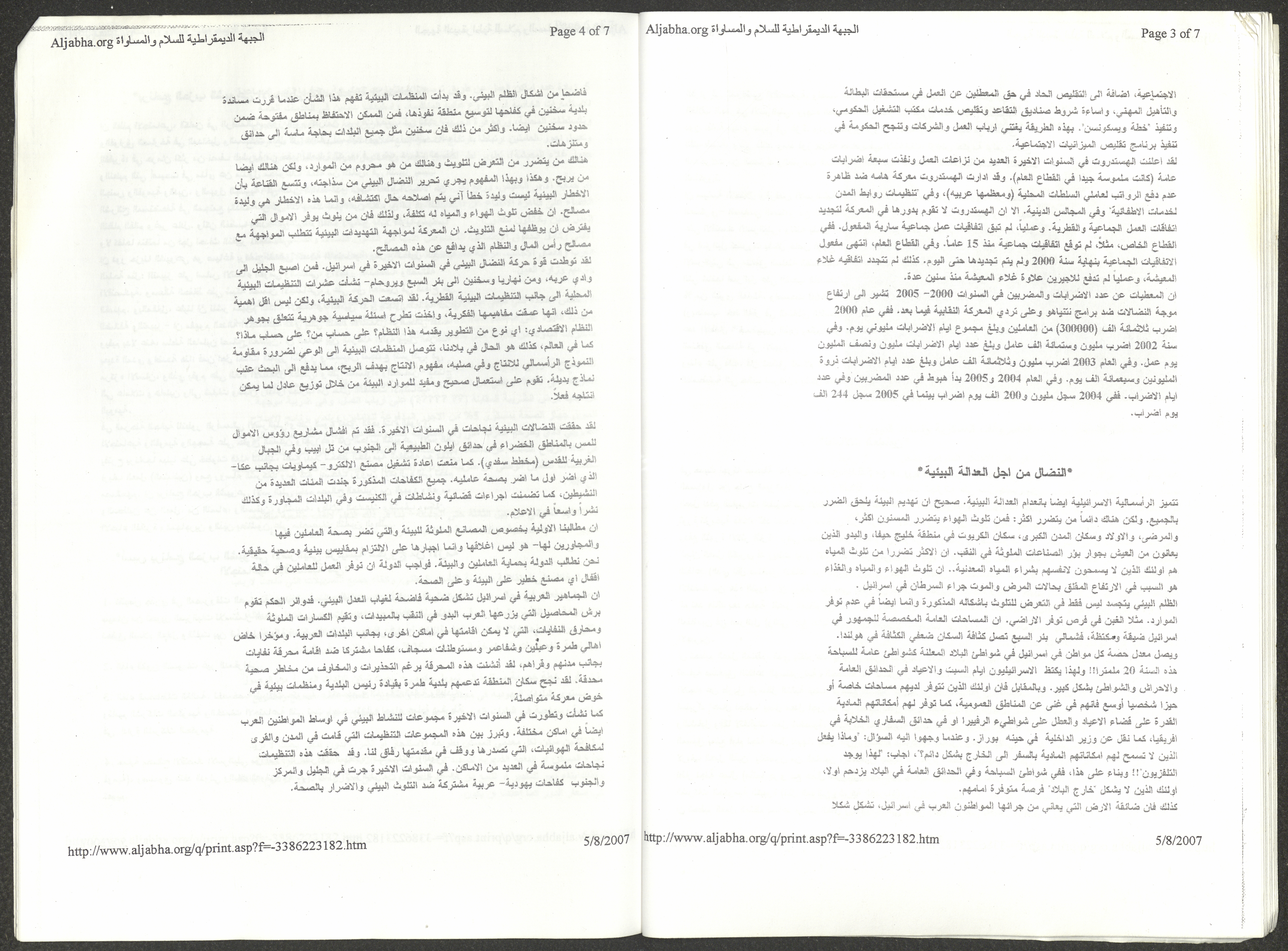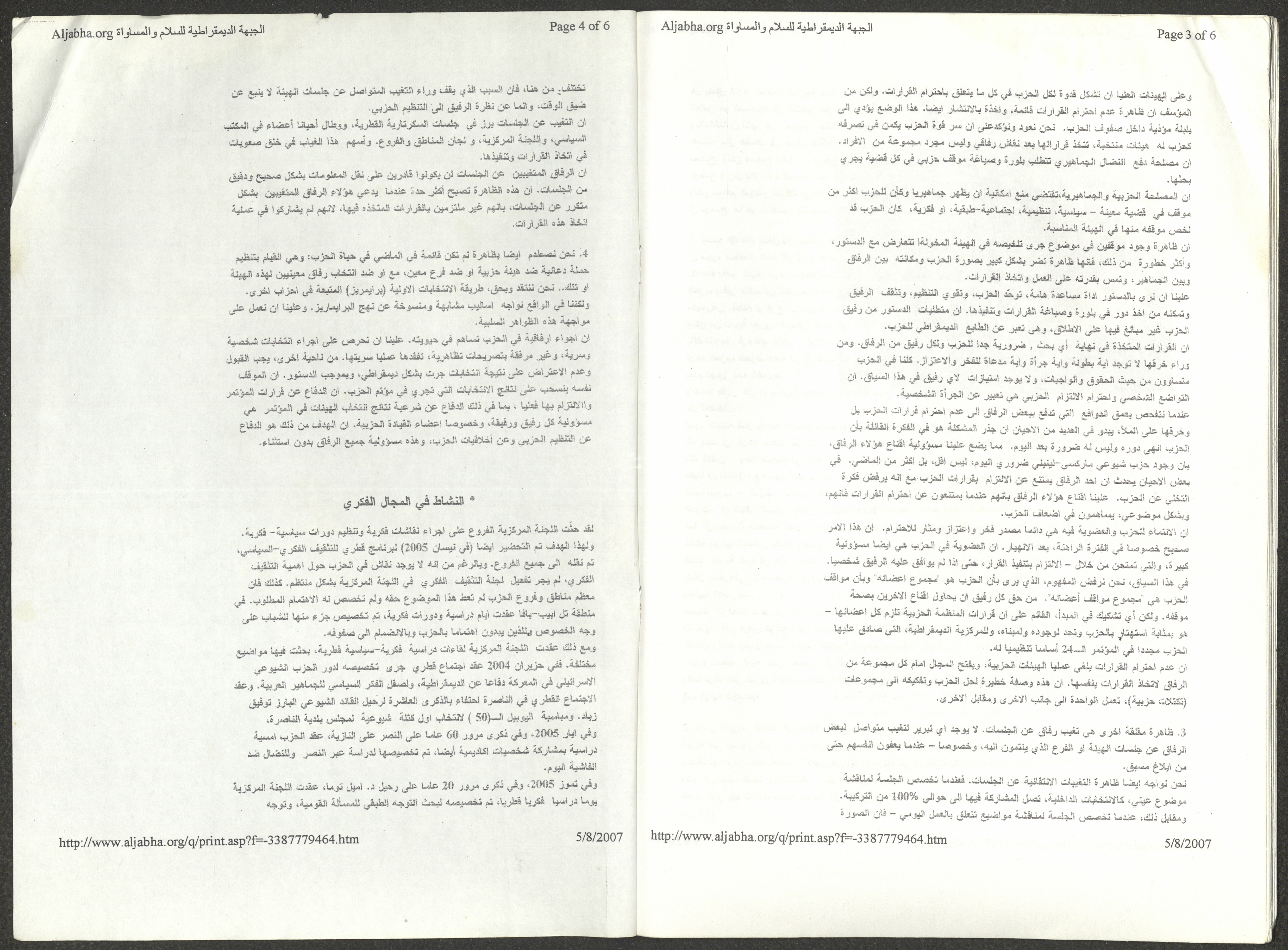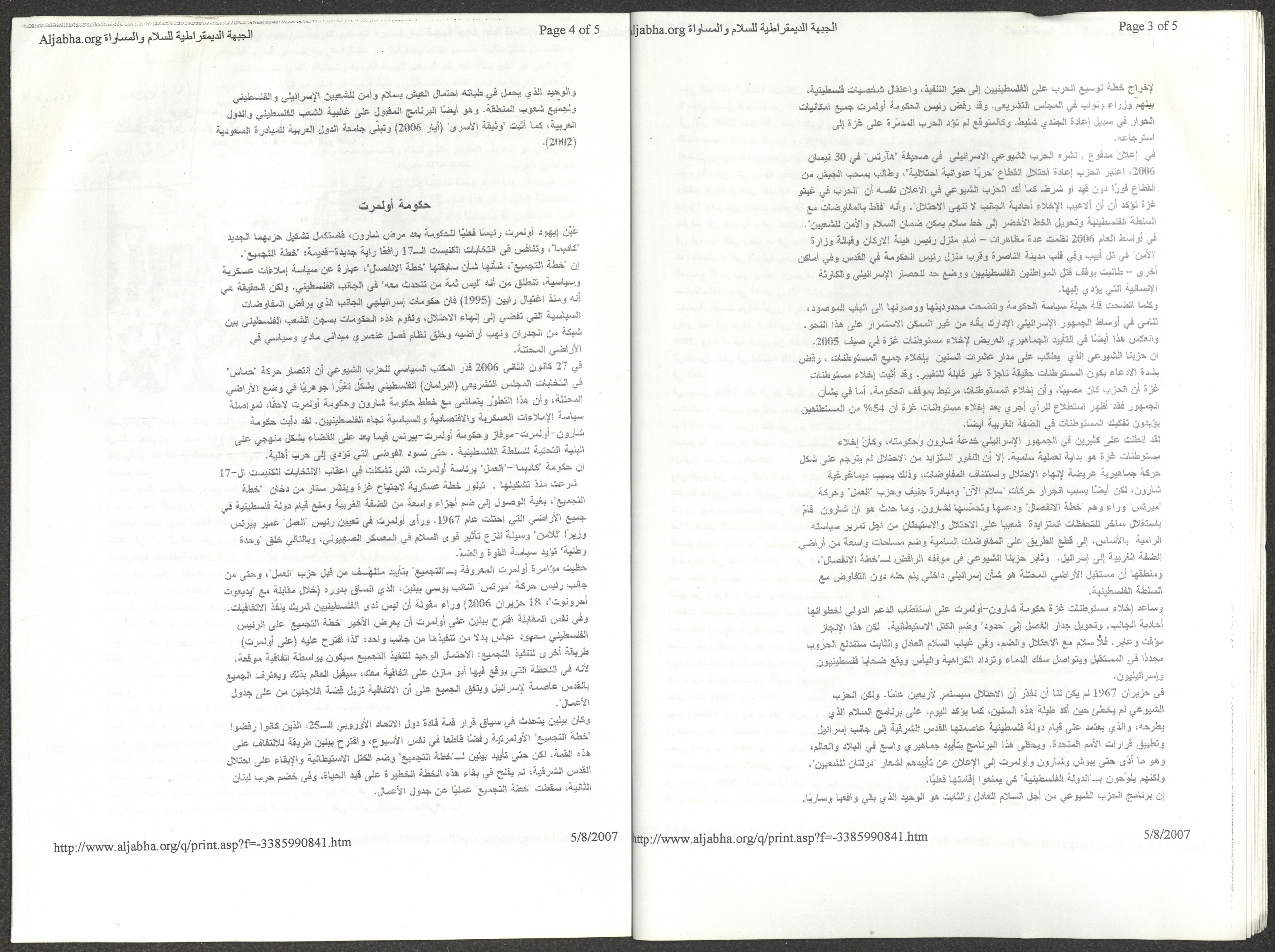 A five-page document that includes a report containing the most important theses of the twenty-fifth conference of the Israeli Communist Party, which will be held from 31 May to 2 June 2007, which was published by the Democratic Front for Peace and Equality in the al-Ittihad newspaper. The most important of which are the following: The globalization of big companies and fighting against it. Democratic changes in the world. The opposition of globalizing big companies in the world. Political developments since the 24th conference. Fighting against occupation and for peace.