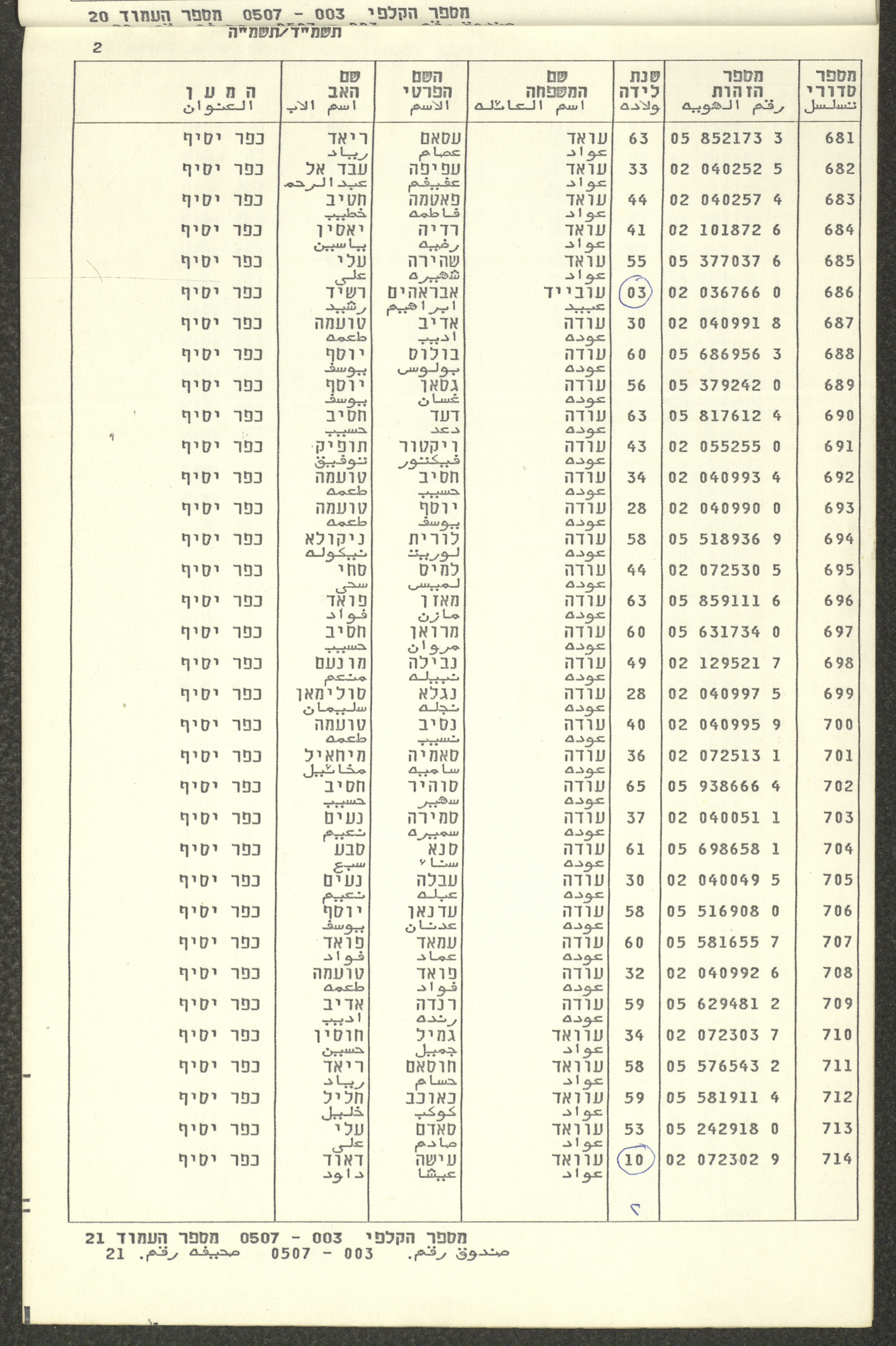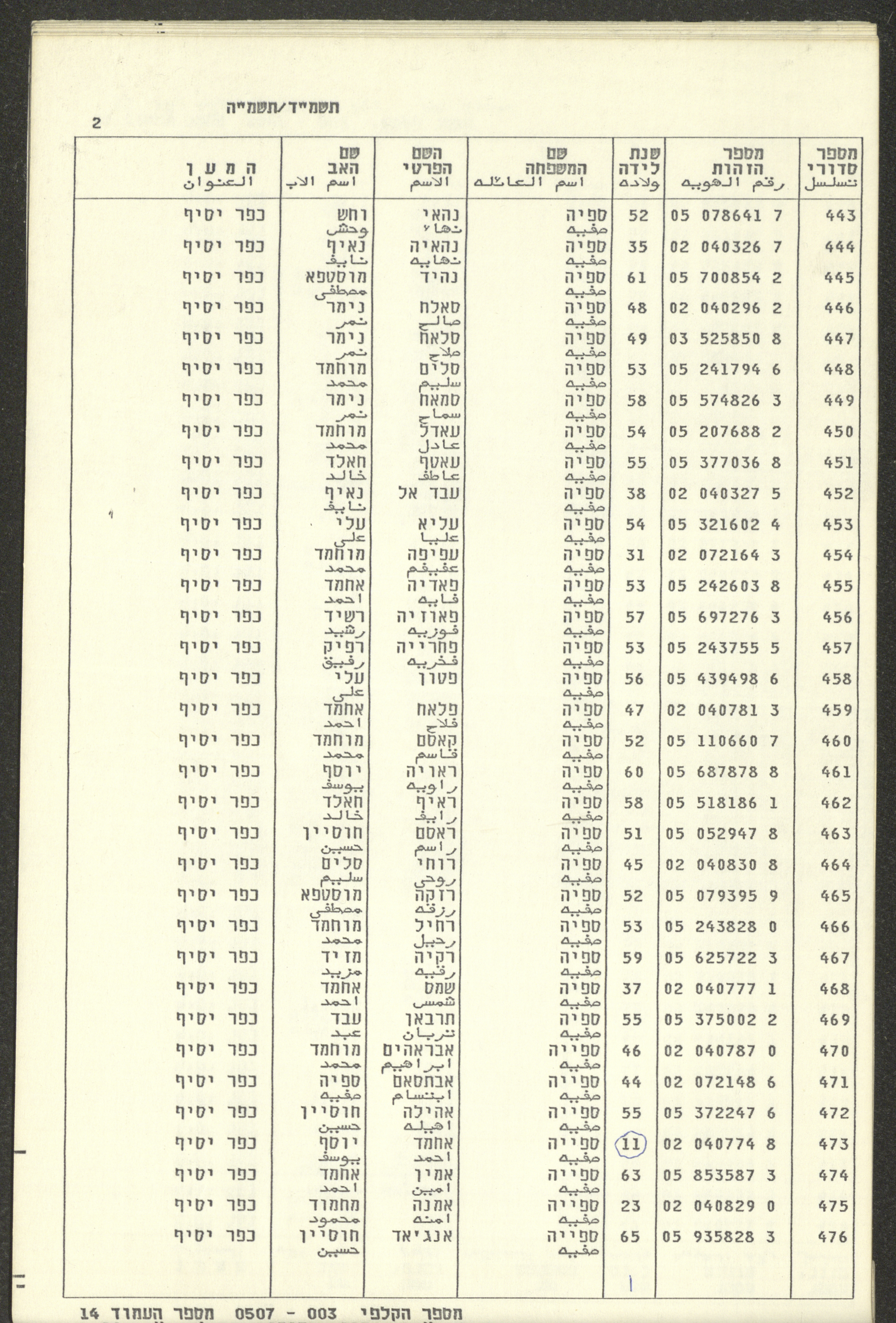 Issued under Article 37 of the 1969 Knesset Elections Law, An 18-page document that includes a photocopy of the voter register for the 1984-85 Knesset elections, including the names and identification numbers of people in the village of Kafr Yasif, Acre District. It also includes the ballot box number and the number of people entitled to vote, which amounted to 812 voters.