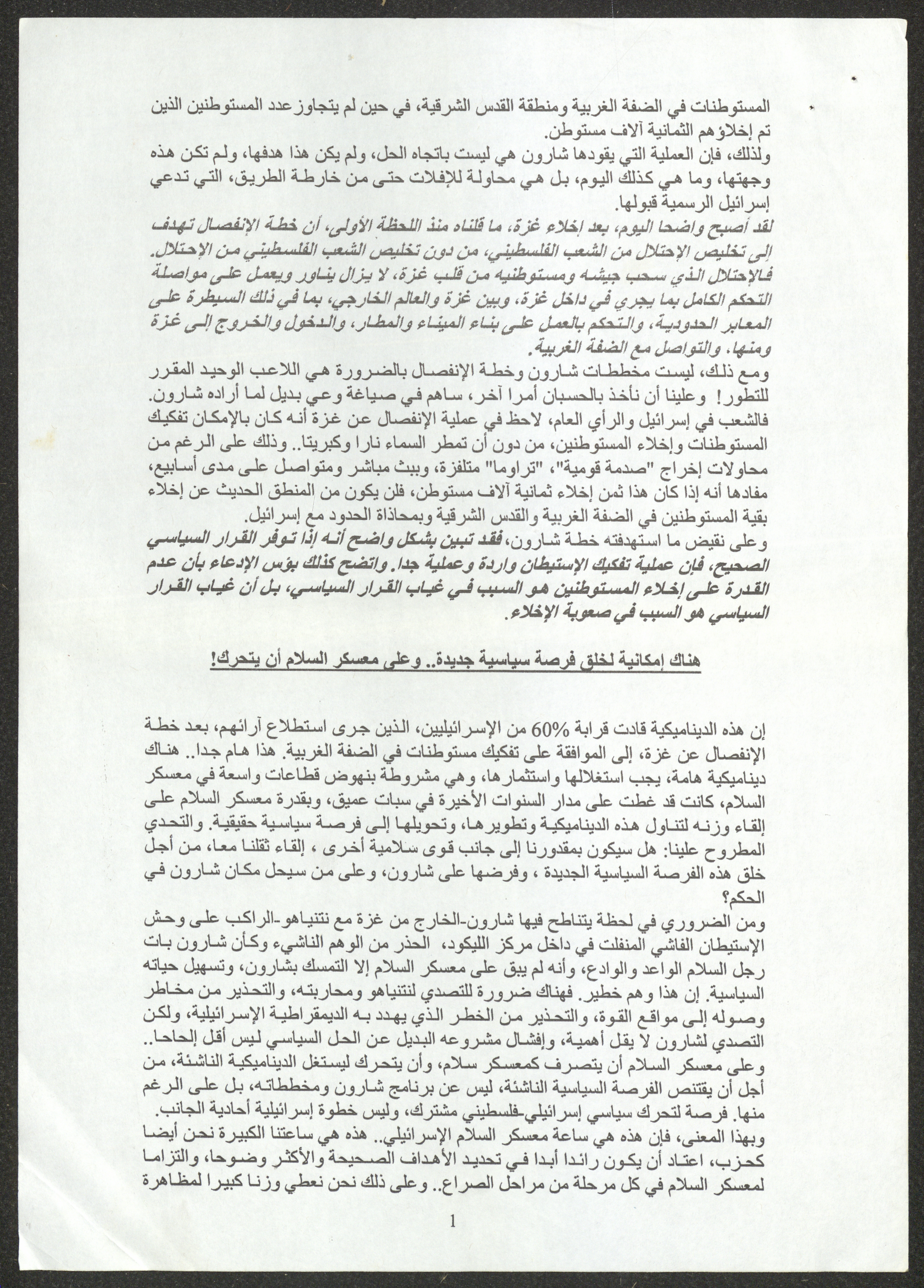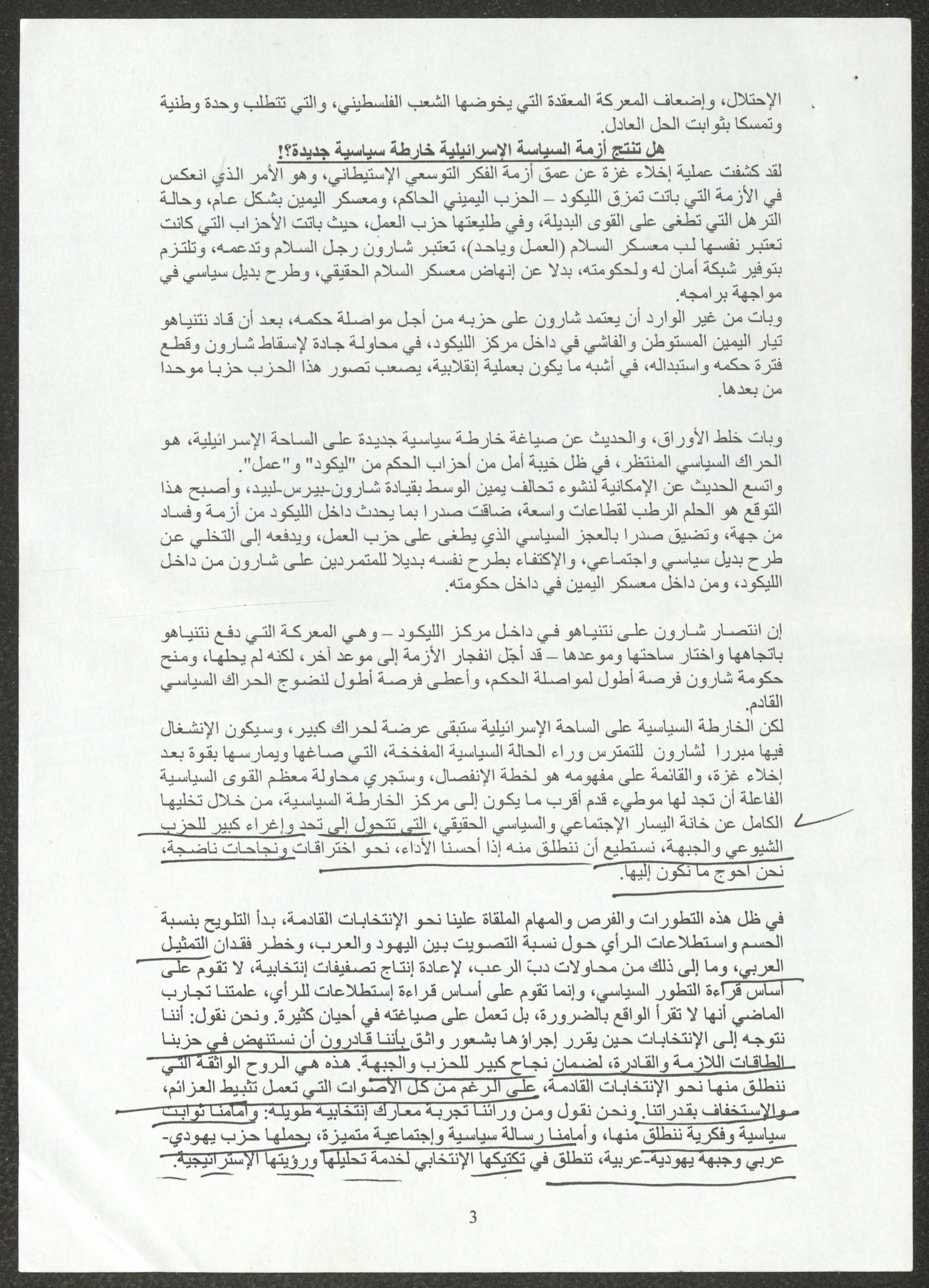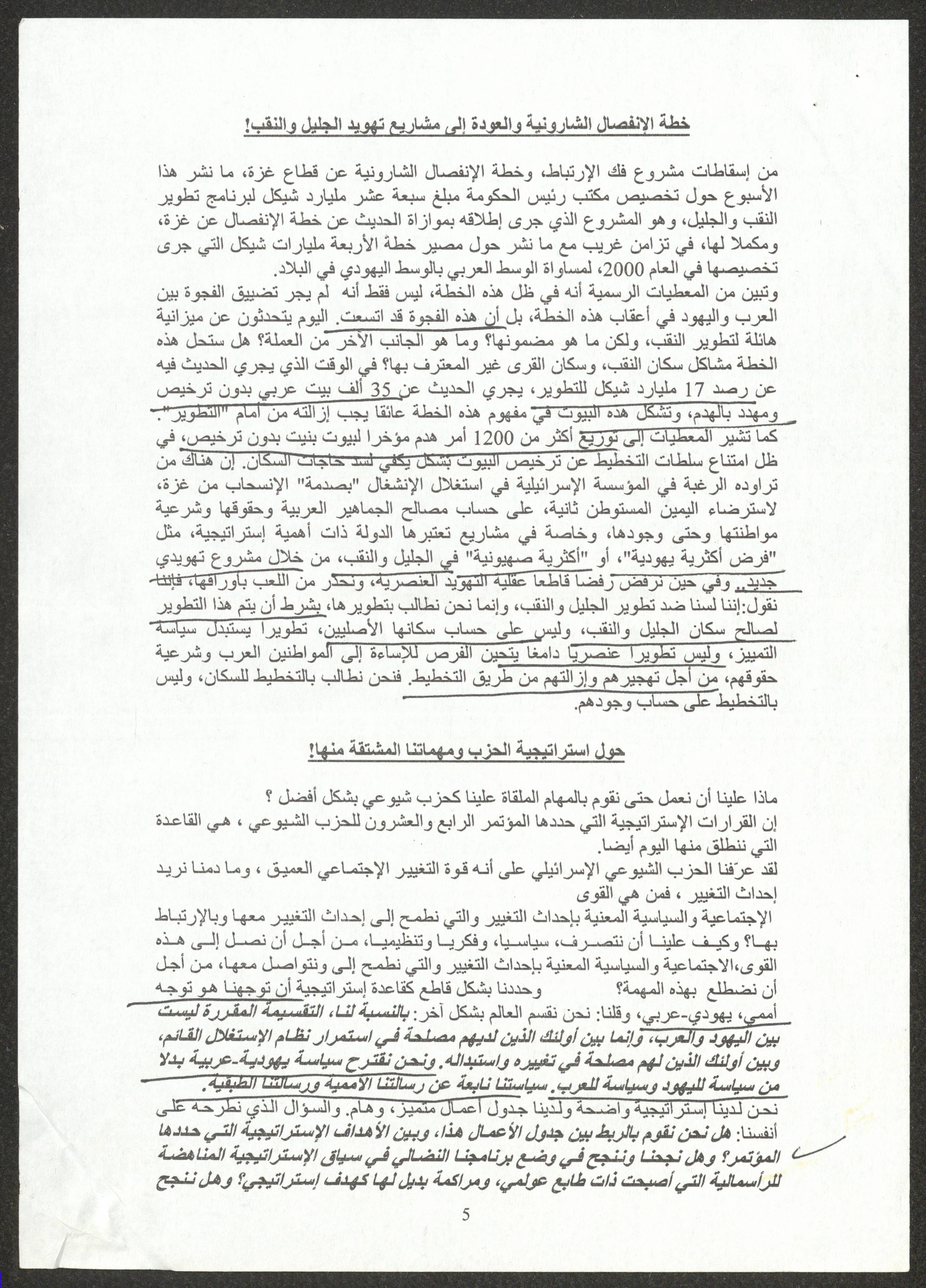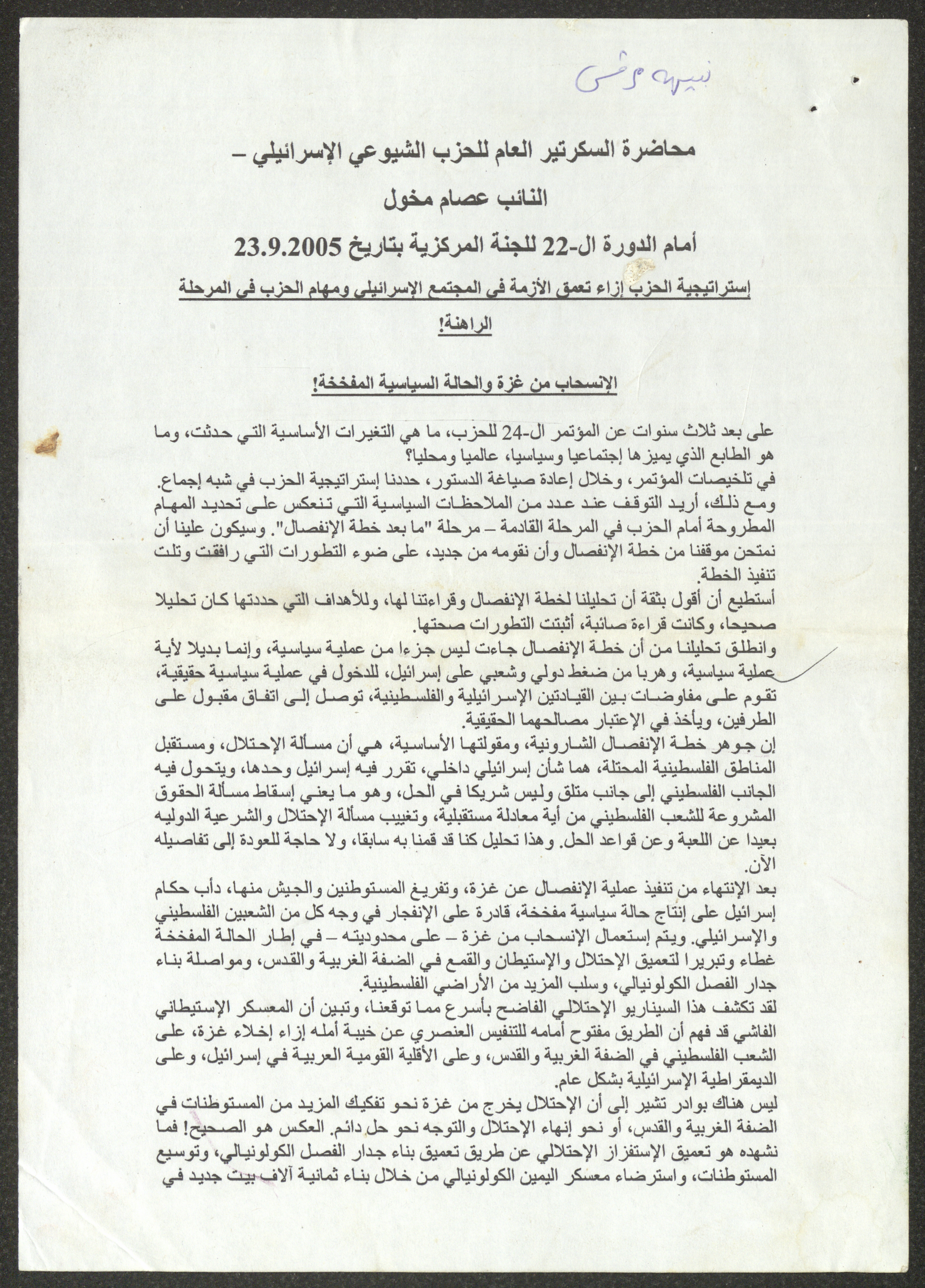 نسخة عن محاضرة عصام المخول، السكرتير العام للحزب الشيوعي الإسرائيلي، أمام الدورة 22 للجنة المركزية بتاريخ 23 أيول 2005، حول استراتيجيات الحزب إزاء تعمق الأزمة في المجتمع الإسرائيلي ومهام الحزب خلال تلك المرحلة.