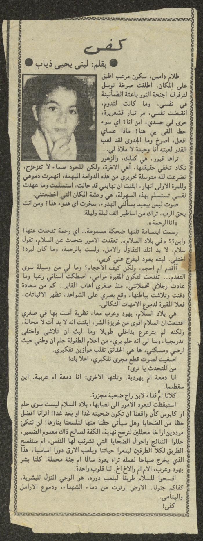 قصاصة من جريدة تتضمن خاطرة بعنوان "كفى" بقلم لبنى يحيى ذياب، تصف فيها أمل رغبتها بالسلام، وتصف أن الألم واحد سواء كنت يهوديًا أم عربيًا، لذلك لا بد من اتخاذ الرحمة والوحدة طريقًا لهذا السلام.