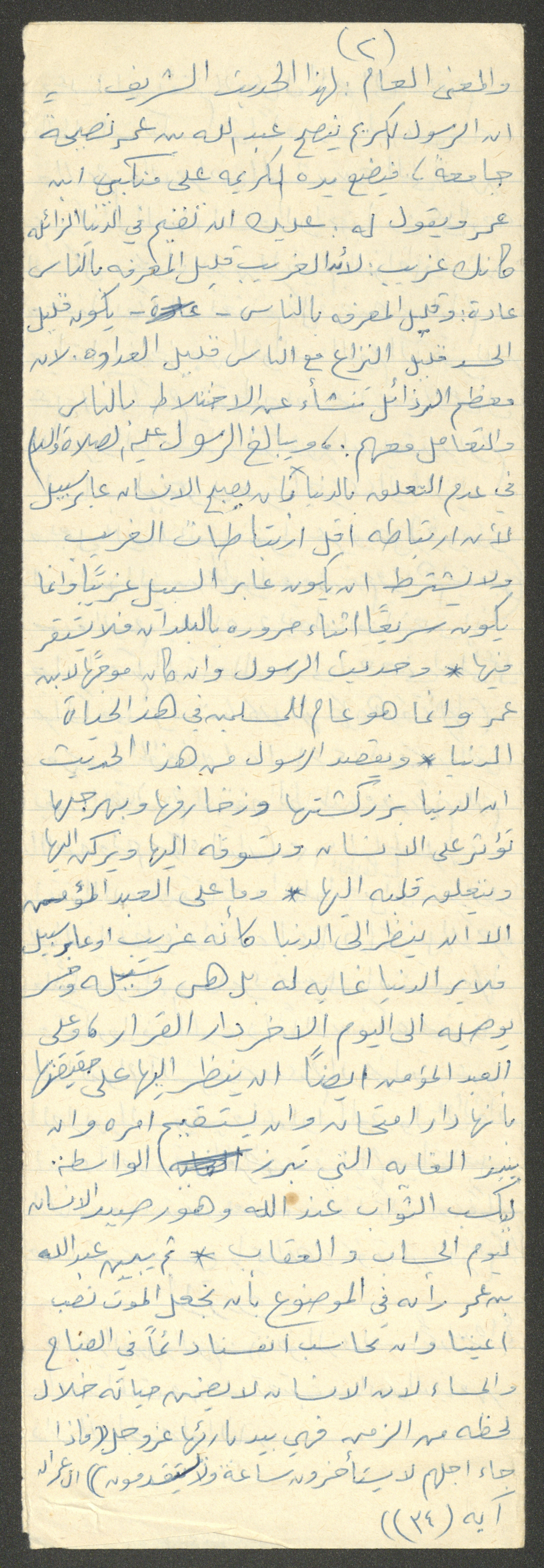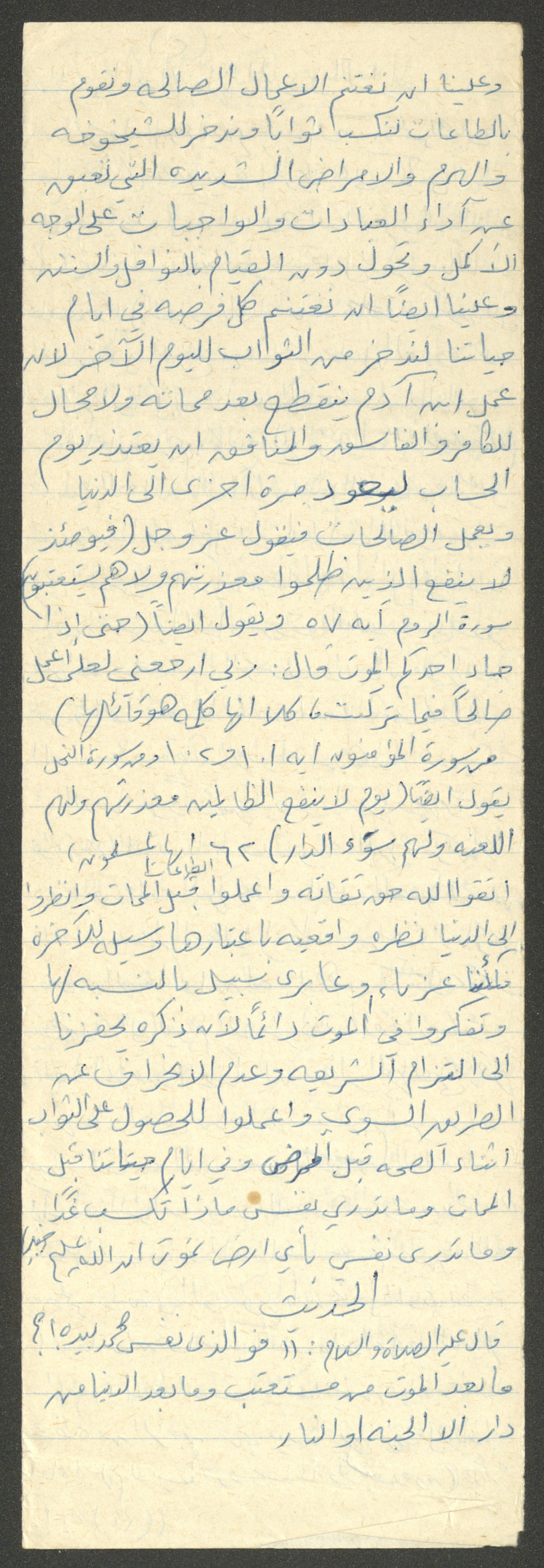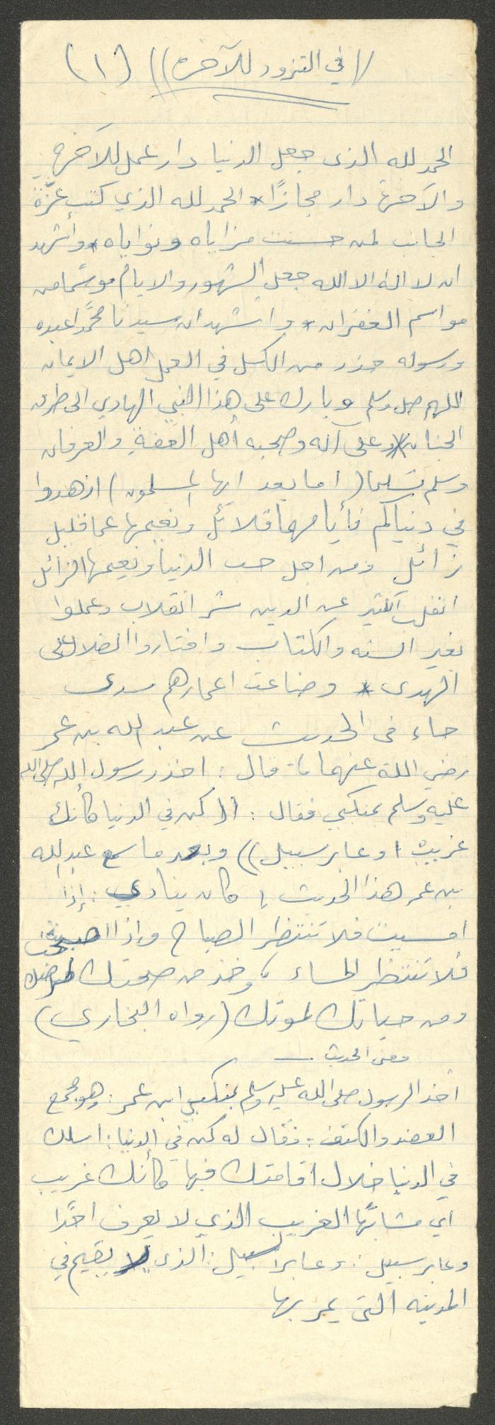 Handwritten, this document shows a Friday Khutbah titled "In Providing for the Hereafter" given by Imam Marouf Shtayyeh at a mosque in the village of Salem to the northeast of Nablus in the 1970s, which he began by praising Allah and mentioned the importance of acts of worship, holding on to deeds that will lead to paradise and leaving sinning habits, as he supported his speech with several Quran verses and Hadiths.