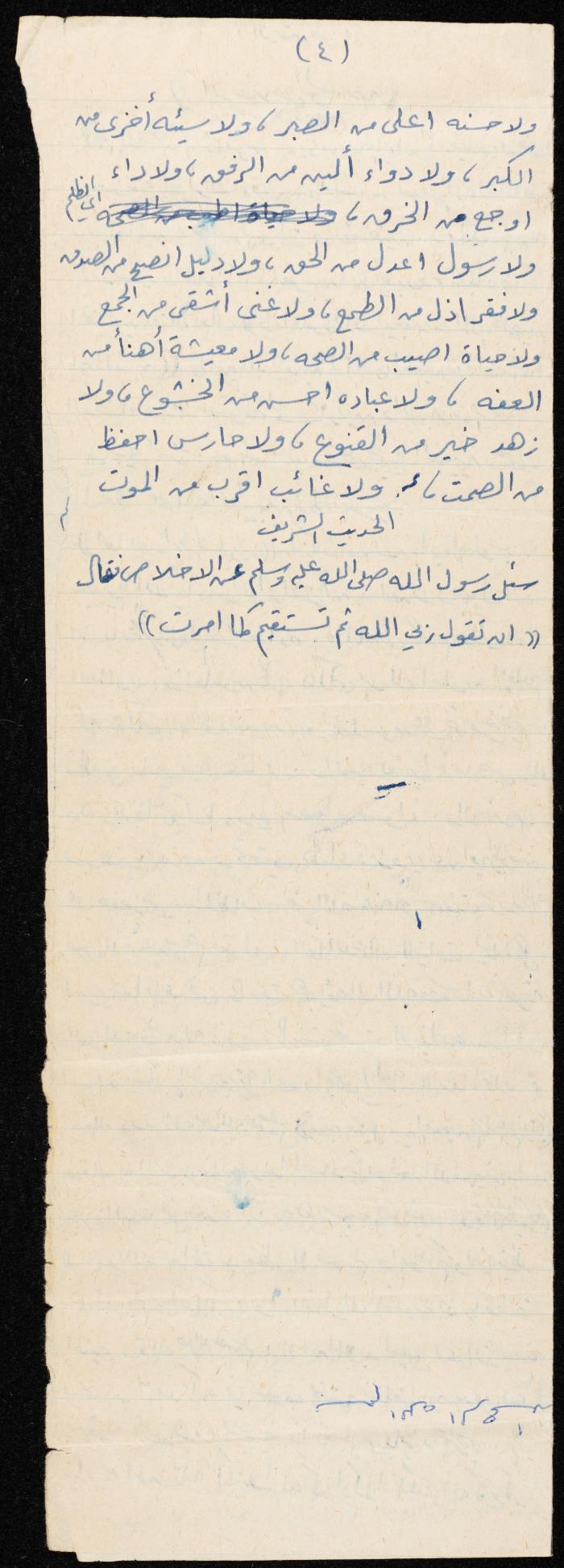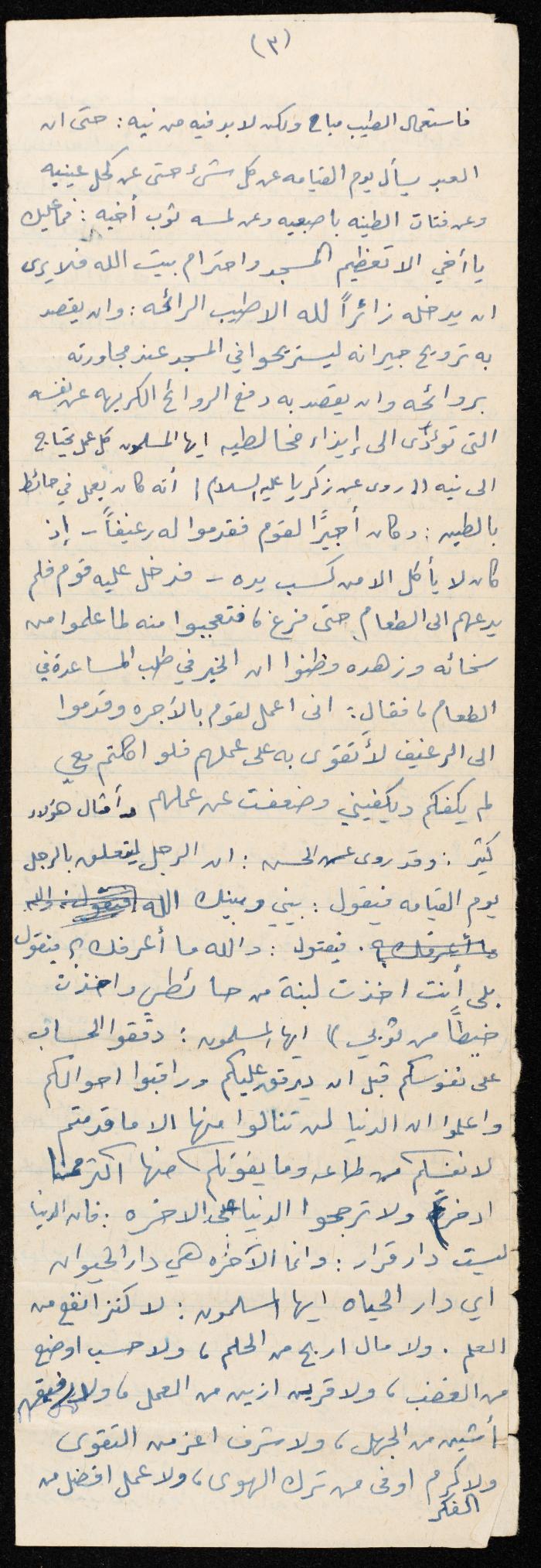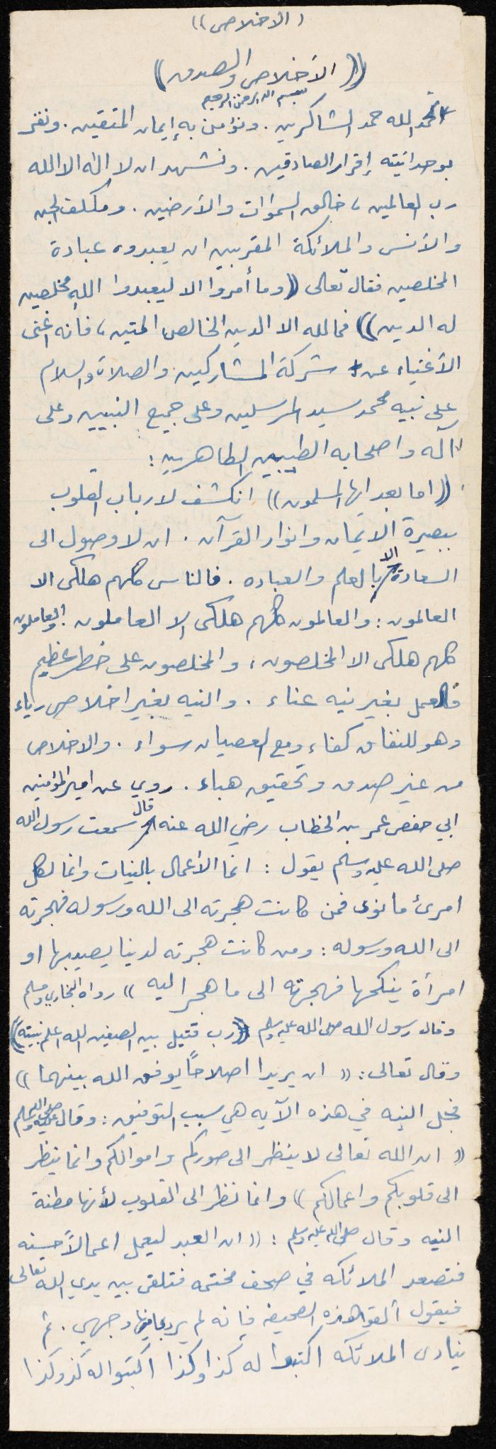 وثيقة مكتوبة بخط اليد تتضمن خطبة يوم الجمعة بعنوان "الإخلاص والصدق"، ألقاها الإمام معروف اشتية في مسجد في قرية سالم شمال شرق نابلس في ثمانينيات القرن العشرين. بدأها بحمد الله، ثم تحدث حول سعادة الإنسان التي لن يصلها إلا بالعلم والعمل، كما تحدث عن أهمية إخلاص النية، مدعمًا خطبته بعدد من الآيات القرآنية والأحاديث النبوية.