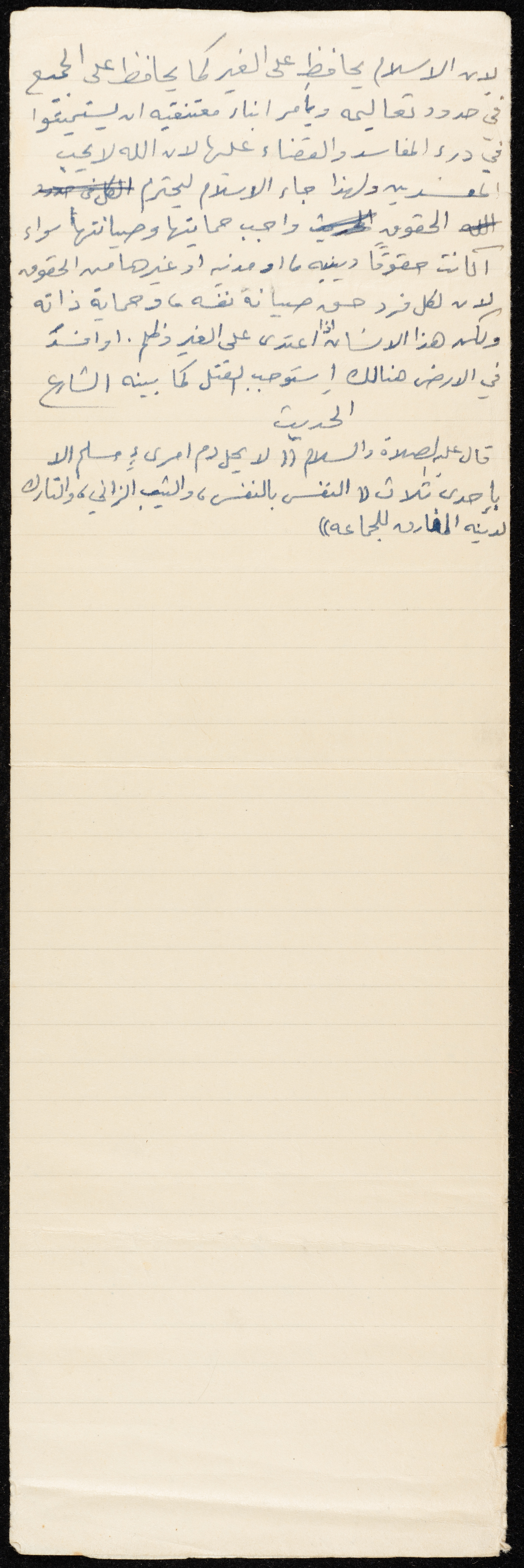 Handwritten, this document shows an untitled Friday Khutbah given by Imam Marouf Shtayyeh at a mosque in the village of Salem to the northeast of Nablus in the 1970s, in which he began by praising Allah, then moved to talk about the importance of self-defence and its legitimacy in Islam, supporting his Khutbah with several Quran verses and Hadiths.