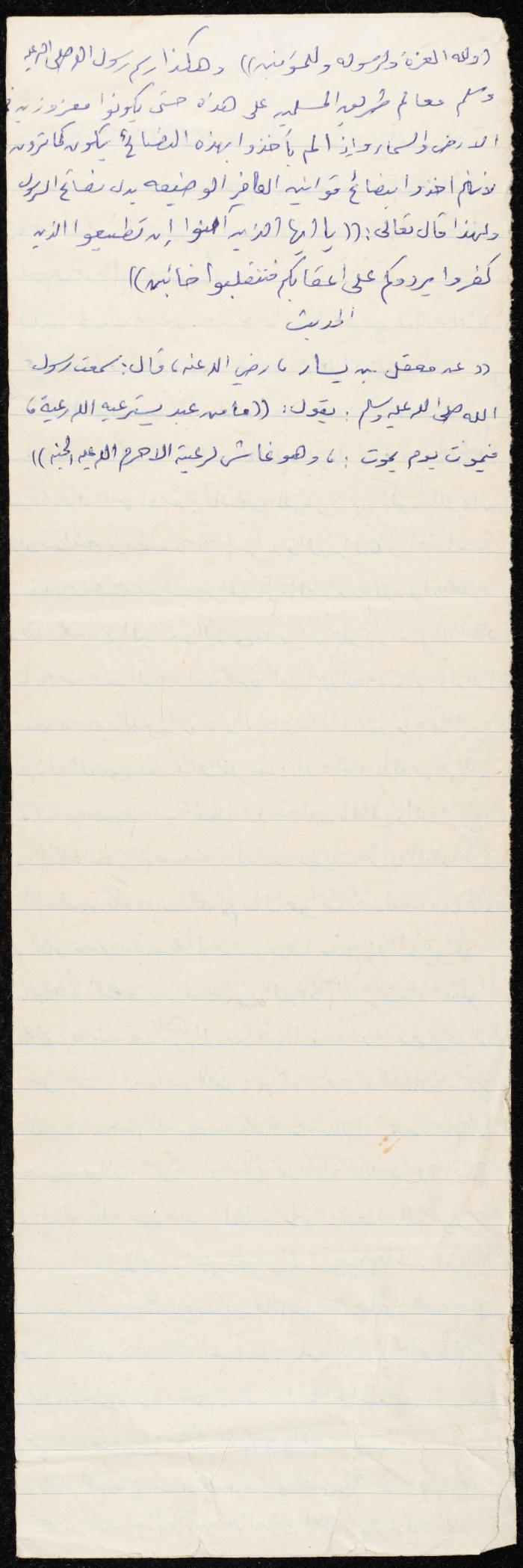 وثيقة مكتوبة بخط اليد تتضمن خطبة يوم الجمعة بعنوان "القرآن تذكرة للطائفة الغافلة"، ألقاها الإمام معروف اشتية في مسجد في قرية سالم شمال شرق نابلس في ثمانينيات القرن العشرين. بدأها بحمد الله وتحدث فيها عن أهمية النصيحة في الإسلام، كما تحدث عن تلاوة القرآن الكريم وعن أهميته وإعجازه، مدعمًا خطبته بعدد من الآيات القرآنية والأحاديث النبوية.