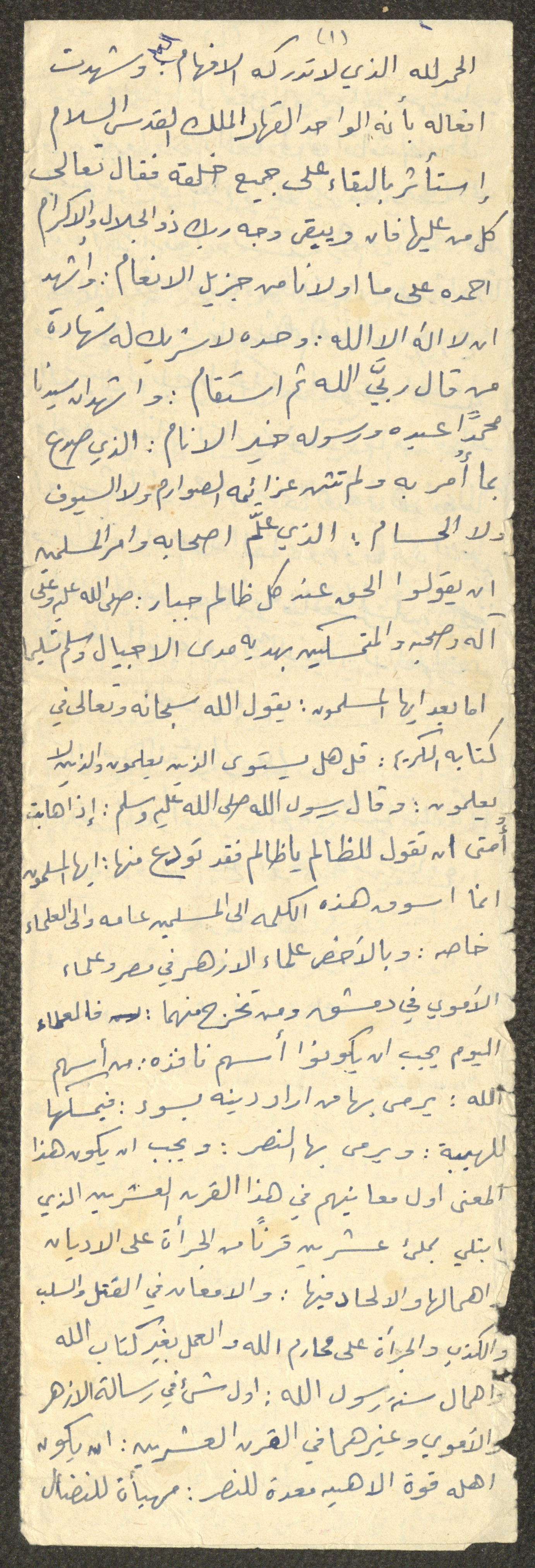 Handwritten, this document shows an untitled Friday Khutbah given by Imam Marouf Shtayyeh at a mosque in the village of Salem to the northeast of Nablus in the 1980s, in which he began by praising Allah and talked about the status of scholars and science in Islam, especially religious scholars, stressing that they should be influential and reformers in societies, where he supported his Khutbah with Quran verses and Hadiths.