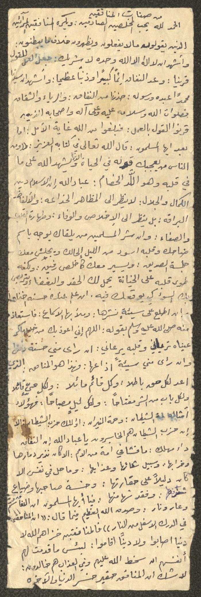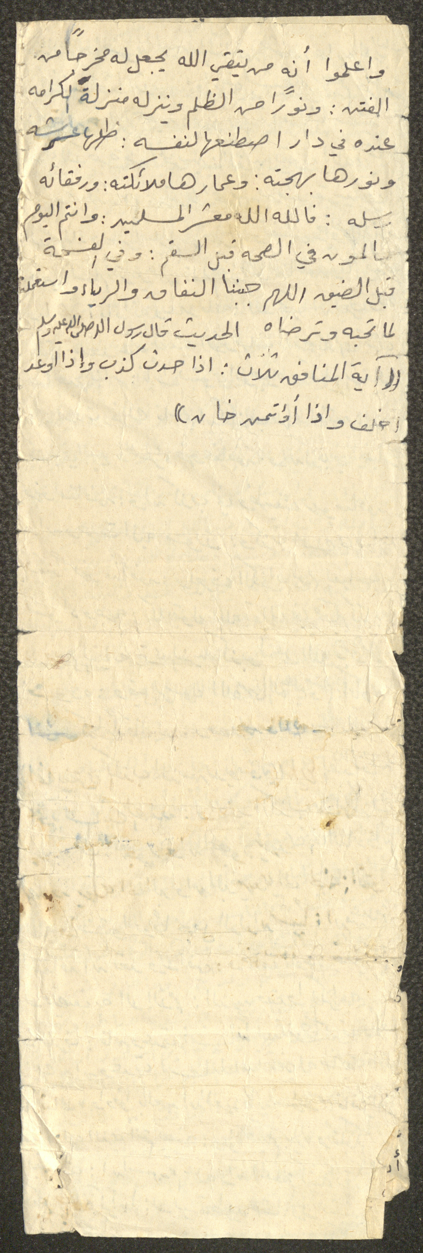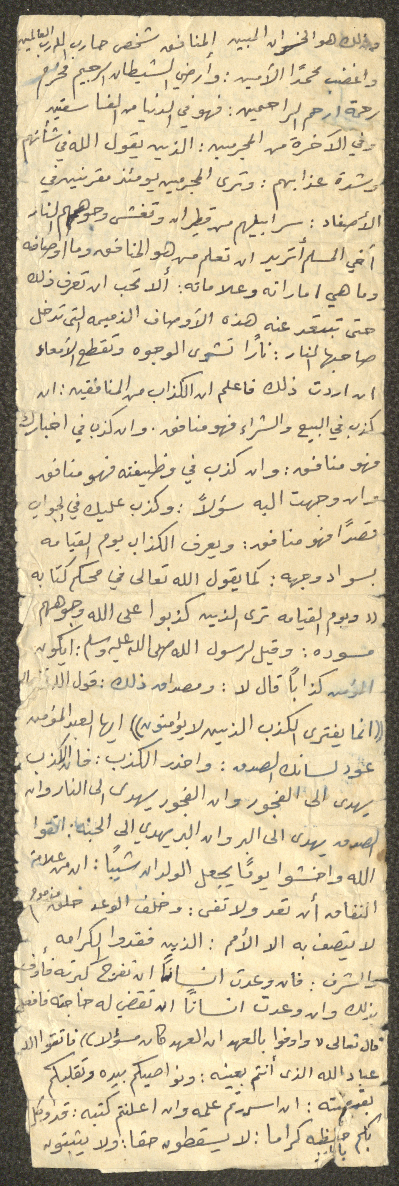 وثيقة مكتوبة بخط اليد تتضمن خطبة يوم الجمعة بعنوان "من صفات المنافقين"، ألقاها الإمام معروف اشتية في مسجد في قرية سالم شمال شرق نابلس في سبعينيات القرن العشرين. بدأها بحمد الله وتحدث فيها عن المنافقين وصفاتهم وعقوبتهم، مدعمًا خطبته بعدد من الآيات القرآنية والأحاديث النبوية.