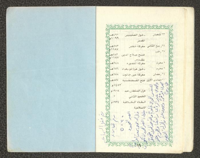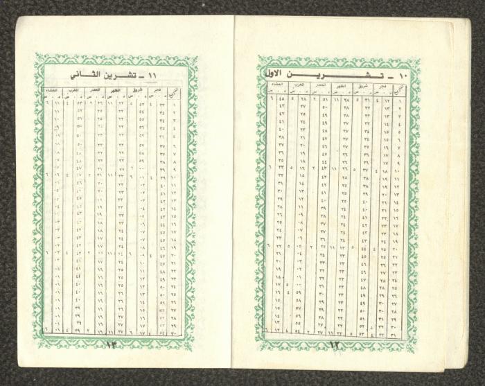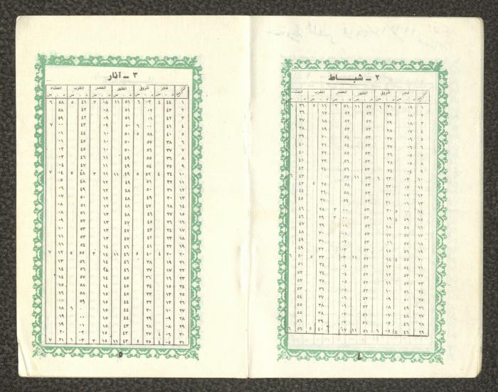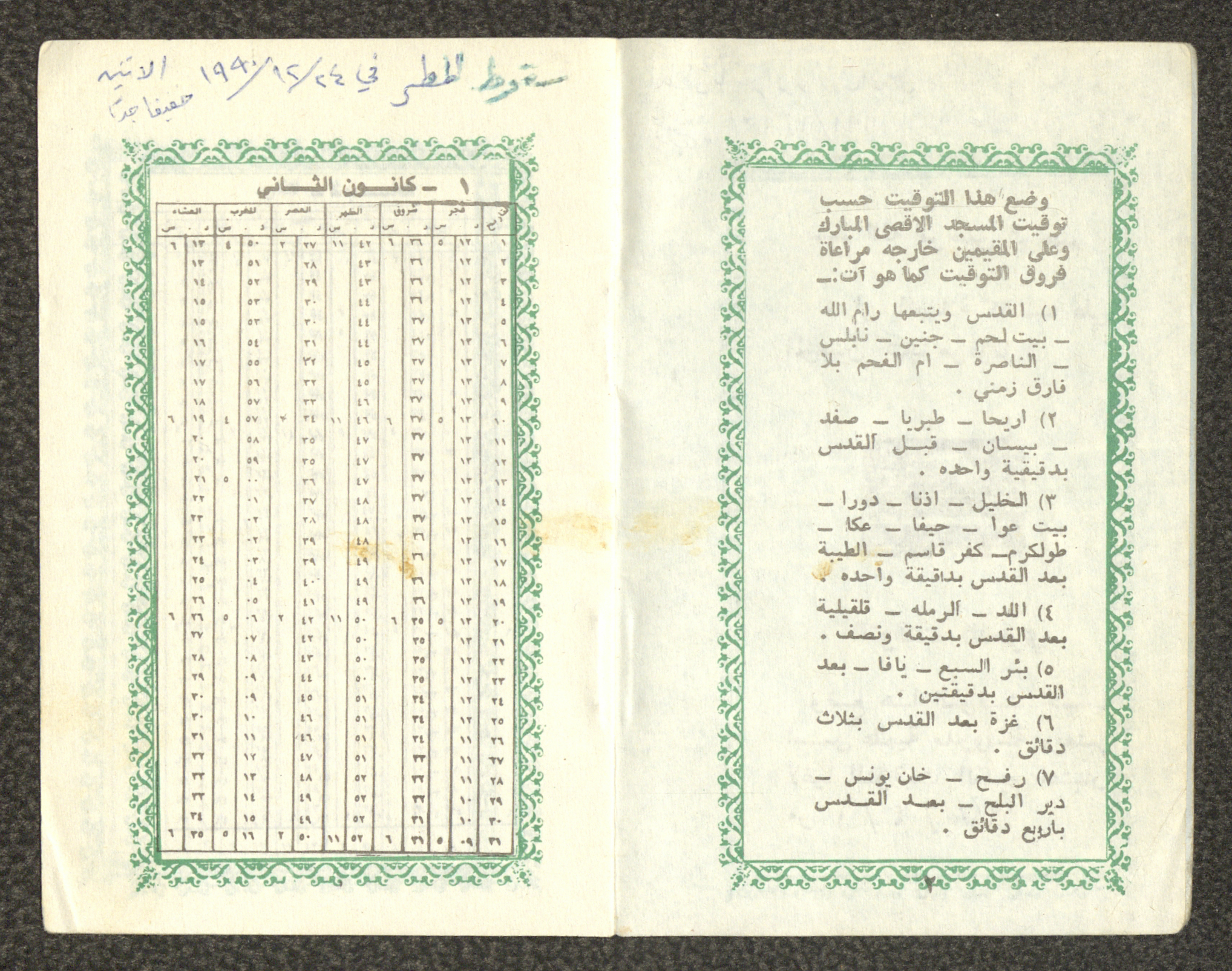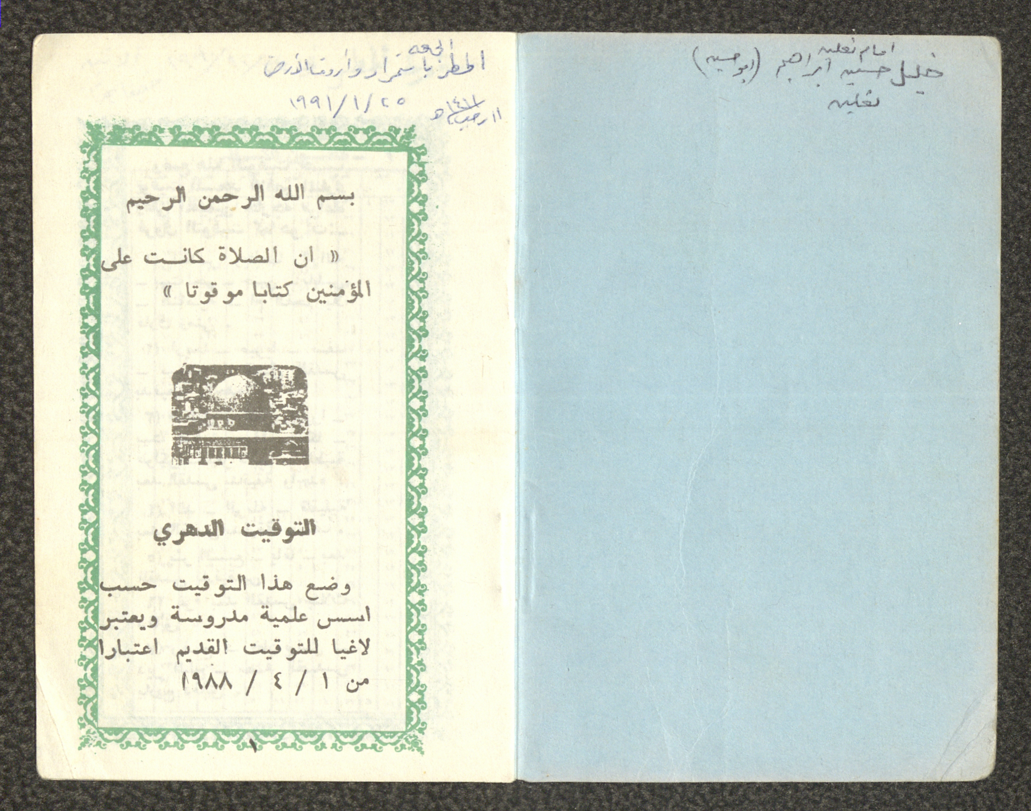 Issued by the Jerusalem Islamic Waqf Administration in 1988, this document shows a booklet titled " the Prayer Timing" showing prayer timings in Palestinian cities and villages. Found also notes recorded by Marouf Shtayyeh.