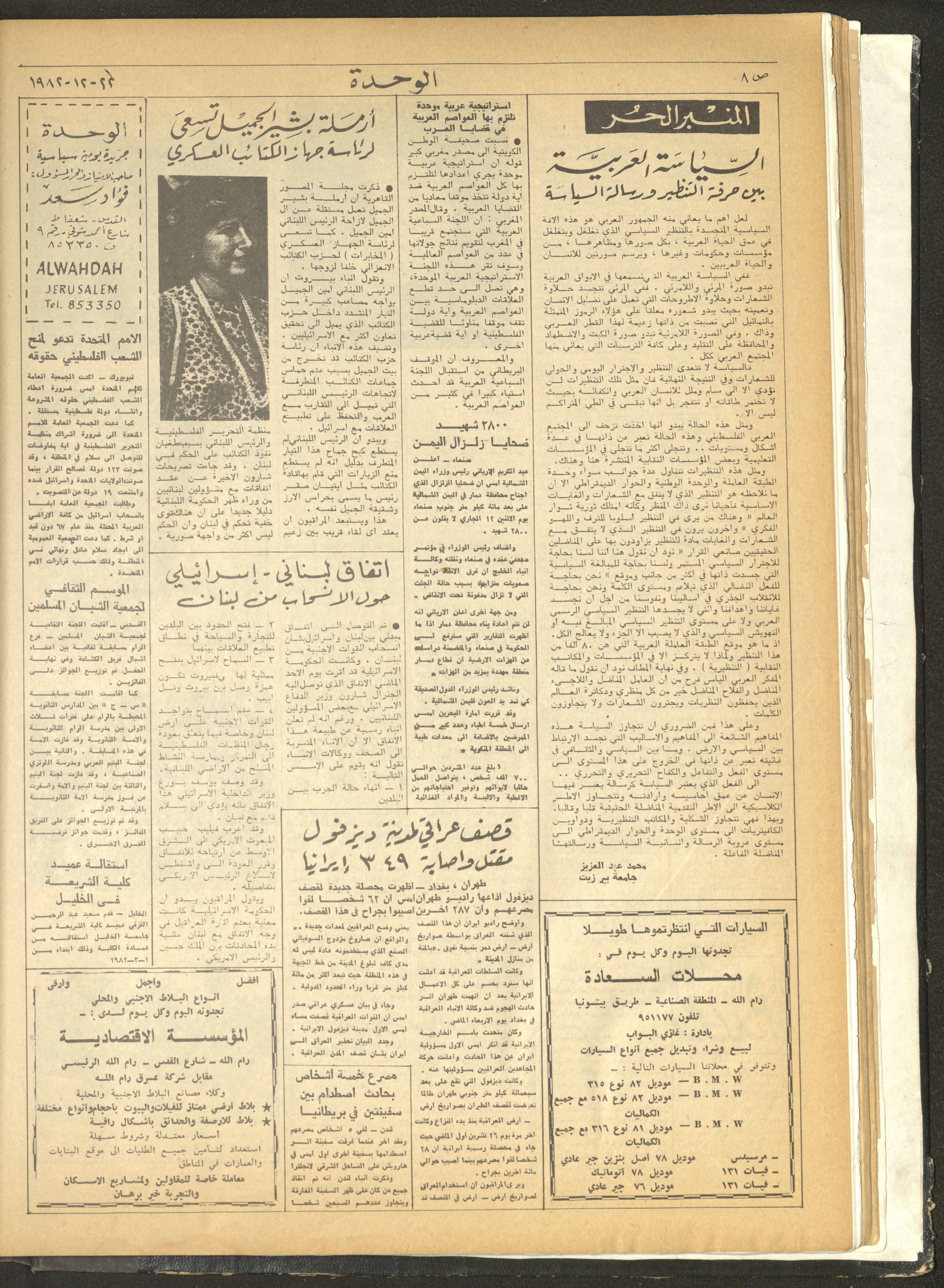Dated 22 December 1982, the 13th issue of al-Wehdeh Newspaper issued in Arabic, which is a daily political newspaper that is issued weekly under the supervision of its editor-in-chief, Fouad Saad and contains 8 pages and sells at 6 shekels, it also includes advertisements, photographs and news titled as follows: - The murder of a young man in Nablus and the wounding of another, and important statements by Arafat about current issues. - King Hussein started talks with the US President. - Basic axioms in the Palestinian work. - The Union and Progress Bloc won the Birzeit University Student Council elections. - Continuing the ban on the people of Silwad. - Arab Interior Ministers decide to facilitate the movement of Palestinians in Arab countries. - The Arab Women's Union Association in Ramallah celebrates the International Day of the Elderly. - Rania Factory for Chemical Detergents in Ramallah. - A judicial race between the Arabs and the Israeli occupation. - The World Zionist Congress opposes the colonial policy in the West Bank and the Gaza Strip. - Palestinian Teacher's Day Celebrations. - Arafat's statements, Arab politics between theorizing and the message of politics. - Bashir Gemayel's widow seeks to head the Kataeb military apparatus.