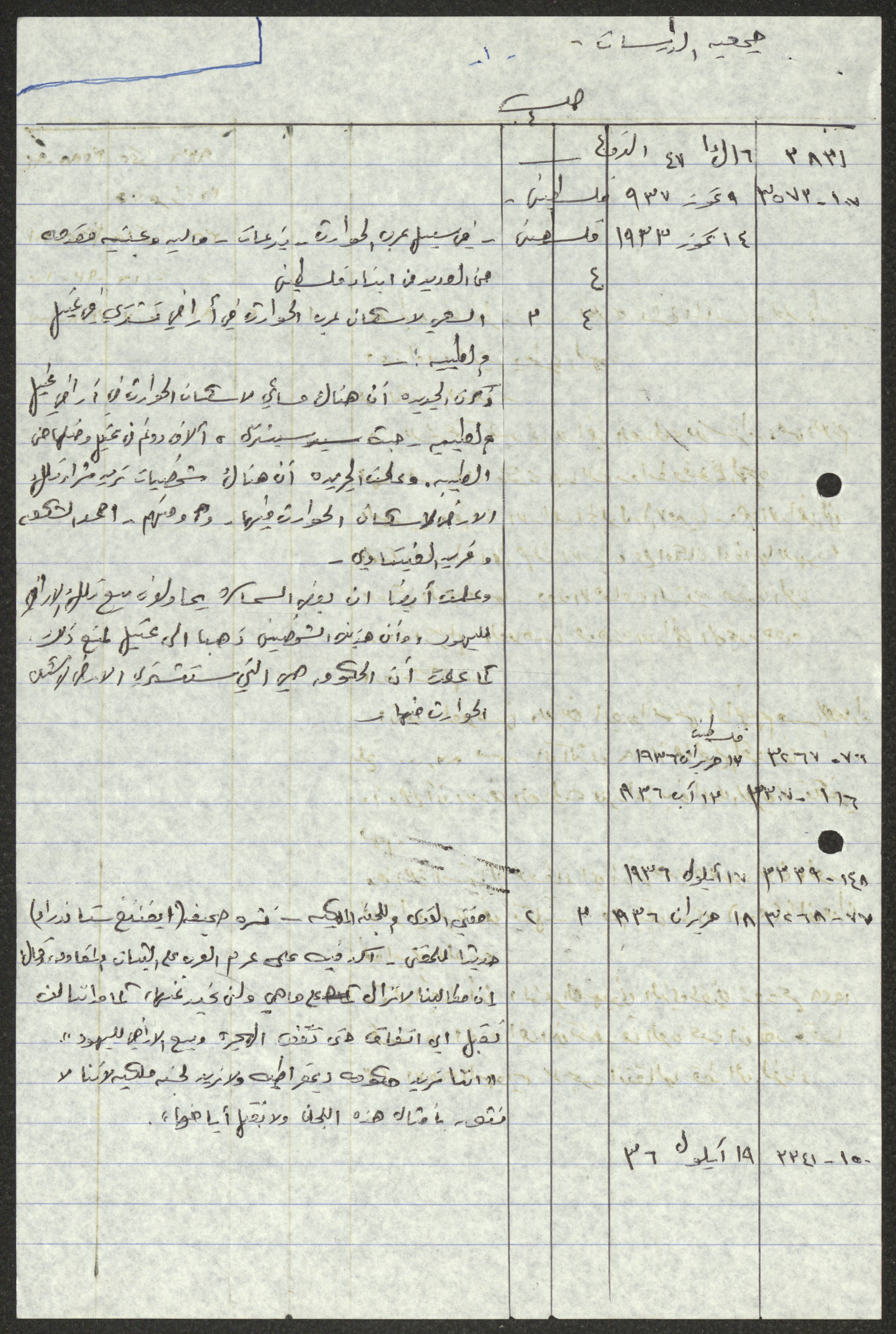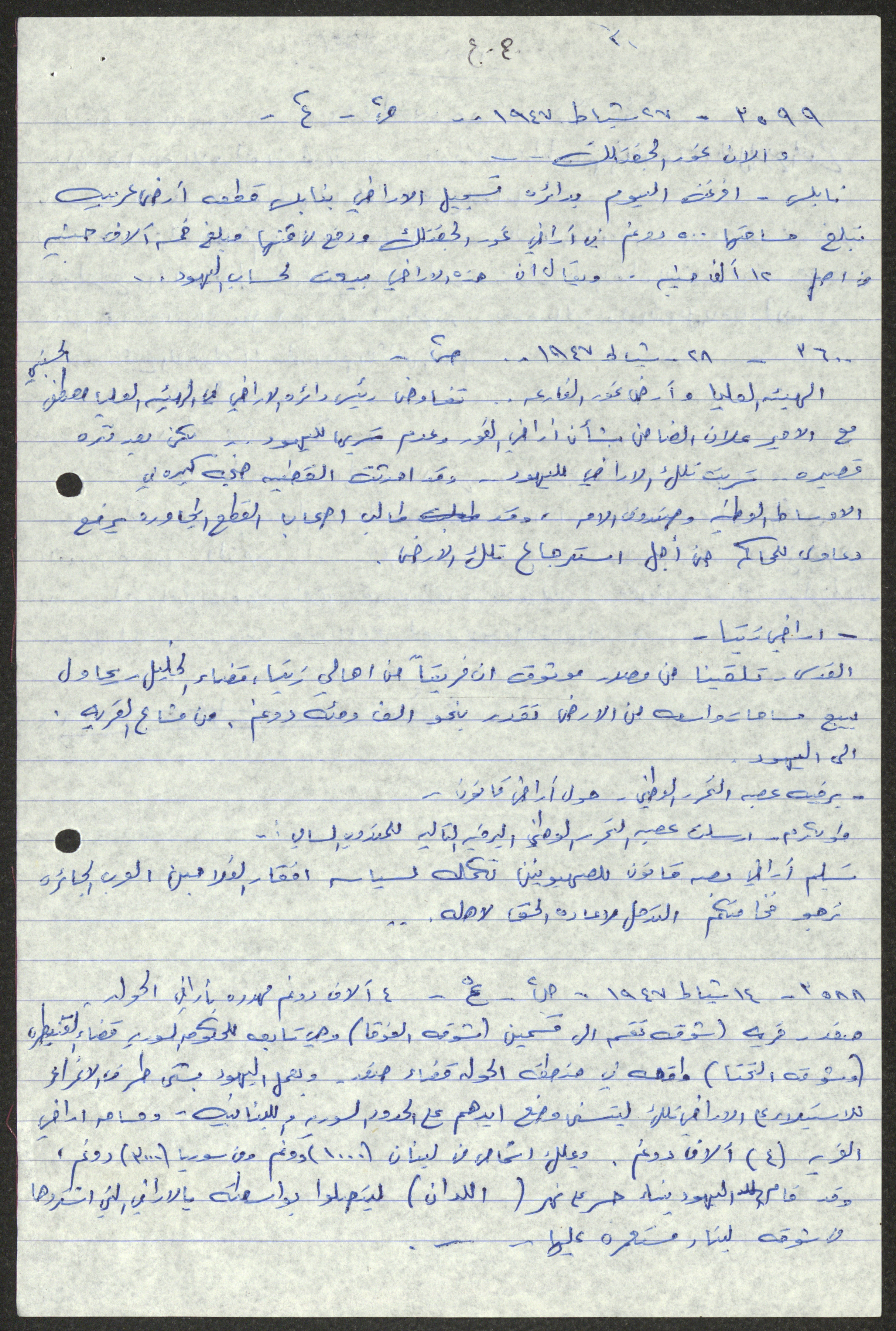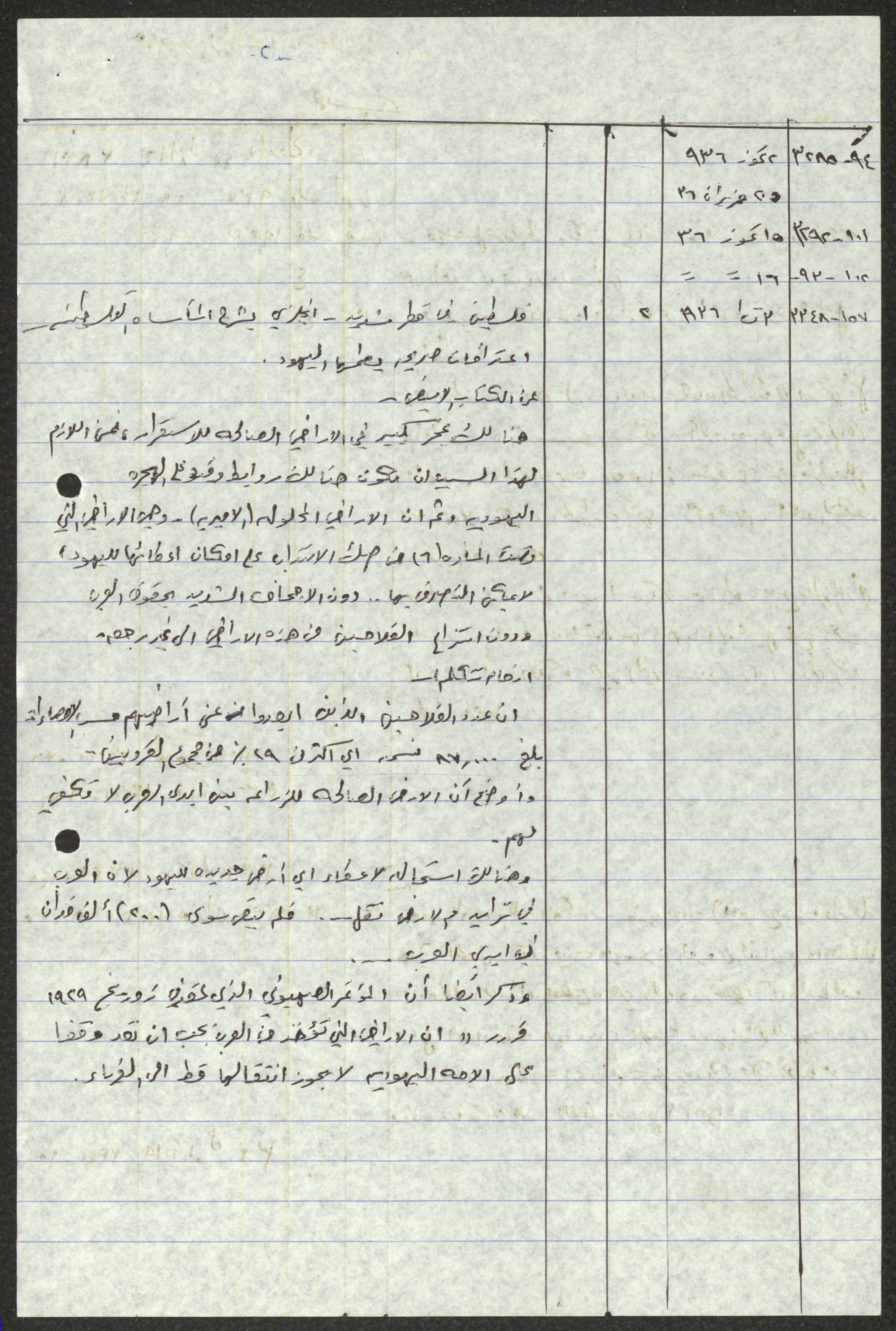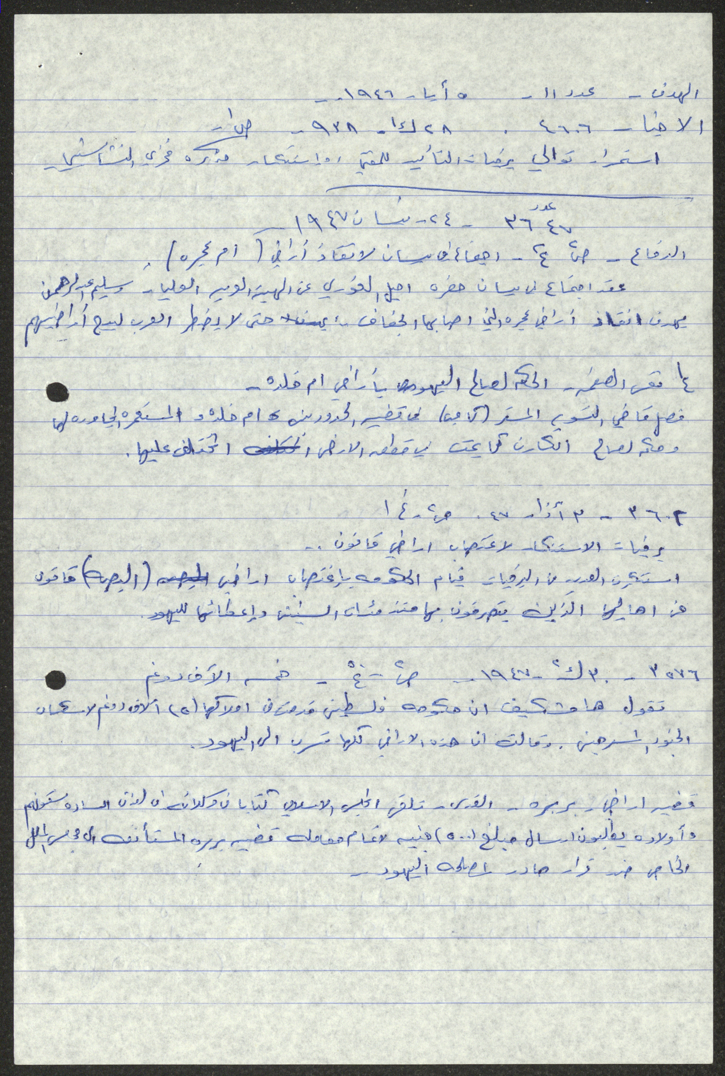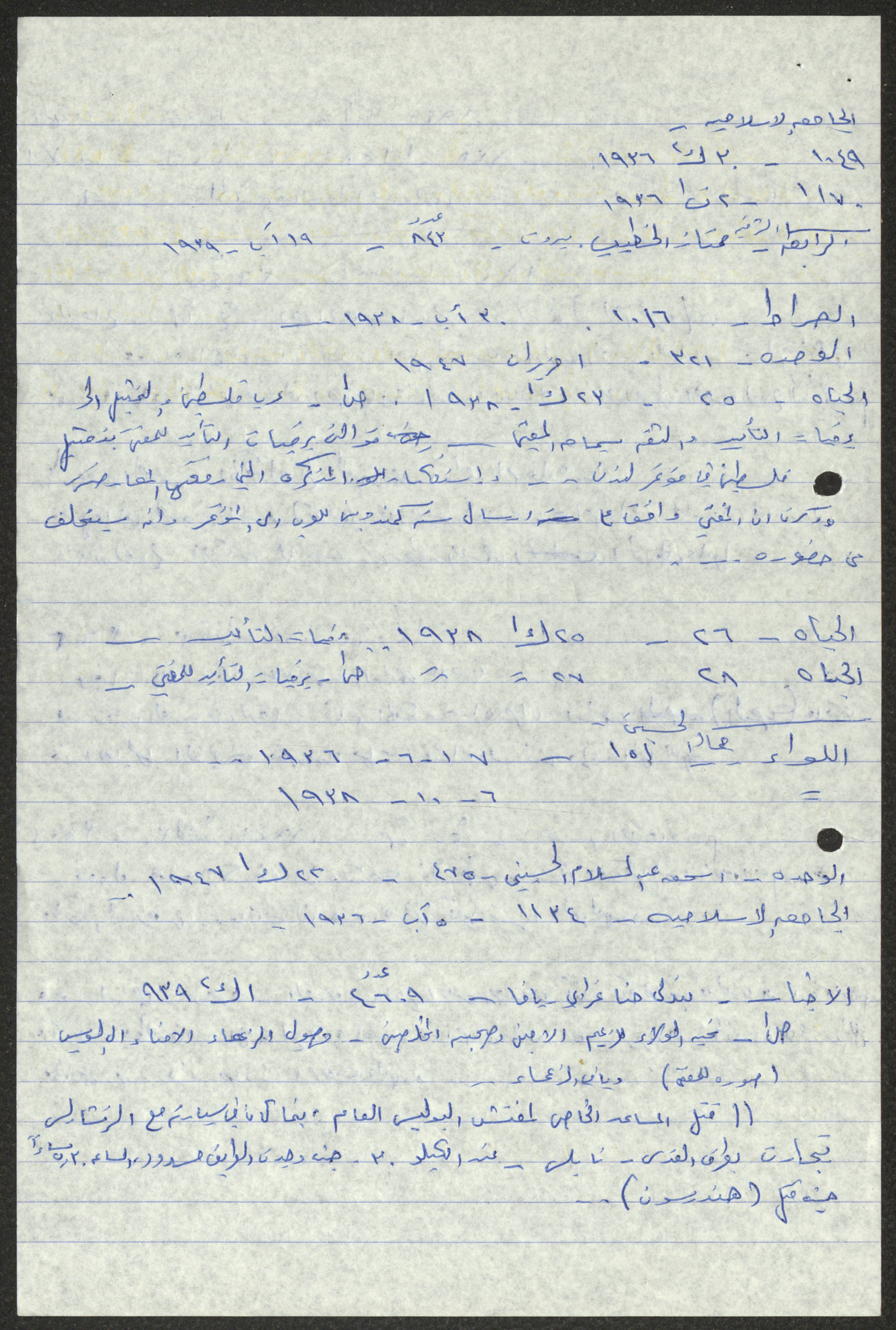 Handwritten by Sameeh Hammoudeh in Arabic, this document shows a transcript and quotes from different periodicals including Palestine, al-Difa, al-Sirat and al-Haya. These selected issues document the attacks on Palestinian farmers and the confiscation of their lands by the British Mandate and the transfer of their ownership to the Jews.