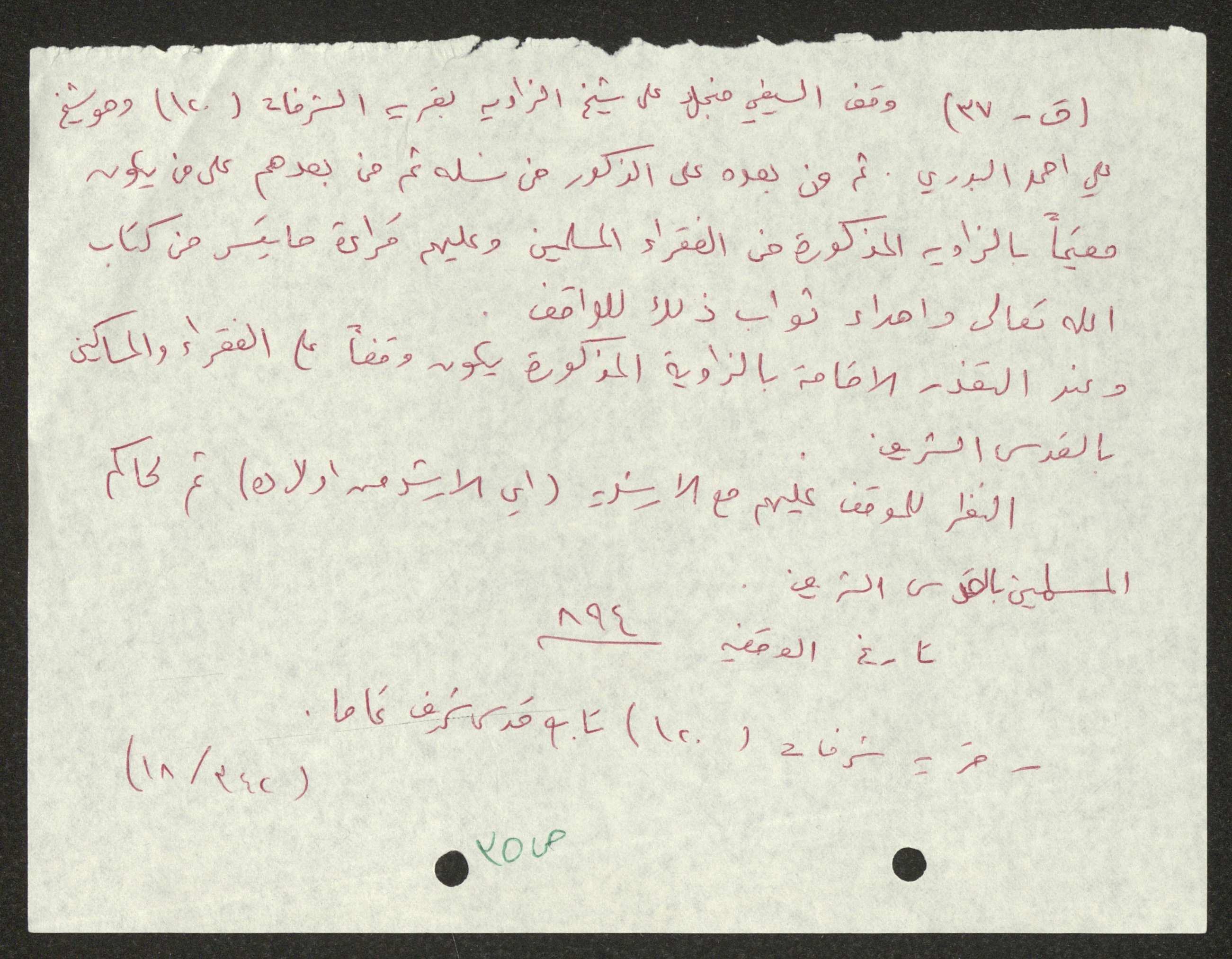 Handwritten by Sameeh Hammoudeh, this document shows a paper clipping with quotes and notes regarding the endowment of Sharafat Village in the Jerusalem District.