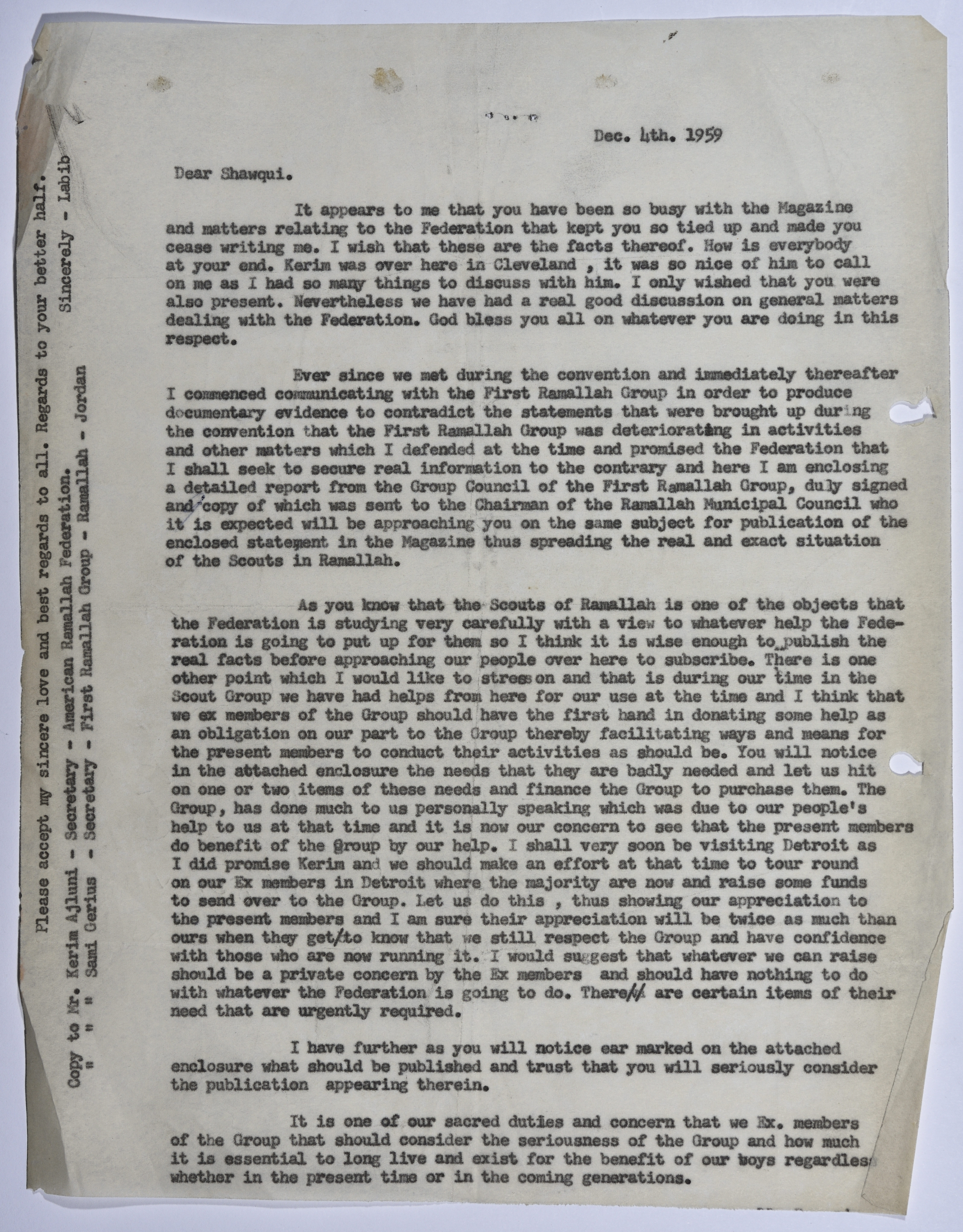 A letter from Labib Hishme to Farid Shatara, the head of the American Federation of Ramallah Palestine (AFRP), to rebut the claim that the Scout Movement activities are declining in Palestine.