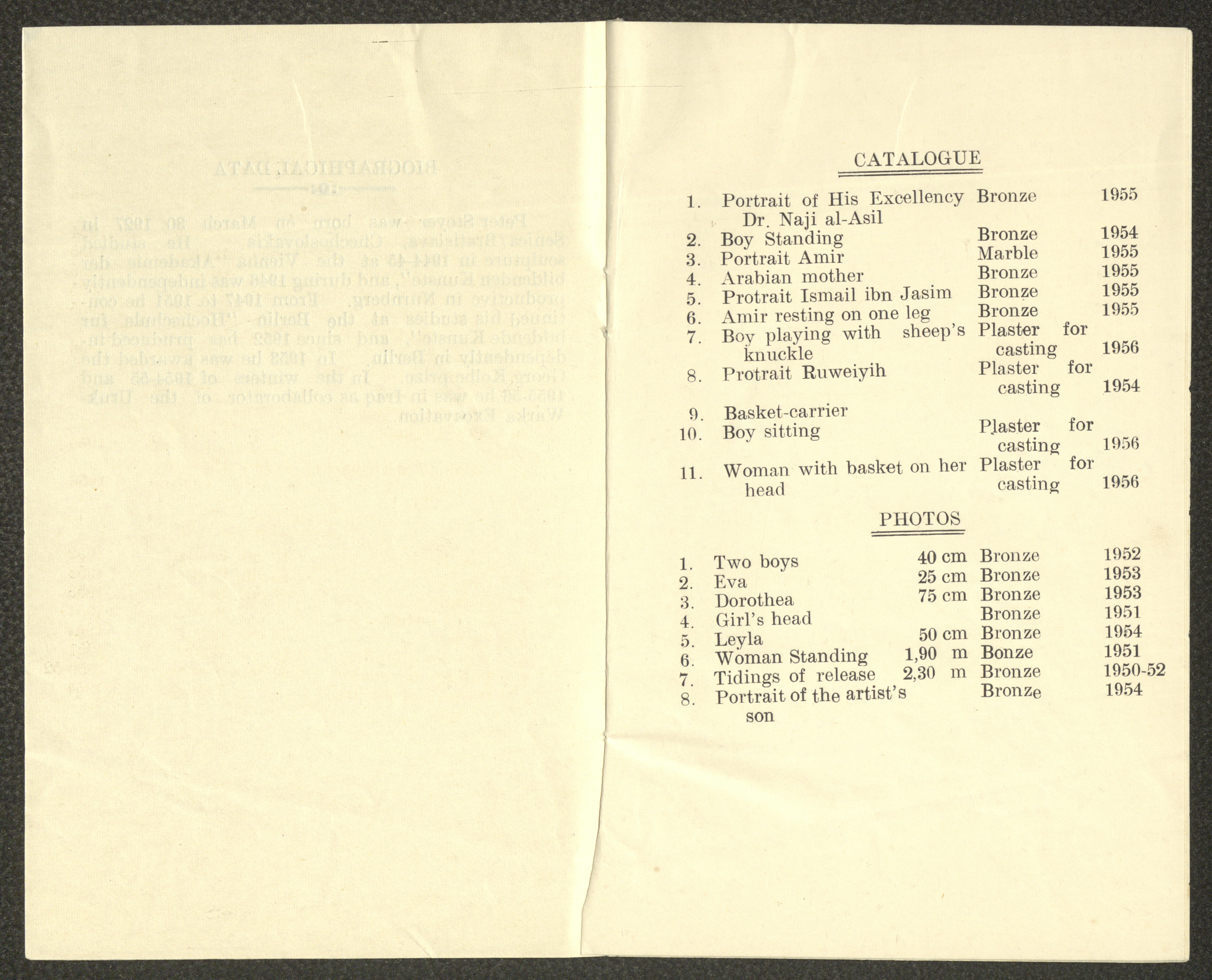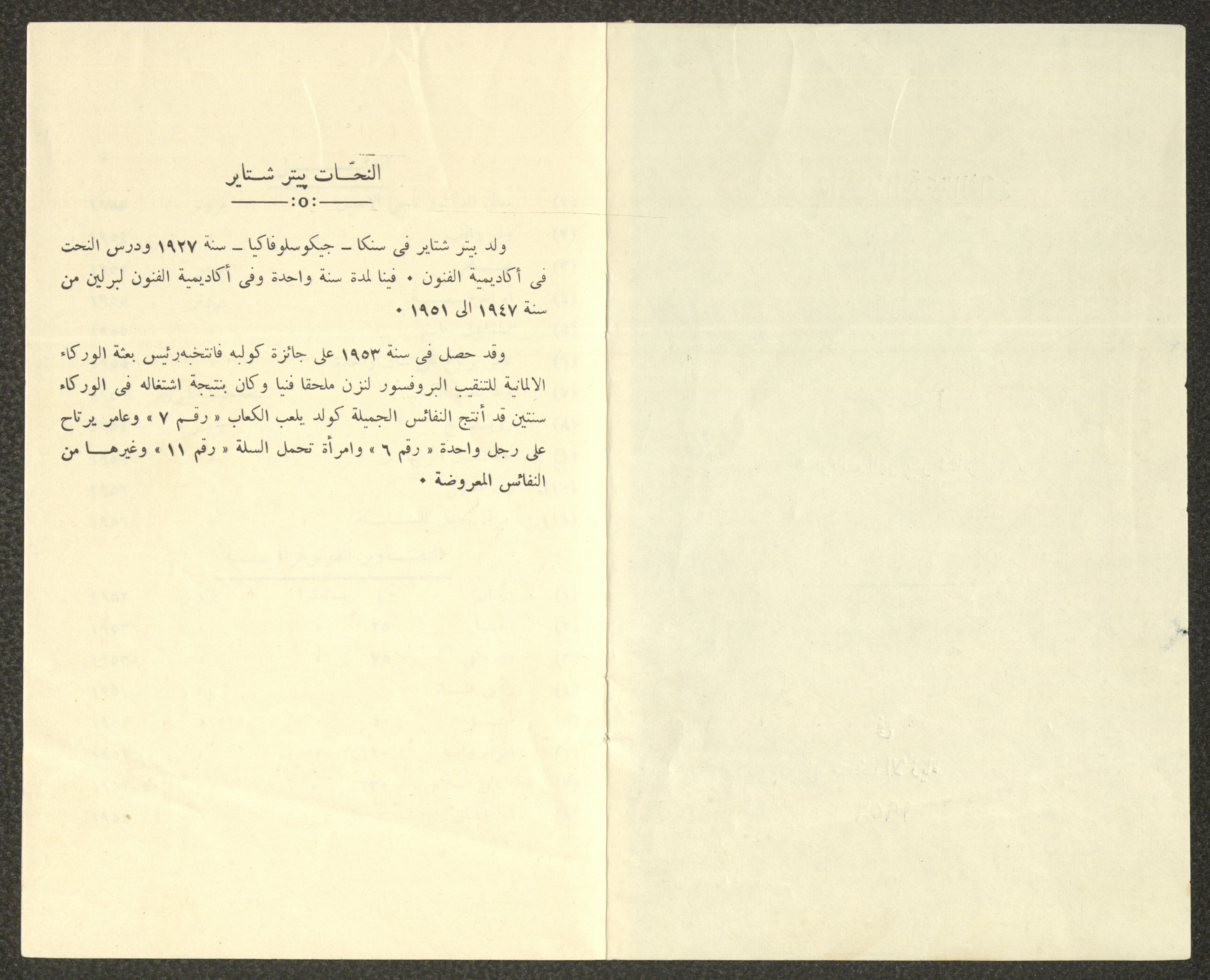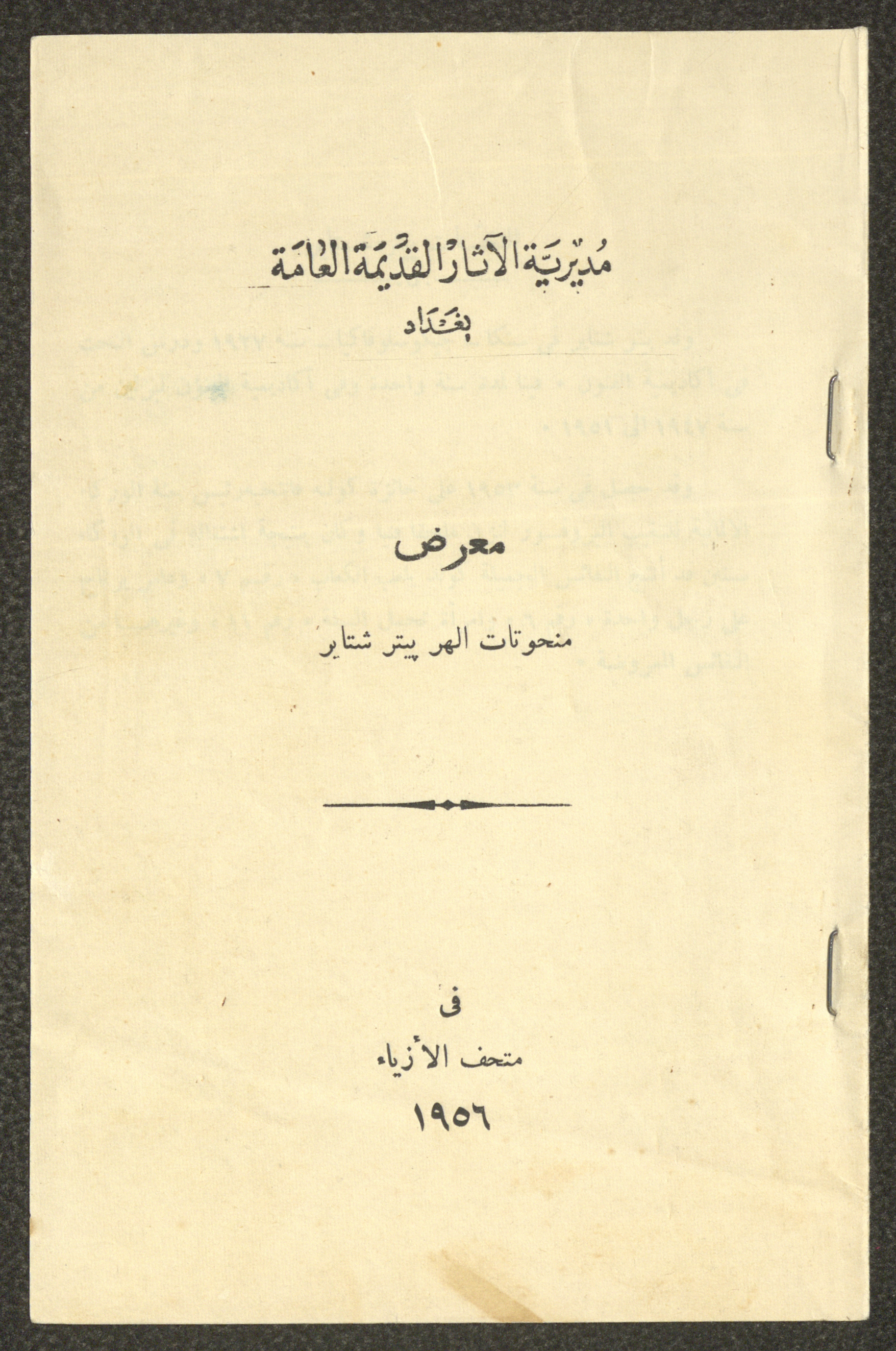 مادة أرشيفية مطبوعة باللغتين العربية والإنجليزية، وهي كتيّب دليل منحوتات الهر بيتر شتاير في متحف الأزياء عام 1956، صدر الكتيّب عن مديرية الآثار القديمة العامة في بغداد، ويحتوي الكتيّب ملخص صغير حول النحّات بيتر شتاير، ودليل أعماله الفنية وعناوينها، طبع الكتيّب من قبل المطبعة الحكومية في بغداد عام 1956.