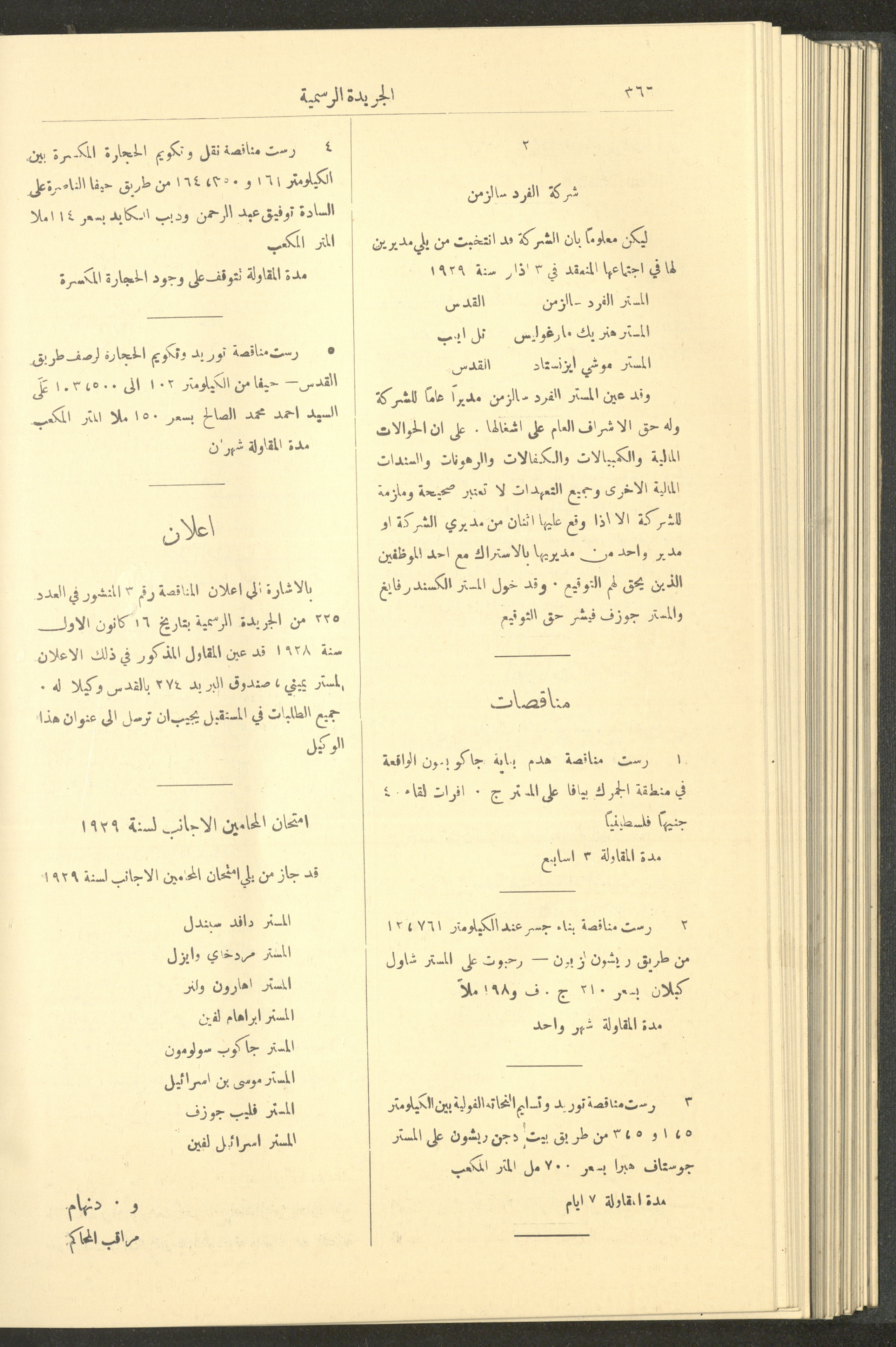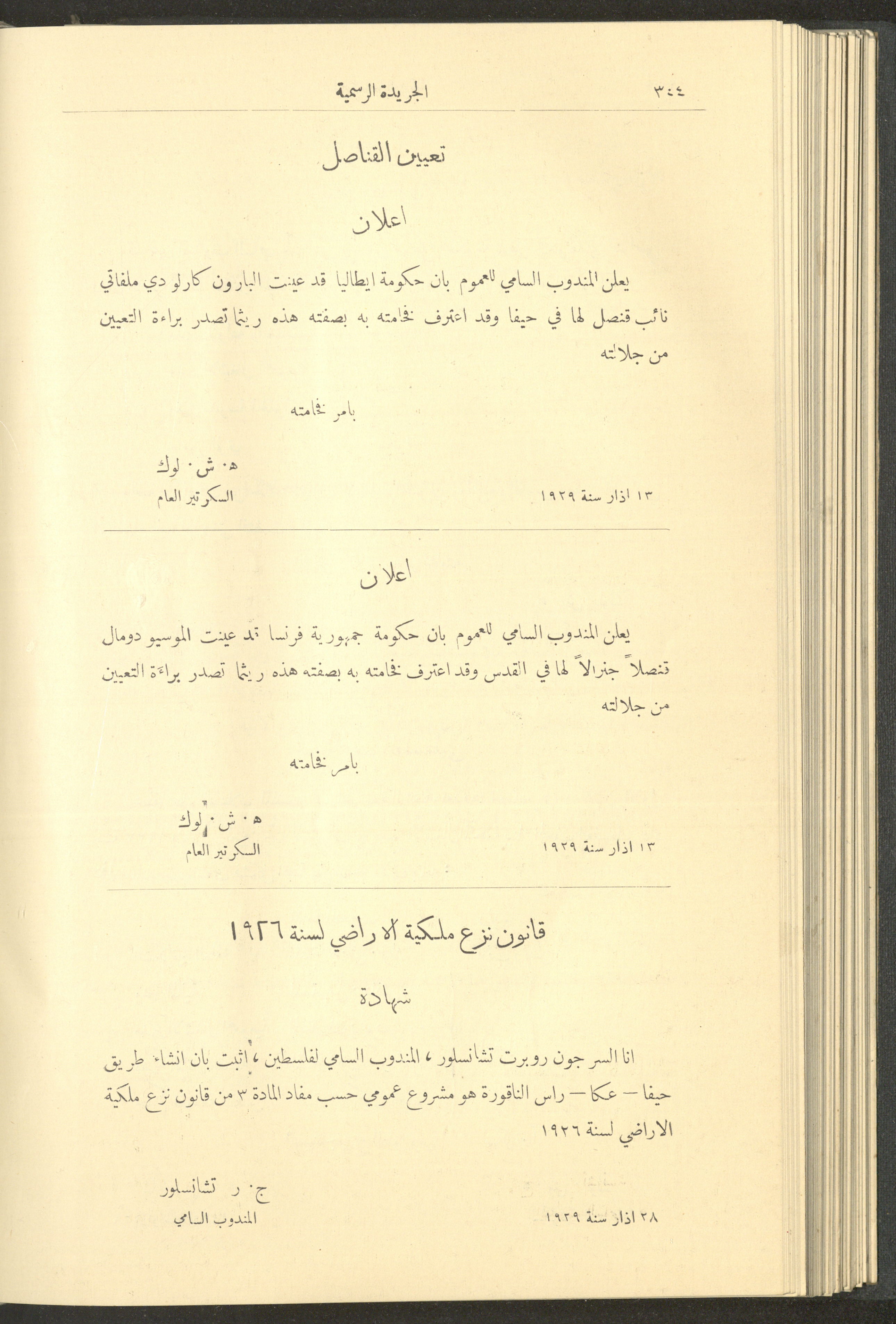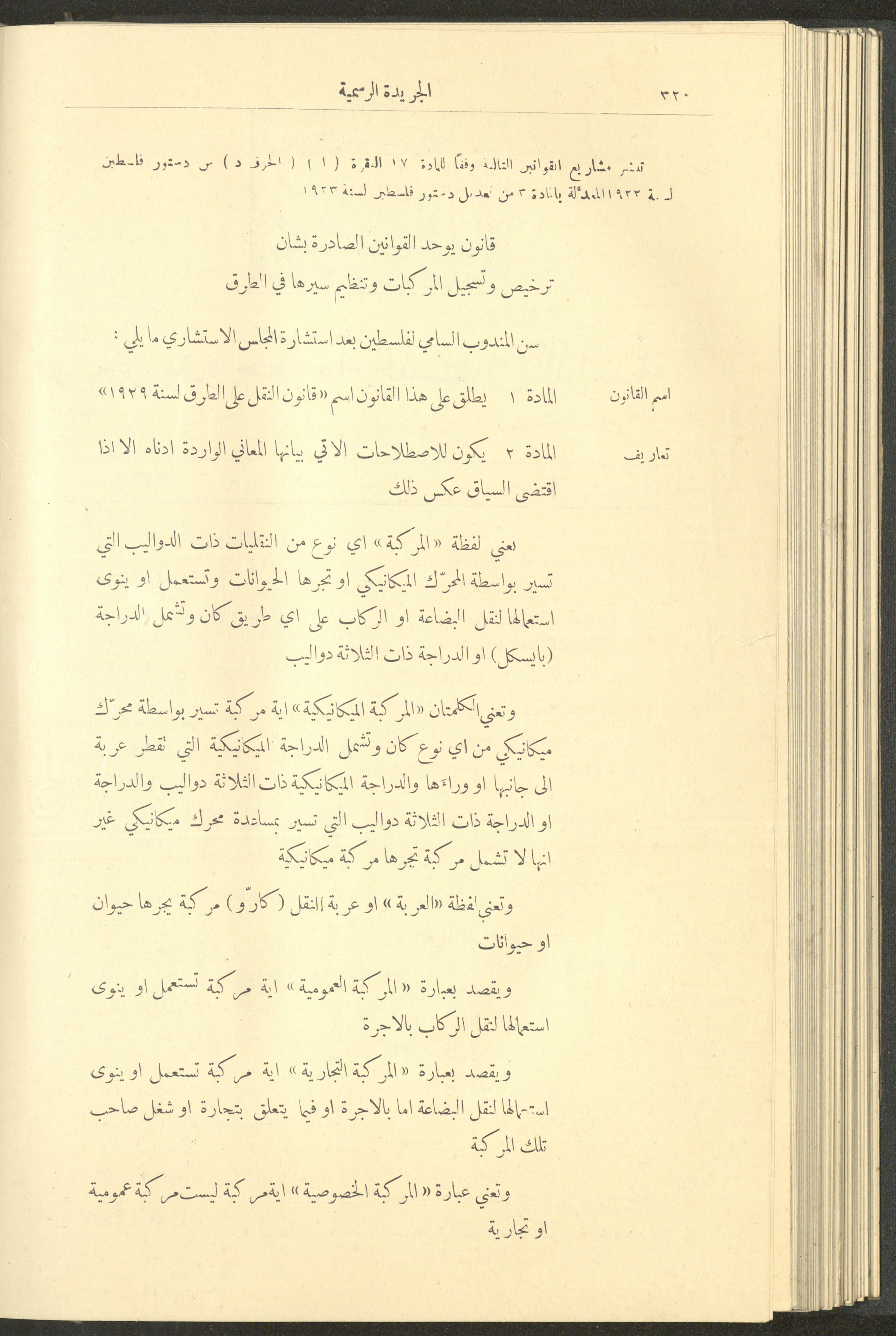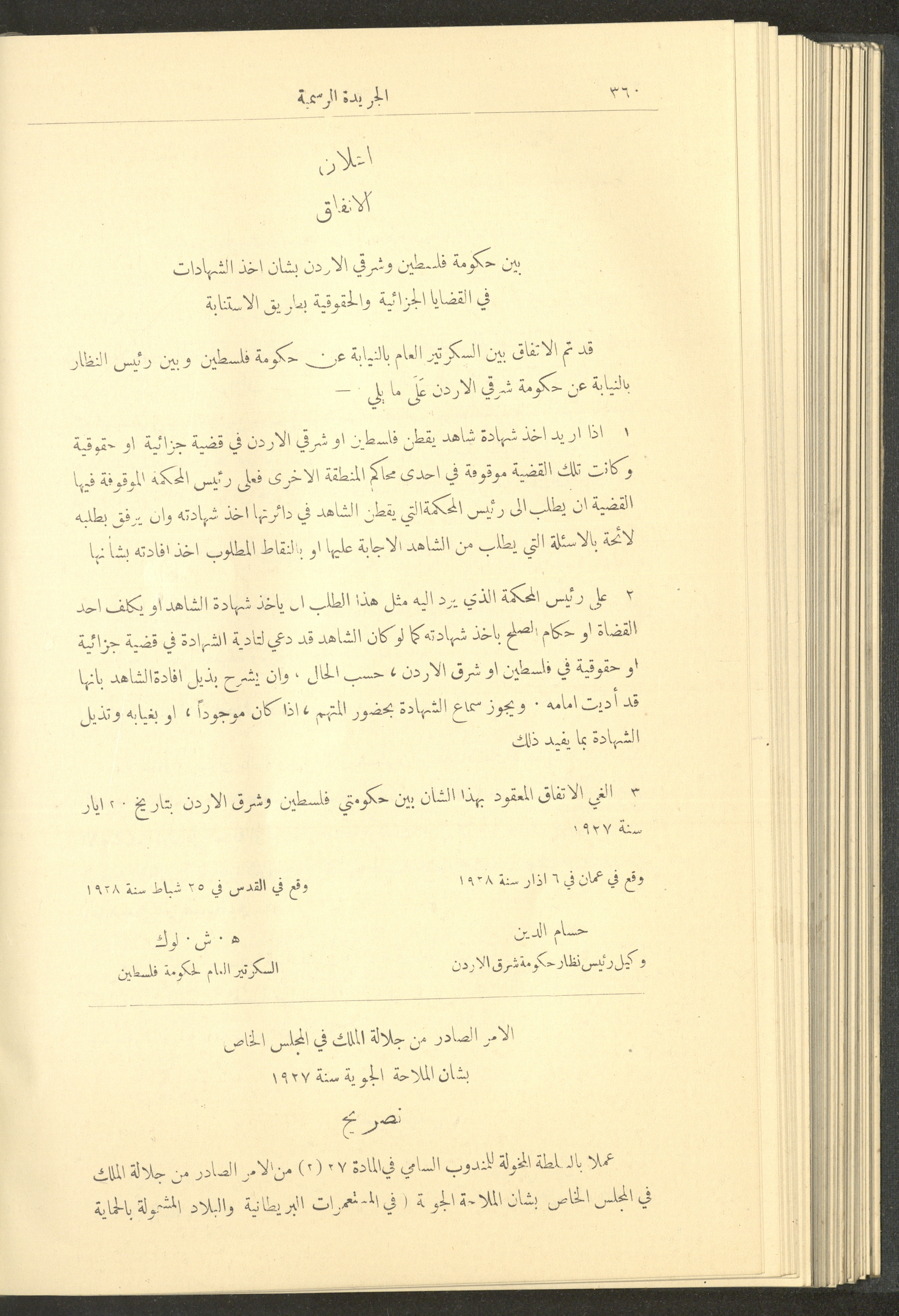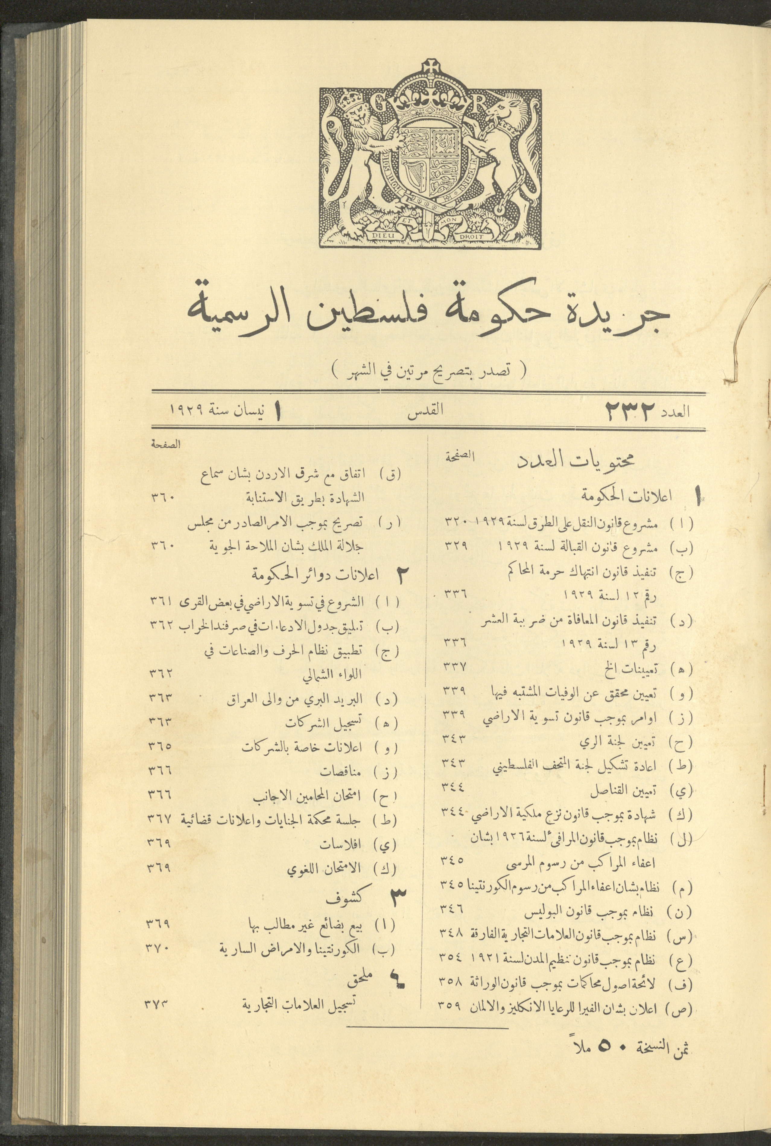 Issued on 1 April 1929, this document shows issue no. 226 of the Official Palestine Newspaper featuring official government announcements including initiating land settlement in some villages, applying the crafts and industries system in the northern district, registering companies, land mail to and from Iraq, bankruptcy and lists of the movement of immigrants to Palestine and the displaced from it, in addition to official government announcements regarding laws and legislation and amendments thereto. The issue was printed in Azriel Press in Jerusalem, where the price of the copy was fifty mils and was published twice a month. Said official government announcements and amendments include: Road Transport Bill for the year 1929-1930. The Midwifery Bill of 1929. Implementation of Law No. 13 of 1929 on Violating the Freedom of Courts. Appointment of an investigator for suspected deaths. Orders under the Land Settlement Act. Appointment of the Freedom of Opinion Committee. Re-formation of the Palestinian Museum Committee. Appointment of consuls. Certificate under the Land Expropriation Act. A system under the Ports Act 1926. A system regarding the exemption of boats from the Cortina fees. A system under police law. A system under the Trademarks Act. A system under the Town Planning Act of 1921. Bylaws of due process under the law of succession. Announcement regarding visa for English and German nationals. An agreement with Transjordan regarding hearing the testimony by proxy. A statement under the order issued by the King's Council regarding air navigation.