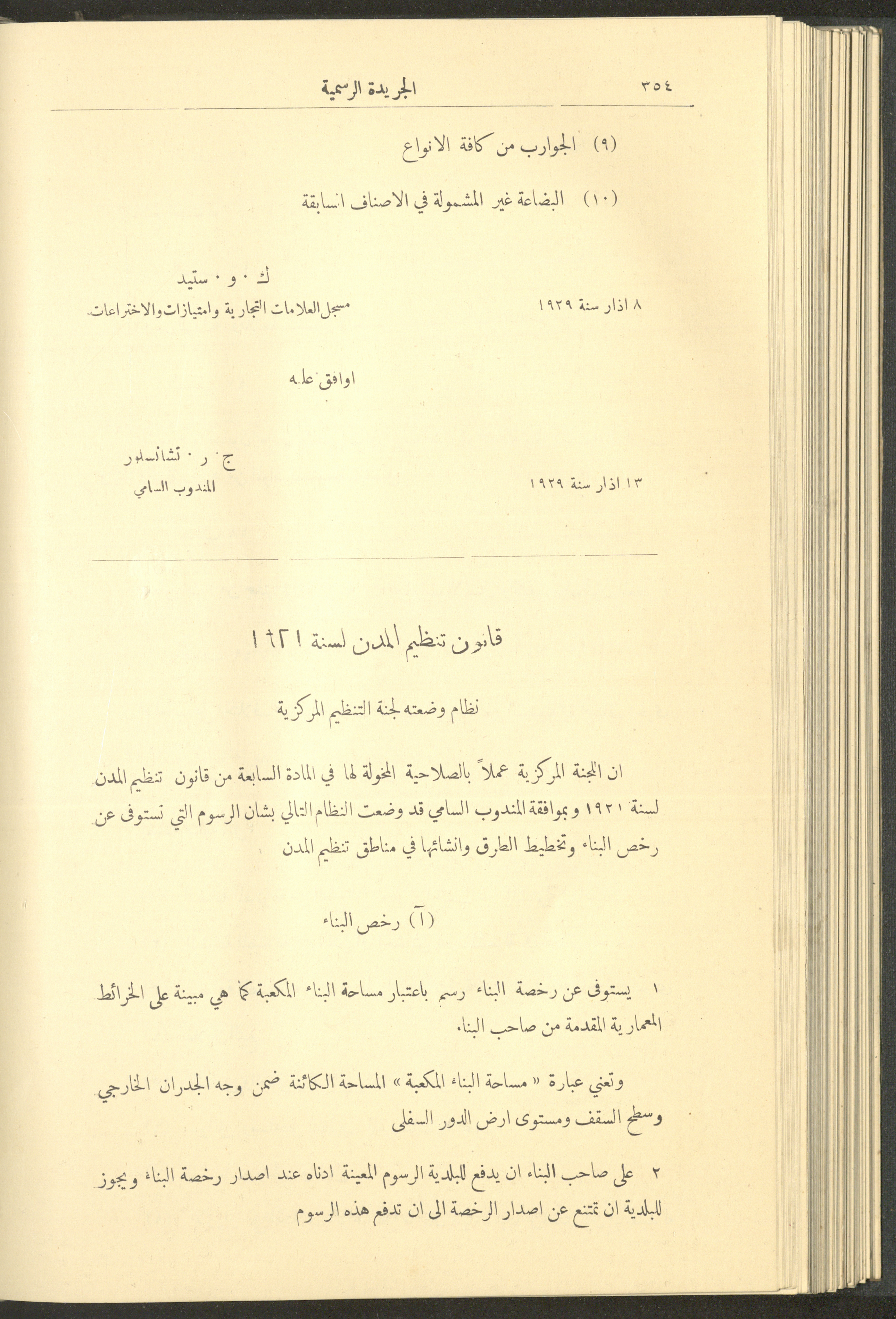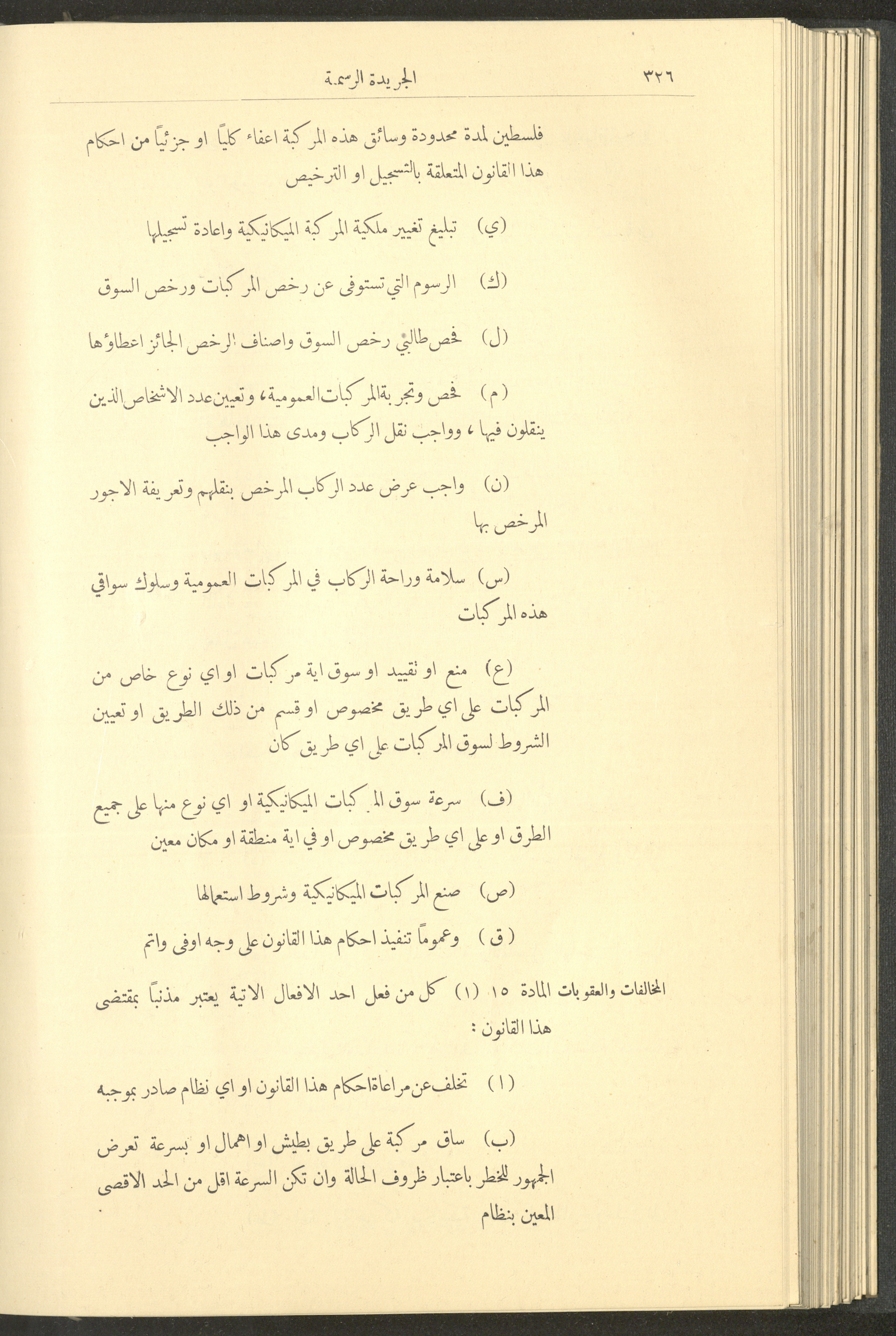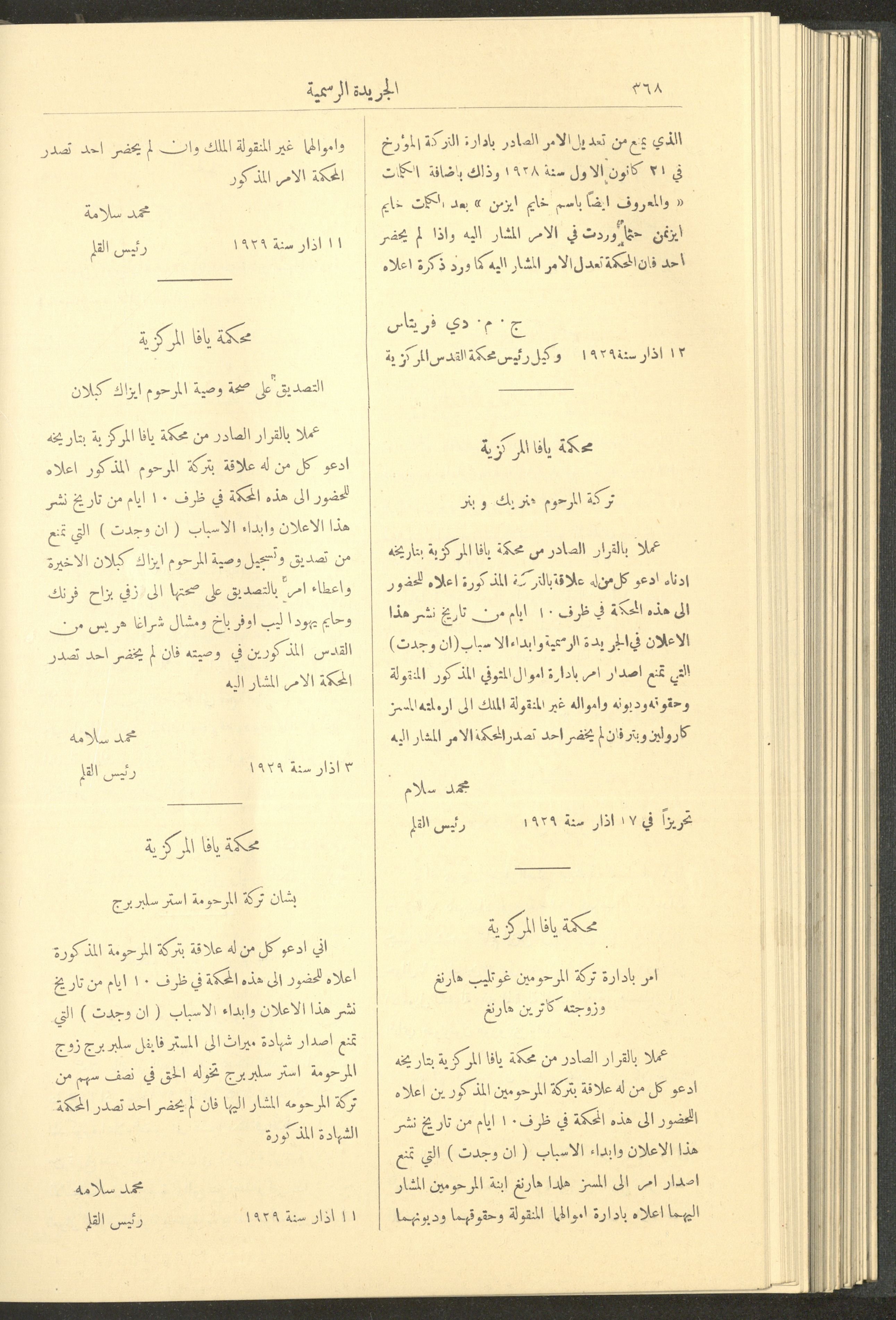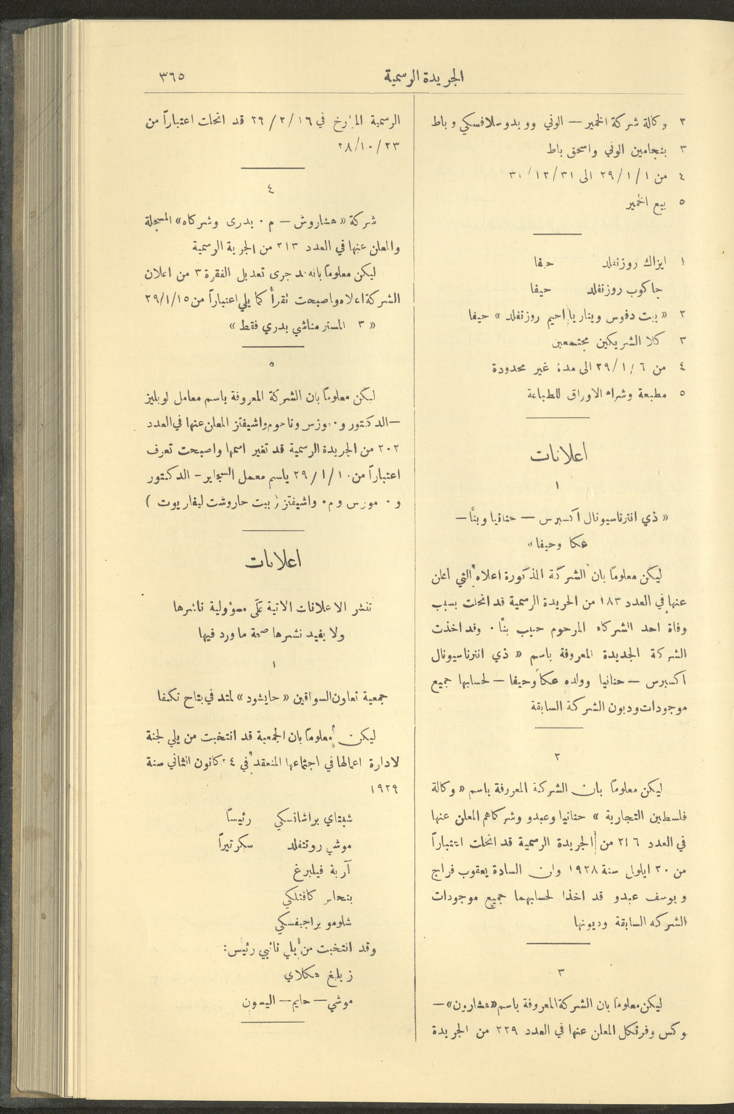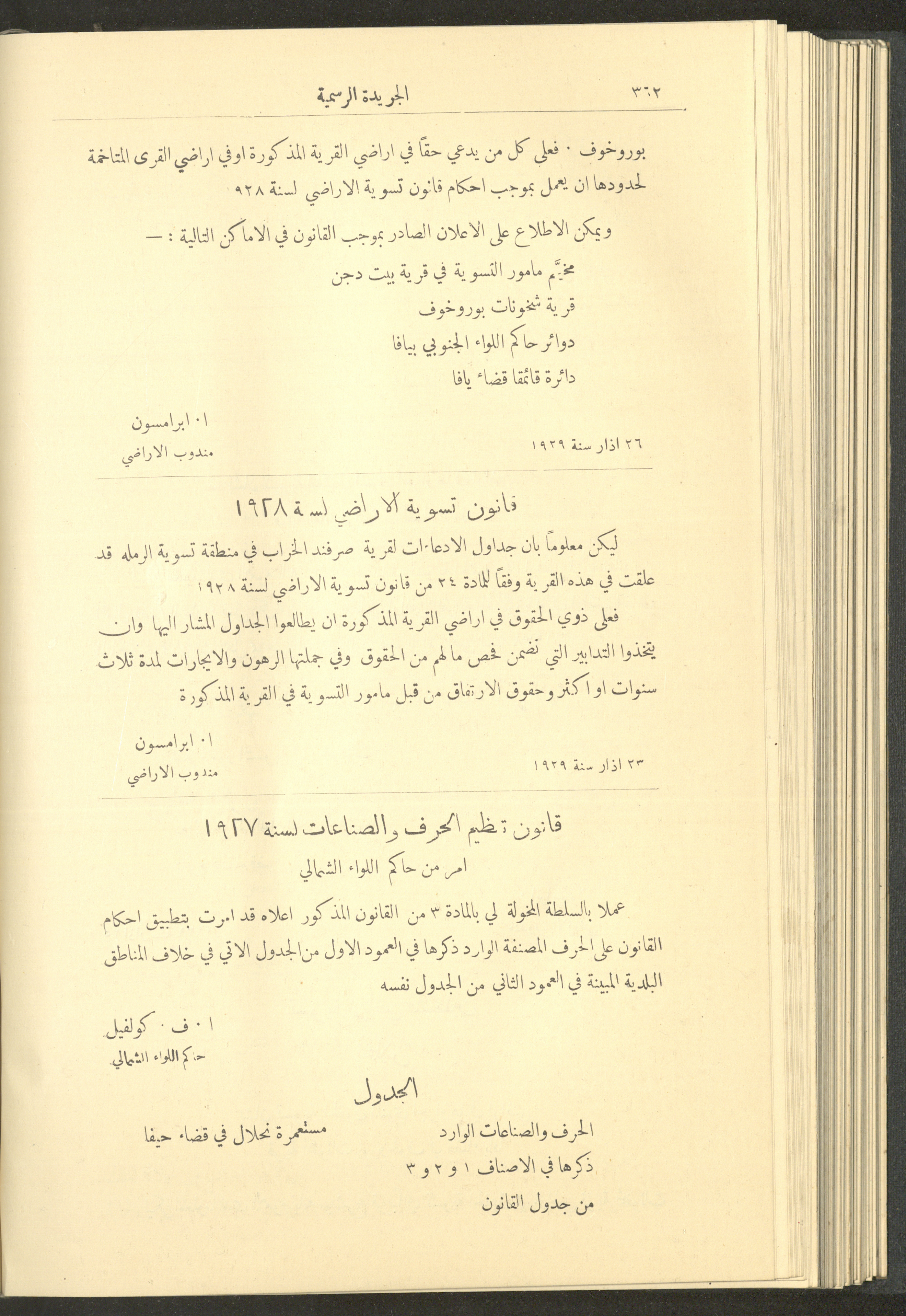 Issued on 1 April 1929, this document shows issue no. 226 of the Official Palestine Newspaper featuring official government announcements including initiating land settlement in some villages, applying the crafts and industries system in the northern district, registering companies, land mail to and from Iraq, bankruptcy and lists of the movement of immigrants to Palestine and the displaced from it, in addition to official government announcements regarding laws and legislation and amendments thereto. The issue was printed in Azriel Press in Jerusalem, where the price of the copy was fifty mils and was published twice a month. Said official government announcements and amendments include: Road Transport Bill for the year 1929-1930. The Midwifery Bill of 1929. Implementation of Law No. 13 of 1929 on Violating the Freedom of Courts. Appointment of an investigator for suspected deaths. Orders under the Land Settlement Act. Appointment of the Freedom of Opinion Committee. Re-formation of the Palestinian Museum Committee. Appointment of consuls. Certificate under the Land Expropriation Act. A system under the Ports Act 1926. A system regarding the exemption of boats from the Cortina fees. A system under police law. A system under the Trademarks Act. A system under the Town Planning Act of 1921. Bylaws of due process under the law of succession. Announcement regarding visa for English and German nationals. An agreement with Transjordan regarding hearing the testimony by proxy. A statement under the order issued by the King's Council regarding air navigation.