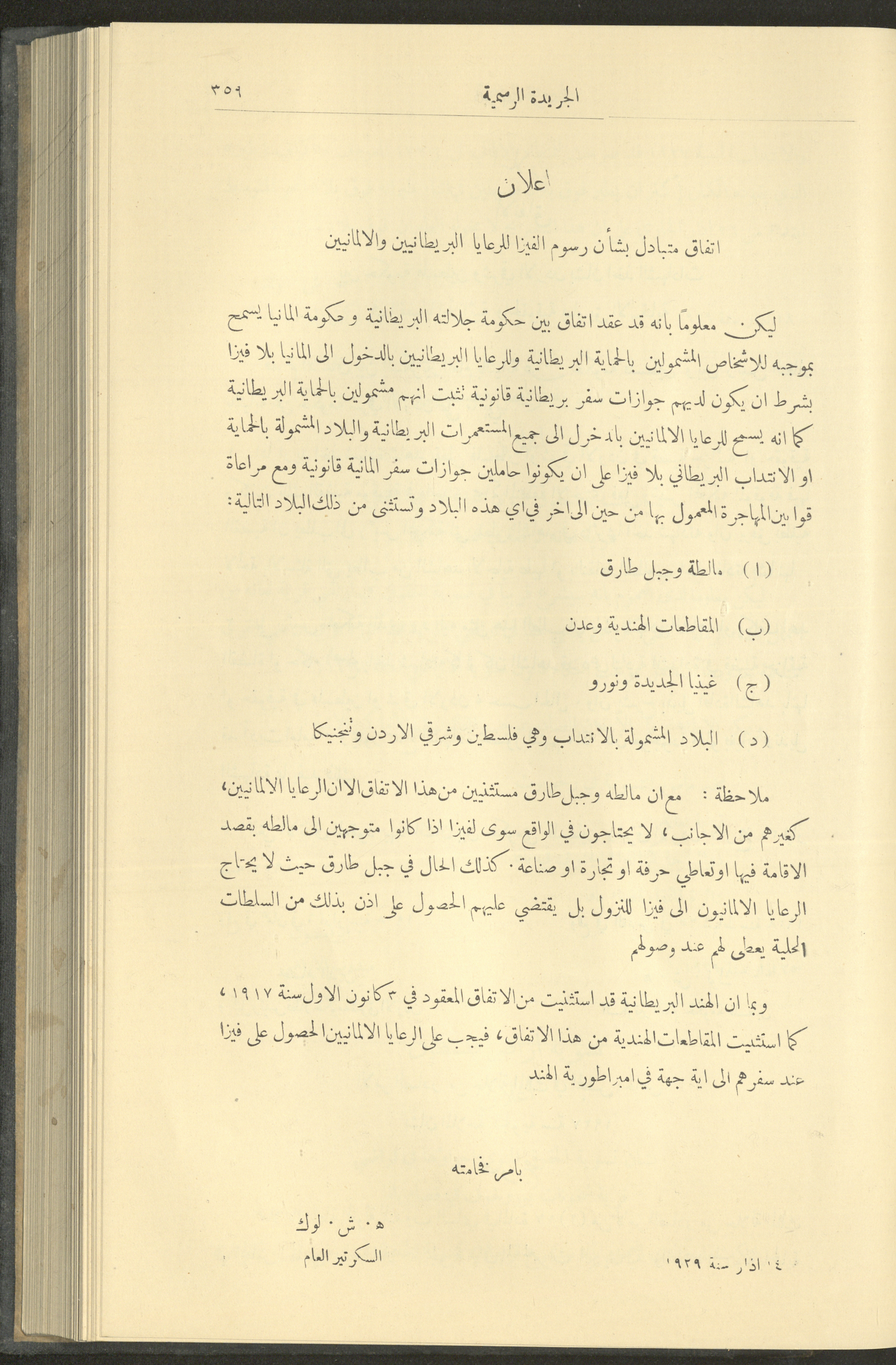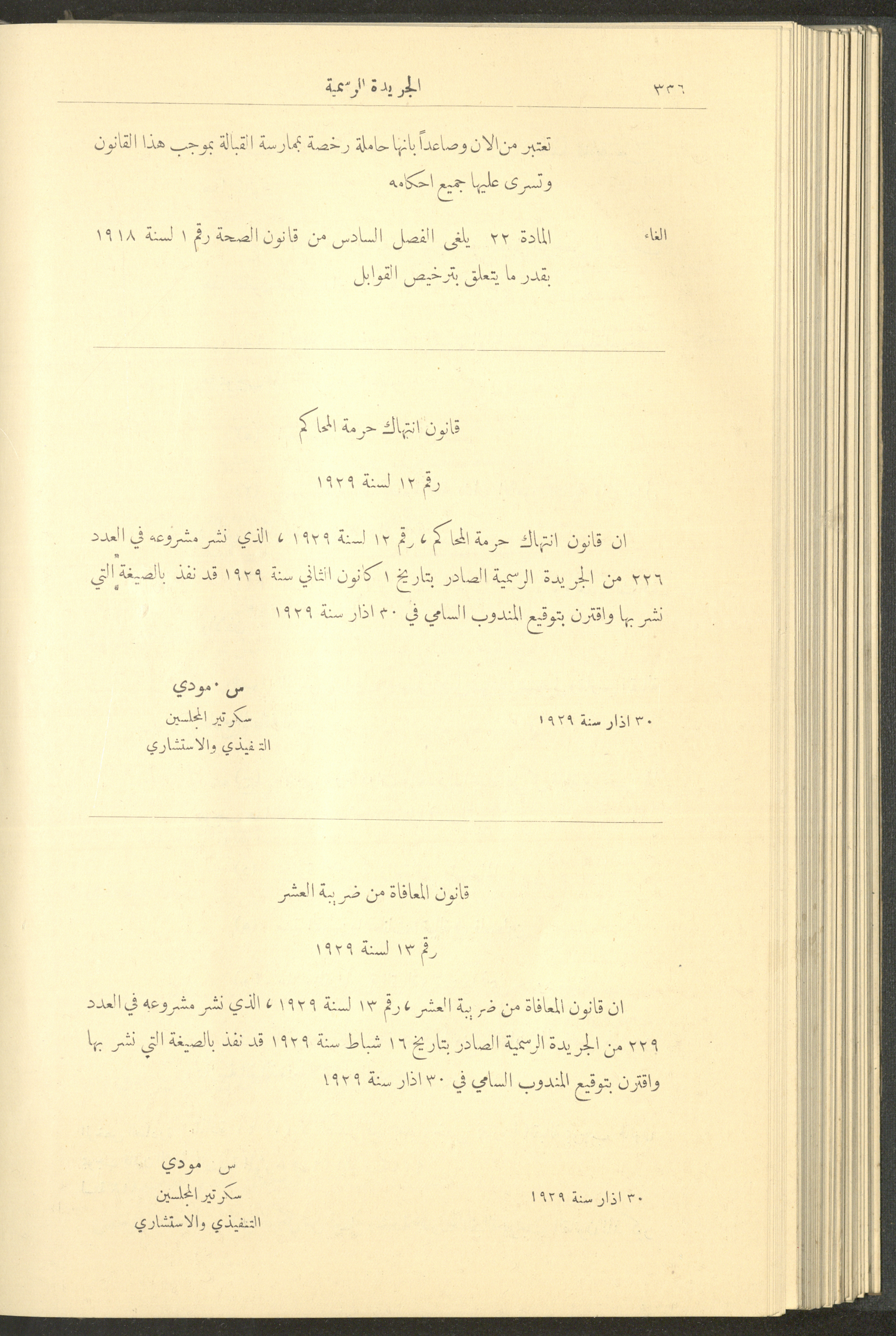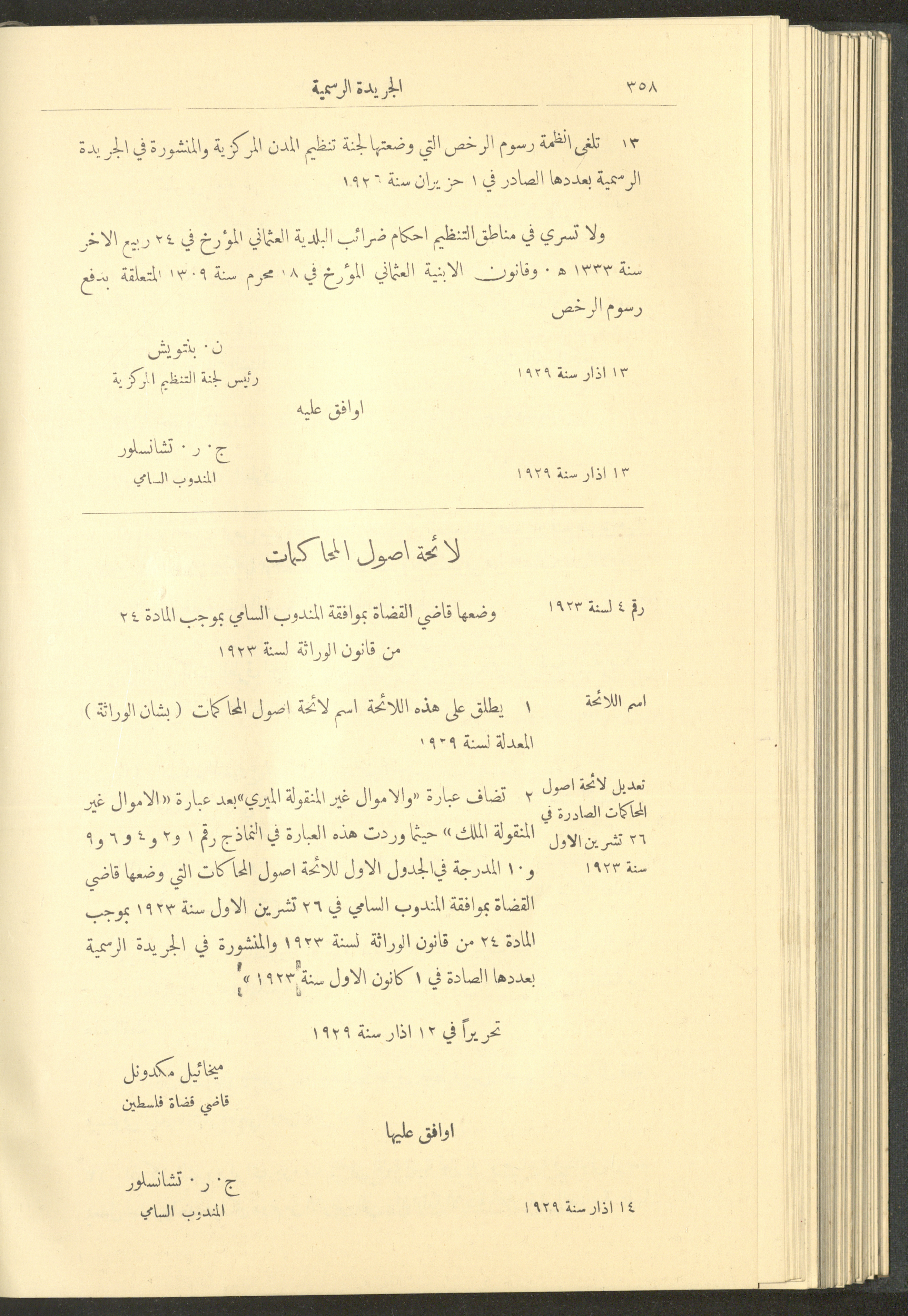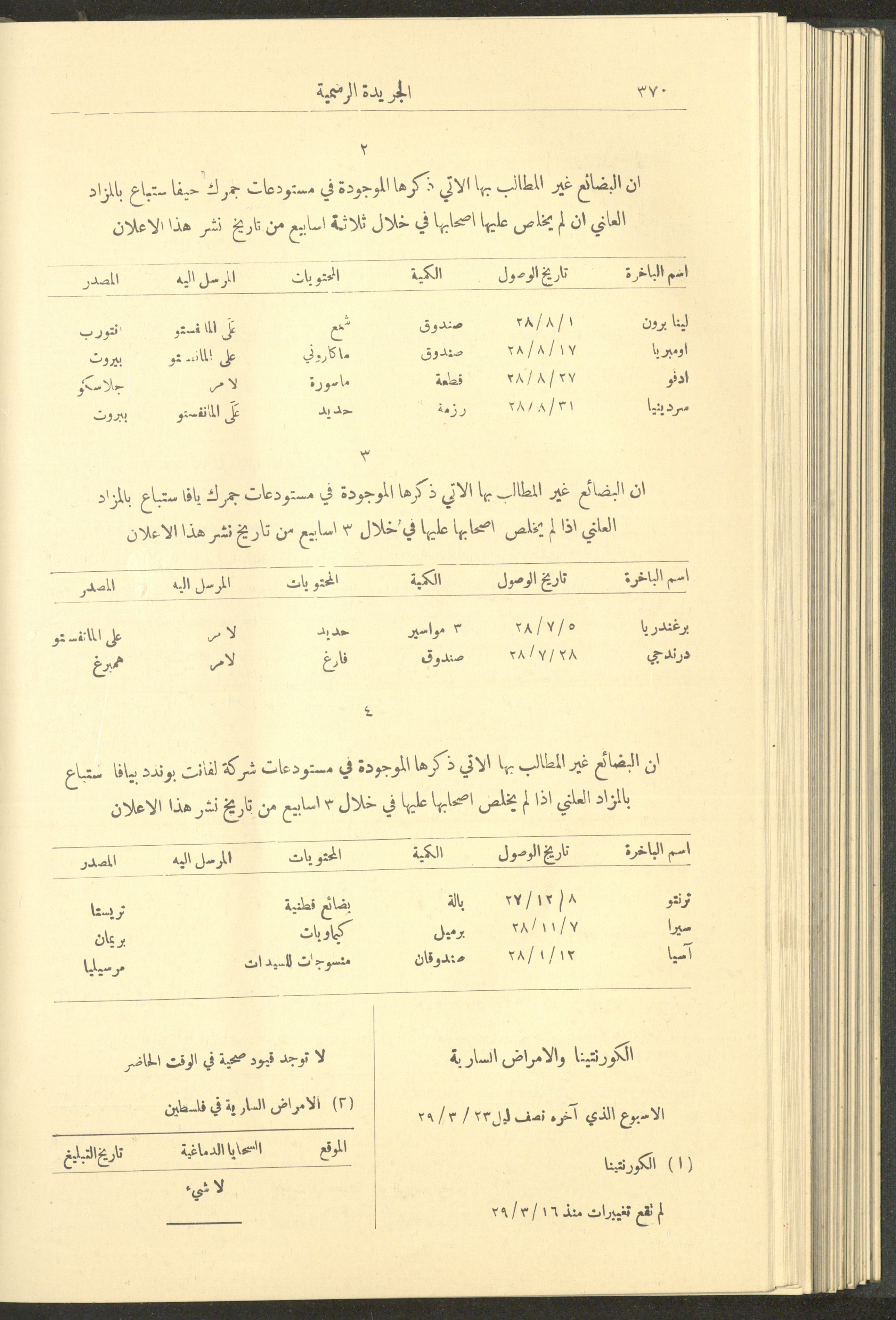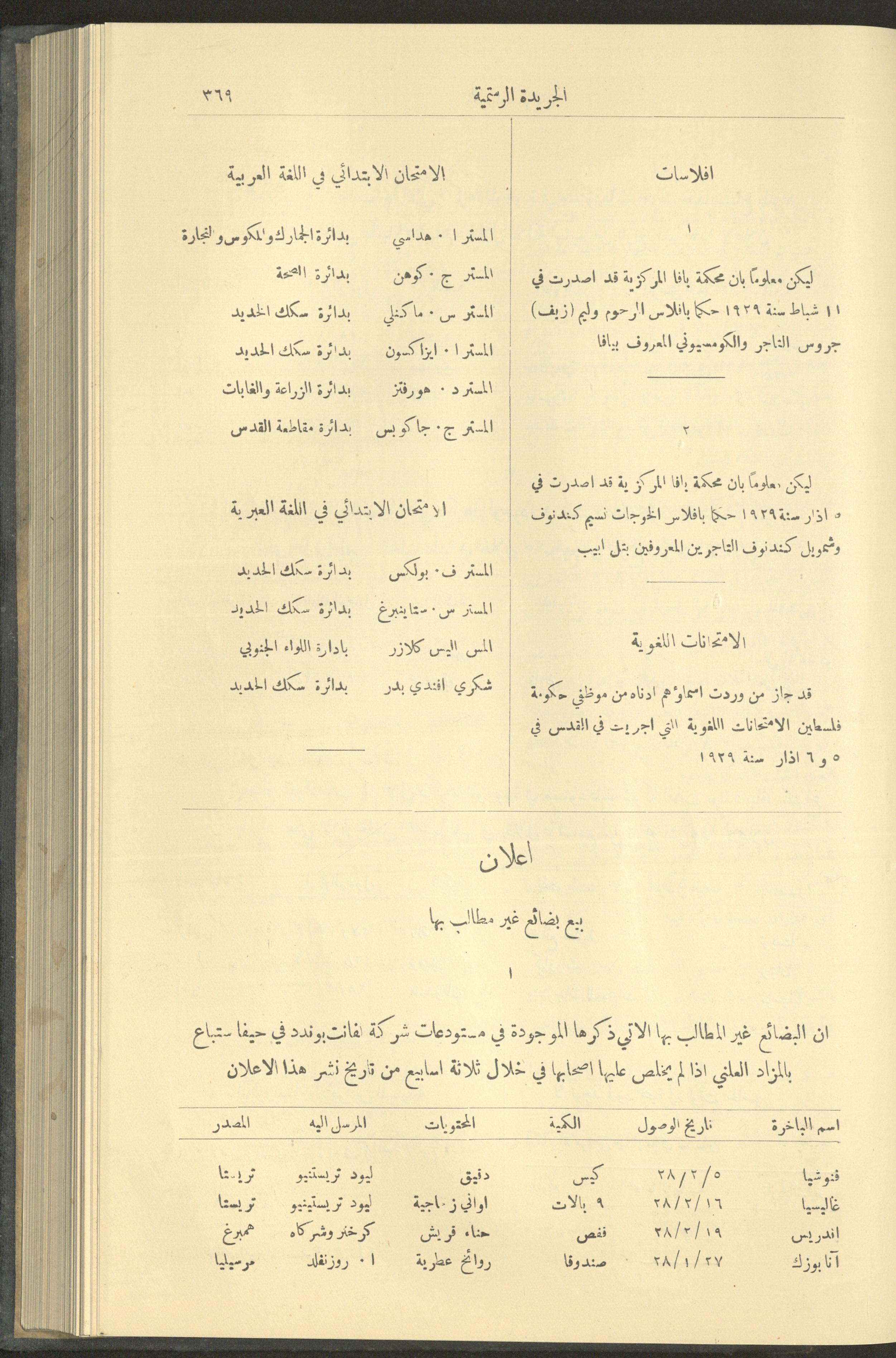 Issued on 1 April 1929, this document shows issue no. 226 of the Official Palestine Newspaper featuring official government announcements including initiating land settlement in some villages, applying the crafts and industries system in the northern district, registering companies, land mail to and from Iraq, bankruptcy and lists of the movement of immigrants to Palestine and the displaced from it, in addition to official government announcements regarding laws and legislation and amendments thereto. The issue was printed in Azriel Press in Jerusalem, where the price of the copy was fifty mils and was published twice a month. Said official government announcements and amendments include: Road Transport Bill for the year 1929-1930. The Midwifery Bill of 1929. Implementation of Law No. 13 of 1929 on Violating the Freedom of Courts. Appointment of an investigator for suspected deaths. Orders under the Land Settlement Act. Appointment of the Freedom of Opinion Committee. Re-formation of the Palestinian Museum Committee. Appointment of consuls. Certificate under the Land Expropriation Act. A system under the Ports Act 1926. A system regarding the exemption of boats from the Cortina fees. A system under police law. A system under the Trademarks Act. A system under the Town Planning Act of 1921. Bylaws of due process under the law of succession. Announcement regarding visa for English and German nationals. An agreement with Transjordan regarding hearing the testimony by proxy. A statement under the order issued by the King's Council regarding air navigation.