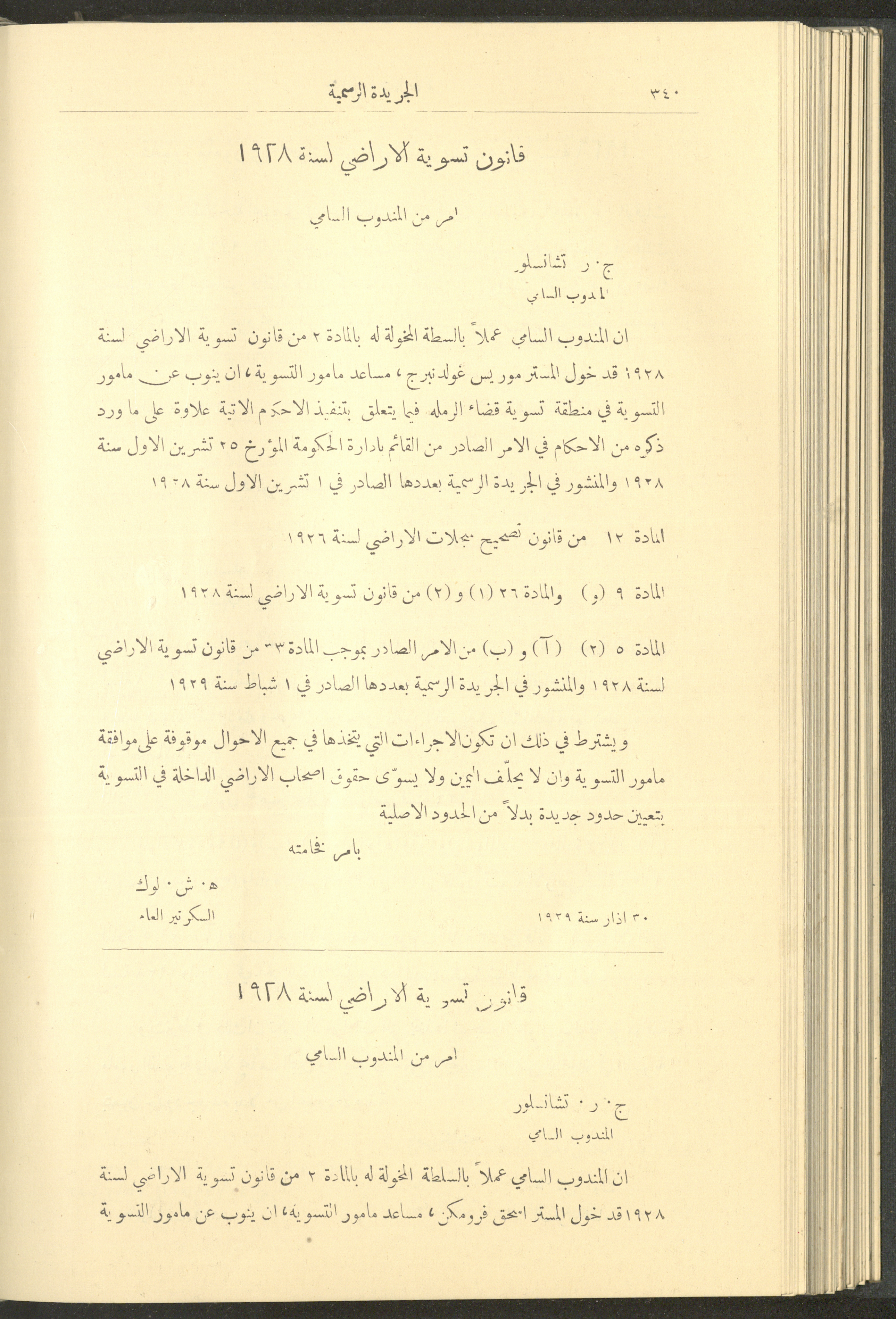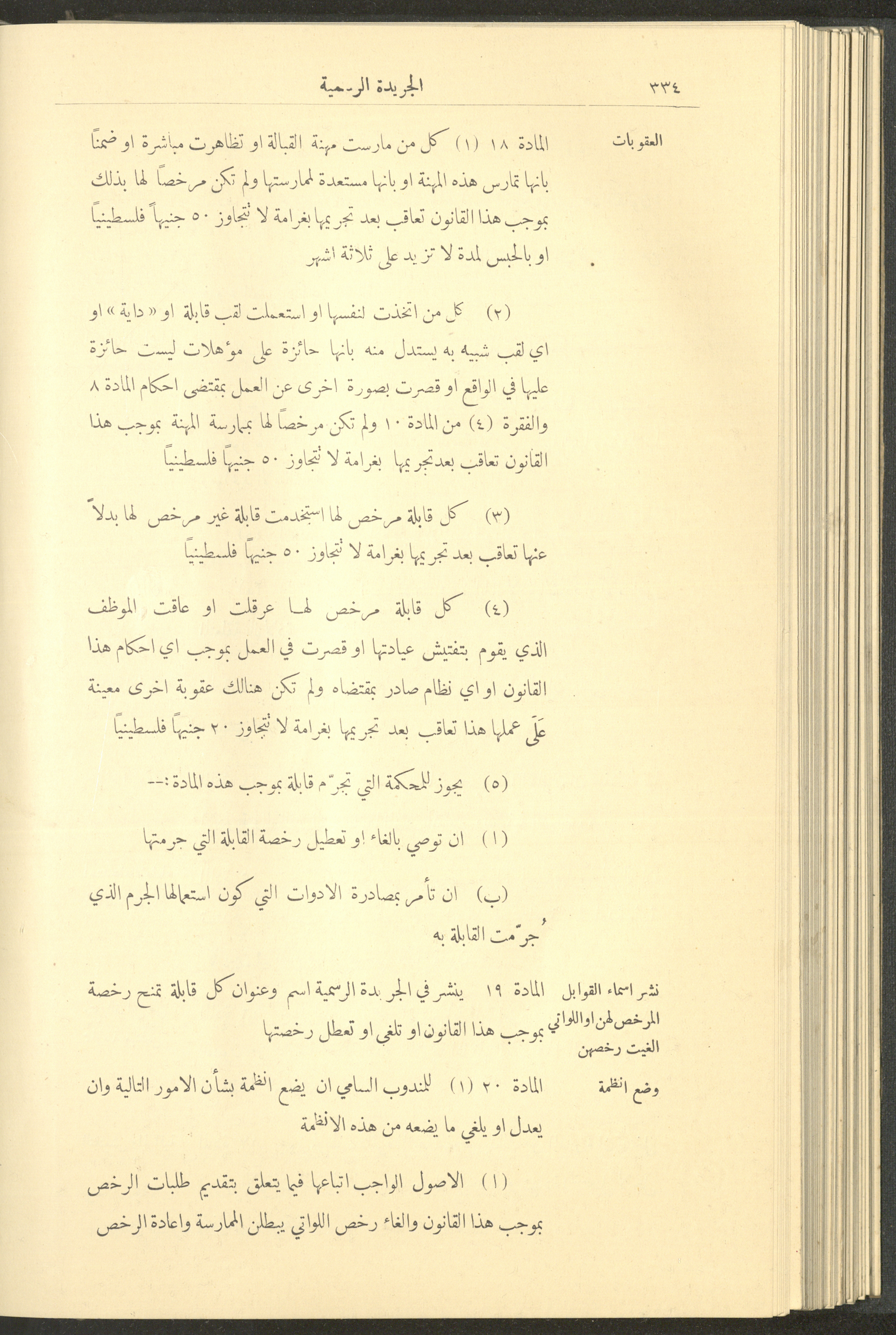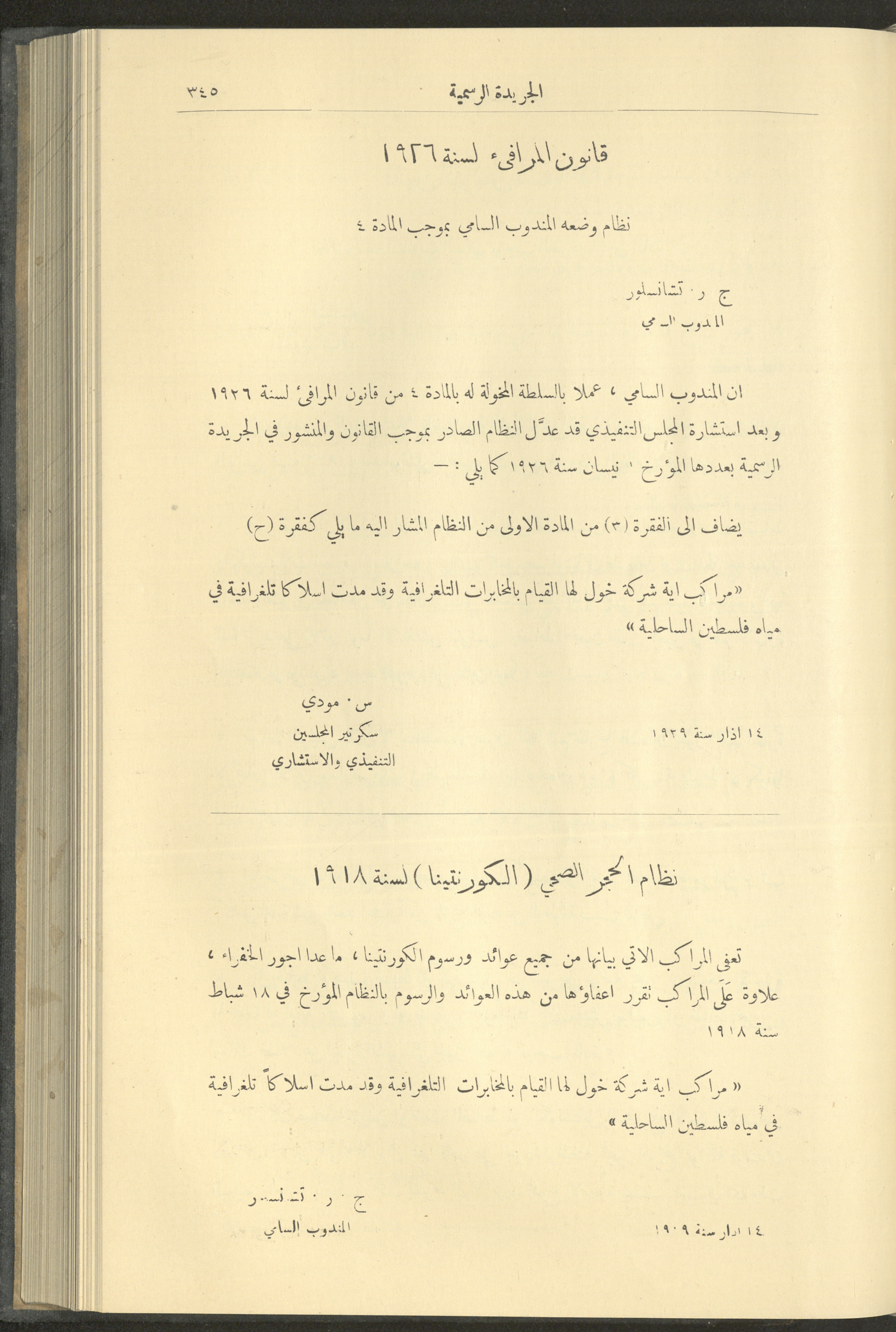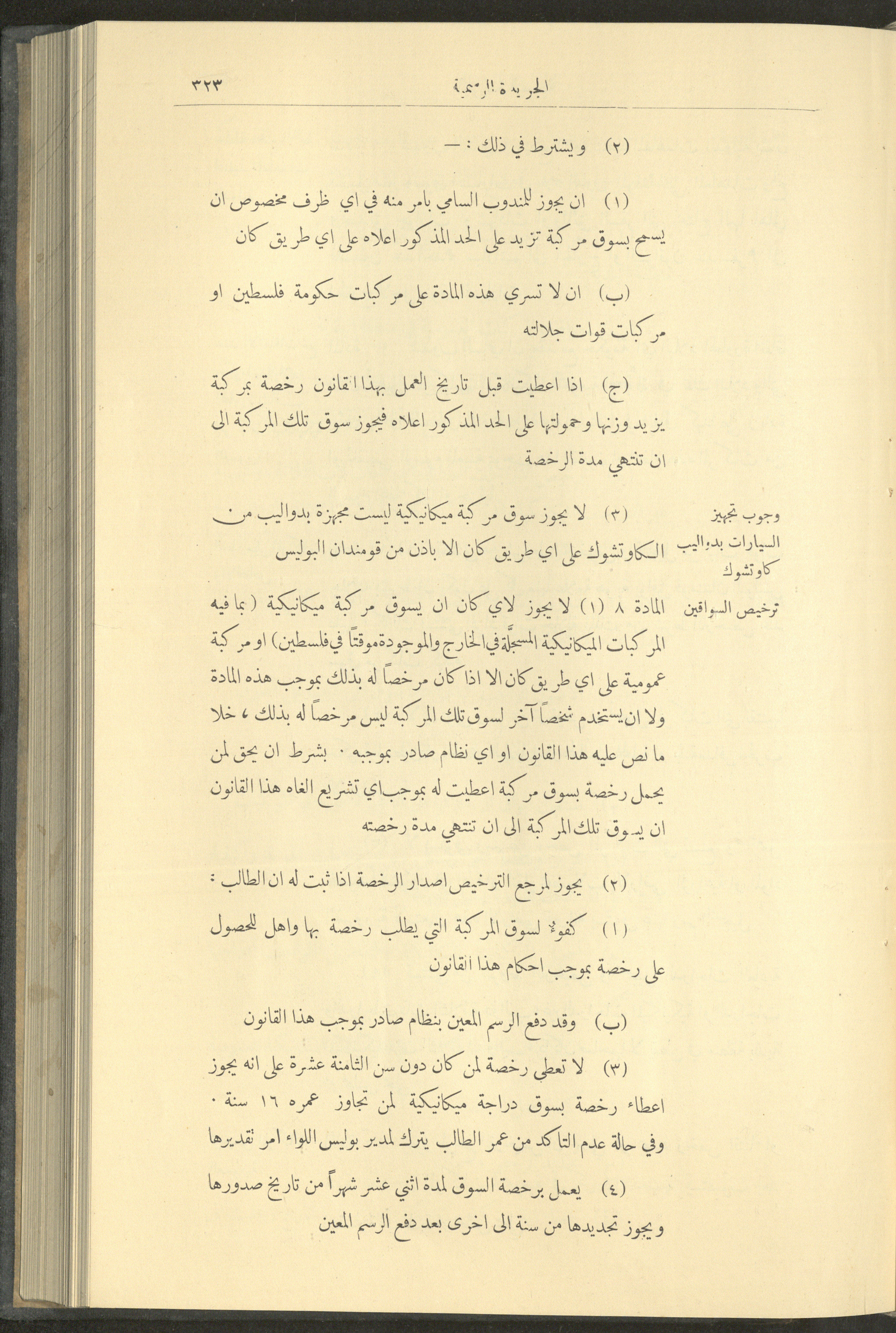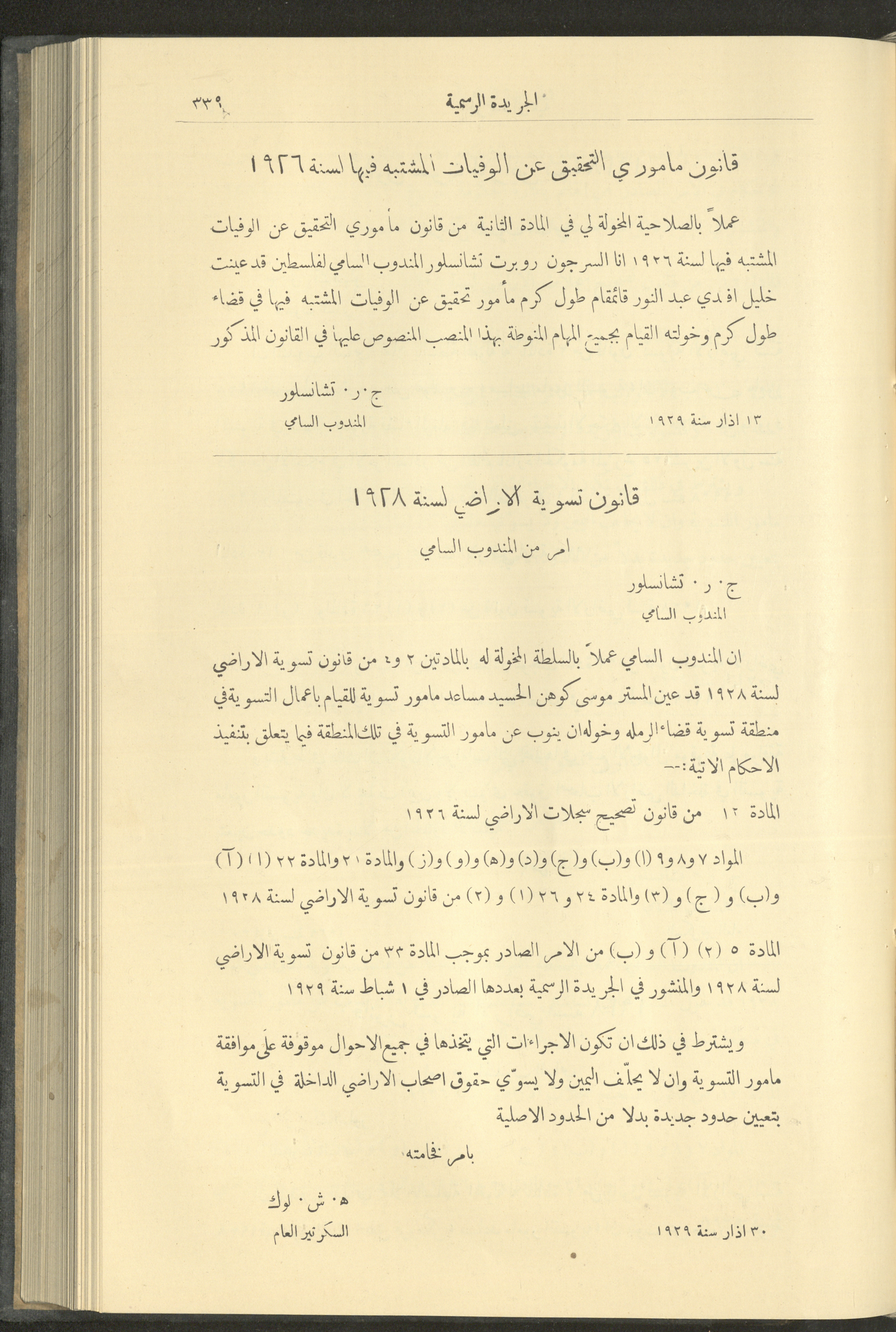 Issued on 1 April 1929, this document shows issue no. 226 of the Official Palestine Newspaper featuring official government announcements including initiating land settlement in some villages, applying the crafts and industries system in the northern district, registering companies, land mail to and from Iraq, bankruptcy and lists of the movement of immigrants to Palestine and the displaced from it, in addition to official government announcements regarding laws and legislation and amendments thereto. The issue was printed in Azriel Press in Jerusalem, where the price of the copy was fifty mils and was published twice a month. Said official government announcements and amendments include: Road Transport Bill for the year 1929-1930. The Midwifery Bill of 1929. Implementation of Law No. 13 of 1929 on Violating the Freedom of Courts. Appointment of an investigator for suspected deaths. Orders under the Land Settlement Act. Appointment of the Freedom of Opinion Committee. Re-formation of the Palestinian Museum Committee. Appointment of consuls. Certificate under the Land Expropriation Act. A system under the Ports Act 1926. A system regarding the exemption of boats from the Cortina fees. A system under police law. A system under the Trademarks Act. A system under the Town Planning Act of 1921. Bylaws of due process under the law of succession. Announcement regarding visa for English and German nationals. An agreement with Transjordan regarding hearing the testimony by proxy. A statement under the order issued by the King's Council regarding air navigation.