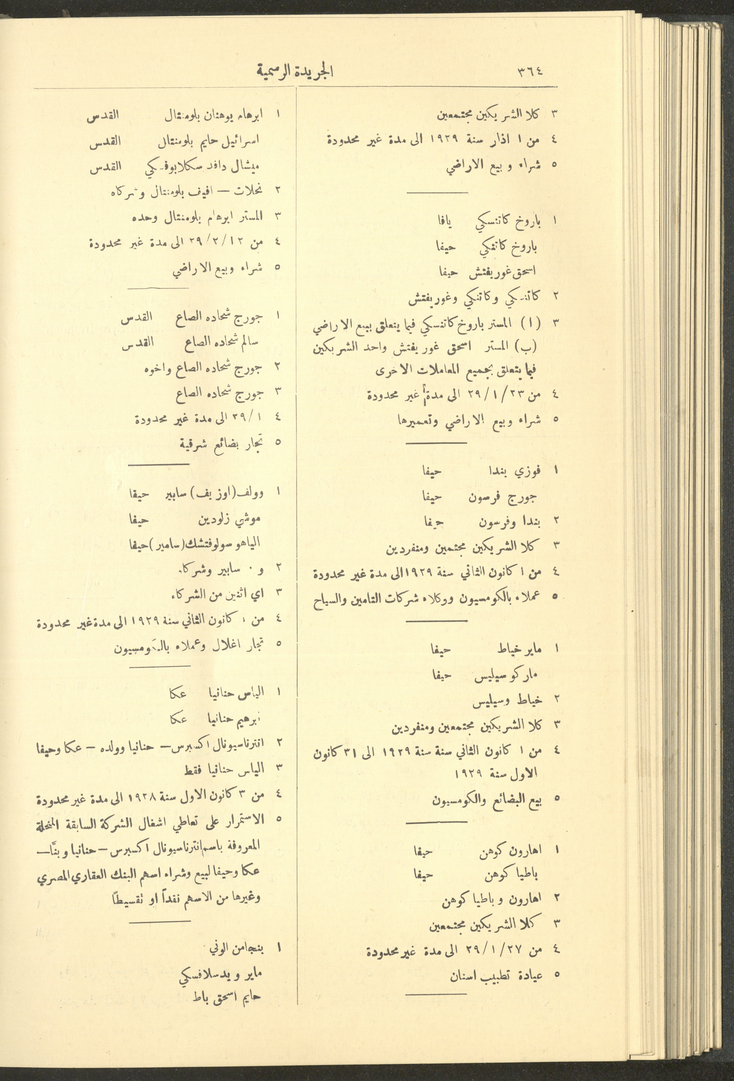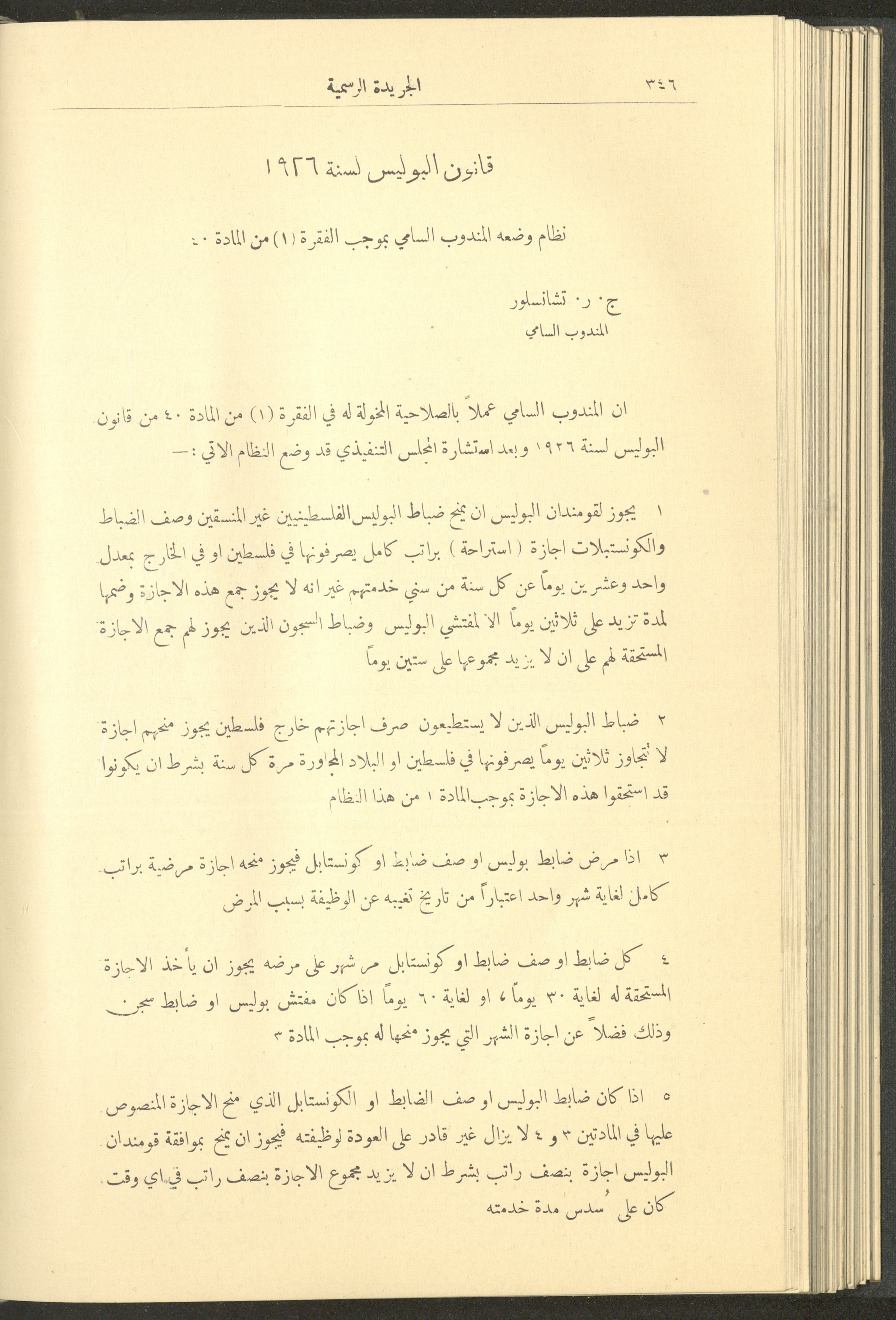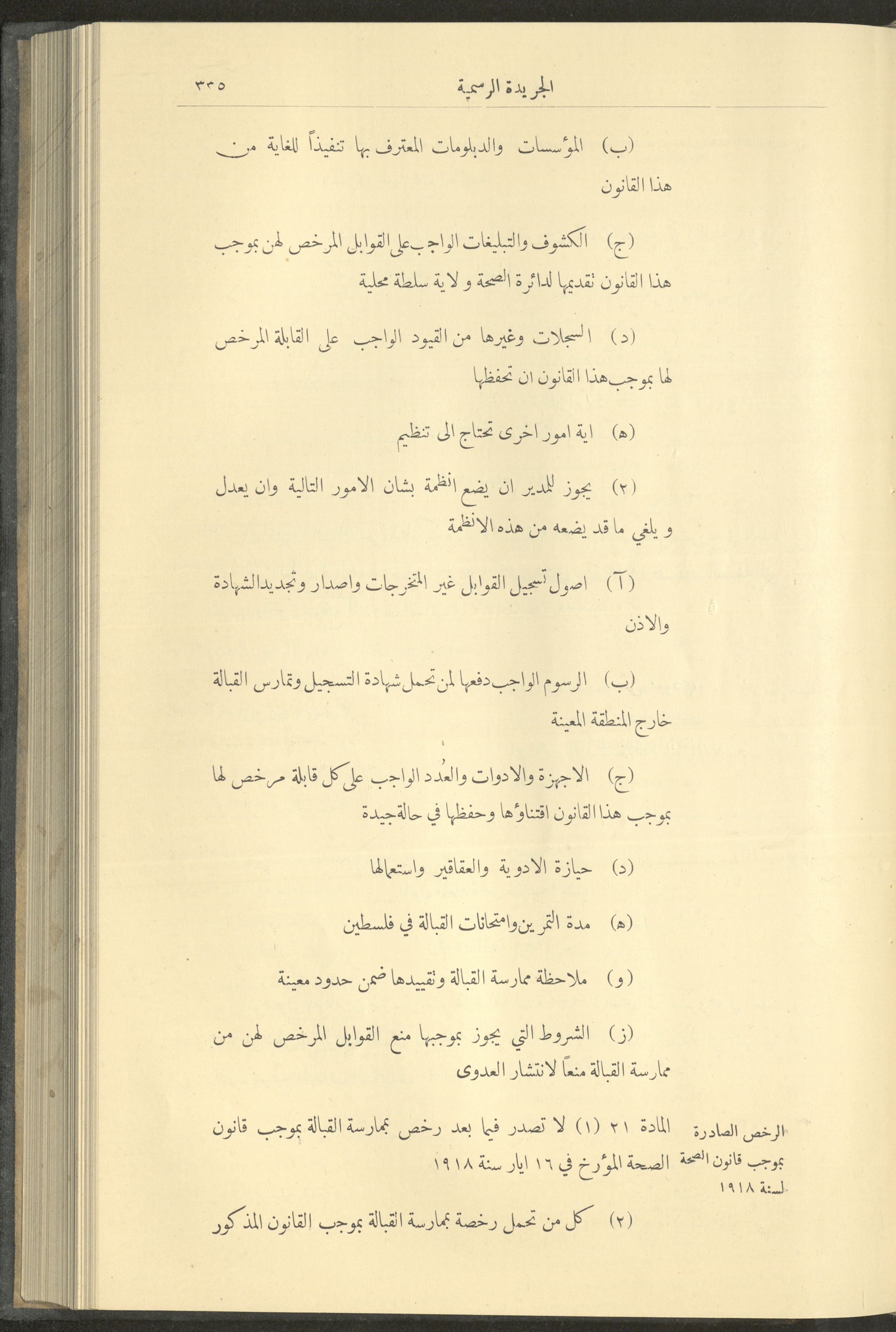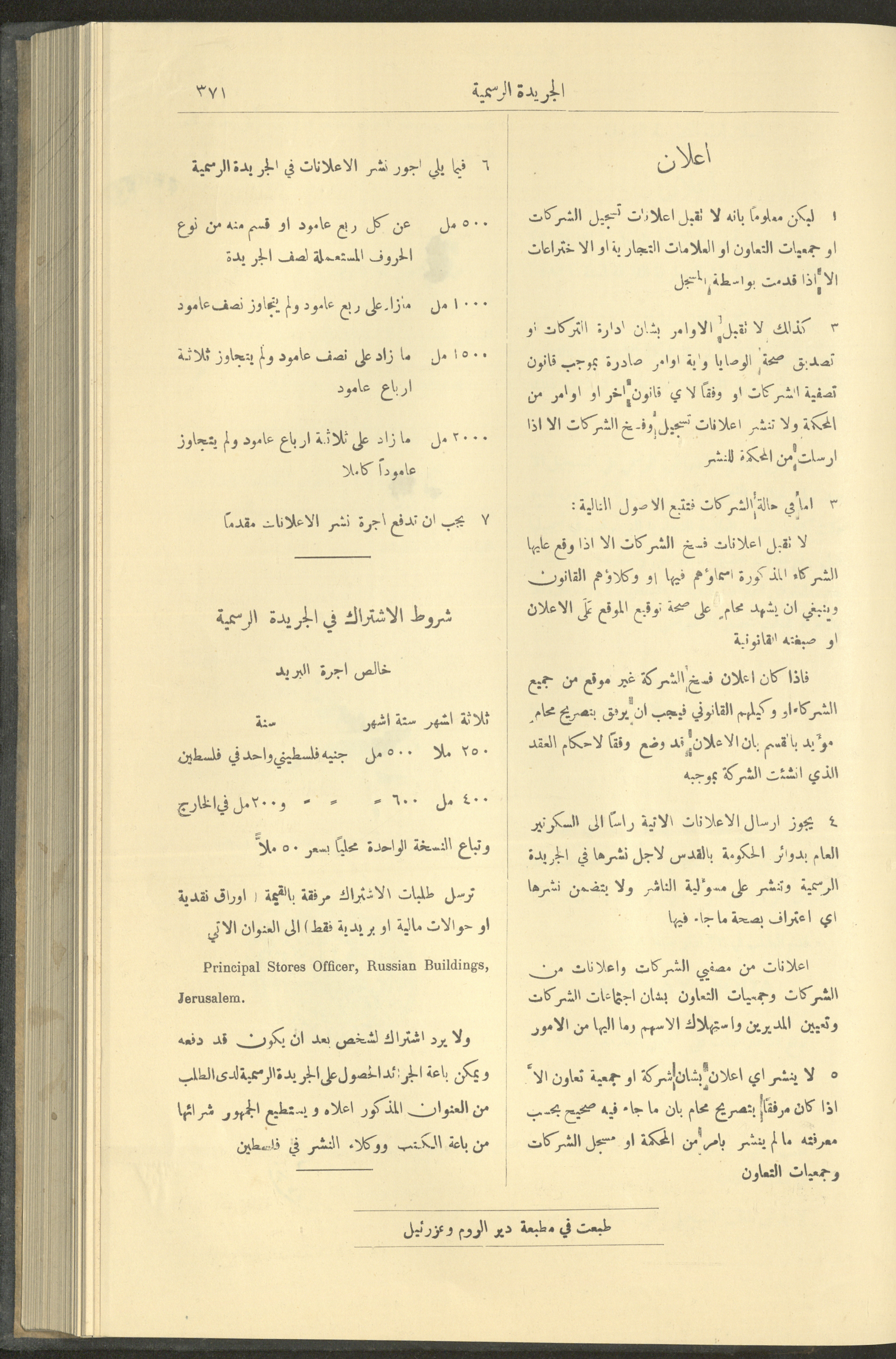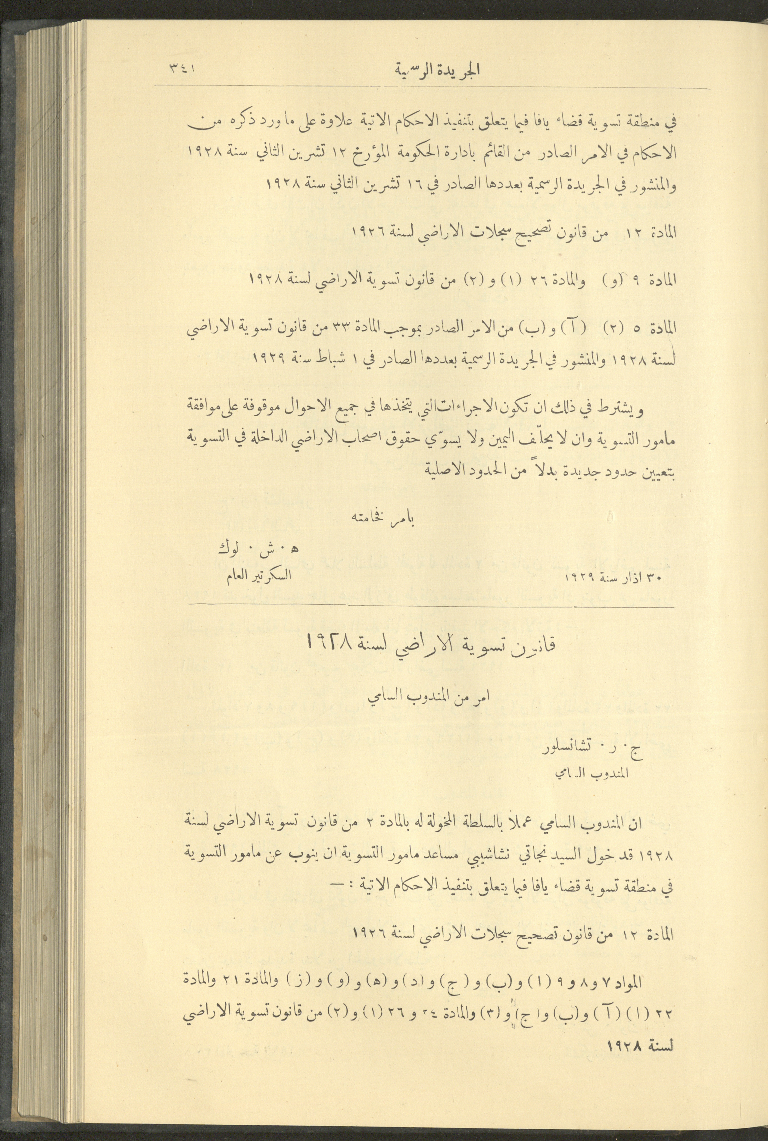 Issued on 1 April 1929, this document shows issue no. 226 of the Official Palestine Newspaper featuring official government announcements including initiating land settlement in some villages, applying the crafts and industries system in the northern district, registering companies, land mail to and from Iraq, bankruptcy and lists of the movement of immigrants to Palestine and the displaced from it, in addition to official government announcements regarding laws and legislation and amendments thereto. The issue was printed in Azriel Press in Jerusalem, where the price of the copy was fifty mils and was published twice a month. Said official government announcements and amendments include: Road Transport Bill for the year 1929-1930. The Midwifery Bill of 1929. Implementation of Law No. 13 of 1929 on Violating the Freedom of Courts. Appointment of an investigator for suspected deaths. Orders under the Land Settlement Act. Appointment of the Freedom of Opinion Committee. Re-formation of the Palestinian Museum Committee. Appointment of consuls. Certificate under the Land Expropriation Act. A system under the Ports Act 1926. A system regarding the exemption of boats from the Cortina fees. A system under police law. A system under the Trademarks Act. A system under the Town Planning Act of 1921. Bylaws of due process under the law of succession. Announcement regarding visa for English and German nationals. An agreement with Transjordan regarding hearing the testimony by proxy. A statement under the order issued by the King's Council regarding air navigation.