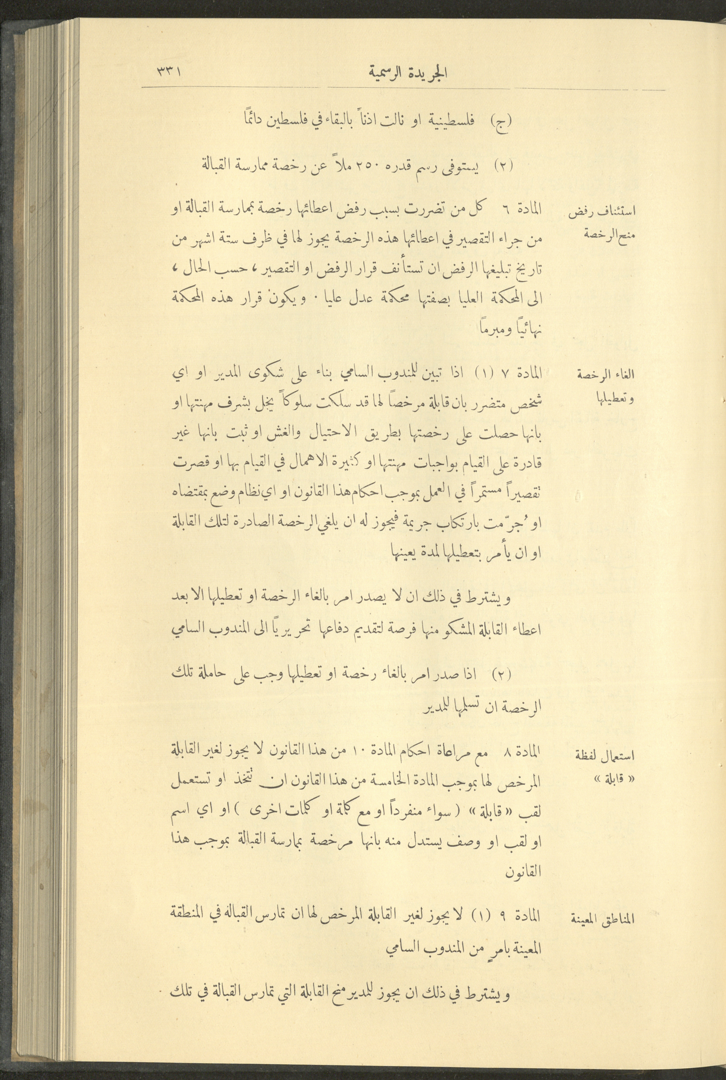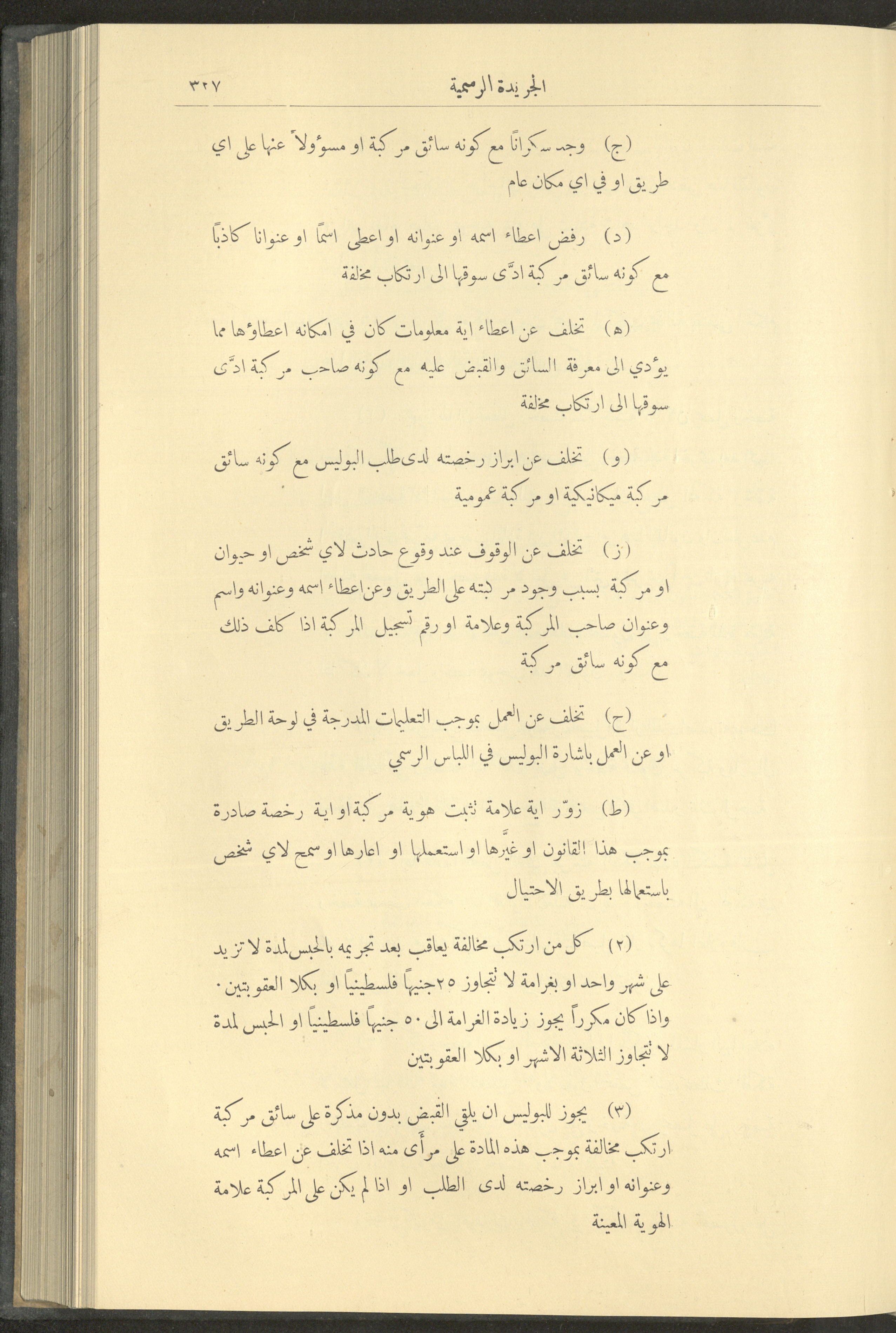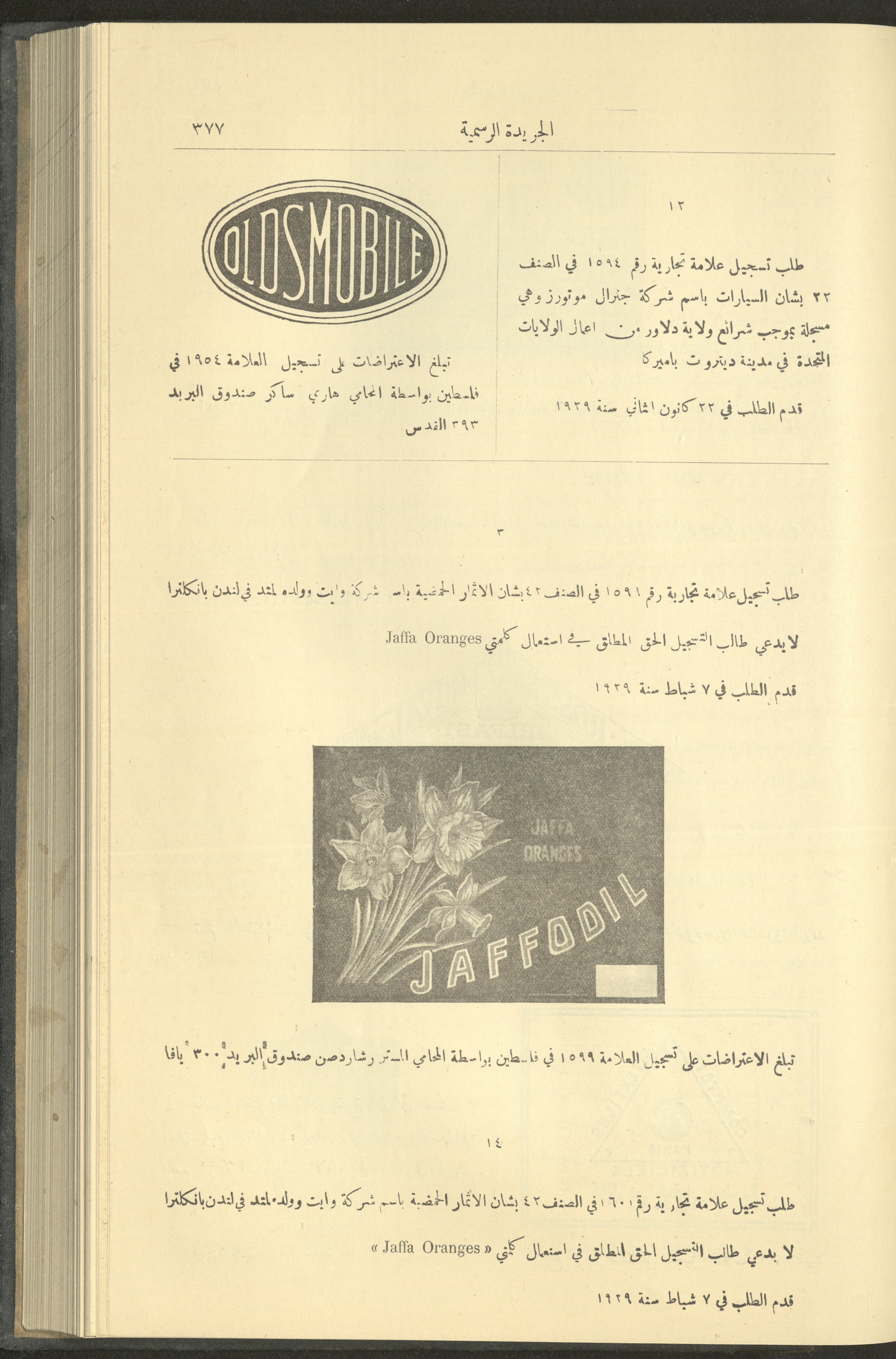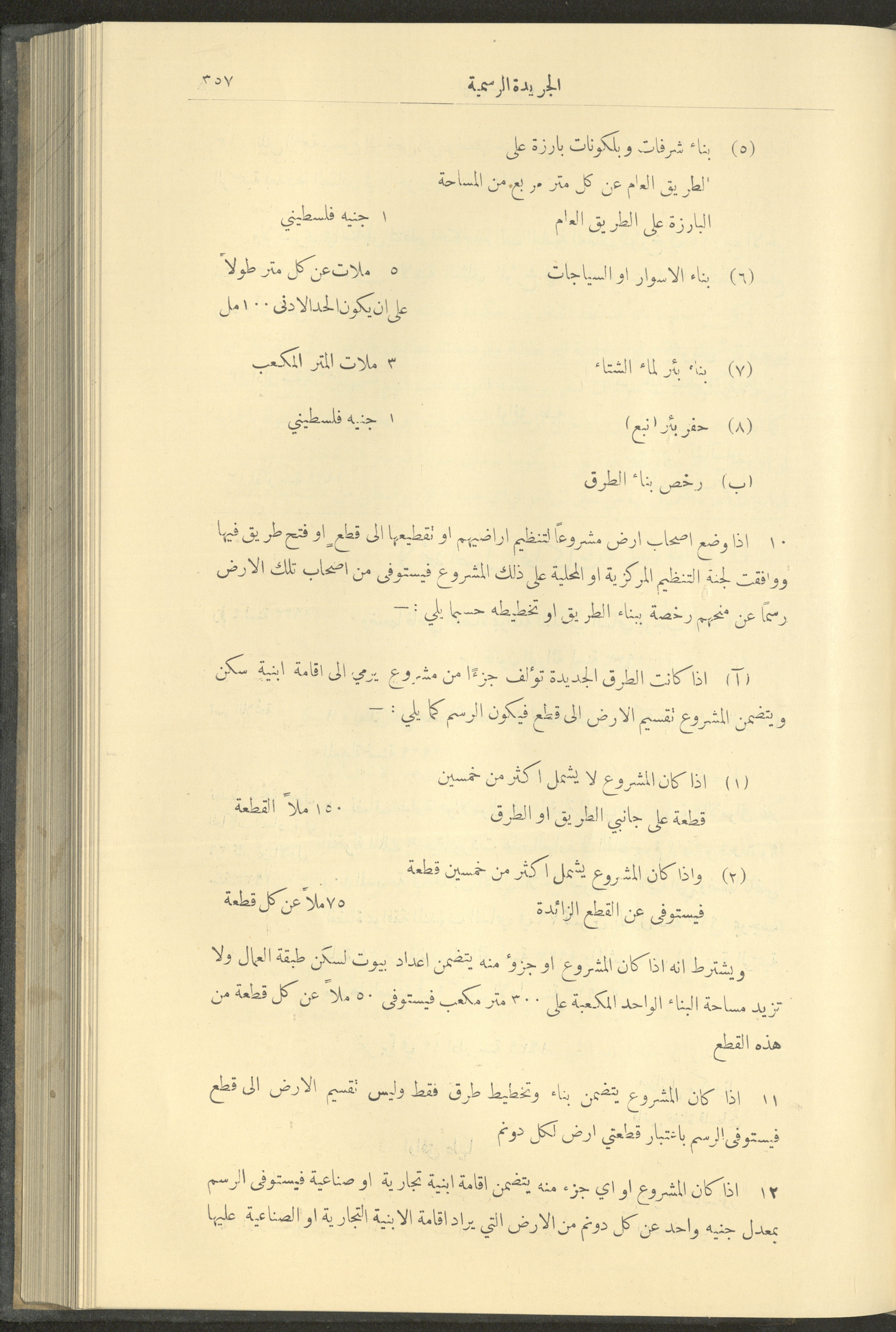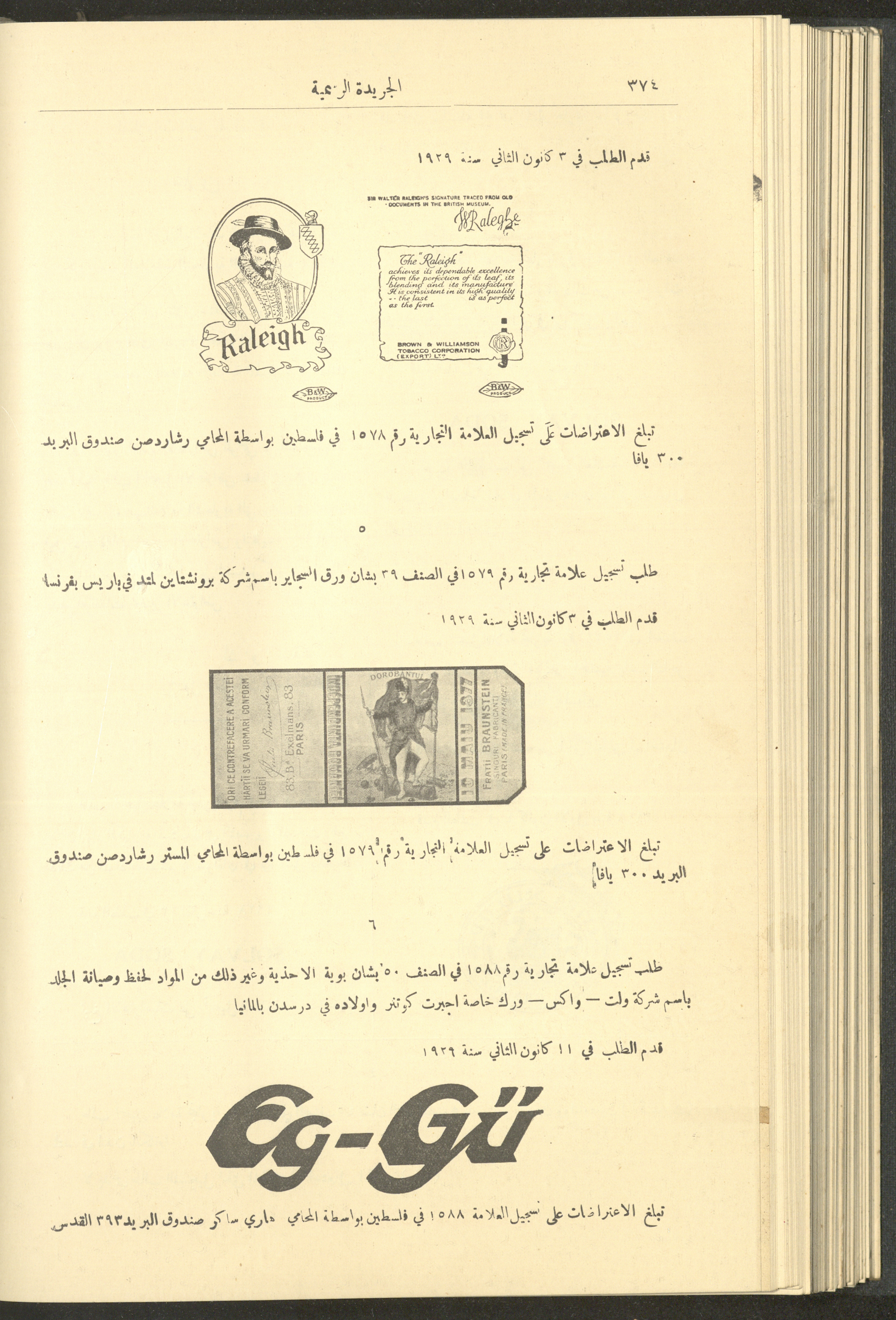 Issued on 1 April 1929, this document shows issue no. 226 of the Official Palestine Newspaper featuring official government announcements including initiating land settlement in some villages, applying the crafts and industries system in the northern district, registering companies, land mail to and from Iraq, bankruptcy and lists of the movement of immigrants to Palestine and the displaced from it, in addition to official government announcements regarding laws and legislation and amendments thereto. The issue was printed in Azriel Press in Jerusalem, where the price of the copy was fifty mils and was published twice a month. Said official government announcements and amendments include: Road Transport Bill for the year 1929-1930. The Midwifery Bill of 1929. Implementation of Law No. 13 of 1929 on Violating the Freedom of Courts. Appointment of an investigator for suspected deaths. Orders under the Land Settlement Act. Appointment of the Freedom of Opinion Committee. Re-formation of the Palestinian Museum Committee. Appointment of consuls. Certificate under the Land Expropriation Act. A system under the Ports Act 1926. A system regarding the exemption of boats from the Cortina fees. A system under police law. A system under the Trademarks Act. A system under the Town Planning Act of 1921. Bylaws of due process under the law of succession. Announcement regarding visa for English and German nationals. An agreement with Transjordan regarding hearing the testimony by proxy. A statement under the order issued by the King's Council regarding air navigation.