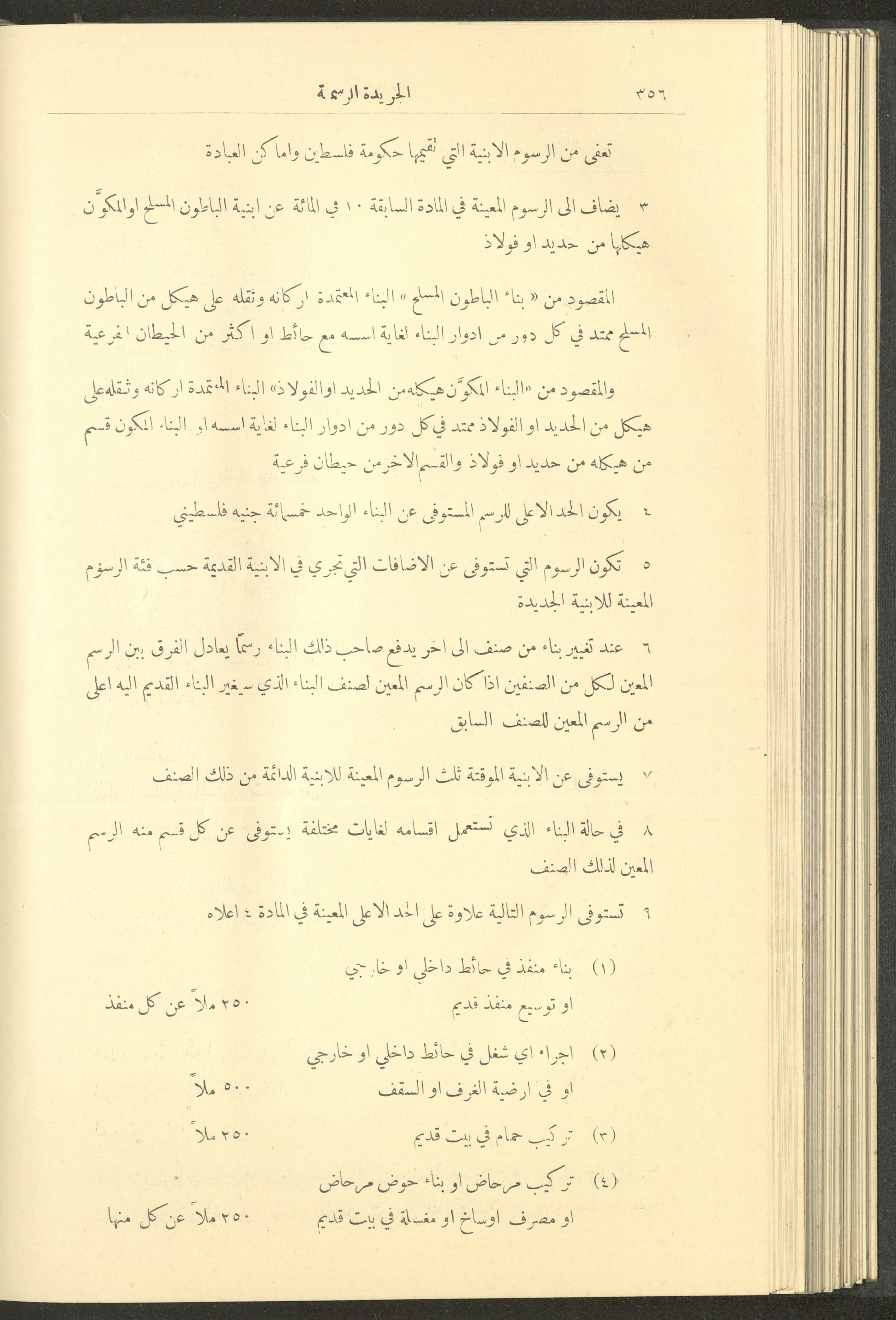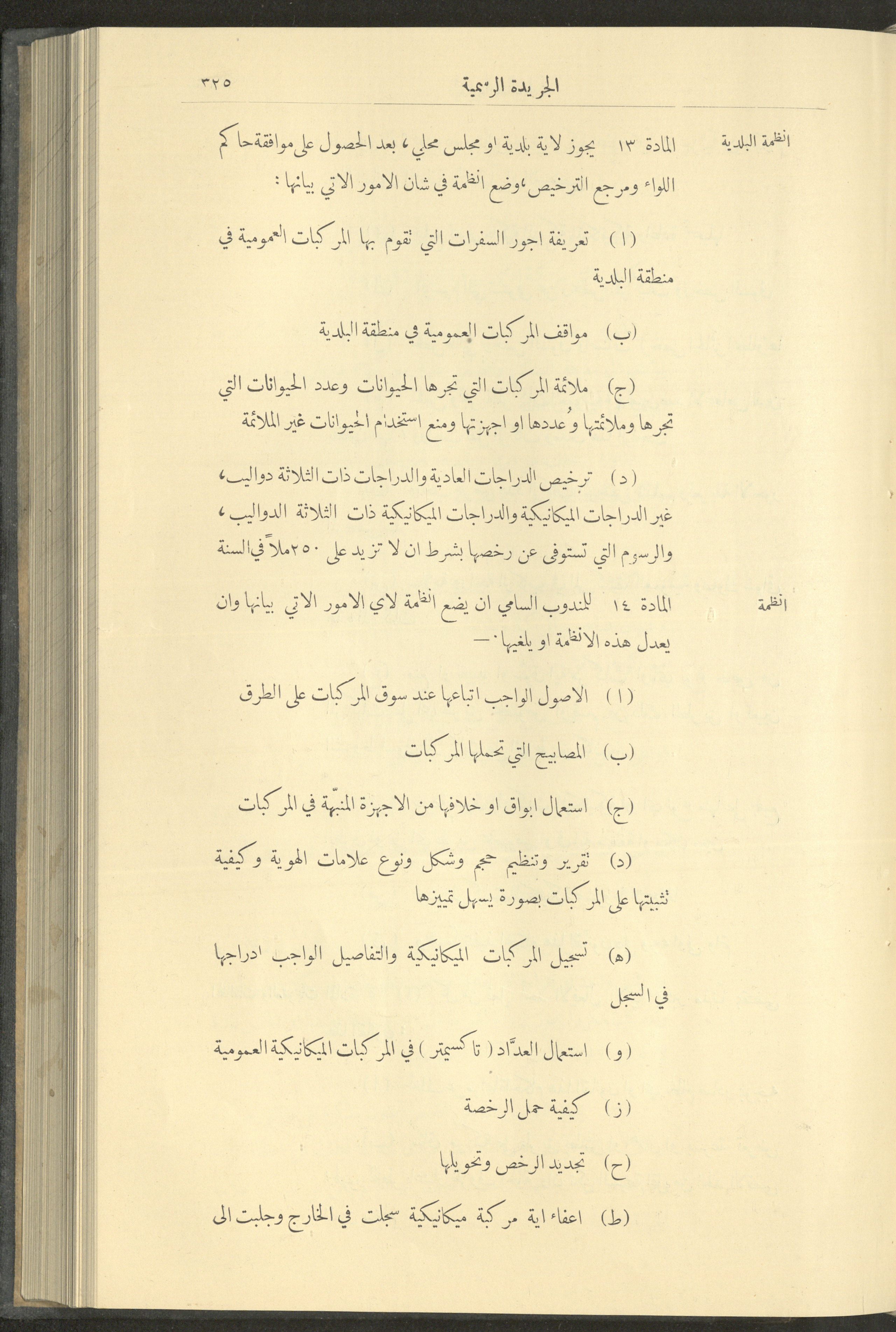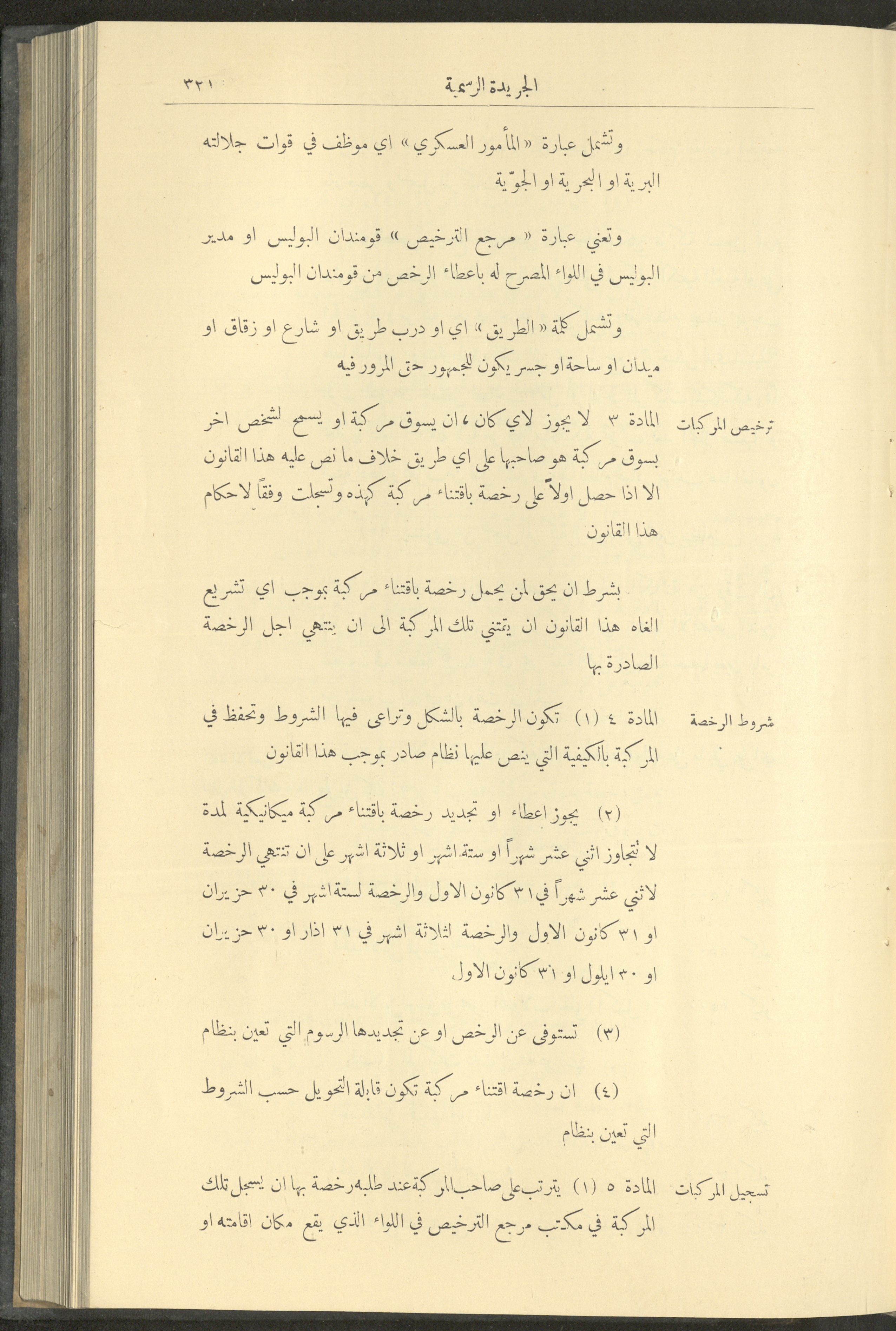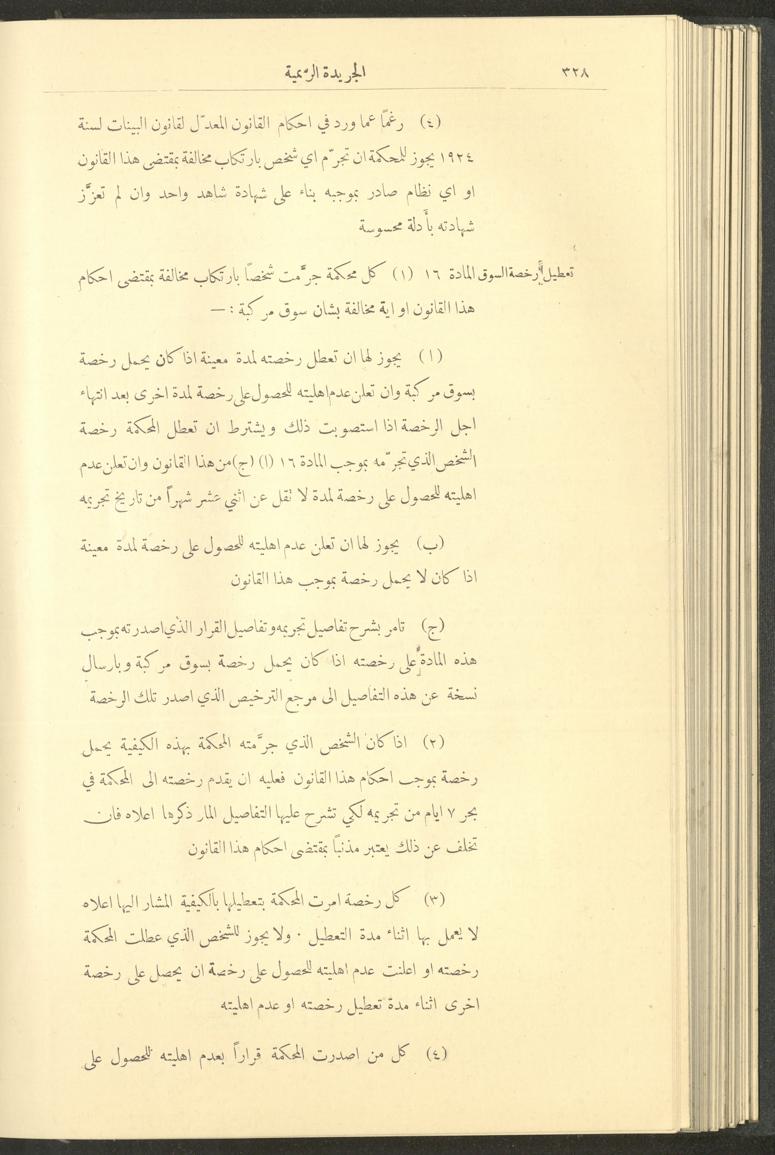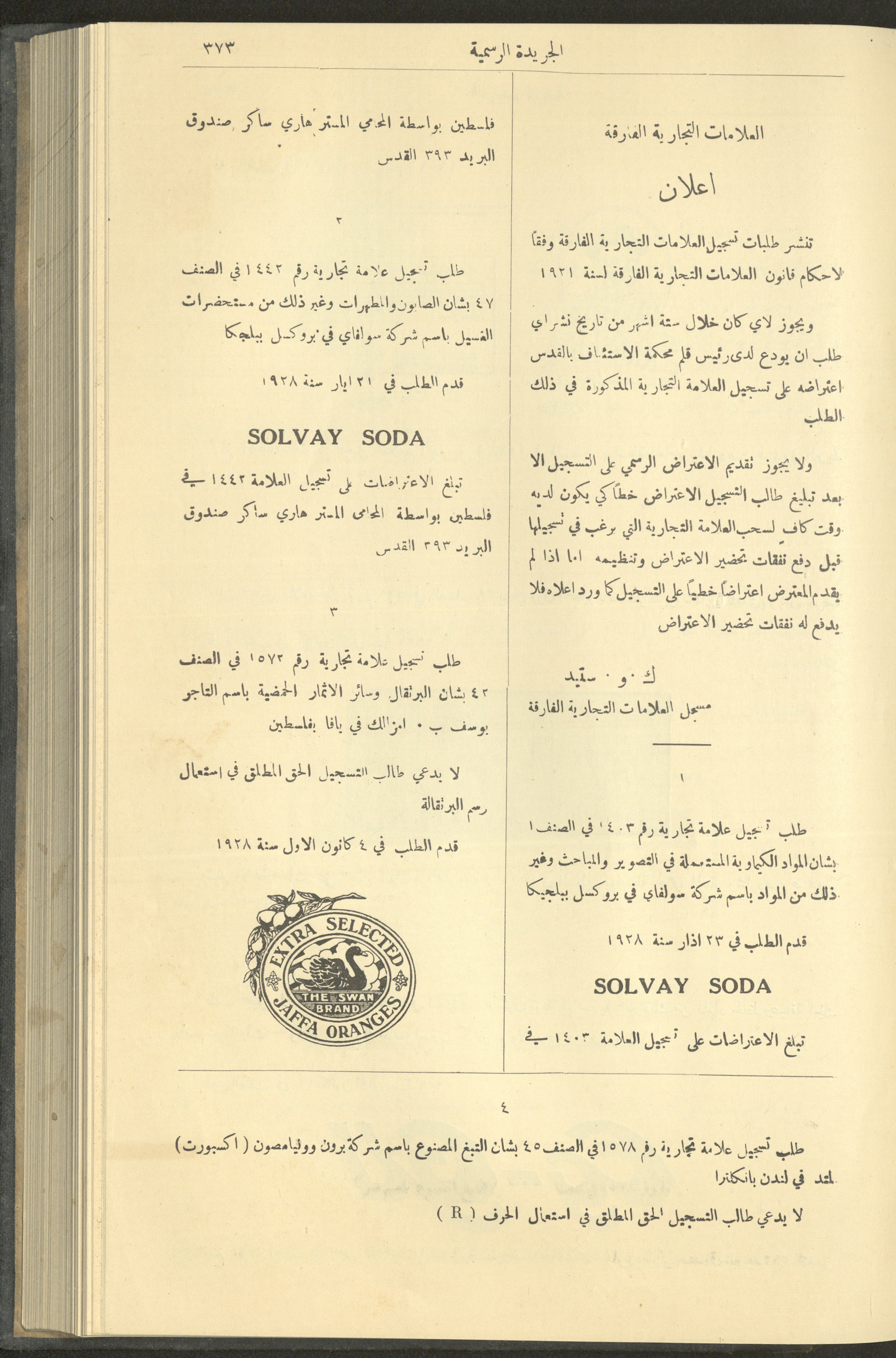 Issued on 1 April 1929, this document shows issue no. 226 of the Official Palestine Newspaper featuring official government announcements including initiating land settlement in some villages, applying the crafts and industries system in the northern district, registering companies, land mail to and from Iraq, bankruptcy and lists of the movement of immigrants to Palestine and the displaced from it, in addition to official government announcements regarding laws and legislation and amendments thereto. The issue was printed in Azriel Press in Jerusalem, where the price of the copy was fifty mils and was published twice a month. Said official government announcements and amendments include: Road Transport Bill for the year 1929-1930. The Midwifery Bill of 1929. Implementation of Law No. 13 of 1929 on Violating the Freedom of Courts. Appointment of an investigator for suspected deaths. Orders under the Land Settlement Act. Appointment of the Freedom of Opinion Committee. Re-formation of the Palestinian Museum Committee. Appointment of consuls. Certificate under the Land Expropriation Act. A system under the Ports Act 1926. A system regarding the exemption of boats from the Cortina fees. A system under police law. A system under the Trademarks Act. A system under the Town Planning Act of 1921. Bylaws of due process under the law of succession. Announcement regarding visa for English and German nationals. An agreement with Transjordan regarding hearing the testimony by proxy. A statement under the order issued by the King's Council regarding air navigation.