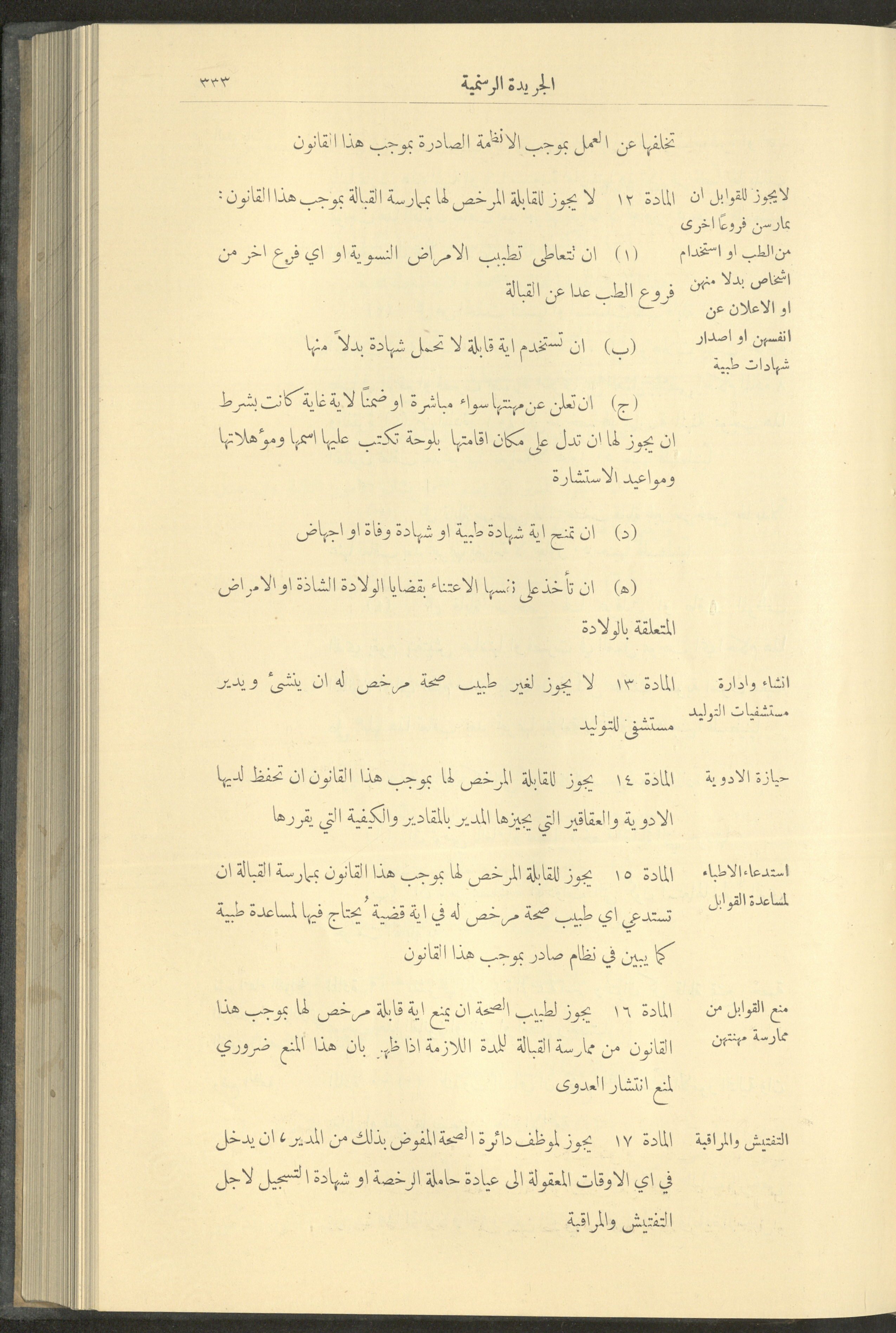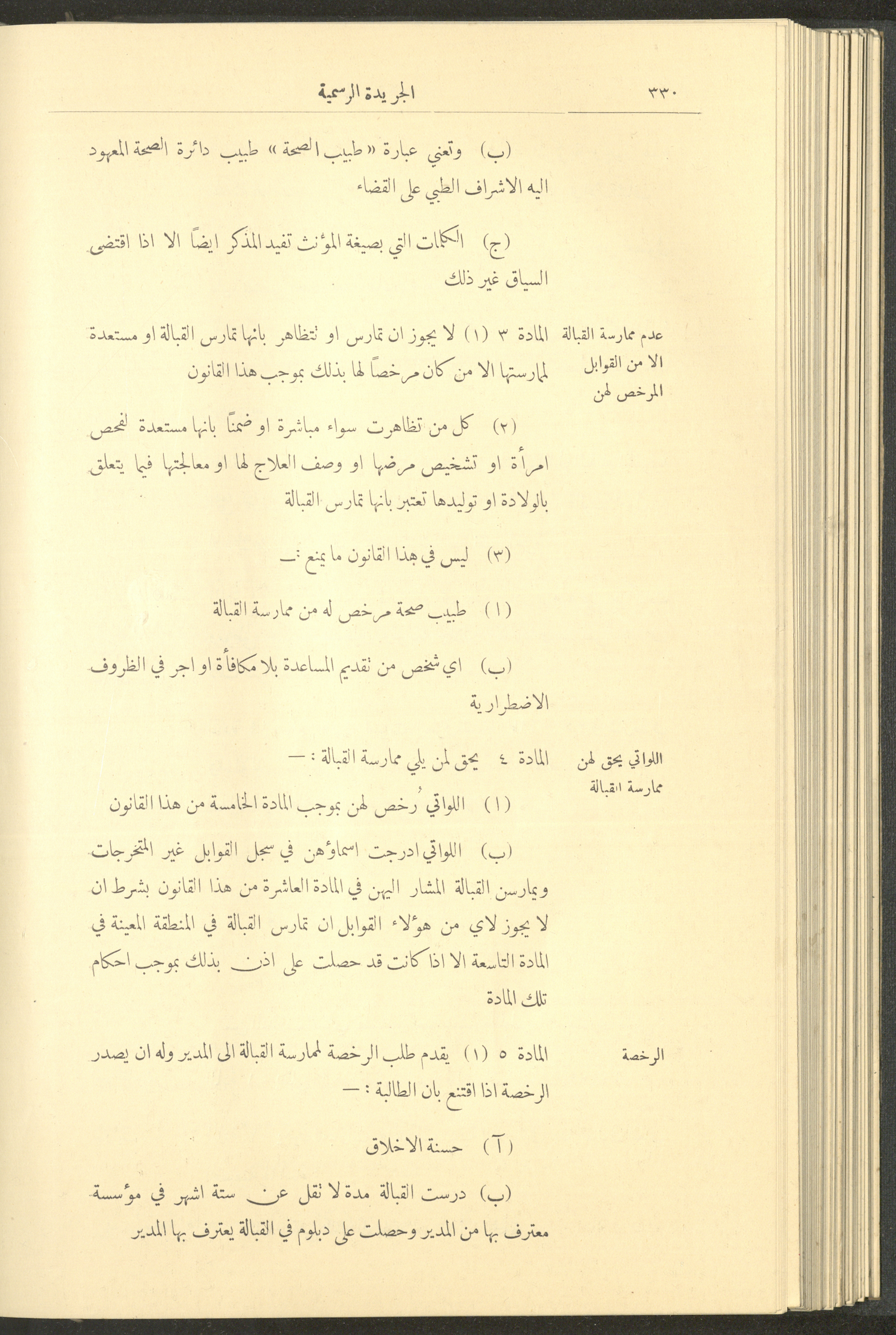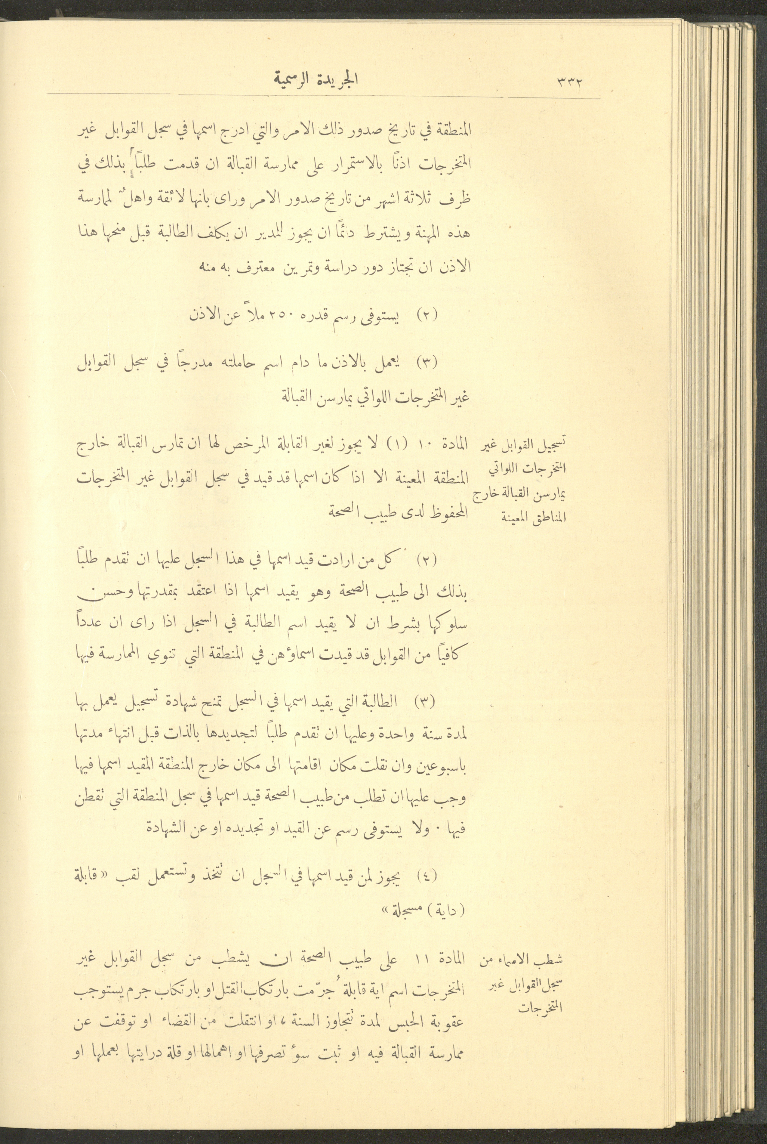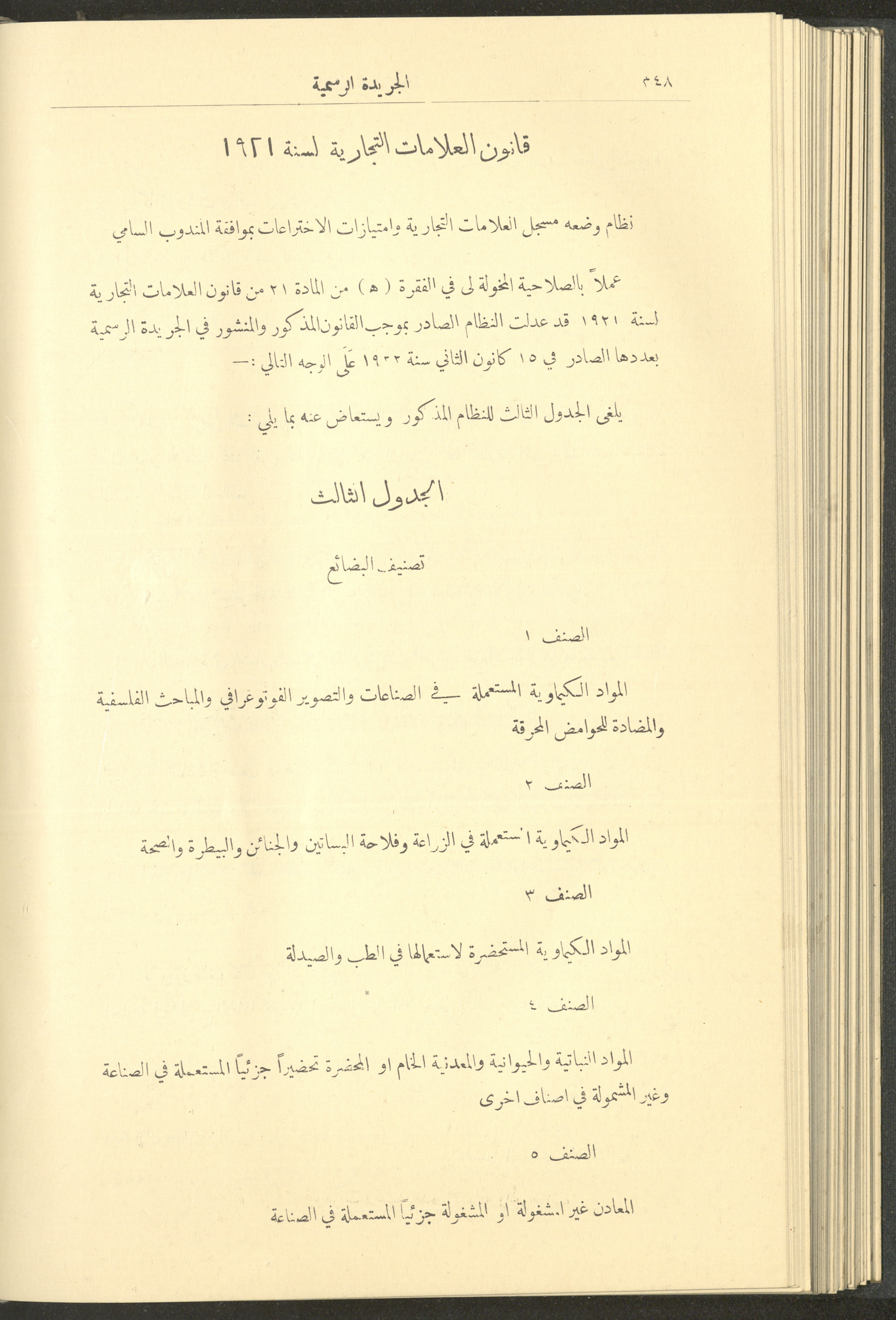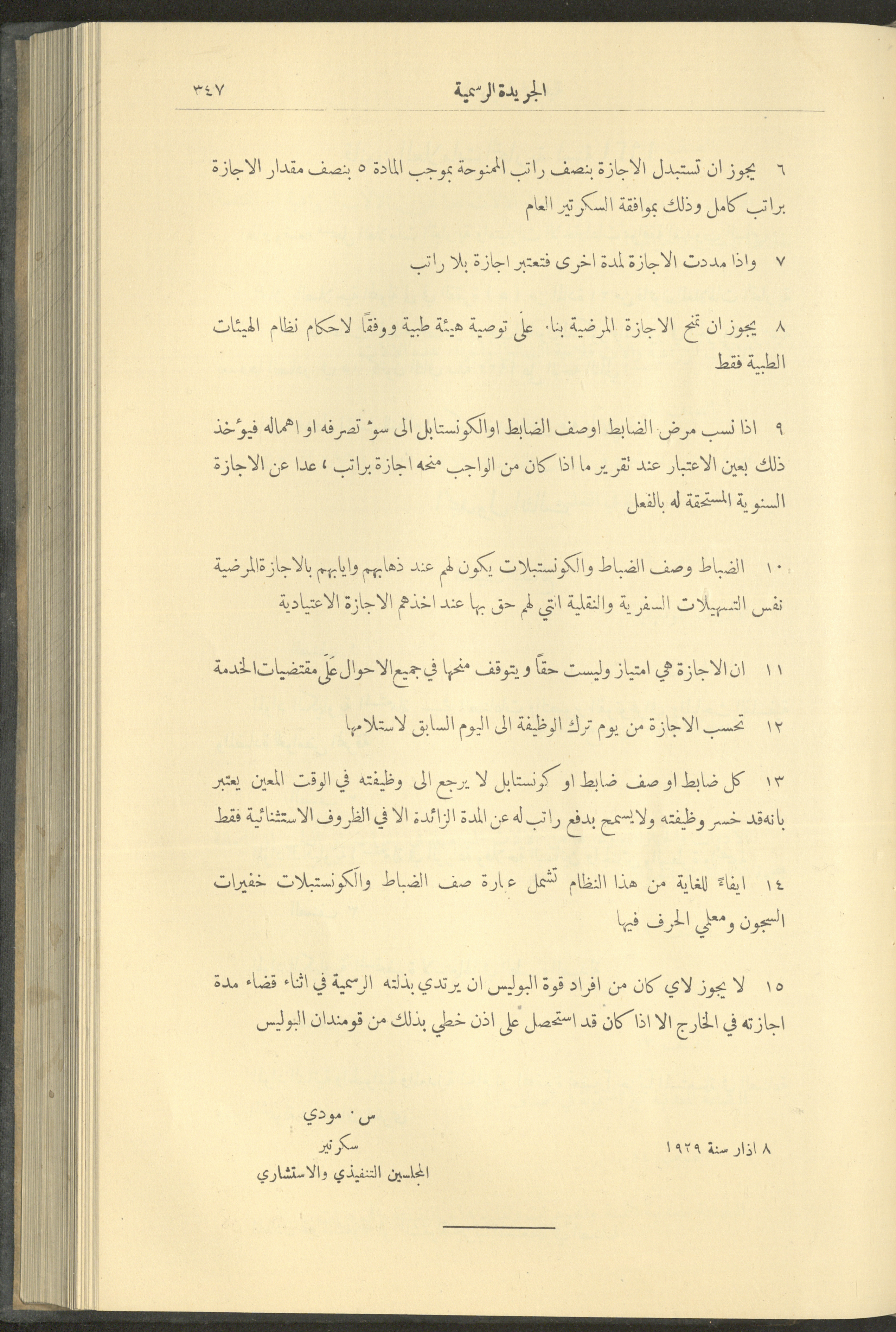 Issued on 1 April 1929, this document shows issue no. 226 of the Official Palestine Newspaper featuring official government announcements including initiating land settlement in some villages, applying the crafts and industries system in the northern district, registering companies, land mail to and from Iraq, bankruptcy and lists of the movement of immigrants to Palestine and the displaced from it, in addition to official government announcements regarding laws and legislation and amendments thereto. The issue was printed in Azriel Press in Jerusalem, where the price of the copy was fifty mils and was published twice a month. Said official government announcements and amendments include: Road Transport Bill for the year 1929-1930. The Midwifery Bill of 1929. Implementation of Law No. 13 of 1929 on Violating the Freedom of Courts. Appointment of an investigator for suspected deaths. Orders under the Land Settlement Act. Appointment of the Freedom of Opinion Committee. Re-formation of the Palestinian Museum Committee. Appointment of consuls. Certificate under the Land Expropriation Act. A system under the Ports Act 1926. A system regarding the exemption of boats from the Cortina fees. A system under police law. A system under the Trademarks Act. A system under the Town Planning Act of 1921. Bylaws of due process under the law of succession. Announcement regarding visa for English and German nationals. An agreement with Transjordan regarding hearing the testimony by proxy. A statement under the order issued by the King's Council regarding air navigation.