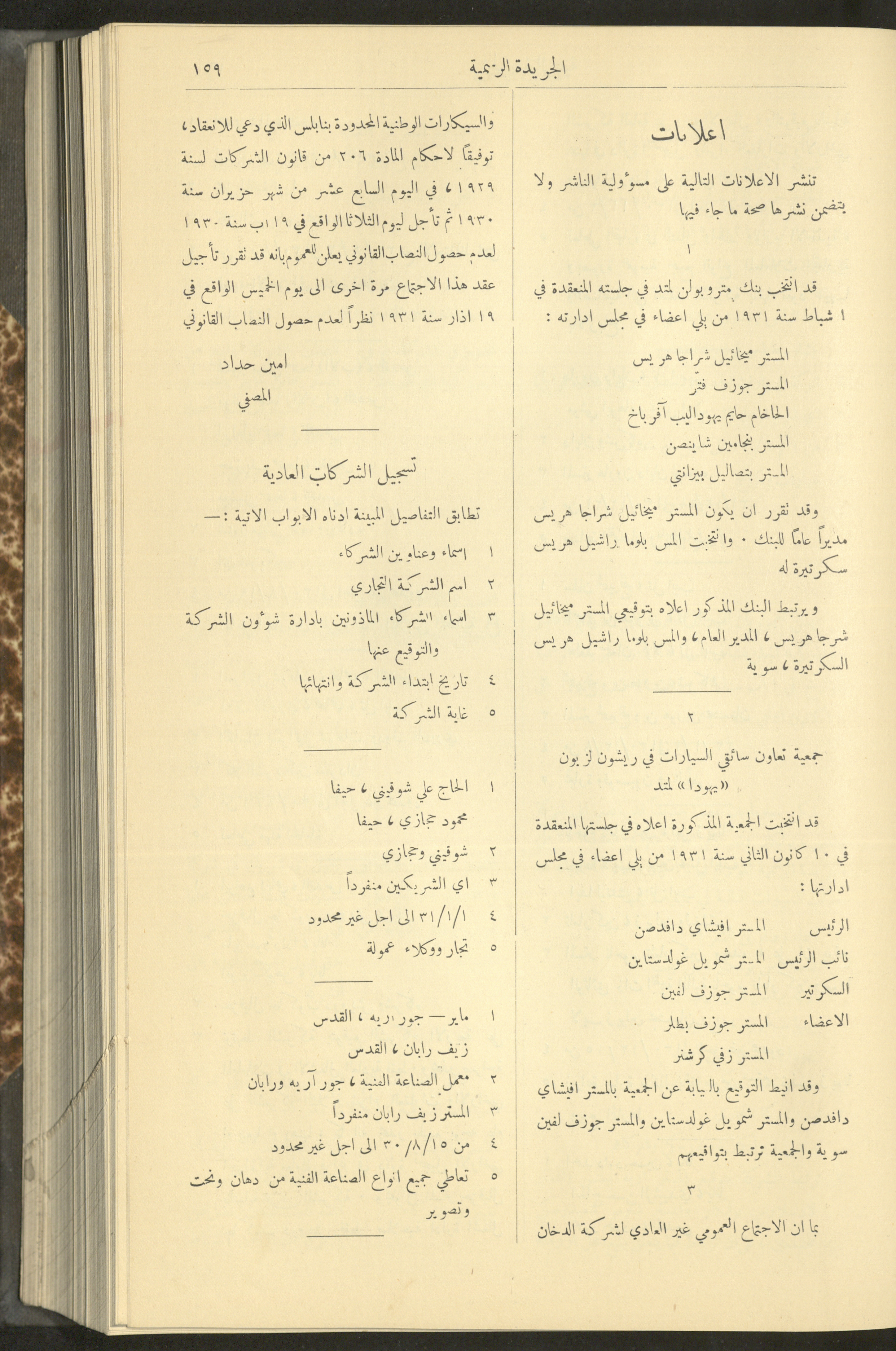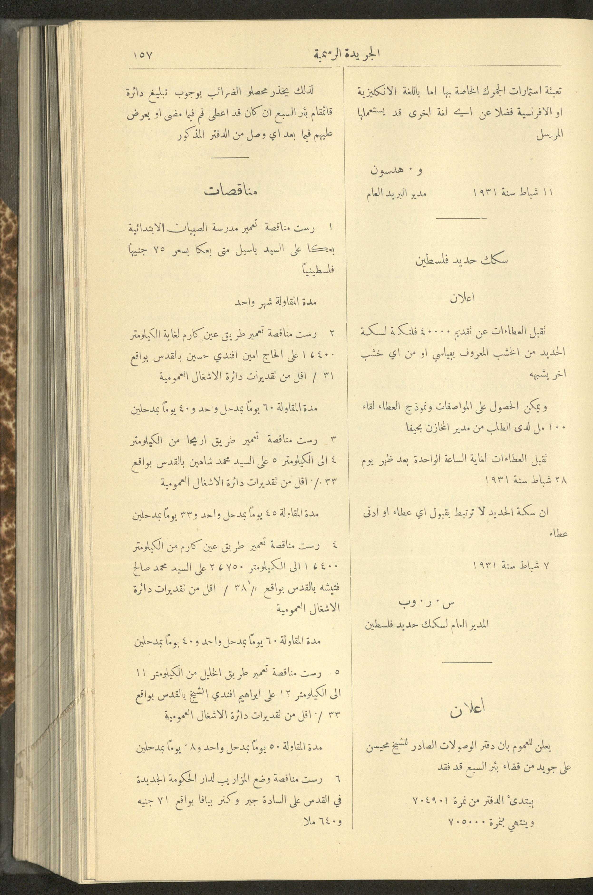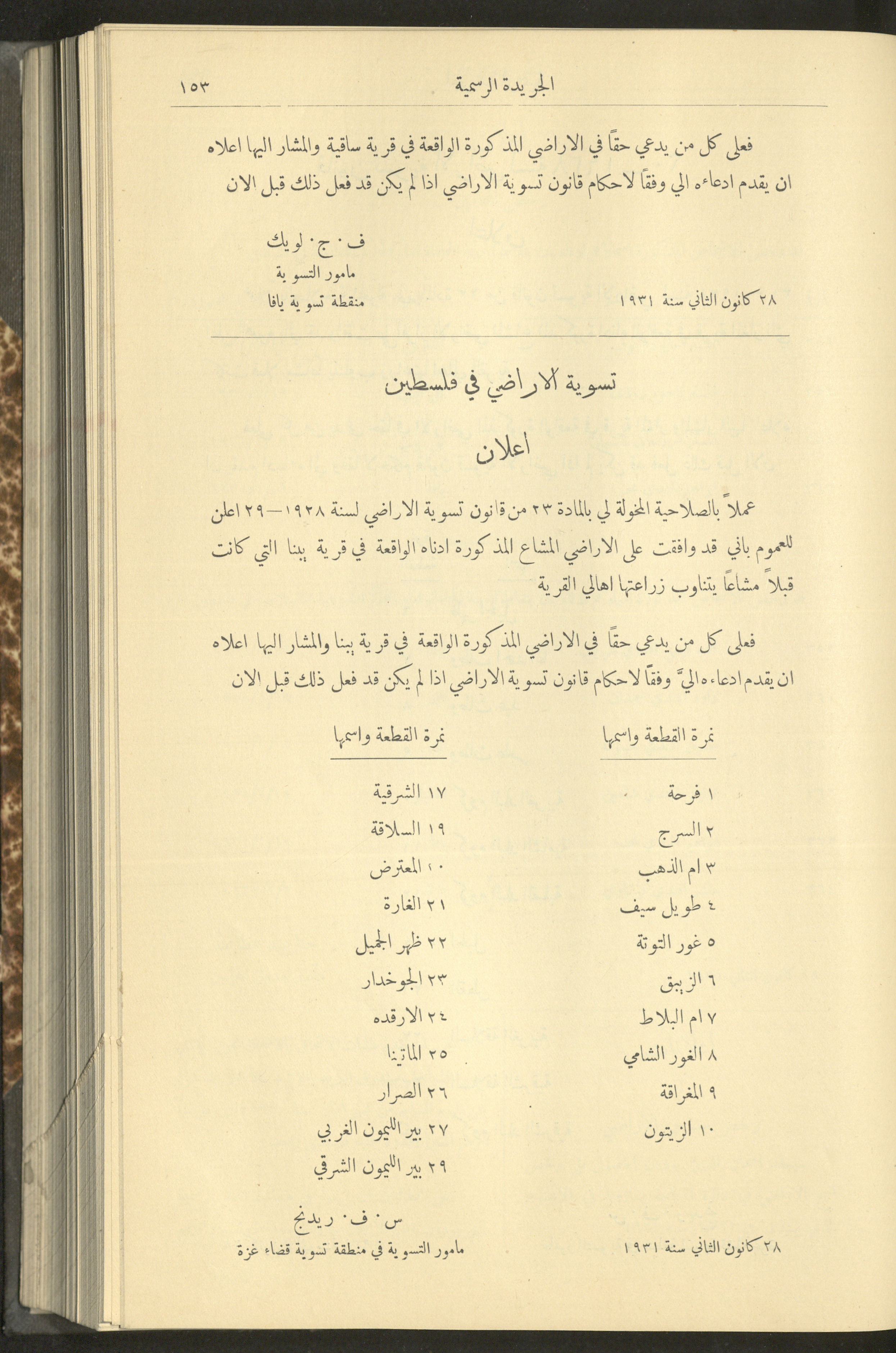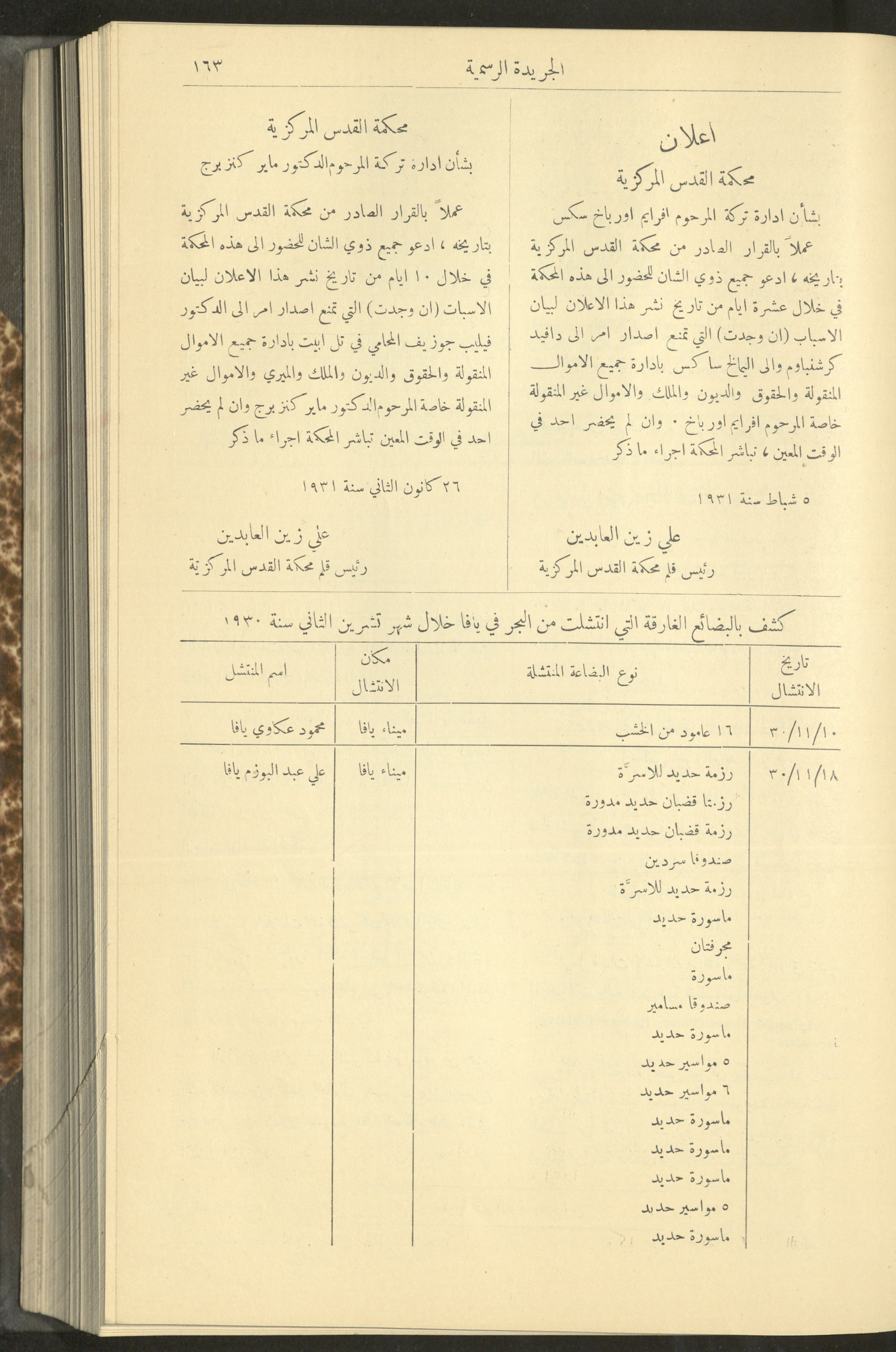 العدد 277 من جريدة حكومة فلسطين الرسمية، 16 شباط 1931