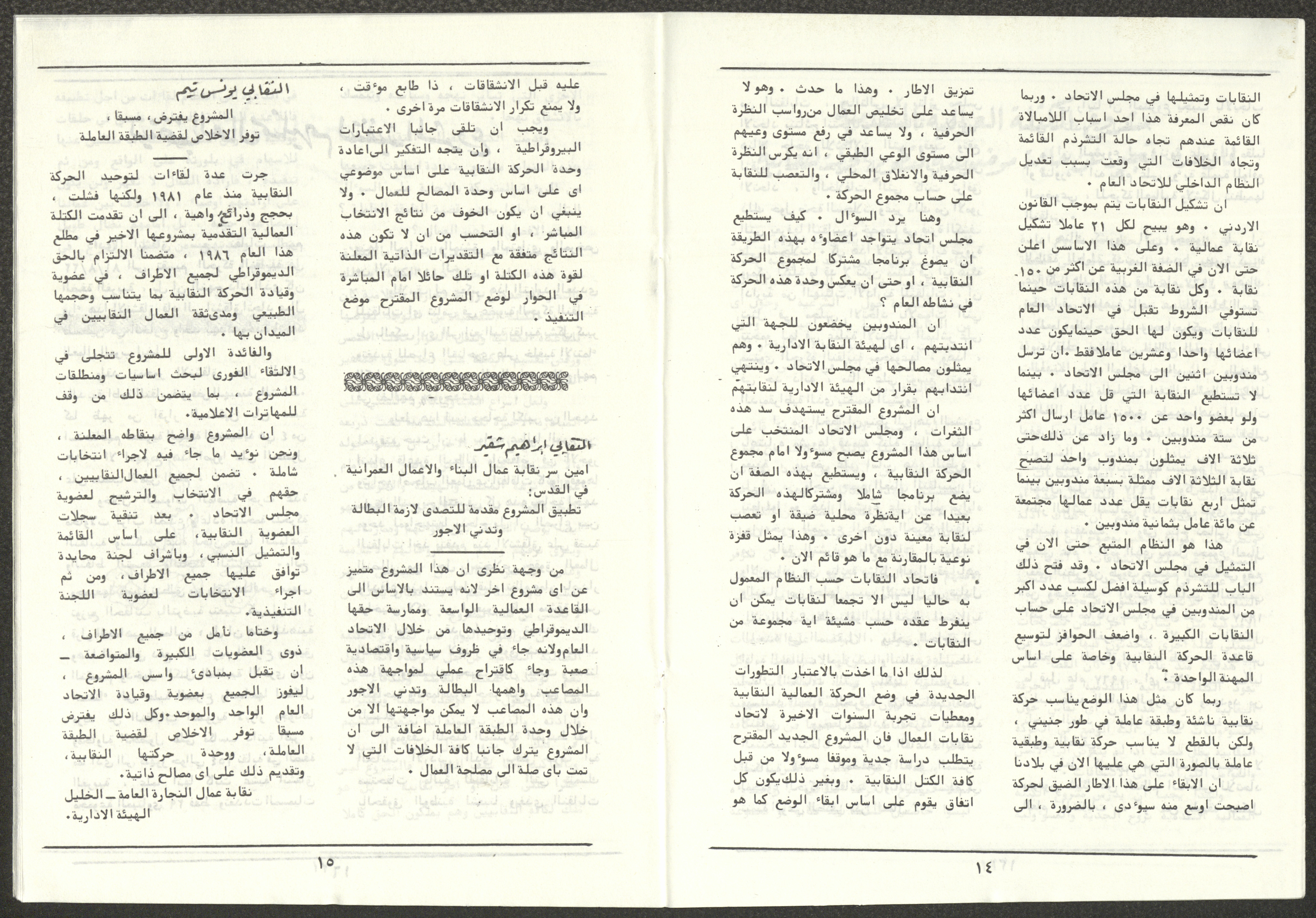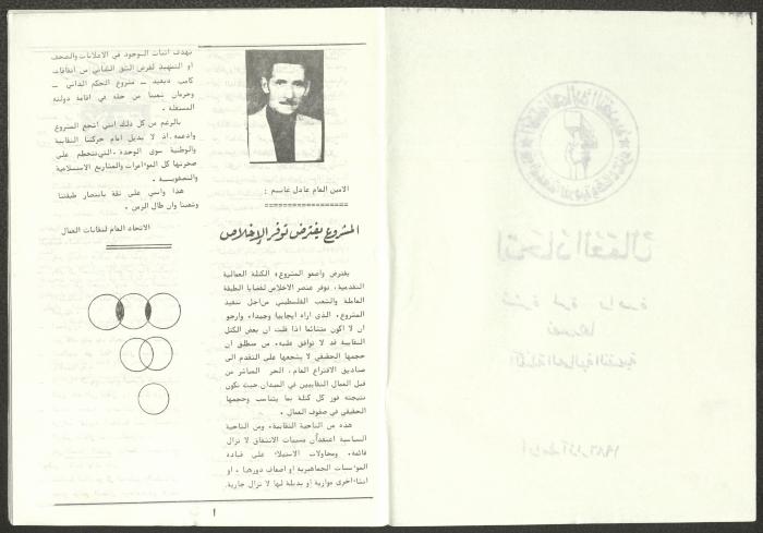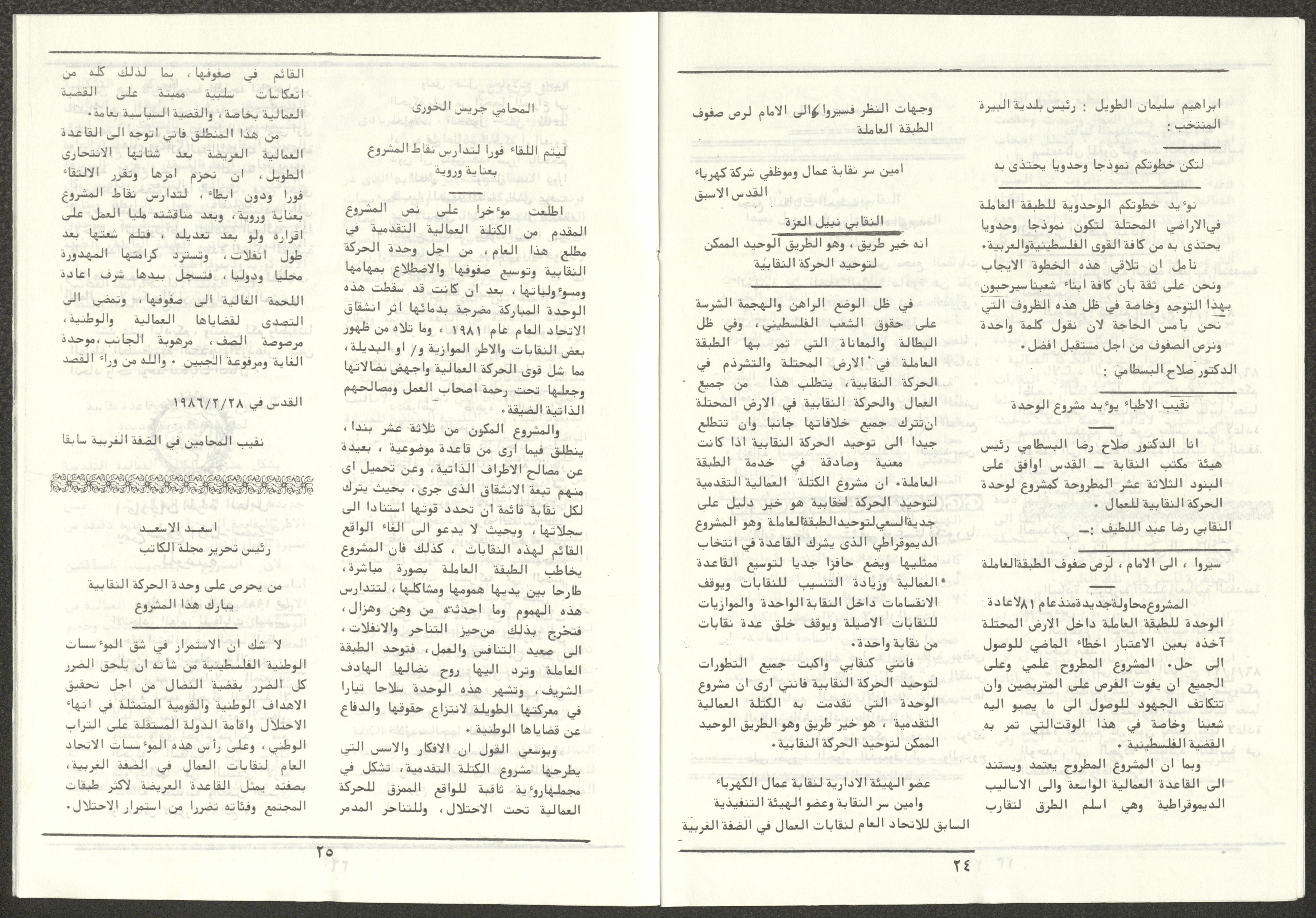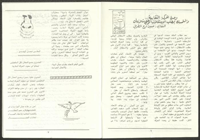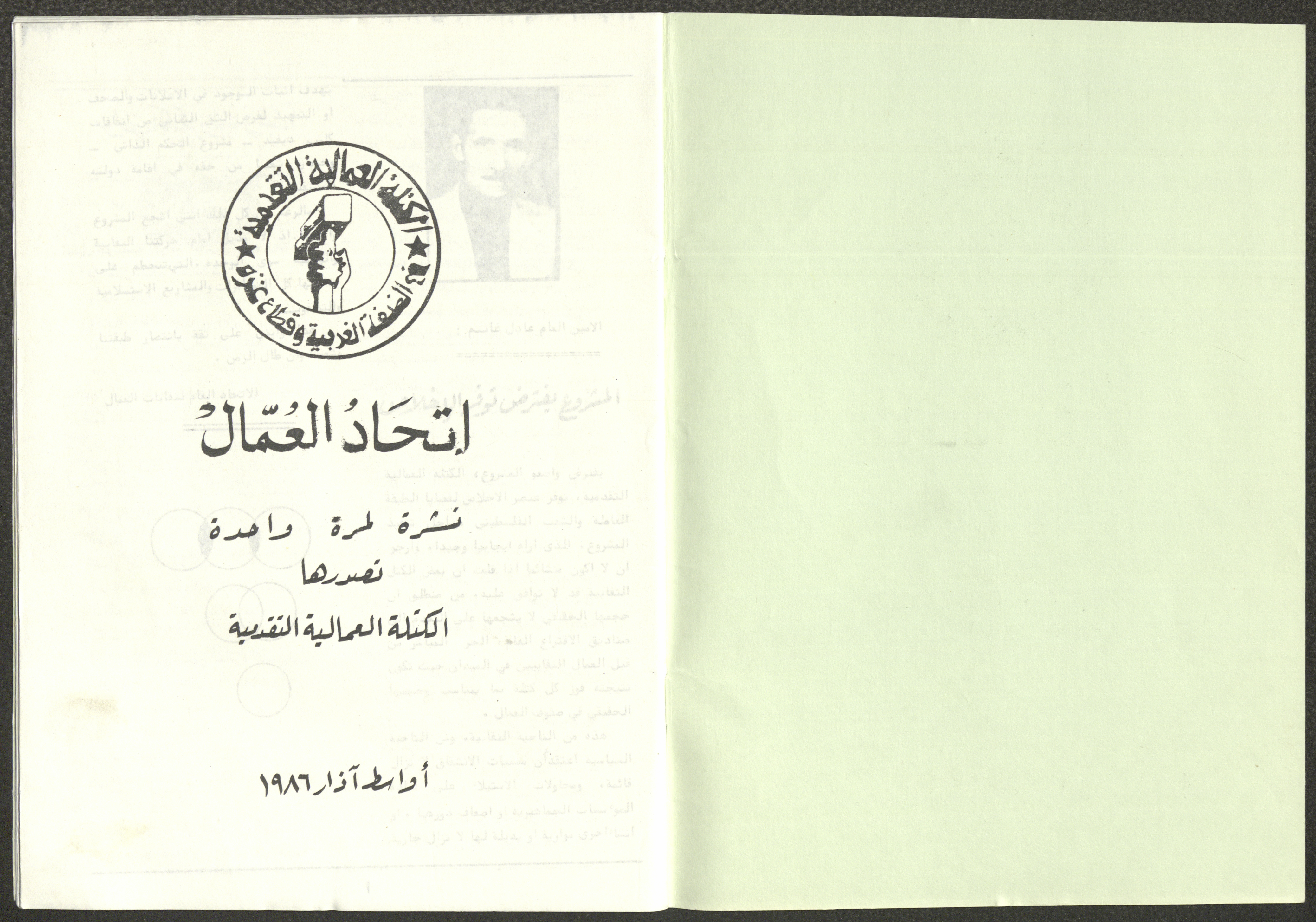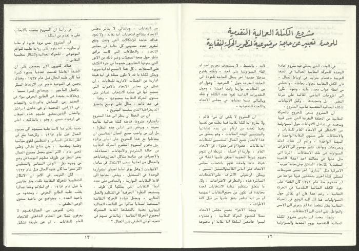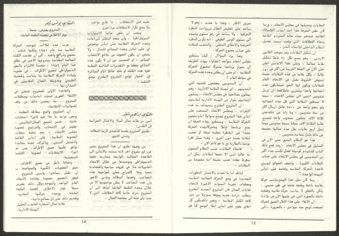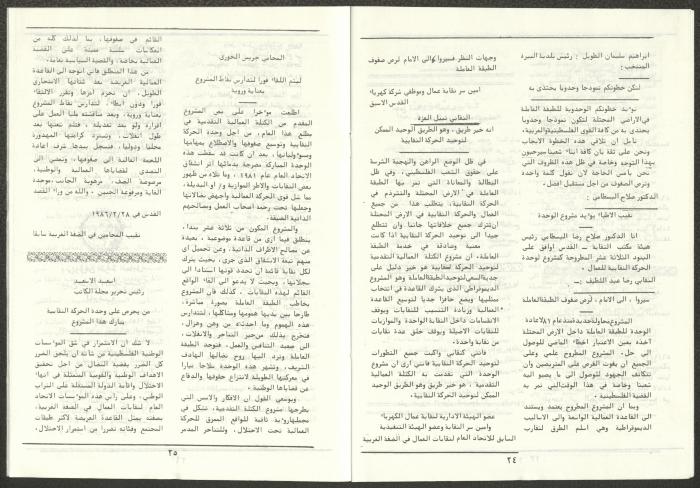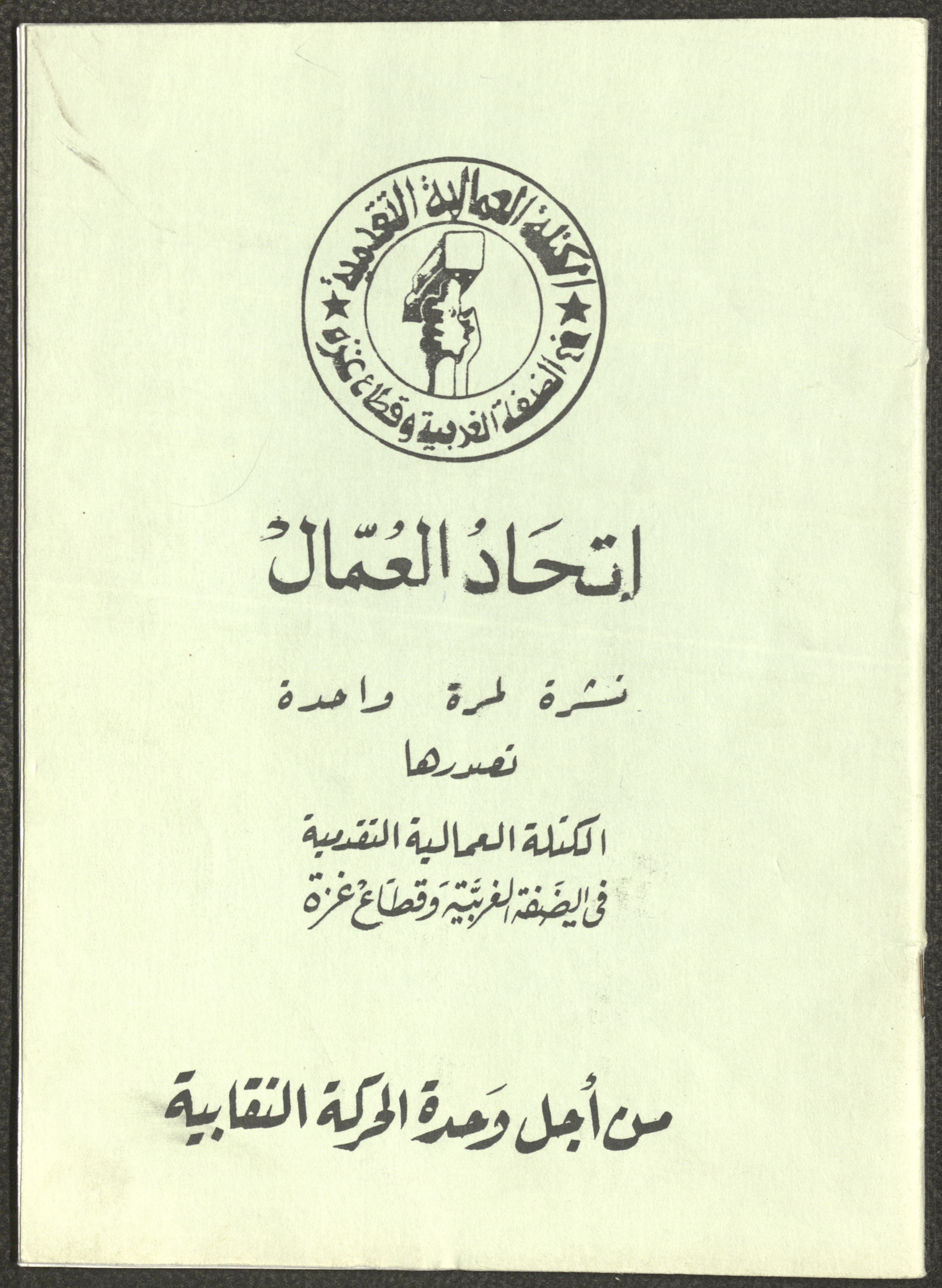 A one-time brochure titled "The Workers' Union" issued by the Progressive Labour Bloc in the West Bank and Gaza Strip in mid-March 1986. The bulletin contained: 1. Speech of the Secretary-General of the Federation of Trade Unions in the West Bank and Gaza Strip, Adel Ghanem. 2. An article titled “The Bloc’s National and Class Positions” by Fouad Hassan Qirsh, Secretary-General of the Federation of Trade Unions of the Garment and Textile Industry. 3. An article titled "Let the National Unity Take Root and the Amman Agreement Fall." 4. A statement issued by the General Federation of Trade Unions Council in the West Bank on 28 February 1986. 5. An article titled "Unity of the Trade Union Movement and Adherence to the Demand for National Independence Go Hand in Hand" by the unionist Hussein Farah Taweel. 6. An article titled "What Are the Motives of the New Initiative?". 7. An article titled "Progressive Labour Bloc Project". 8. An article titled “Let the Workers Elect Their Representatives to Implement the Project.” 9. A news item titled "The Union of Working Women's Committees Appreciates the Project of the Progressive Bloc for Unity." 10. An article titled "Our Workers Unite" by George Hazboun. 11. An article titled "The Unity Cluster Project is Welcomed by our workers. The Project is an Objective Response and a Qualitative Leap." 12. An article titled "The Principles of the Project Indicate the Keenness of its Authors on the Unity of the Trade Union Movement and the National Movement in General" by Khalil Touma. 13. An article titled "Why al-Minawi Rejects the Project of the Progressive Labour Bloc for Unity". 14. A news item titled "At a Trade Union Symposium."