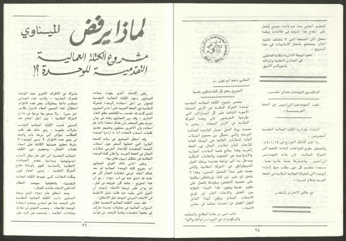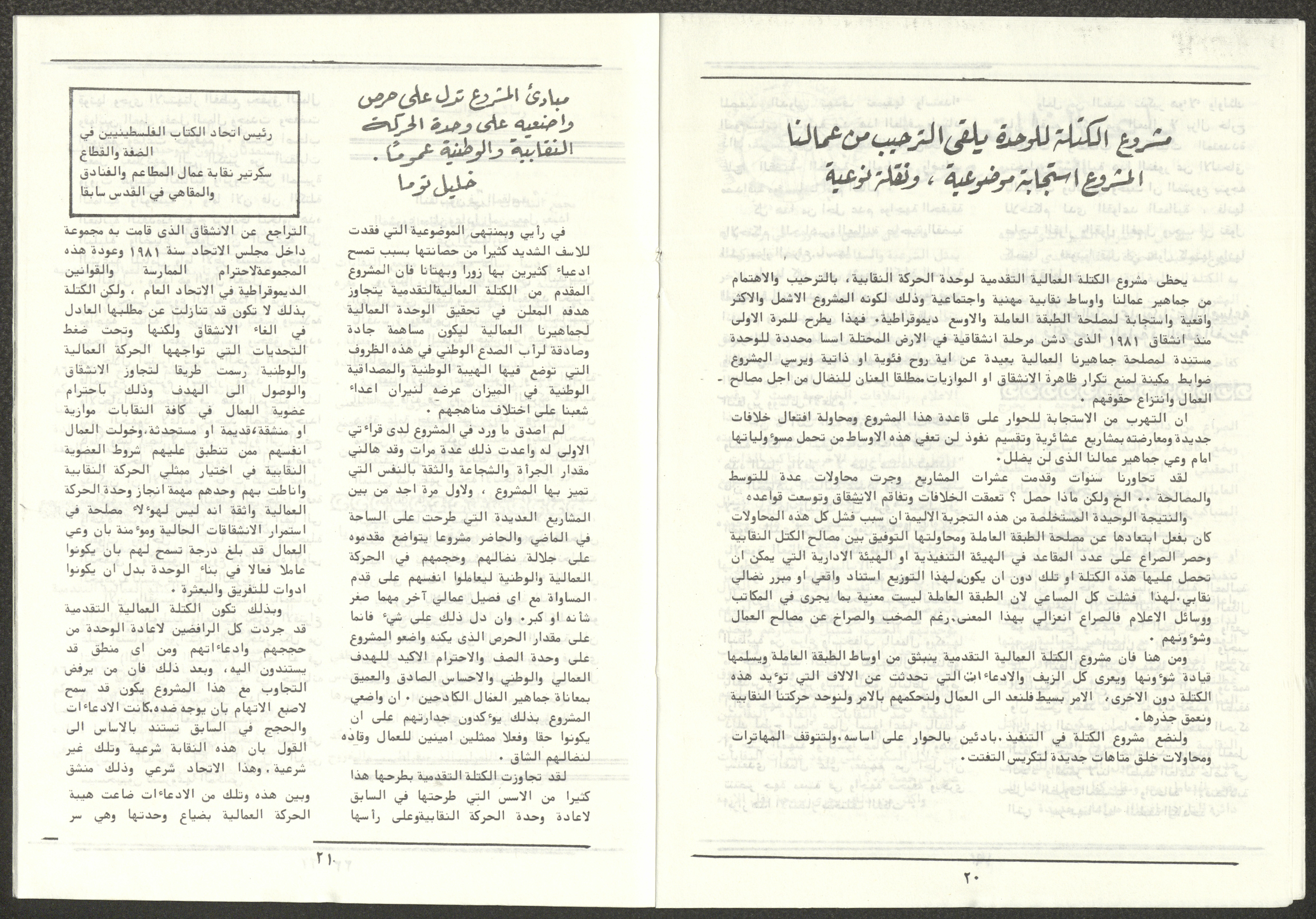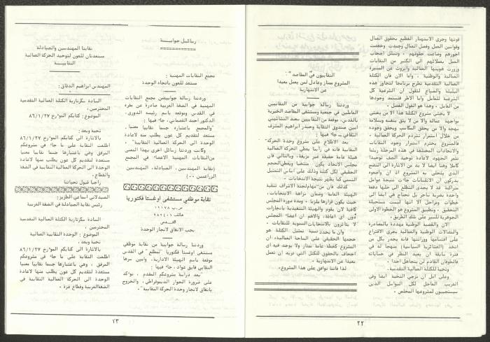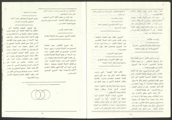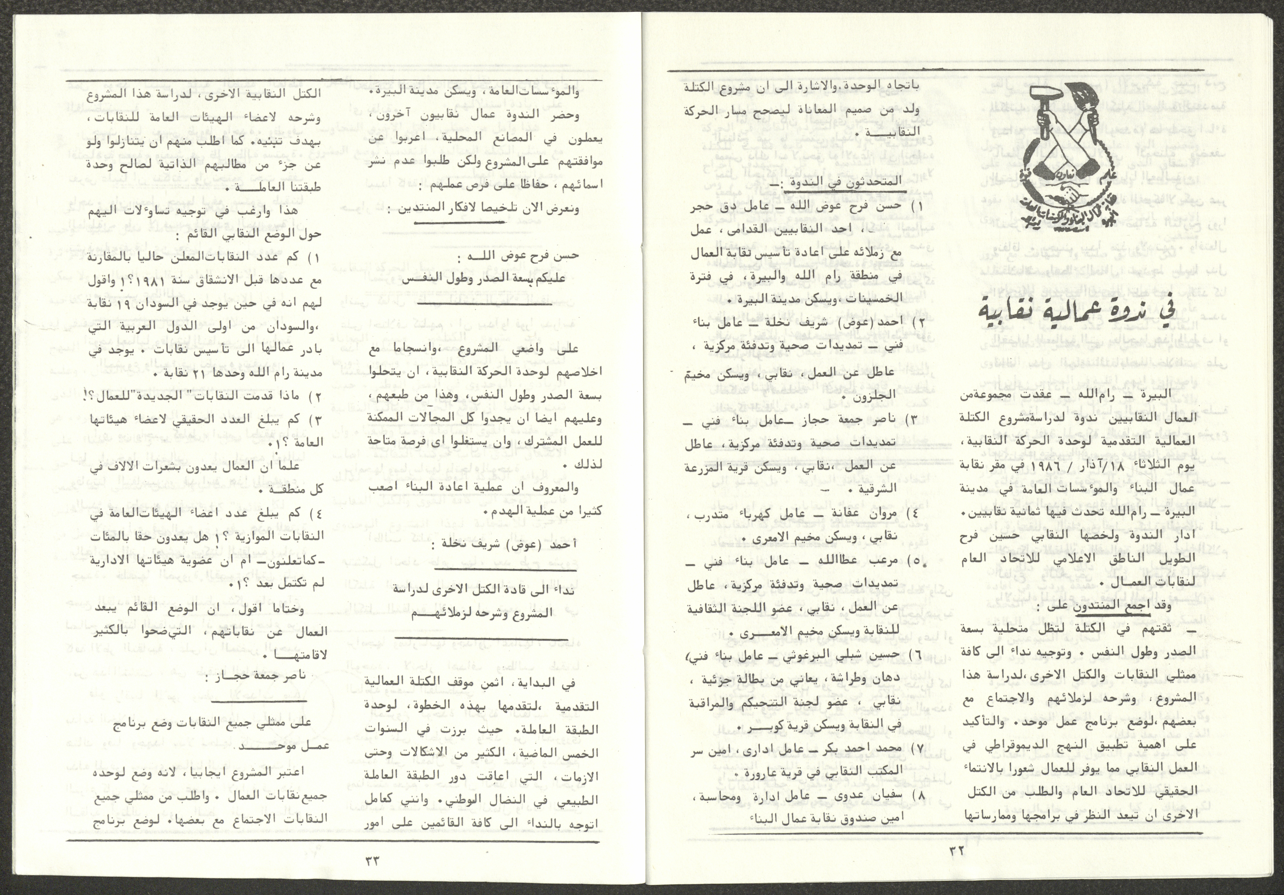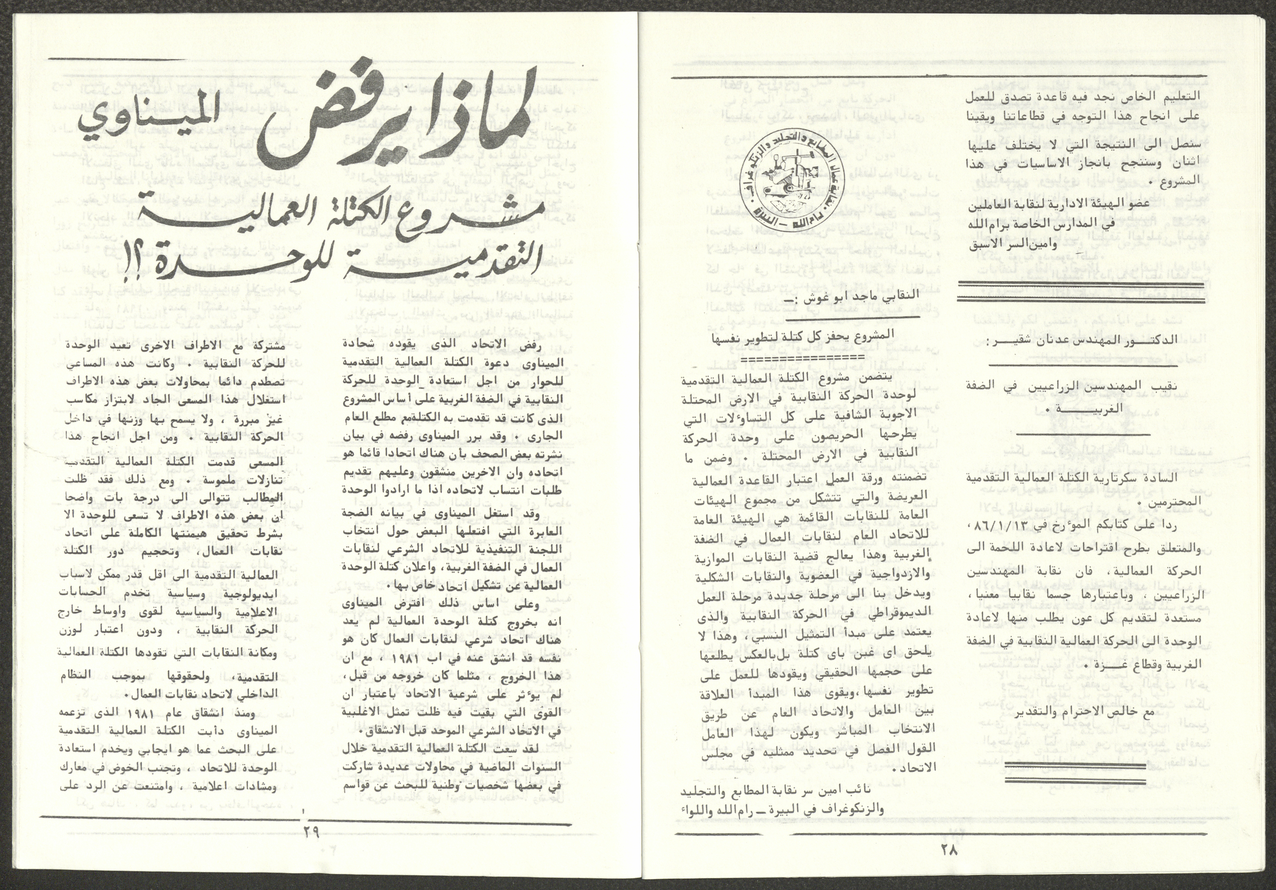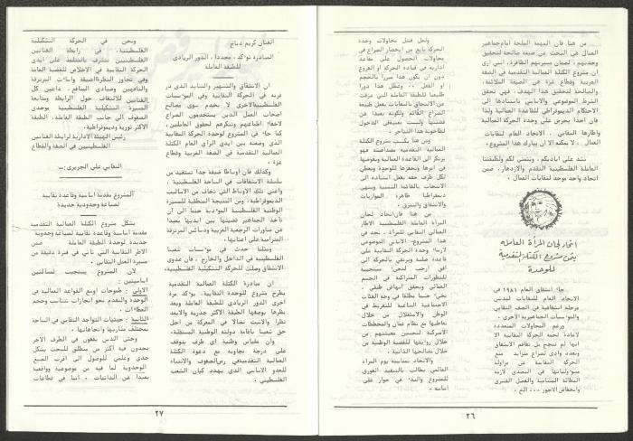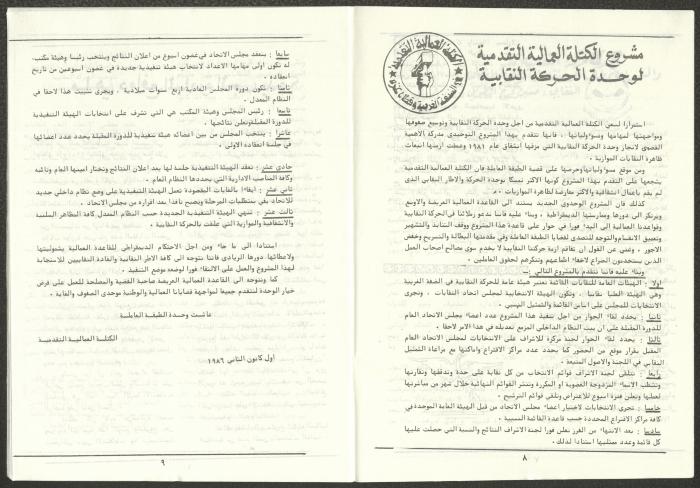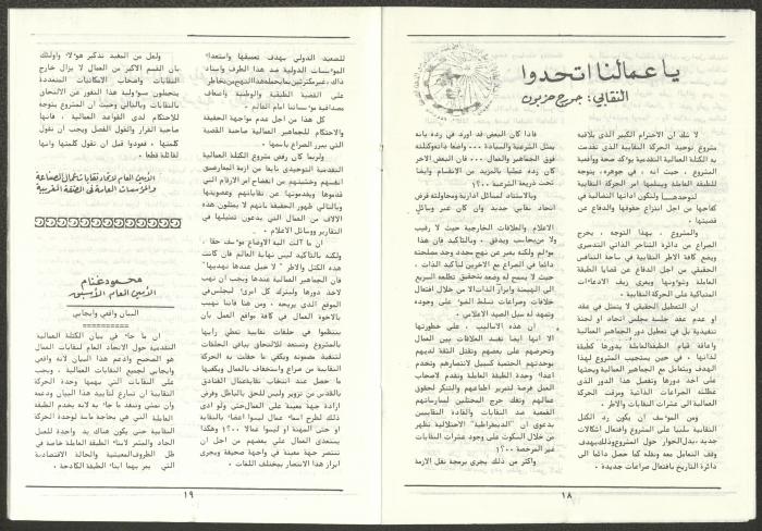 A one-time brochure titled "The Workers' Union" issued by the Progressive Labour Bloc in the West Bank and Gaza Strip in mid-March 1986. The bulletin contained: 1. Speech of the Secretary-General of the Federation of Trade Unions in the West Bank and Gaza Strip, Adel Ghanem. 2. An article titled “The Bloc’s National and Class Positions” by Fouad Hassan Qirsh, Secretary-General of the Federation of Trade Unions of the Garment and Textile Industry. 3. An article titled "Let the National Unity Take Root and the Amman Agreement Fall." 4. A statement issued by the General Federation of Trade Unions Council in the West Bank on 28 February 1986. 5. An article titled "Unity of the Trade Union Movement and Adherence to the Demand for National Independence Go Hand in Hand" by the unionist Hussein Farah Taweel. 6. An article titled "What Are the Motives of the New Initiative?". 7. An article titled "Progressive Labour Bloc Project". 8. An article titled “Let the Workers Elect Their Representatives to Implement the Project.” 9. A news item titled "The Union of Working Women's Committees Appreciates the Project of the Progressive Bloc for Unity." 10. An article titled "Our Workers Unite" by George Hazboun. 11. An article titled "The Unity Cluster Project is Welcomed by our workers. The Project is an Objective Response and a Qualitative Leap." 12. An article titled "The Principles of the Project Indicate the Keenness of its Authors on the Unity of the Trade Union Movement and the National Movement in General" by Khalil Touma. 13. An article titled "Why al-Minawi Rejects the Project of the Progressive Labour Bloc for Unity". 14. A news item titled "At a Trade Union Symposium."
