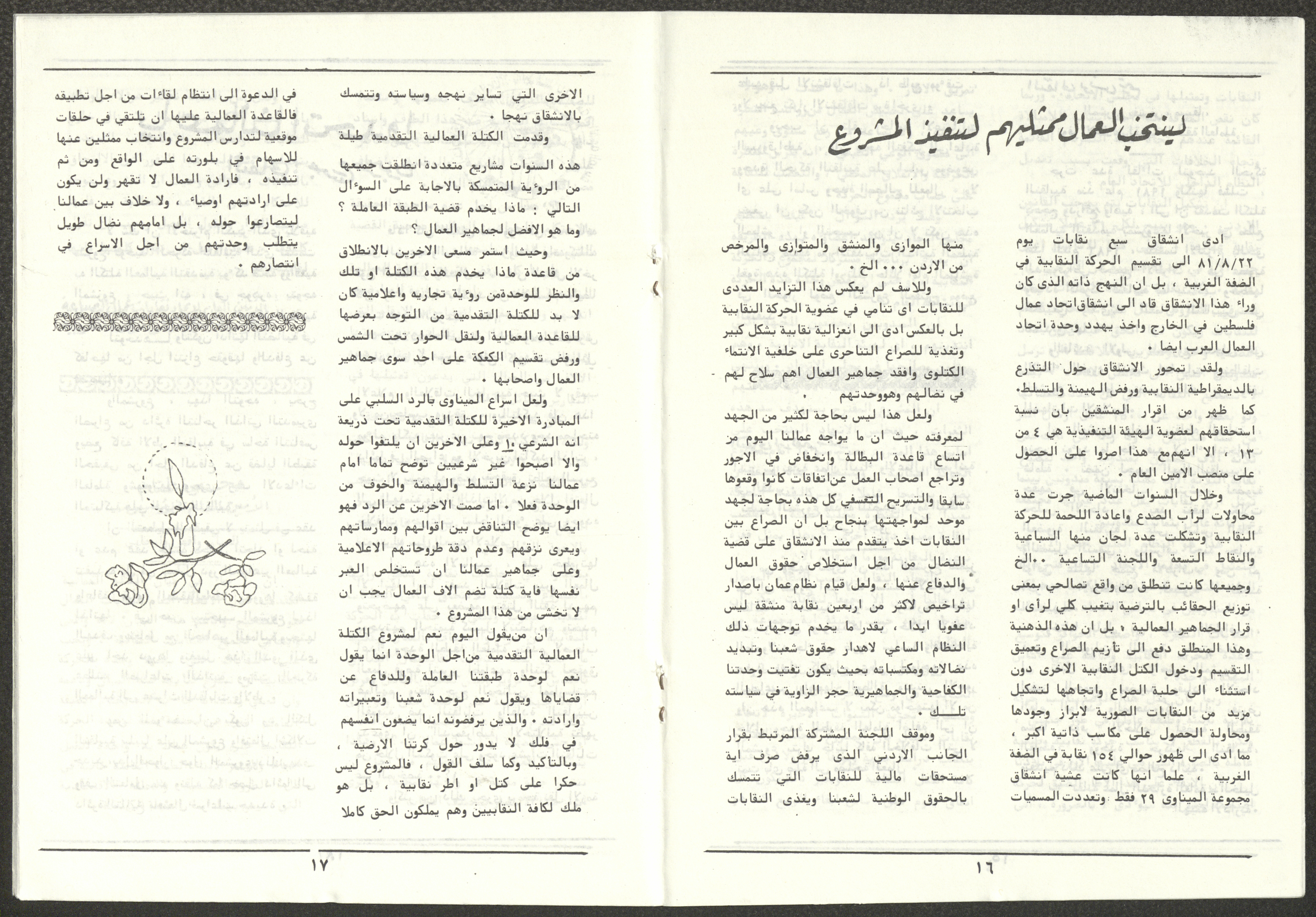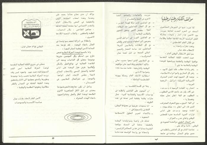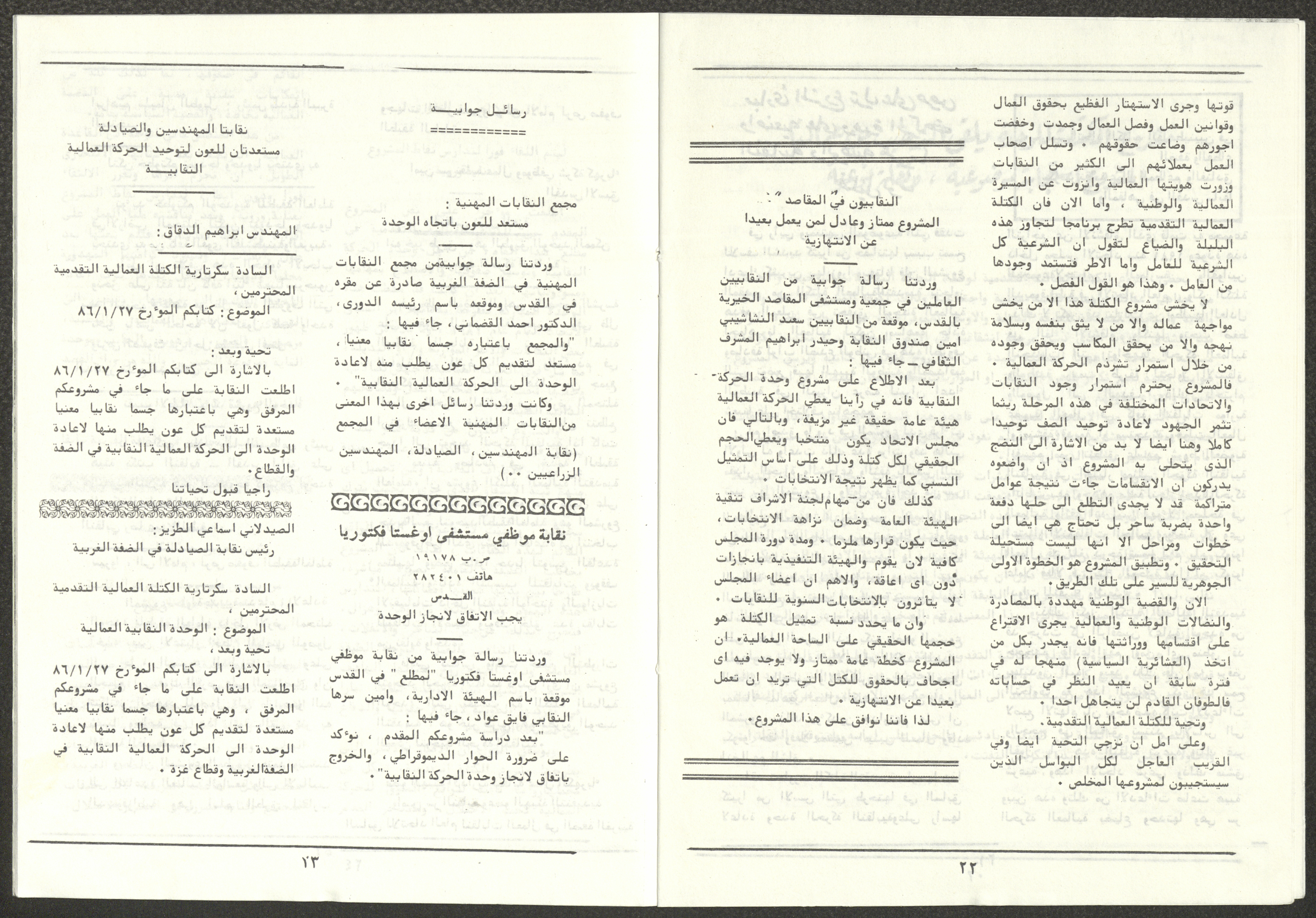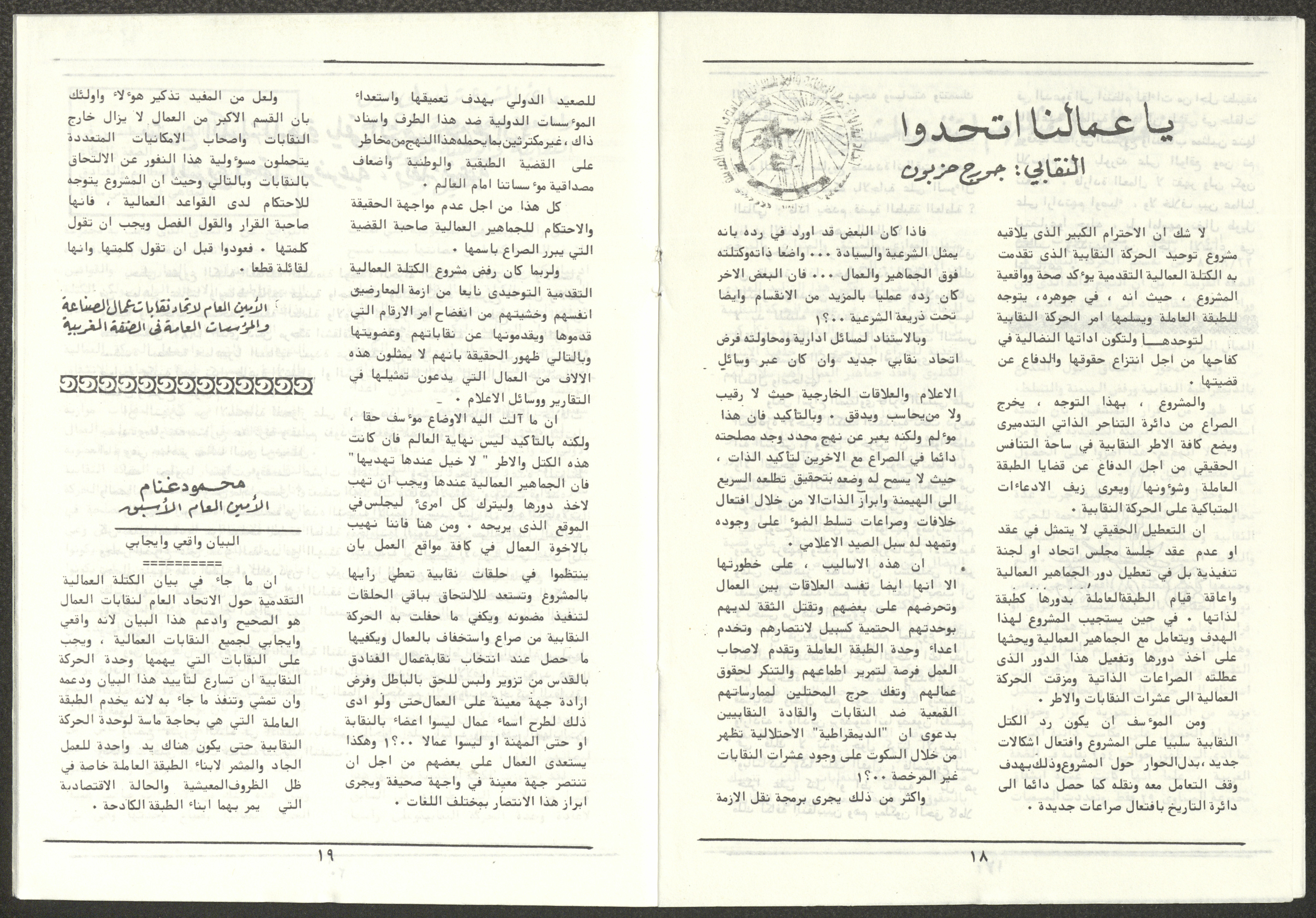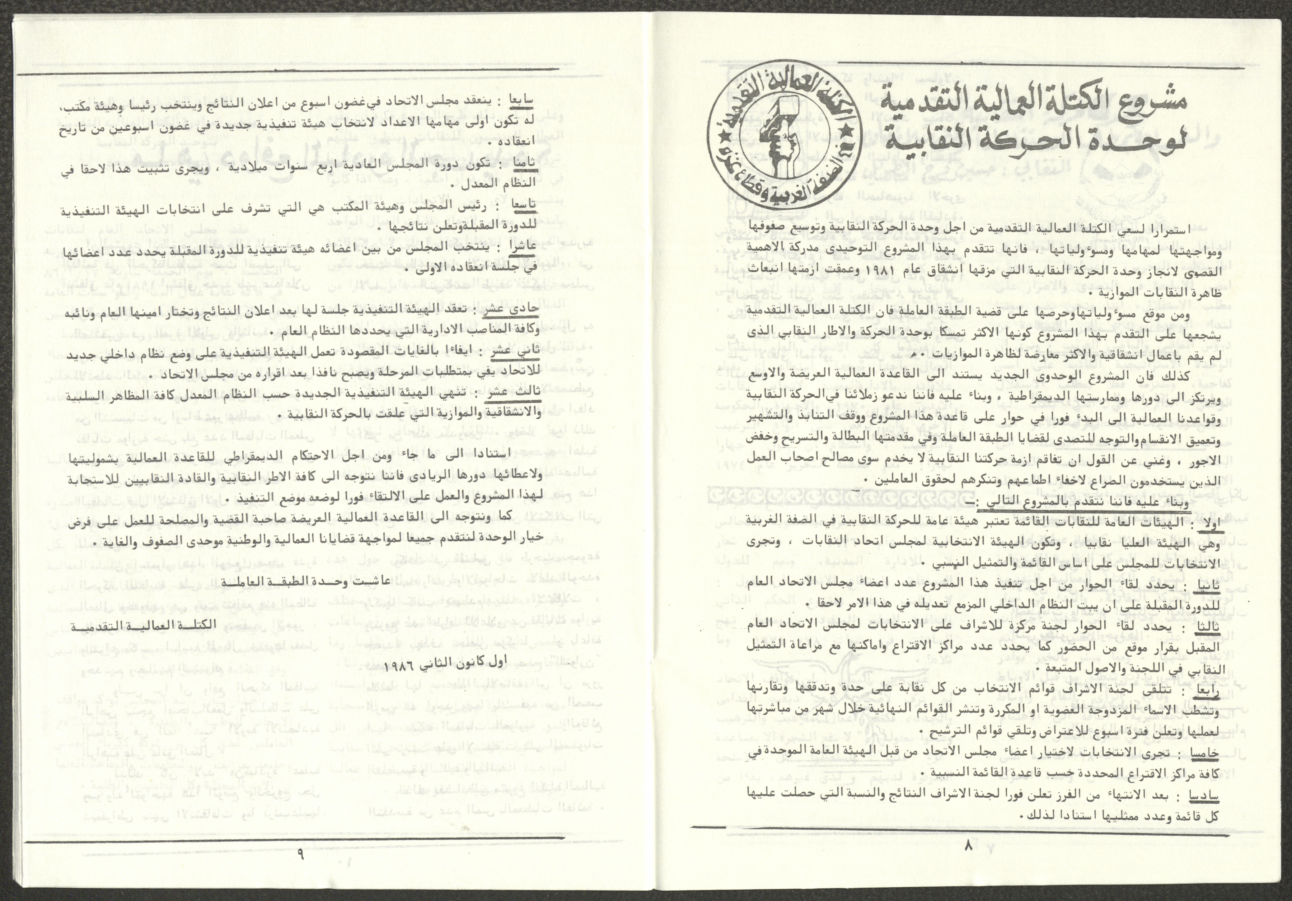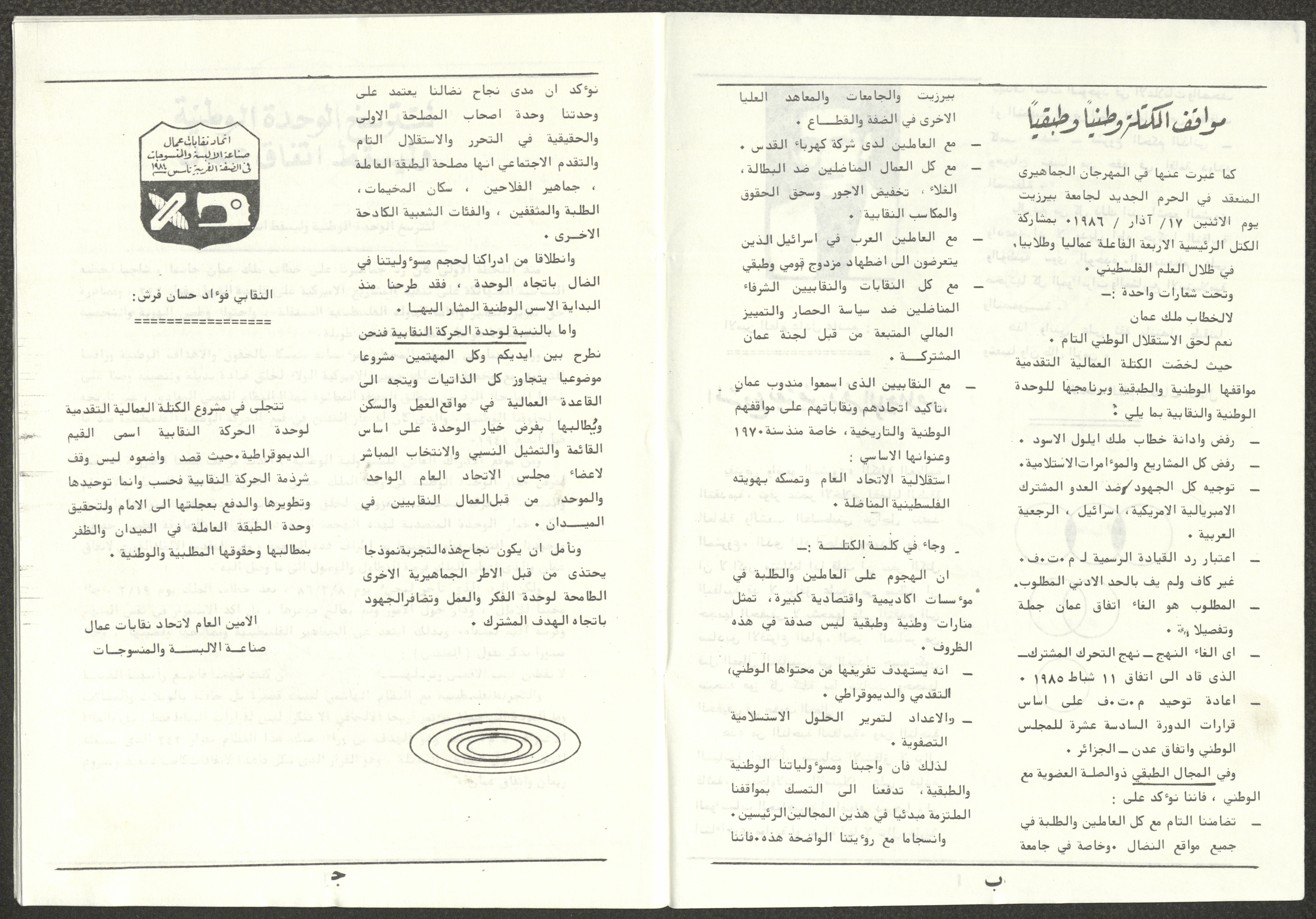 A one-time brochure titled "The Workers' Union" issued by the Progressive Labour Bloc in the West Bank and Gaza Strip in mid-March 1986. The bulletin contained: 1. Speech of the Secretary-General of the Federation of Trade Unions in the West Bank and Gaza Strip, Adel Ghanem. 2. An article titled “The Bloc’s National and Class Positions” by Fouad Hassan Qirsh, Secretary-General of the Federation of Trade Unions of the Garment and Textile Industry. 3. An article titled "Let the National Unity Take Root and the Amman Agreement Fall." 4. A statement issued by the General Federation of Trade Unions Council in the West Bank on 28 February 1986. 5. An article titled "Unity of the Trade Union Movement and Adherence to the Demand for National Independence Go Hand in Hand" by the unionist Hussein Farah Taweel. 6. An article titled "What Are the Motives of the New Initiative?". 7. An article titled "Progressive Labour Bloc Project". 8. An article titled “Let the Workers Elect Their Representatives to Implement the Project.” 9. A news item titled "The Union of Working Women's Committees Appreciates the Project of the Progressive Bloc for Unity." 10. An article titled "Our Workers Unite" by George Hazboun. 11. An article titled "The Unity Cluster Project is Welcomed by our workers. The Project is an Objective Response and a Qualitative Leap." 12. An article titled "The Principles of the Project Indicate the Keenness of its Authors on the Unity of the Trade Union Movement and the National Movement in General" by Khalil Touma. 13. An article titled "Why al-Minawi Rejects the Project of the Progressive Labour Bloc for Unity". 14. A news item titled "At a Trade Union Symposium."
