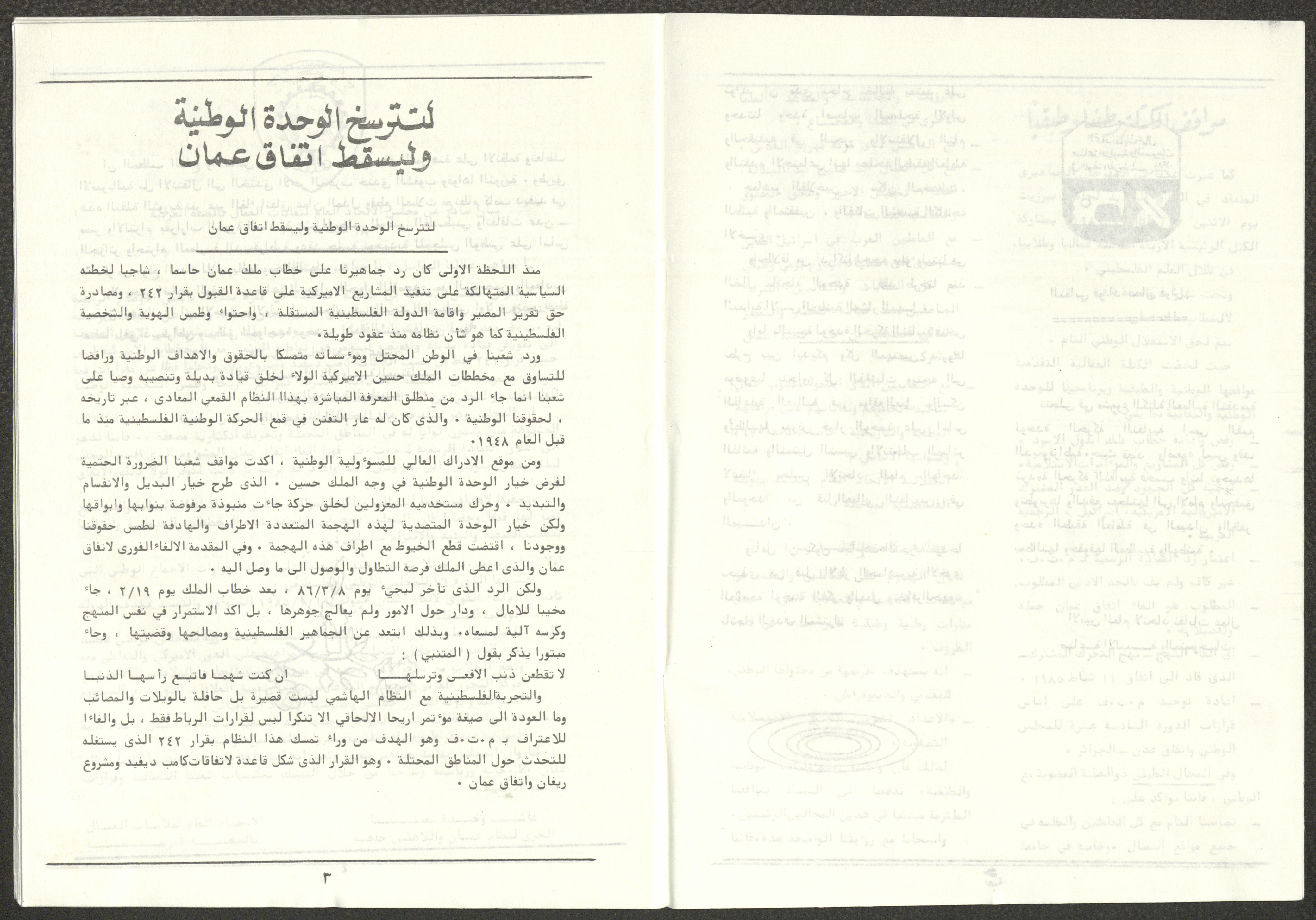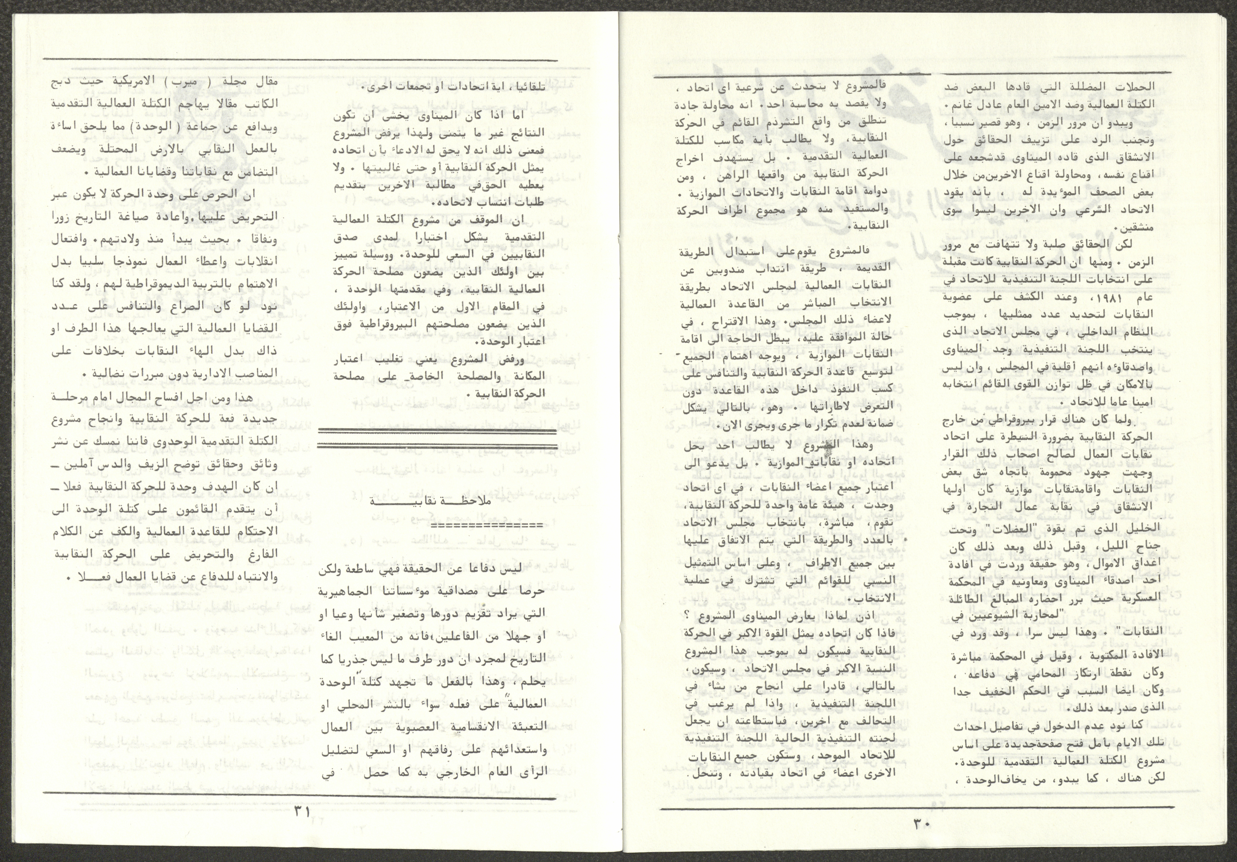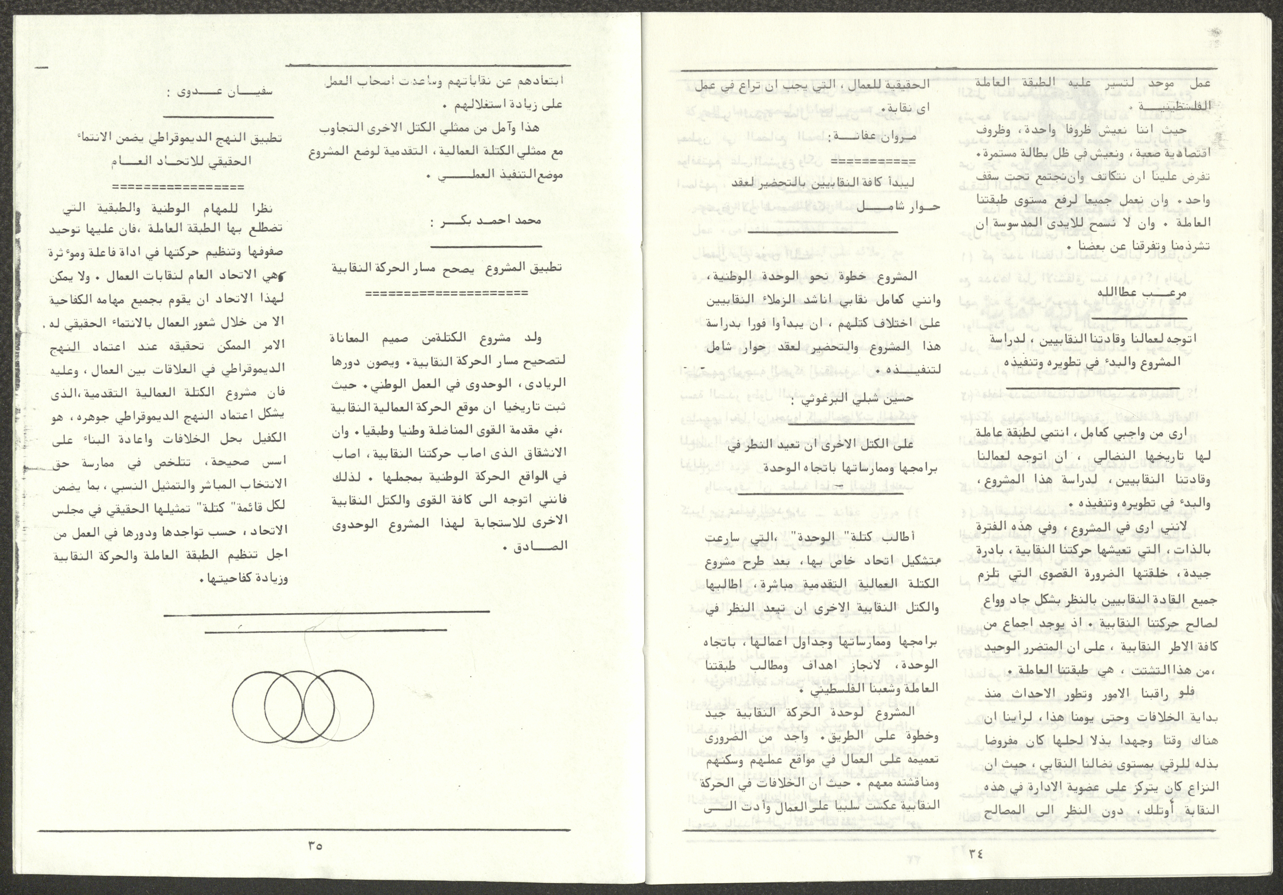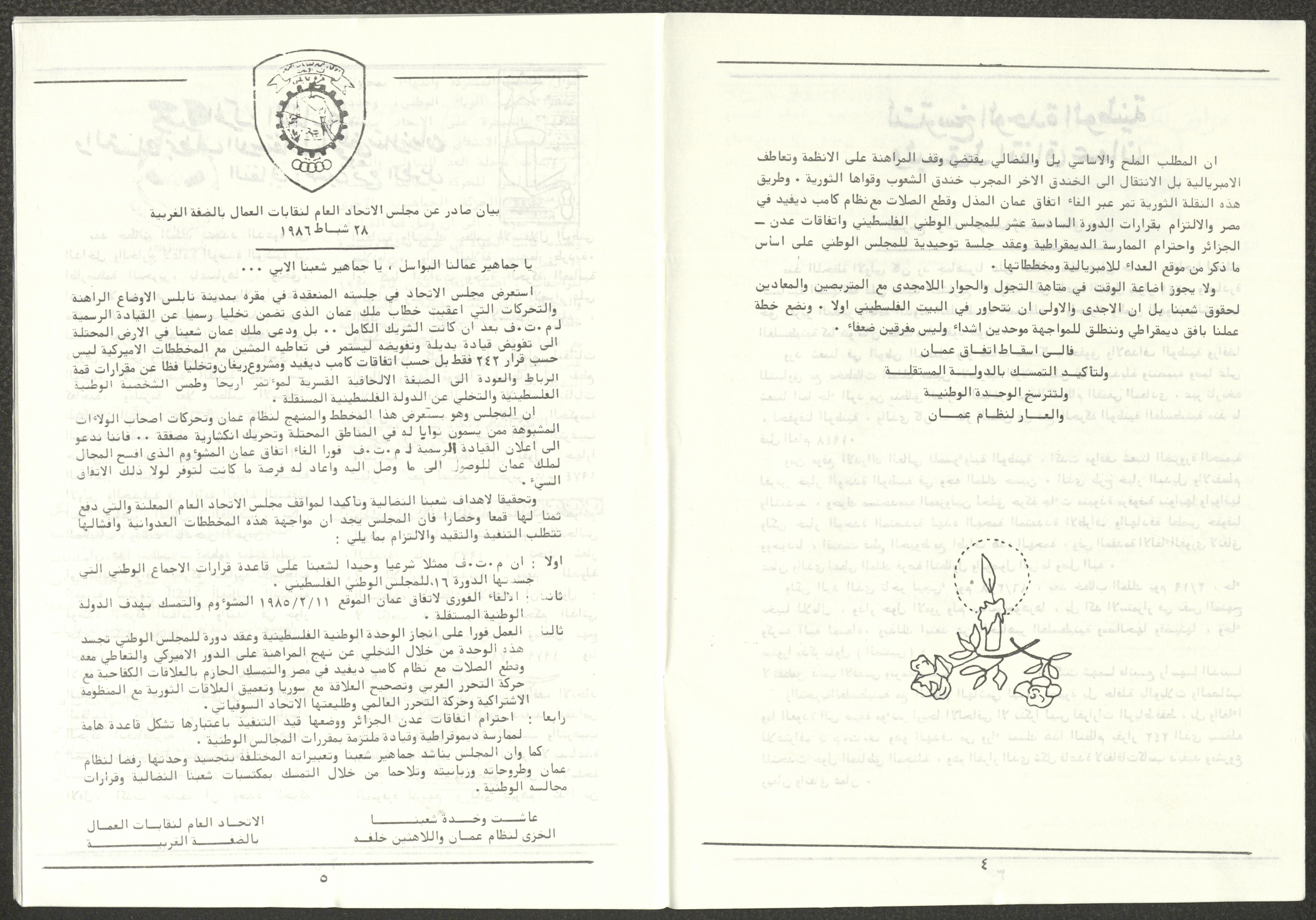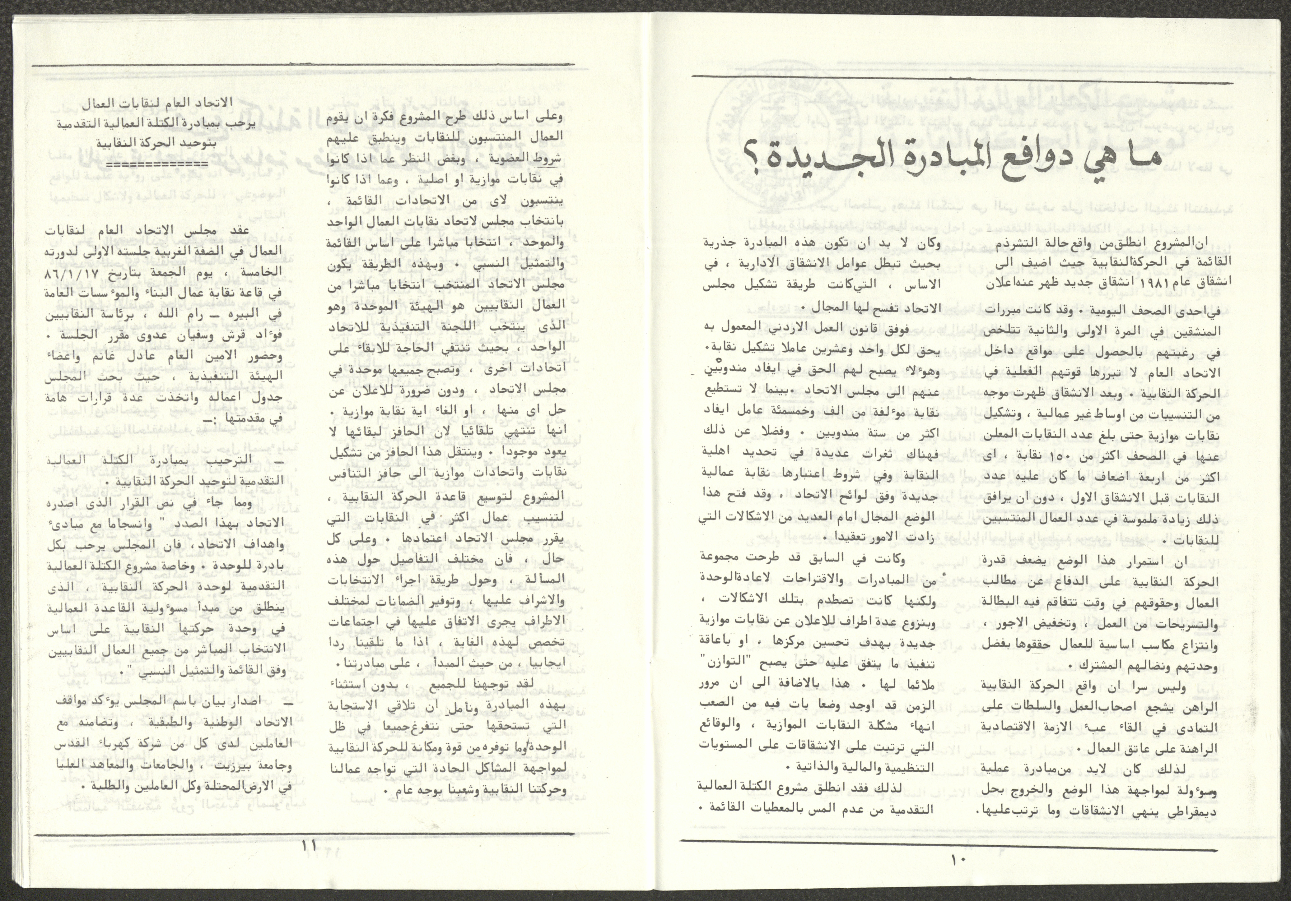 A one-time brochure titled "The Workers' Union" issued by the Progressive Labour Bloc in the West Bank and Gaza Strip in mid-March 1986. The bulletin contained: 1. Speech of the Secretary-General of the Federation of Trade Unions in the West Bank and Gaza Strip, Adel Ghanem. 2. An article titled “The Bloc’s National and Class Positions” by Fouad Hassan Qirsh, Secretary-General of the Federation of Trade Unions of the Garment and Textile Industry. 3. An article titled "Let the National Unity Take Root and the Amman Agreement Fall." 4. A statement issued by the General Federation of Trade Unions Council in the West Bank on 28 February 1986. 5. An article titled "Unity of the Trade Union Movement and Adherence to the Demand for National Independence Go Hand in Hand" by the unionist Hussein Farah Taweel. 6. An article titled "What Are the Motives of the New Initiative?". 7. An article titled "Progressive Labour Bloc Project". 8. An article titled “Let the Workers Elect Their Representatives to Implement the Project.” 9. A news item titled "The Union of Working Women's Committees Appreciates the Project of the Progressive Bloc for Unity." 10. An article titled "Our Workers Unite" by George Hazboun. 11. An article titled "The Unity Cluster Project is Welcomed by our workers. The Project is an Objective Response and a Qualitative Leap." 12. An article titled "The Principles of the Project Indicate the Keenness of its Authors on the Unity of the Trade Union Movement and the National Movement in General" by Khalil Touma. 13. An article titled "Why al-Minawi Rejects the Project of the Progressive Labour Bloc for Unity". 14. A news item titled "At a Trade Union Symposium."