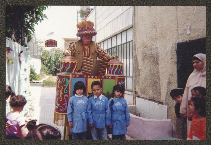 Taken at Is'ad at-Tufoula Kindergarten in Beitunia, which belongs to the Ramallah and al-Bireh governorates on 30 April 2005, this photograph shows Adel Tartir (aka Abu al-Ajab) performing a show of the "Hikayat Abu al-Ajab Series" titled "An-Namla an-Namoula (The Little Ant)".