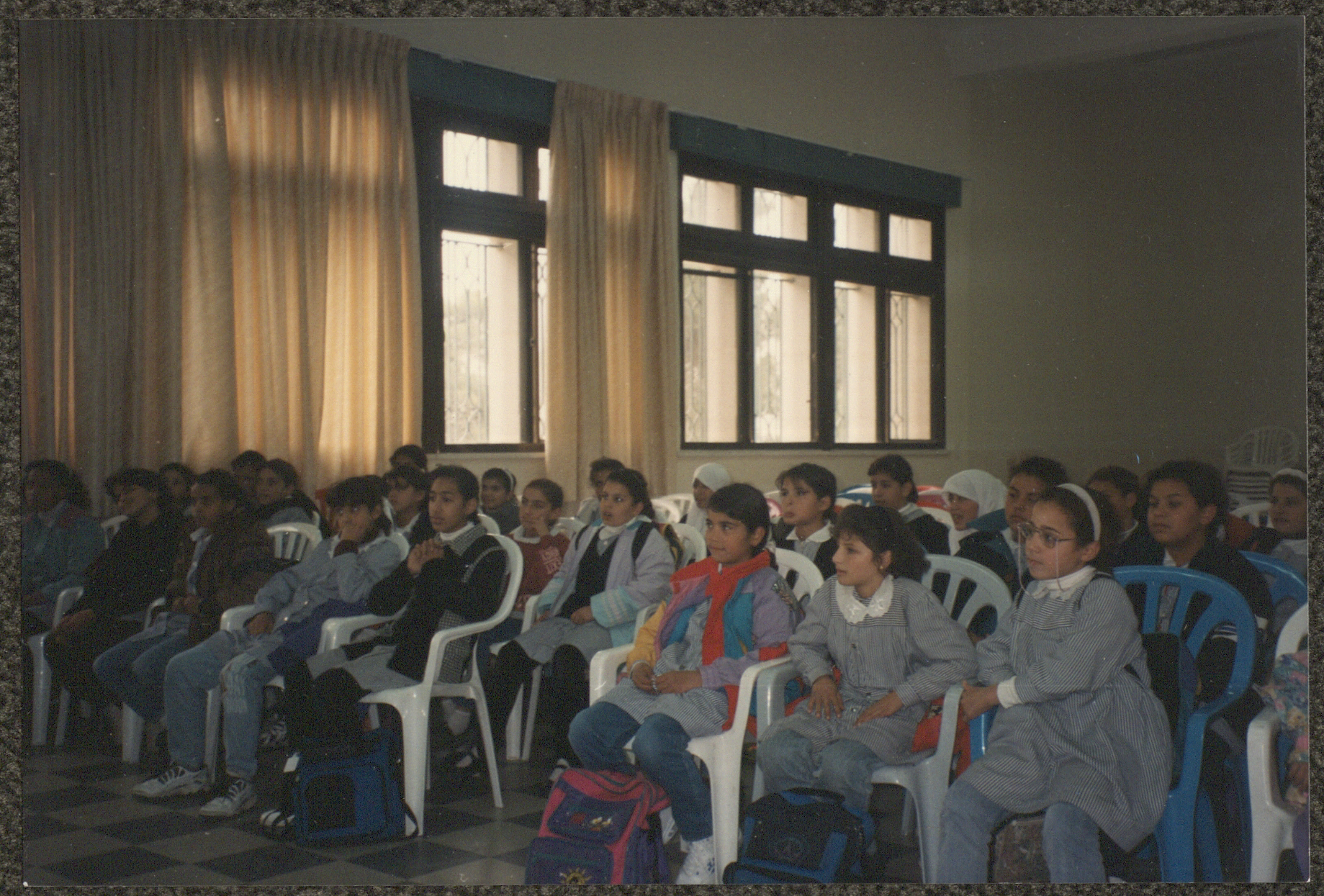 Taken at al-Bireh Municipality Hall on 9 December 1996, this photograph shows Adel Tartir (aka Abu al-Ajab) performing a show from the "Hikayat abu al-Ajab Series", which is mostly the "Hetha at-Tanbouri (The Shoes of at-Tanbouri)" story, one of the first stories of the Wonder Box. At the time, several performances were presented to school students who attended periodically, while some of them came to the show on foot from their schools, and it was held without a specific occasion, but rather it was an effort by the al-Bireh Municipality Library.