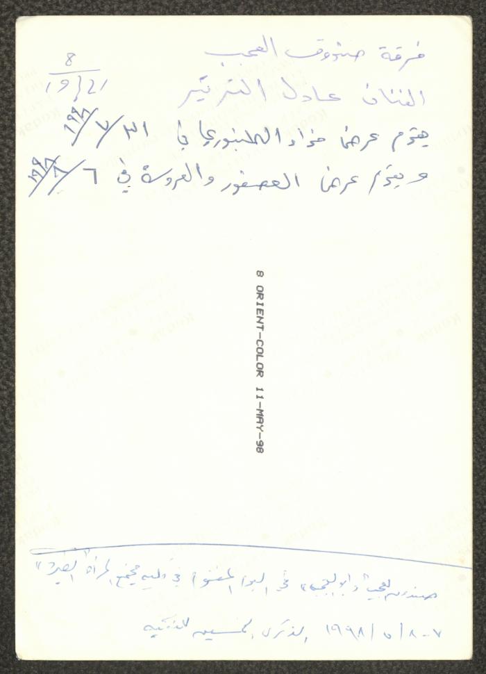 Taken between 7-8 May 1998, this photograph shows Adel Tartir (aka Abu al-Ajab) performing one of the "Hikayat abu al-Ajab Series" shows in Ramallah Women's Training Center (RWTC) at al-Tireh Neighbourhood during his participation in the commemoration of the fiftieth anniversary of the Nakba. It should be noted that it was written on the back of the picture that the artist Adel Tartir will present a performance of the play “Al-Tanbouri Shoes” on 31 July 1998 and the play “The Bird and the Bride” on 6 August 1998, as he was participating in the activities of the “Ramallah” festivals, which were implemented at Teachers' Training Center in that summer.