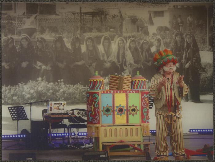 Taken on 25 August 2017, this photograph shows Adel Tartir (aka Abu al-Ajab) performing one of the "Hikayat Abu al-Ajab Series" shows with the Wonder Box, during his participation in the Harajah Market, a popular market organized by Ramallah Municipality.