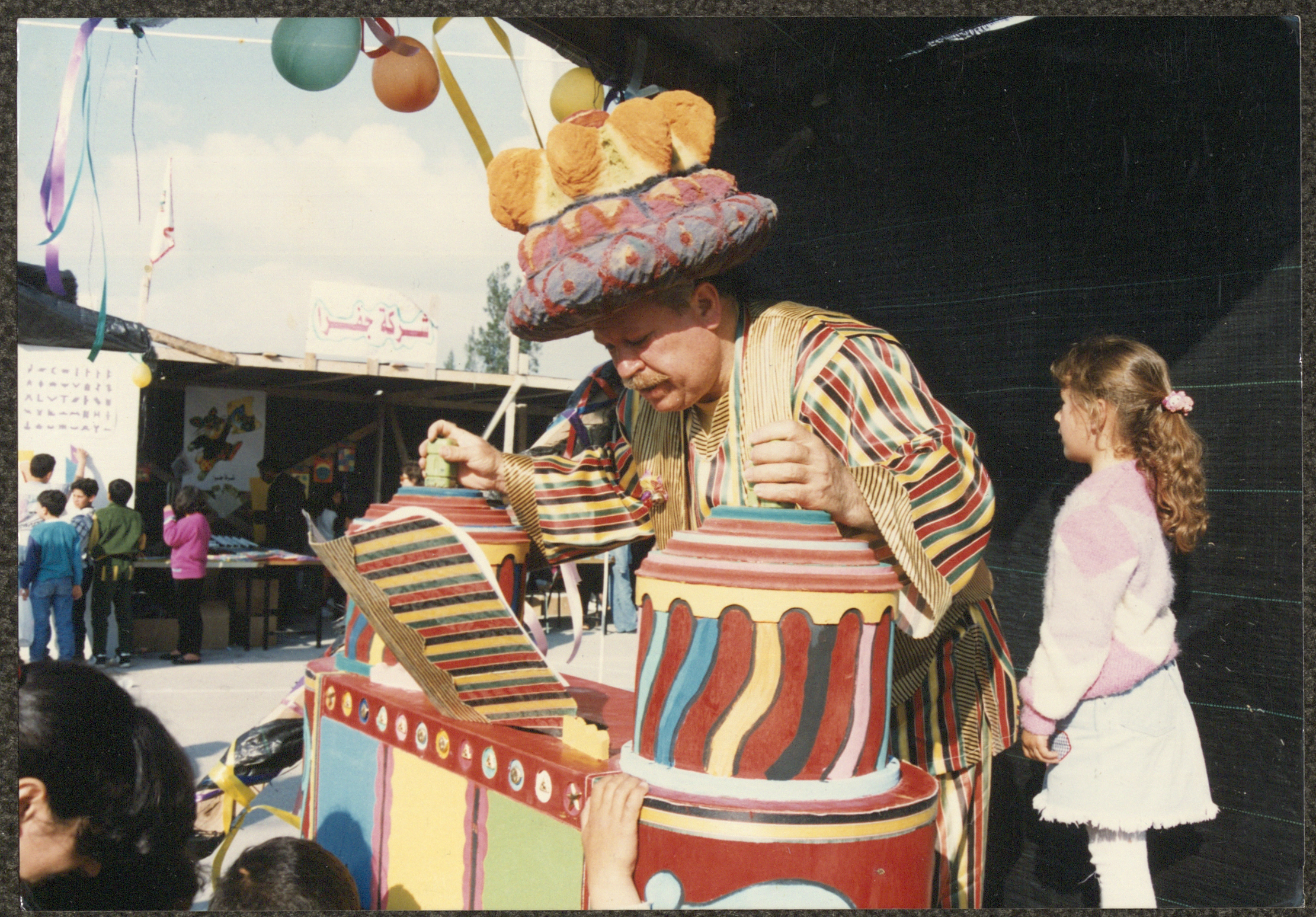 صورة من أحد عروض "سلسلة حكايات أبو العجب" يقدمها عادل الترتير المعروف بشخصية "أبو العجب" في سرية رام الله الأولى، وذلك على هامش فعاليات أسبوع نوار نيسان الذي امتد في الفترة بين 19-26 نيسان 1996 وفي الخلف تظهر ابنته حنين الترتير.