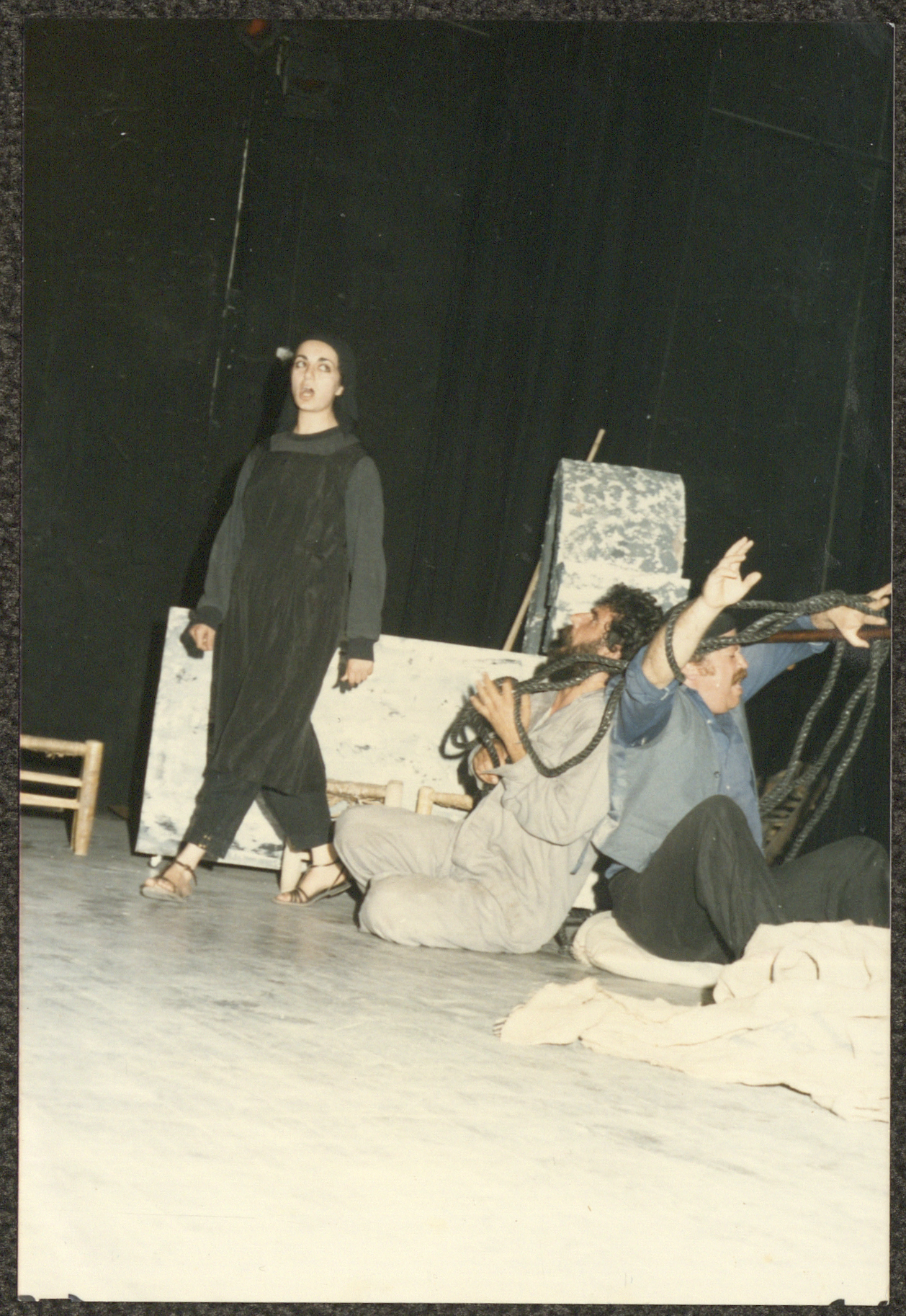 Undated, this photograph shows a scene from the "al-Ama Wal-Atrash (The Blind and the Deaf)" play, originally derived from a novel by Ghassan Kanafani by the Wonder BoxTheatre troupe and Balaleen (Balloons) troupe and directed by Akram al-Malki. Its first performance was on 30 May 1986 in al-Hakawati Theatre in Jerusalem after the text was edited and performed by several actors.