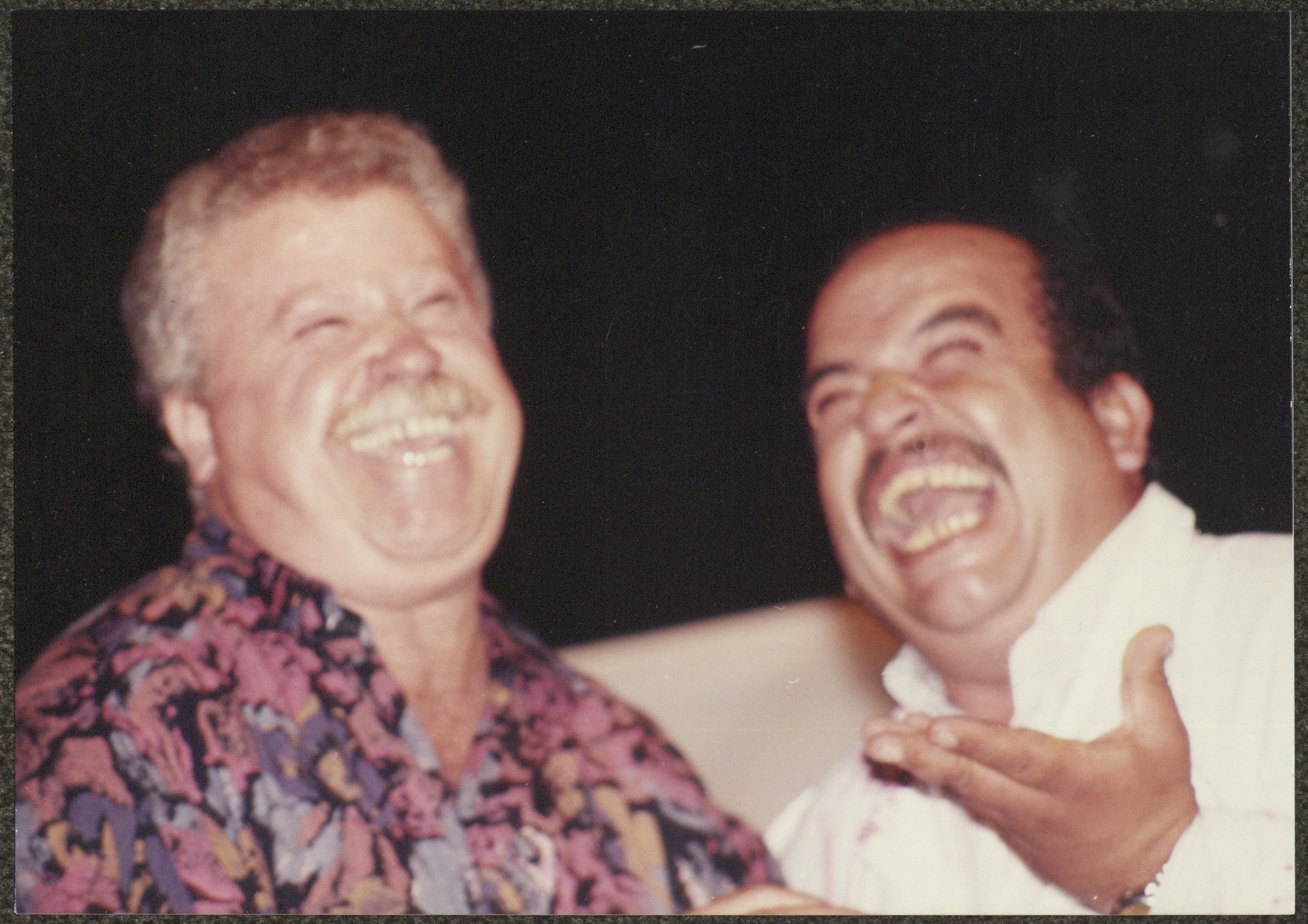 This photograph shows a scene from the "Kollo Arremote (Everything by the Remote Control)" play including, from the right, Adnan abu Sneneh and Adel Tartir. This play was first performed on 13 May 1997 on the al-Siraj Theatre stage in Ramallah, directed by Walid Abdessalam and produced by the Palestinian Center for the Dissemination of Democracy & Community Development (Panorama), where Tartir was a guest, as it was not connected to the Wonder Box Theatre and the Balaleen Troupe.